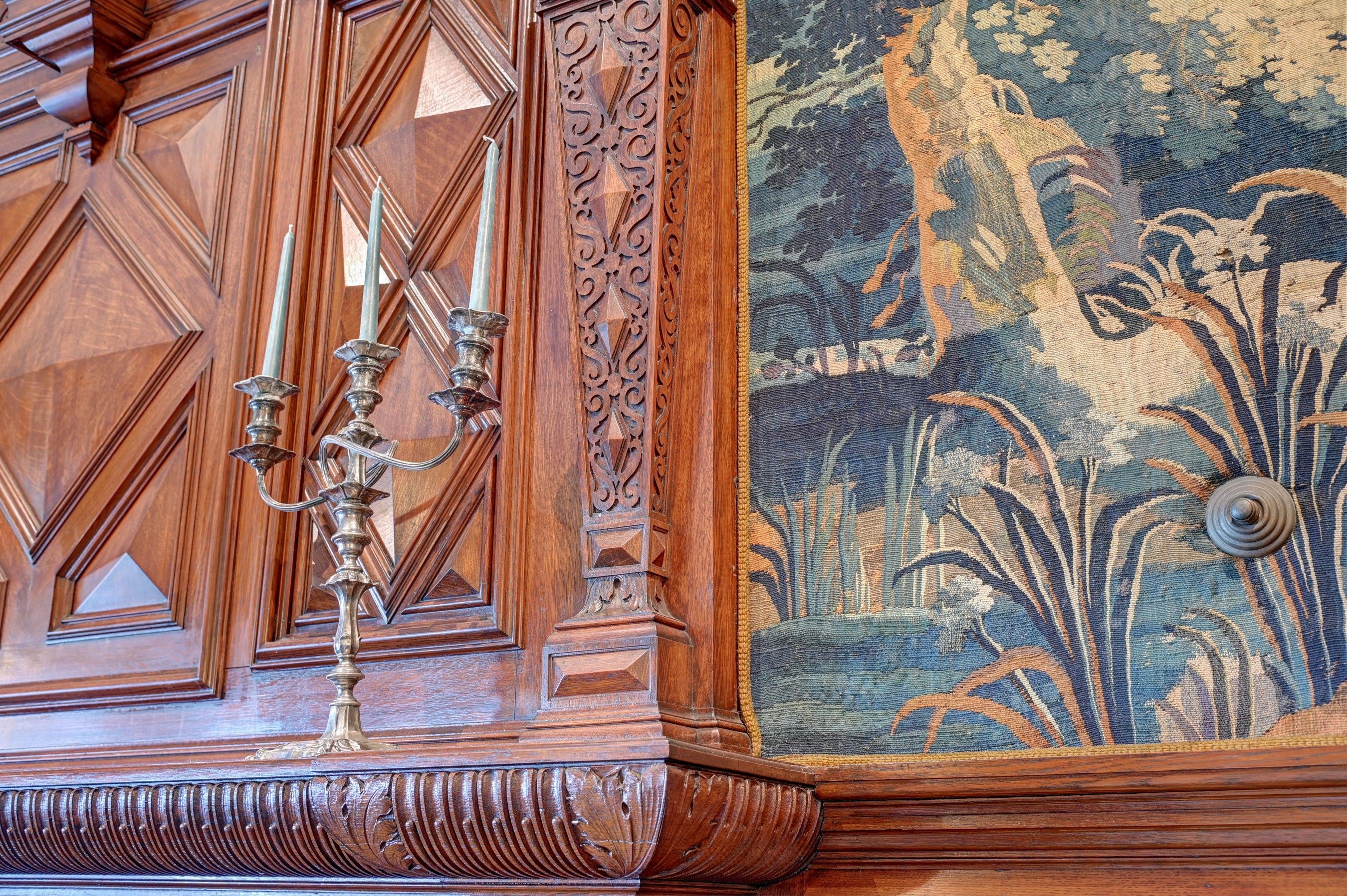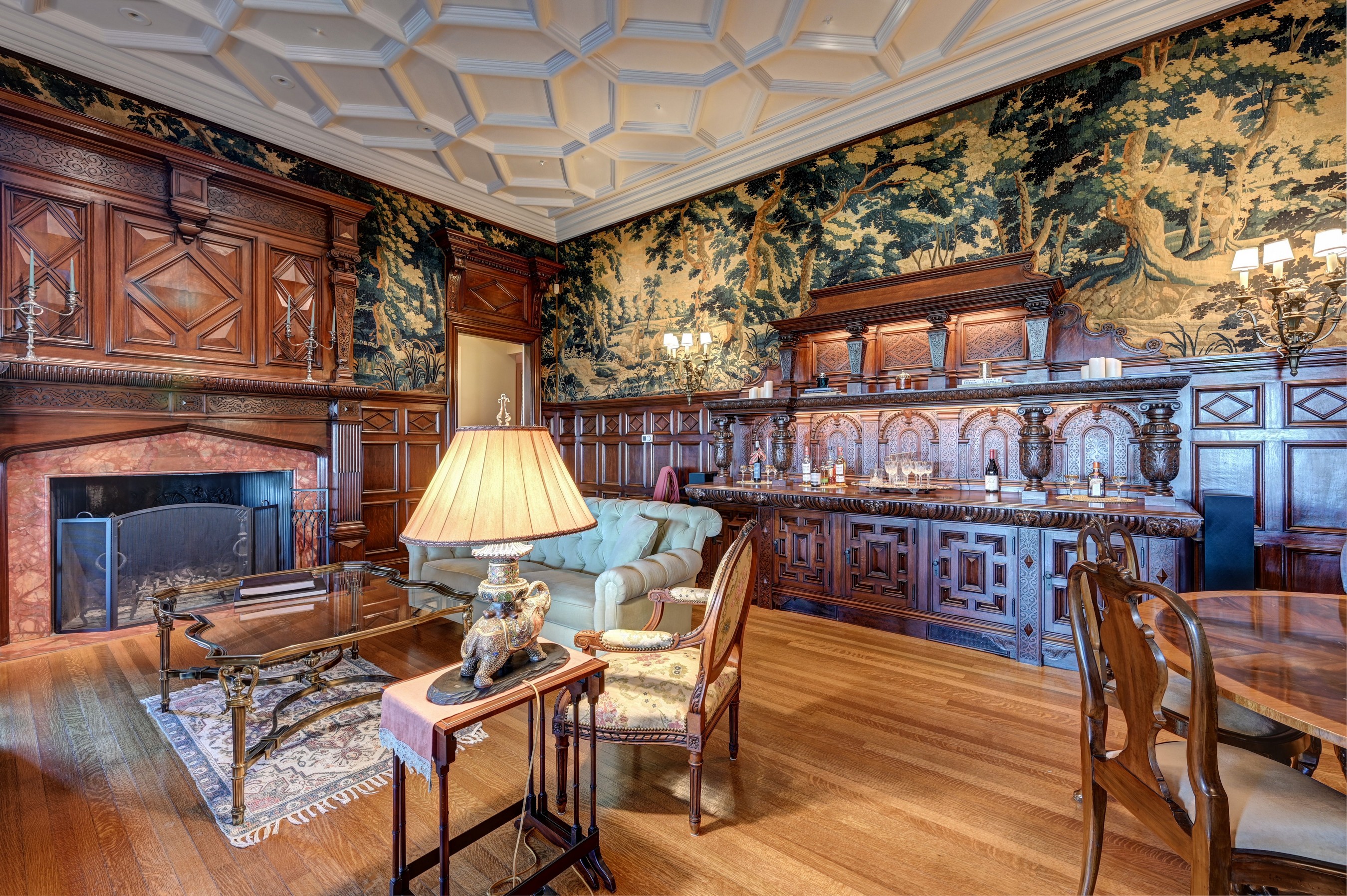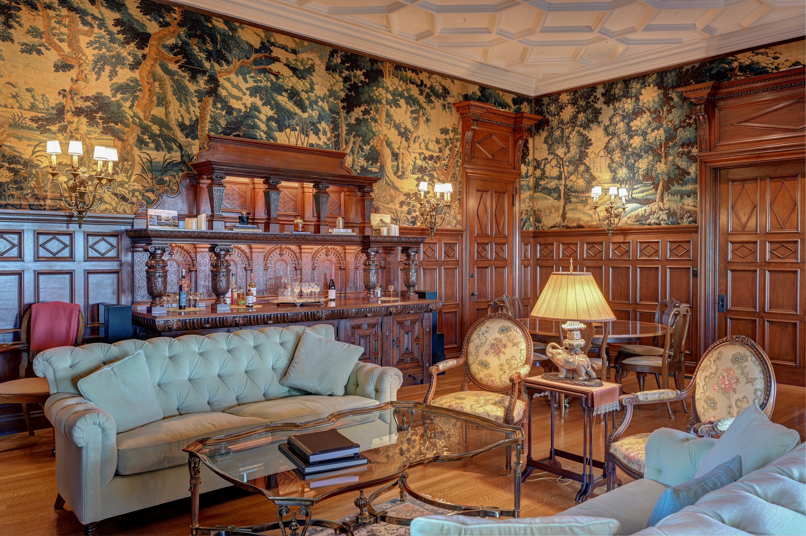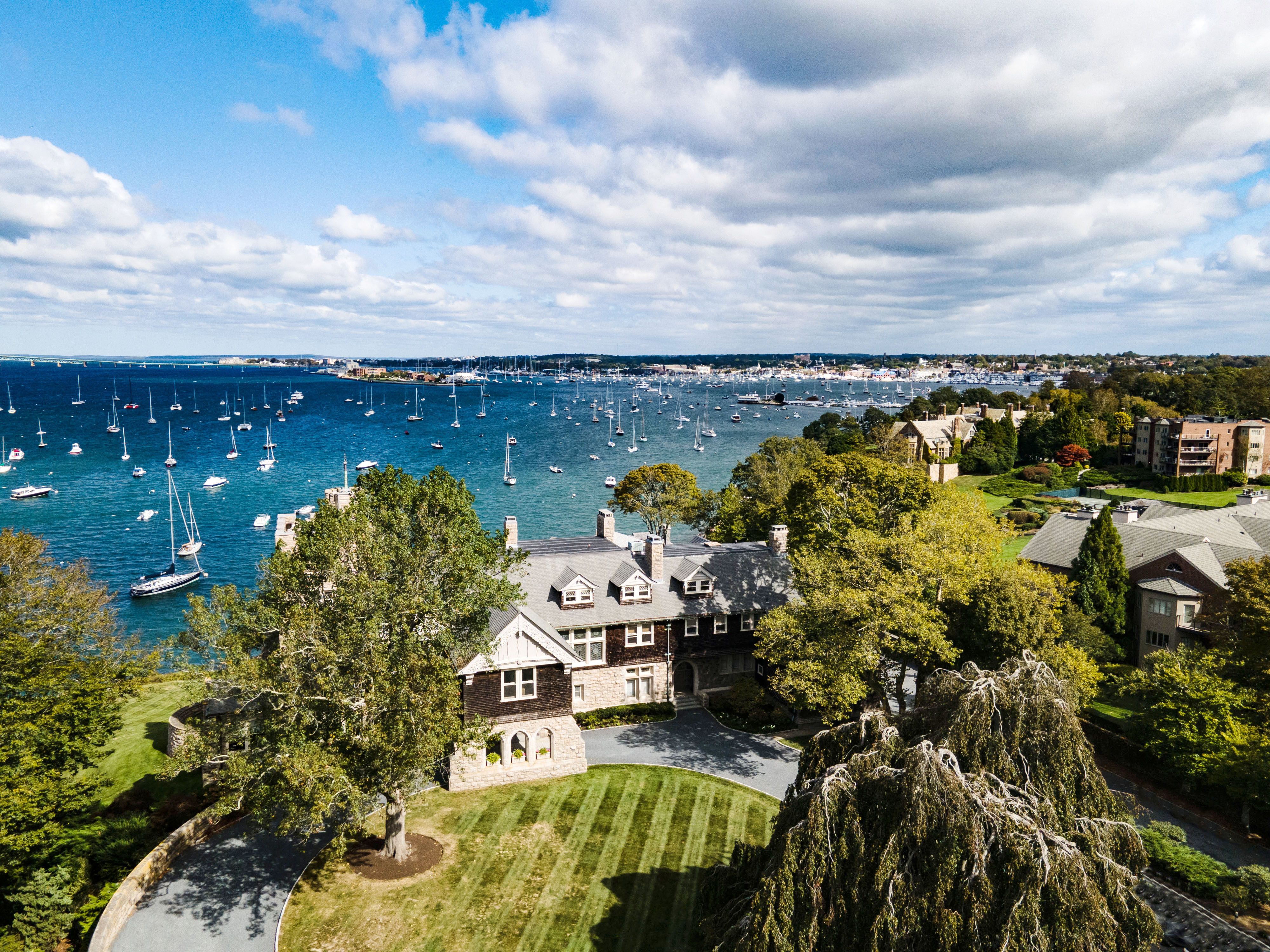 Perched gracefully along Newport Harbor’s edge, Beechbound is a magnificent Gilded Age manor designed in 1895 by the renowned architectural firm Peabody and Stearns. Set amid spectacular grounds inspired by the legendary landscape architect Frederick Law Olmsted, the estate is adorned with majestic European beech trees, gently descend to a private cozy beach, a boathouse, and a shared stone pier with a deep-water dock. Overlooking the sparkling waters of Newport Harbor and the iconic Claiborne Pell Newport Bridge, this extraordinary residence captures the romance and elegance of Newport’s storied past. The grand first-floor residence has been masterfully renovated in 2024 under the direction of interior designer Jillian Burke, elevating the home to a new level of comfort and refinement while preserving its historic character. The breathtaking Grand Room features soaring 14-foot coffered ceilings, an original red marble fireplace, richly detailed mahogany paneling with exquisite hand-carved accents, and a priceless tapestry. Facing west, the room opens directly onto a stone terrace, offering spectacular sunsets and glittering nighttime views across the harbor and bridge. The spacious kitchen with custom cabinetry and stone countertops, reflects the opulence of the Belle Époque era. French doors lead to a private deck—an inviting setting for al fresco dining and coastal living. The elegant primary suite features a beautiful fireplace, two generous closets, and a luxurious bathroom. A guest bedroom with beautiful ensuite bath and a comfortable den complete the residence’s gracious layout. While honoring the timeless beauty, the home also offers modern convenience with newly installed heating and cooling systems and fiber-optic. Beechbound’s prized harbor front location—with access to the shared stone pier and deep-water dock—allows residents to enjoy Newport’s coastal lifestyle to the fullest, whether taking a boat or water taxi to downtown Newport or to the New York Yacht Club. Make Beechbound your magical coastal retreat or an extraordinary primary residence.