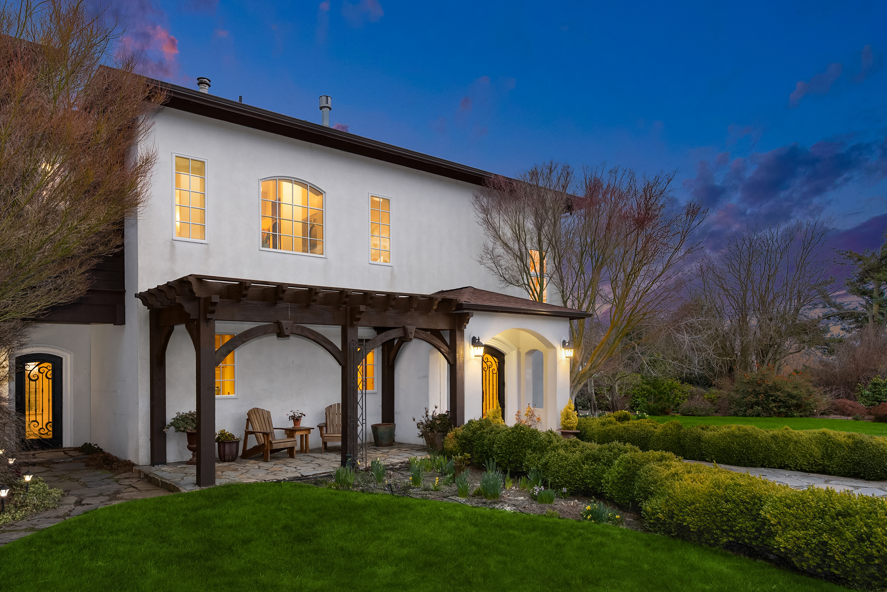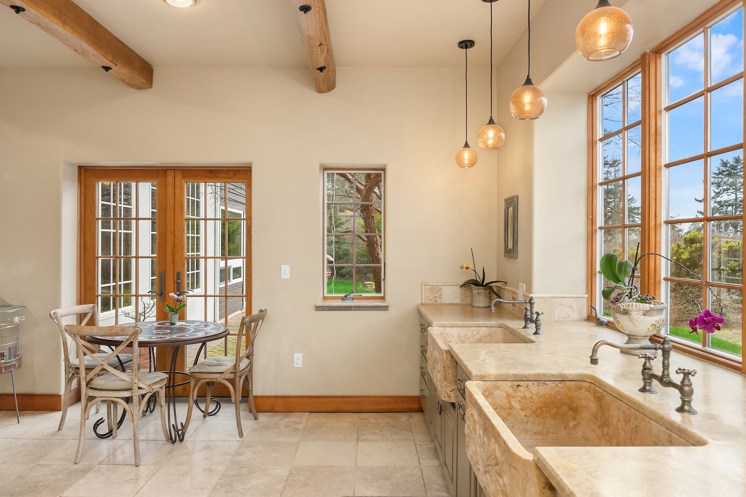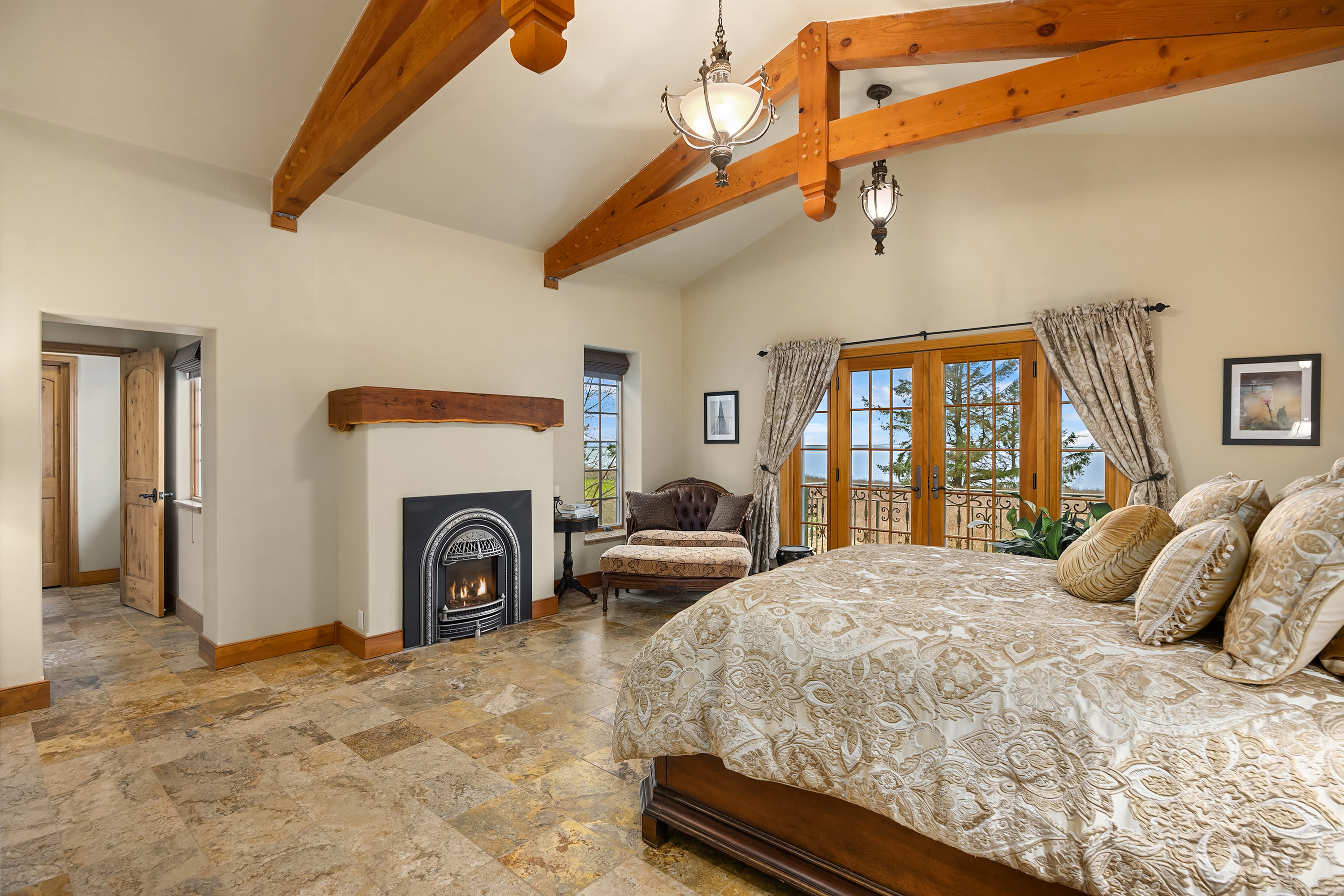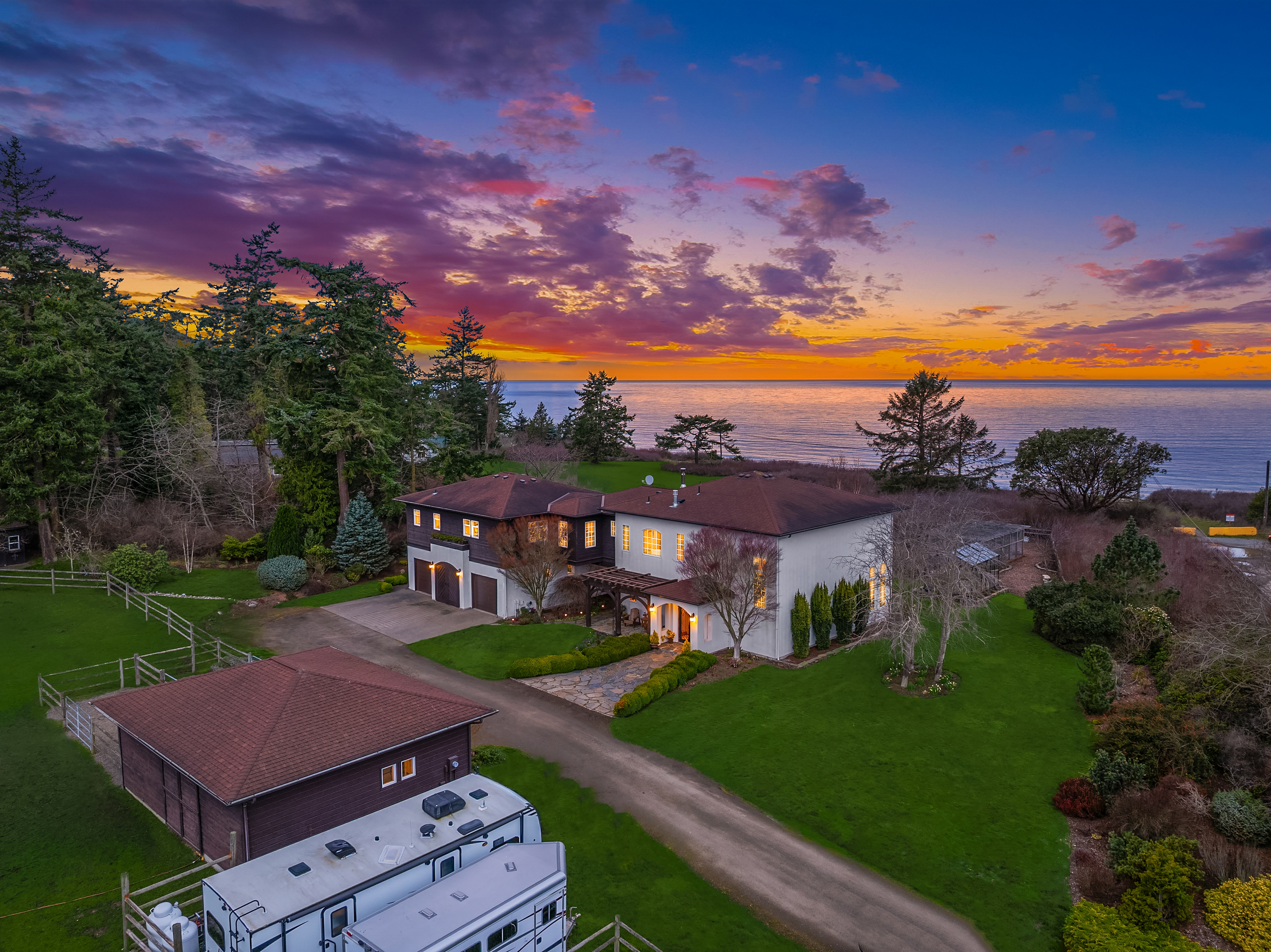 Perched on a bluff overlooking the Strait of Juan de Fuca, this exceptional country retreat offers refined living just minutes from Fort Worden and historic downtown Port Townsend. Designed with craftsmanship and intention, the great room showcases soaring ceilings, exposed timber framing, and a cast limestone propane fireplace - framing tranquil views of curated gardens and coastal light. The expansive primary suite is a sanctuary of it's own, featuring vaulted ceilings, dual propane fireplaces (including one in the spa-inspired en-suite bath) and a Juliette balcony capturing sweeping views. The chef's kitchen is built for both everyday elegance and grand entertaining, complete with a wood-fired Italian pizza oven, stone sinks, and a butler's pantry. Just beyond, an enclosed kitchen garden, greenhouse and hen house create a true farm-to-table lifestyle. A thoughtfully designed separate guest suite offers privacy for extended stays, multi-generational living, or caregiver quarters - complete with it's own deck, water views, fireplace, and en-suite bath, where passing ships and vibrant sunsets frame the horizon. Equestrian ready and remarkably versatile, the plumbed and wired 720 square foot 2 stall barn with paddocks and pasture can serve as a studio, workshop, bunkhouse or creative space. Ride out, bike or jog directly from your property - Cappy's Trails are just across the street. This is more than a home, it is a self-contained coastal retreat.
