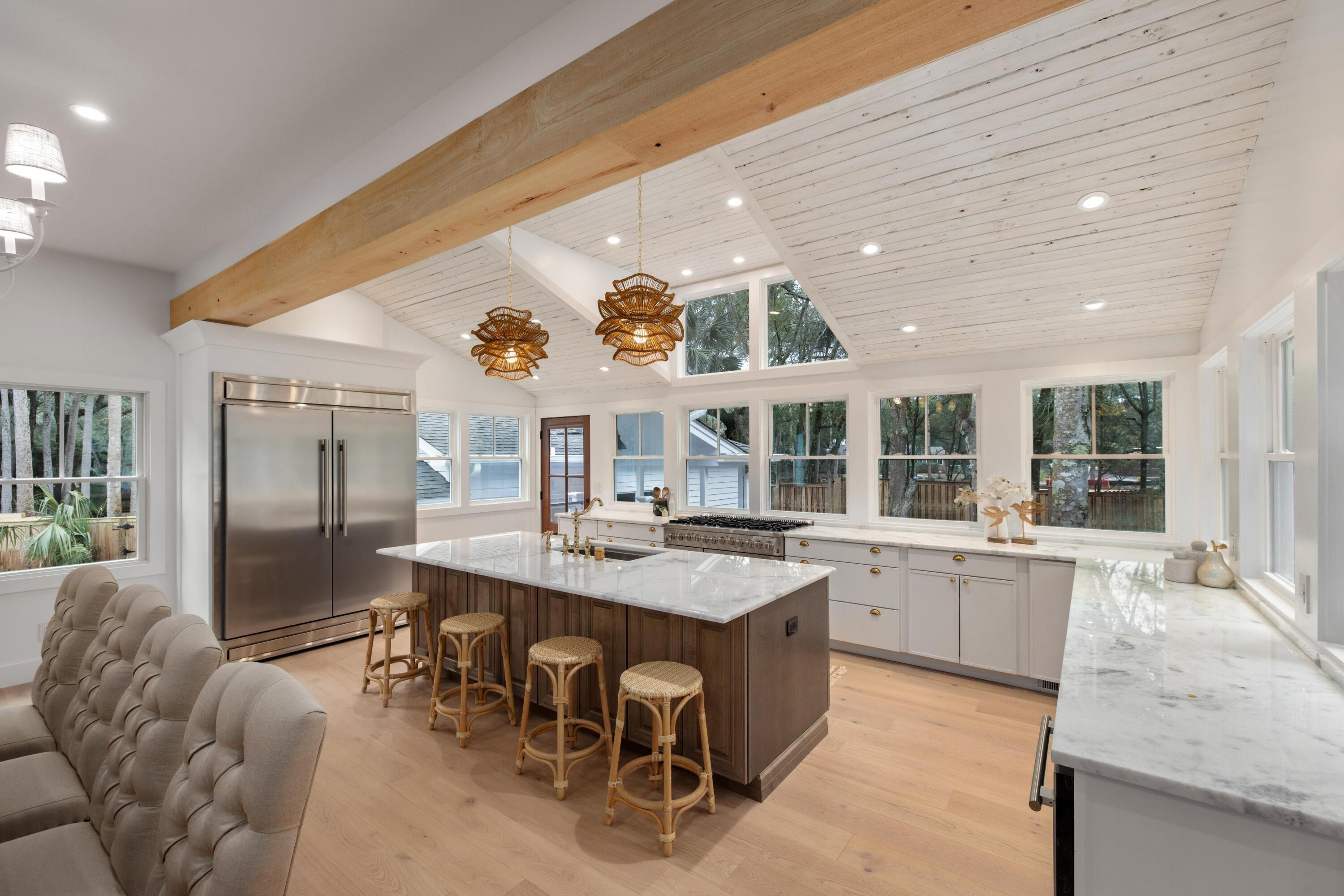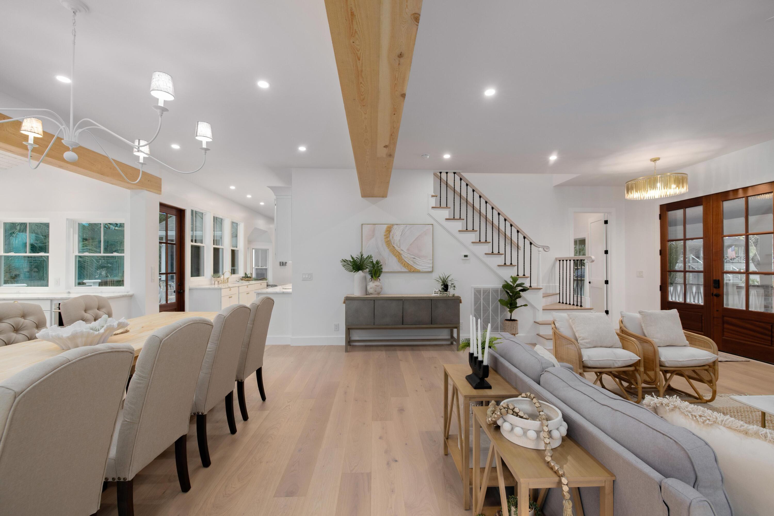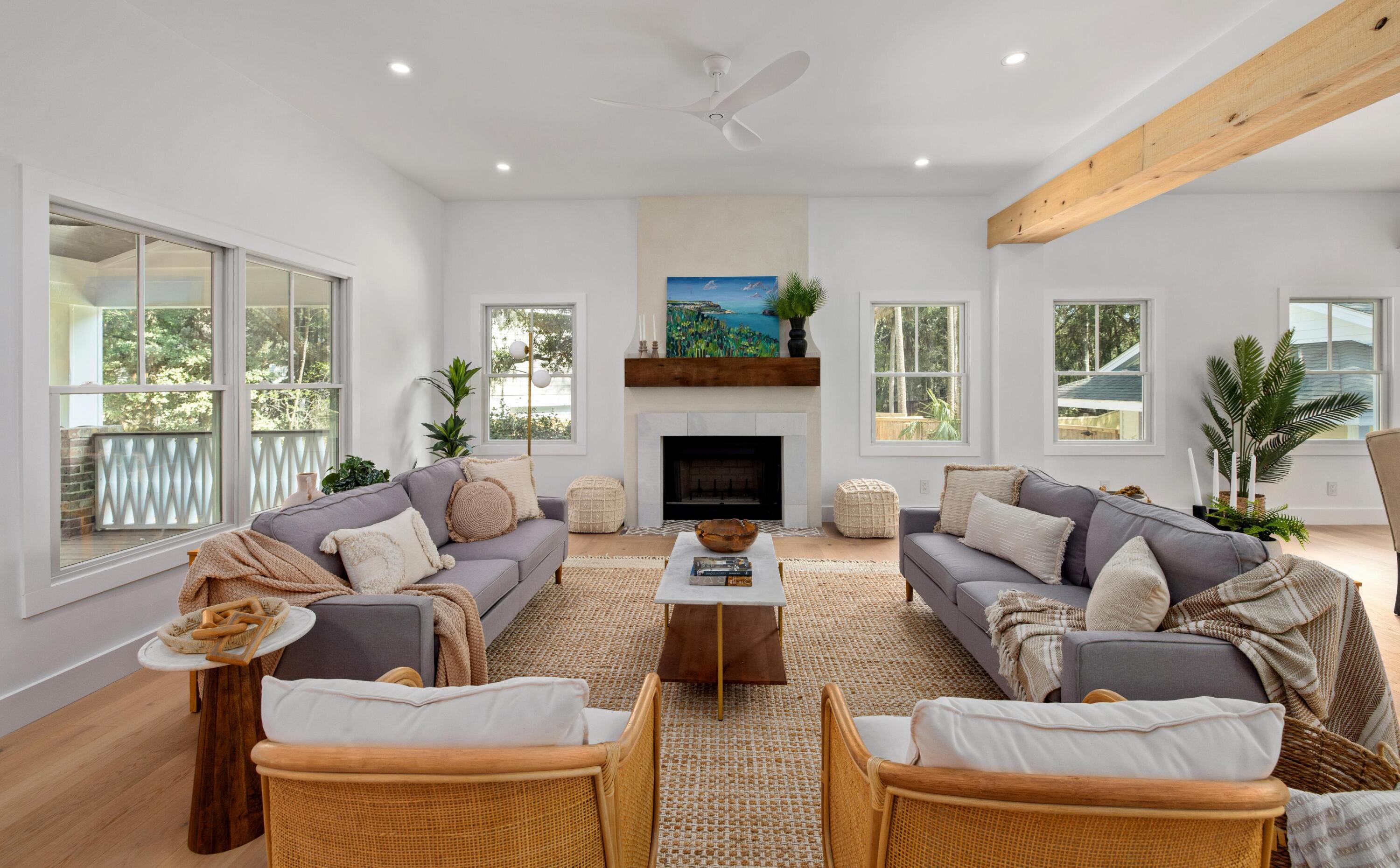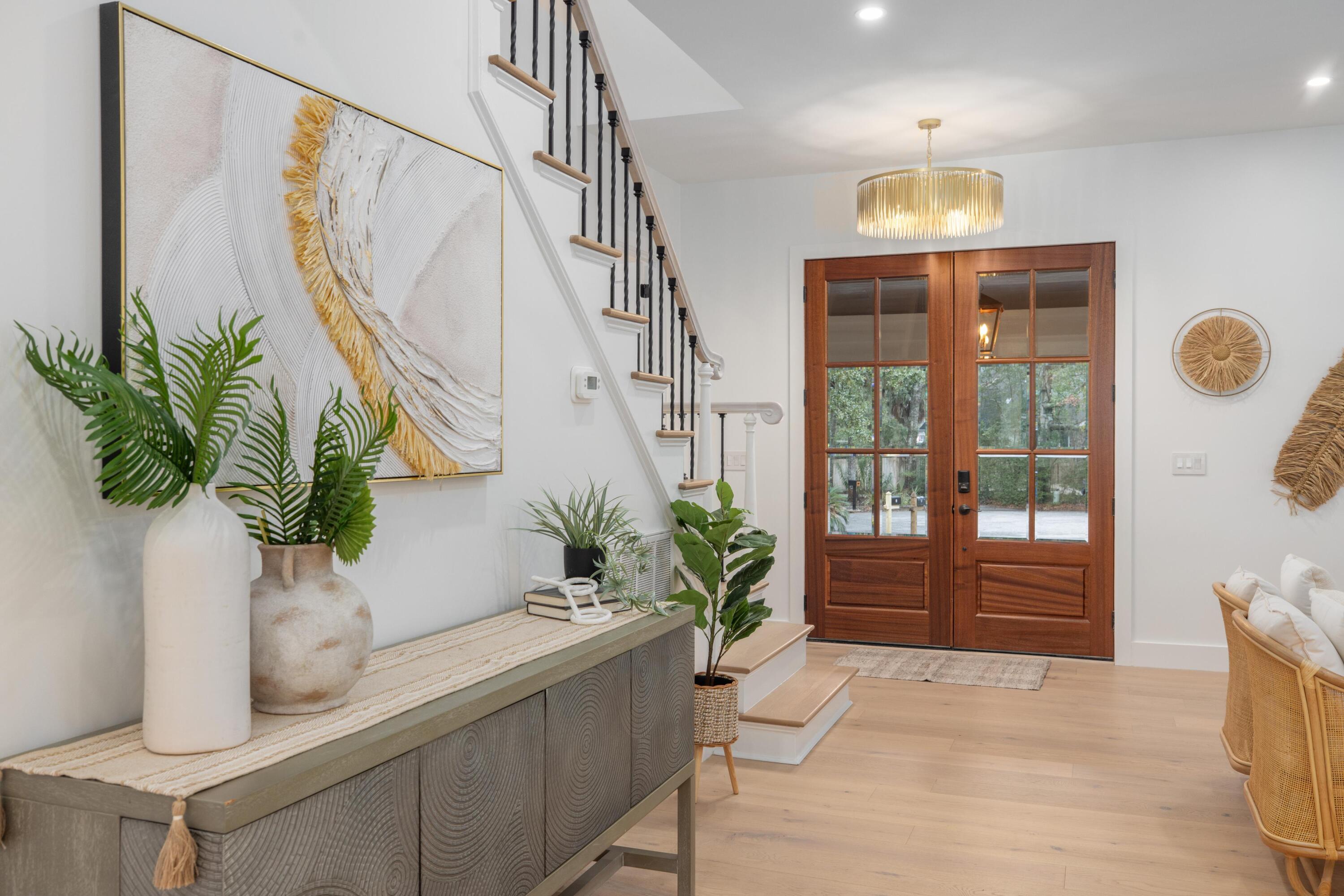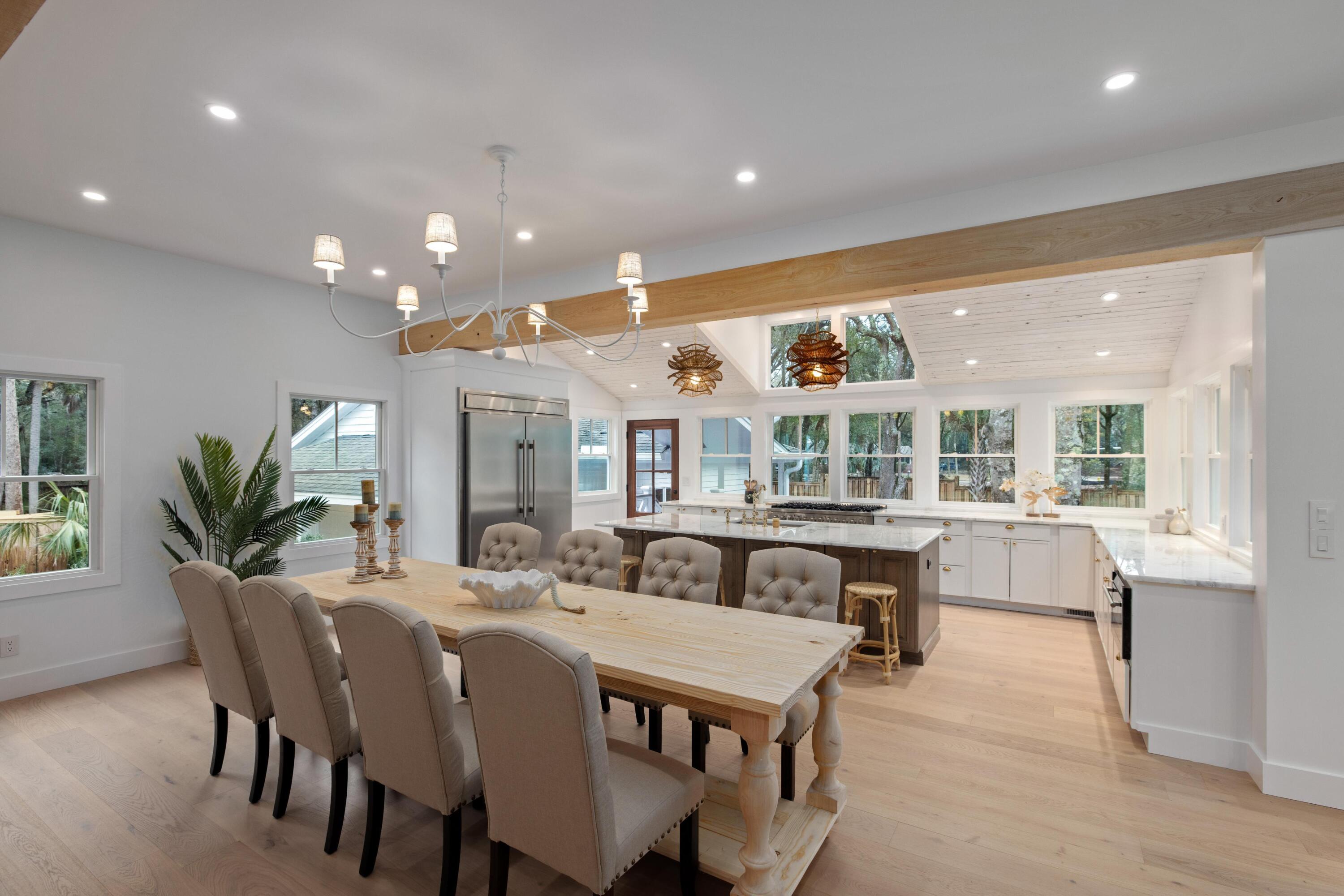 Thoughtfully designed and beautifully finished, this custom-built home blends timeless Lowcountry charm with elevated modern luxury in every detail.From the moment you enter, you're welcomed by light-filled living spaces, wide-plank hardwood floors, and carefully curated designer finishes throughout. The open-concept floor plan flows effortlessly, creating an ideal setting for both everyday living and entertaining.The chef's kitchen showcases marble countertops, custom cabinetry, premium fixtures, and a designer lighting package, all opening to inviting gathering spaces and seamless indoor-outdoor connections.The spacious primary suite offers a private retreat with vaulted ceilings and a spa-inspired bath featuring dual vanities, marble surfaces, a soaking tub, & a beautifullywalk-in shower with luxury brass fixtures. Upstairs, additional bedrooms provide flexibility for guests, family, or office space, along with a stylish hall bath finished with custom tilework and quality fixtures. A separate guest suite with its own ensuite bath offers privacy and versatility--ideal for visitors, multigenerational living, or a private workspace. Throughout the home, you'll find carefully selected lighting, custom tile details, and thoughtful architectural elements that elevate each space. Outside, a charming detached garage provides abundant storage and flexible use for vehicles, workshop space, golf cart storage, or future customization. This exceptional property combines refined design, functional living spaces, and timeless finishes--offering a rare opportunity to enjoy luxury craftsmanship in a beautifully executed home and only a 3-minute golf cart ride to the beach!