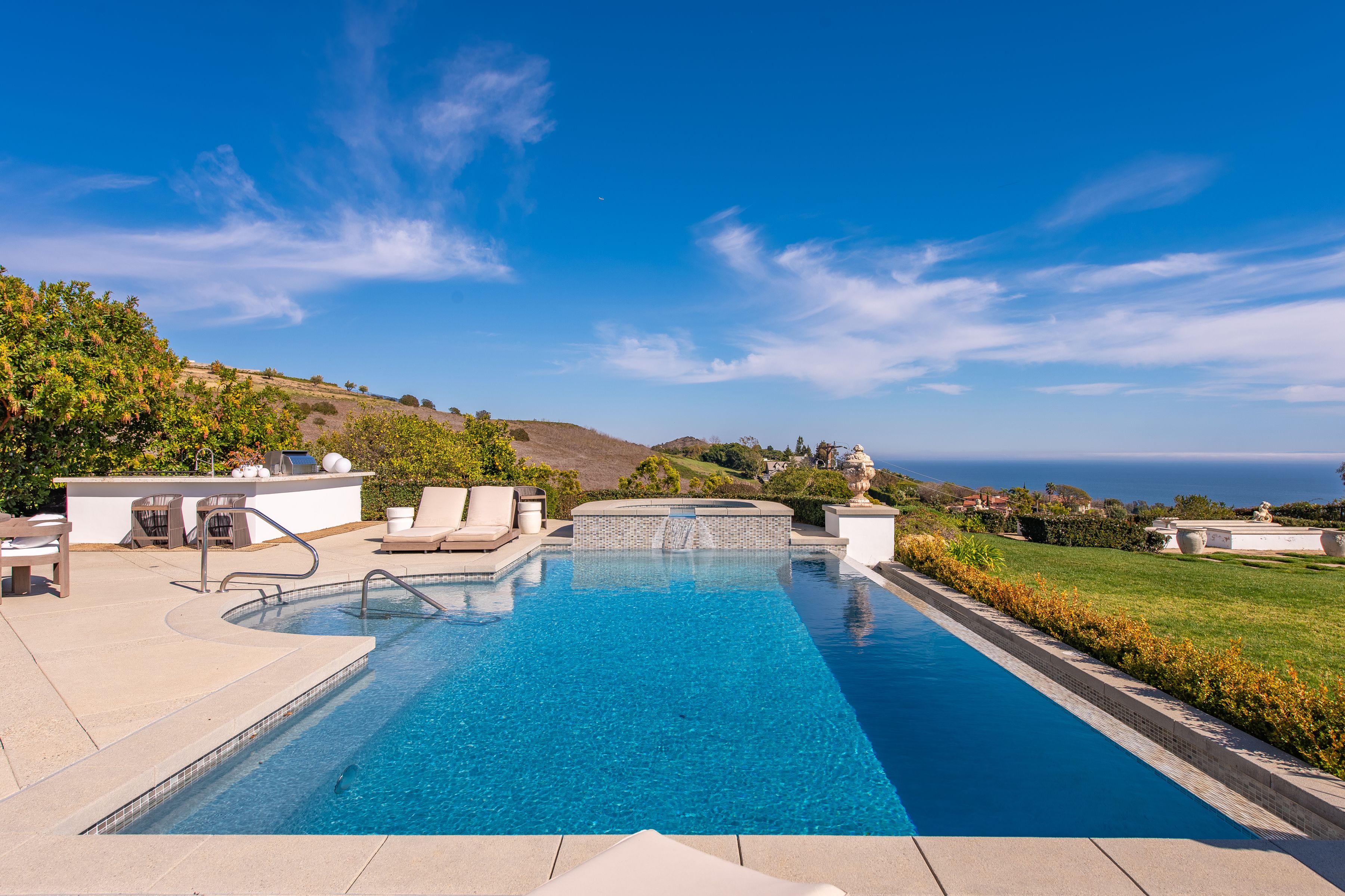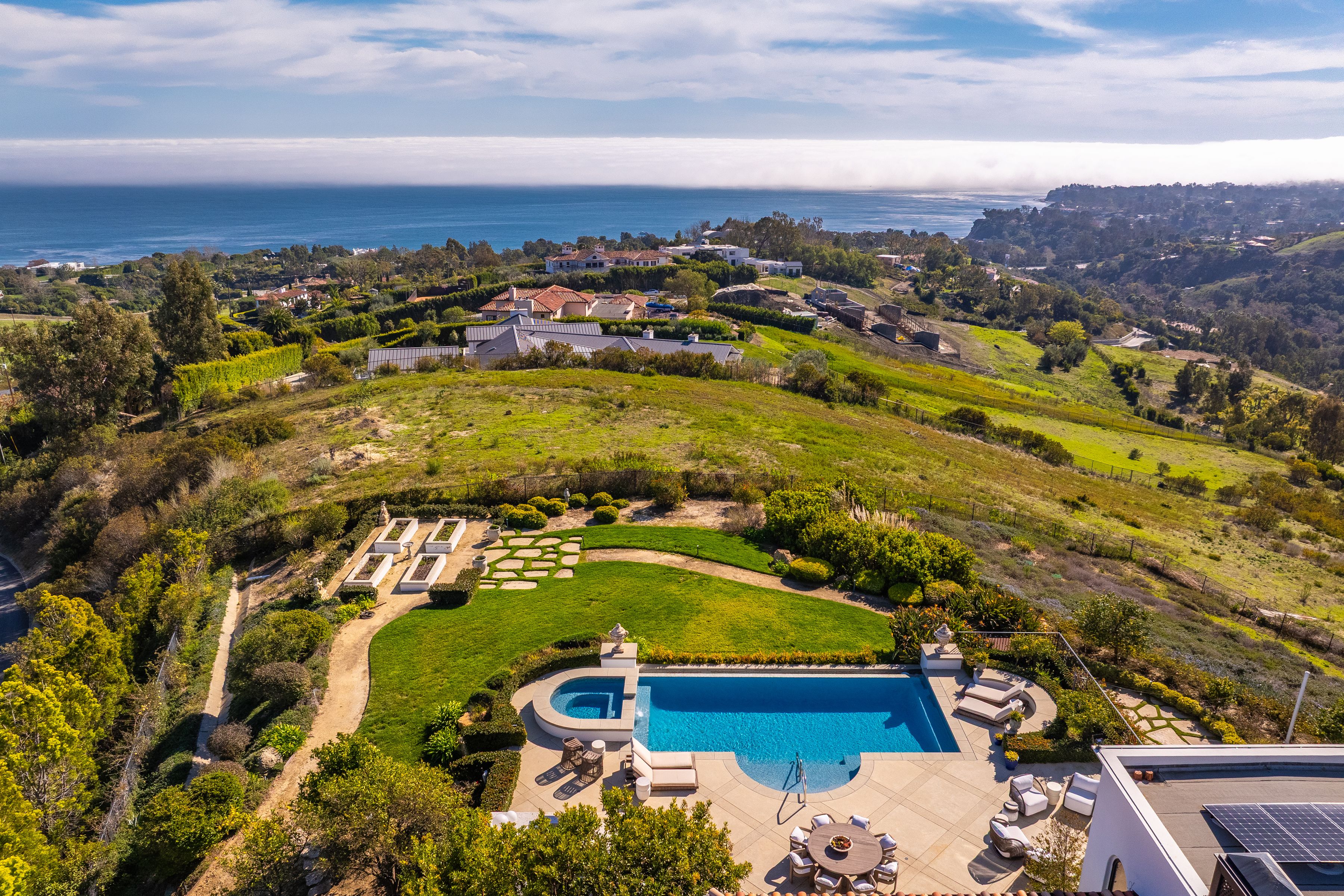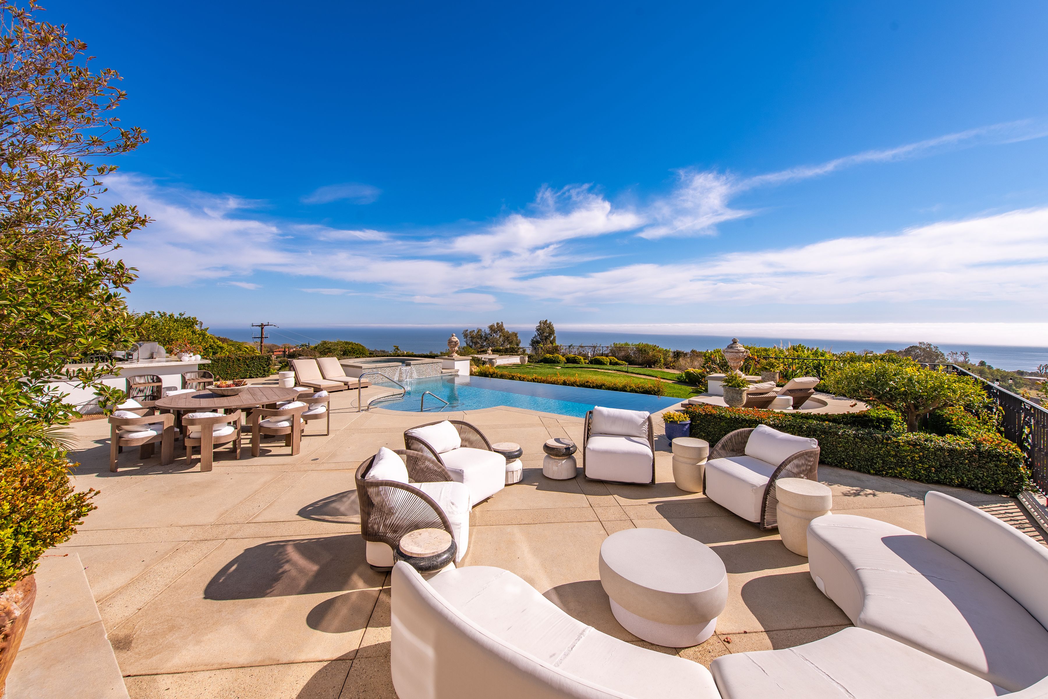 Perched behind gates on a private knoll along Malibu's prestigious hillside, Villa Victoria offers unobstructed ocean views, breathtaking sunsets, and an exquisite blend of cutting-edge technology and timeless coastal elegance. Moments from Paradise Cove, Point Dume, and iconic destinations such as Nobu, Geoffrey's, and Little Beach House, this estate delivers ultimate serenity with direct access to nearby beaches, hiking trails and the cascading Escondido Falls.Blending Mediterranean architecture with seamless indoor-outdoor living, the estate features soaring beamed ceilings, carved stone mantelpieces, French doors, and floor-to-ceiling windows framing the Pacific Ocean and Catalina Island. The open-concept design connects the living room, family room with fireplace, and a chef's kitchen to the expansive pool terrace, outdoor kitchen, dining areas, and day-and-night lit infinity pool with jacuzzi perfect for entertaining under the Malibu stars.The primary suite is a peaceful retreat, offering a fireplace, spa-inspired bathroom, generous walk-in closet, and a private wraparound deck with panoramic views. Five additional en-suite bedrooms, including a versatile study/library, provide elegant accommodations. Exceptional amenities include a fully equipped gym with Peloton, a luxurious home theater, and entertainment room with wet bar. Villa Victoria is a fully integrated smart home featuring a Control4 system managing lighting, security, heating, entertainment, and pool functions. High-speed Frontier fiber optics, dual Starlink satellite systems, indoor-outdoor Wi-Fi extenders, a SONOS integrated music system, motorized shades, Alexa voice assistants, and a dedicated server rack ensure seamless connectivity and convenience throughout. Climate control is optimized with NEST Learning Thermostats on each level. Wildfire protection includes early detection via Iridium satellite, high-pressure roof sprinklers, Rainbird perimeter irrigation, a 100-gallon fire retardant tank, and pool-fed backup water systems. Solar-powered dusk-to-dawn floodlights and smart air quality monitoring further enhance estate safety.Accessibility features include ADA-compliant design, a sleek pneumatic vacuum elevator, and an Acorn stairlift. The private motor court accommodates up to 50 vehicles, offering ample event hosting opportunities. Sustainability meets luxury with hidden roof-mounted solar panels, four Tesla Power walls, and a Generac backup generator, creating a self-sustaining micro-grid. The grounds include a lush English garden, organic fruit and vegetable plots, and a chicken coop providing fresh eggs daily. Just minutes away are world-class dining, shopping, and Pepperdine University's campus, as well as hiking and outdoor adventures through the Santa Monica Mountains.A true legacy estate, Villa Victoria embodies coastal serenity, innovative luxury, and timeless beauty and unparalleled offering in the heart of Malibu.