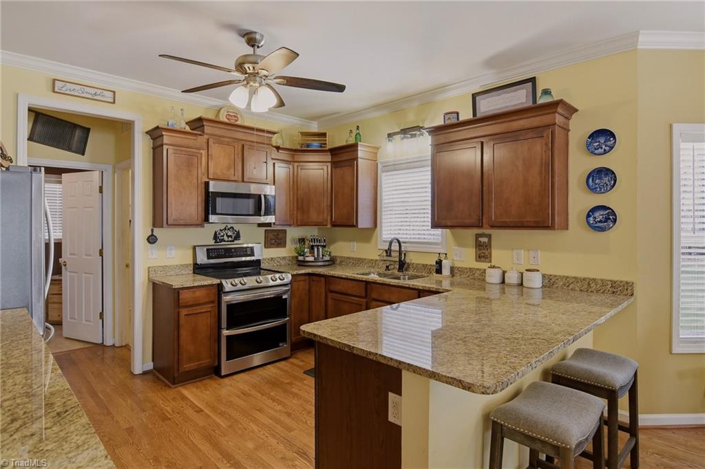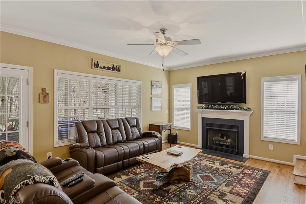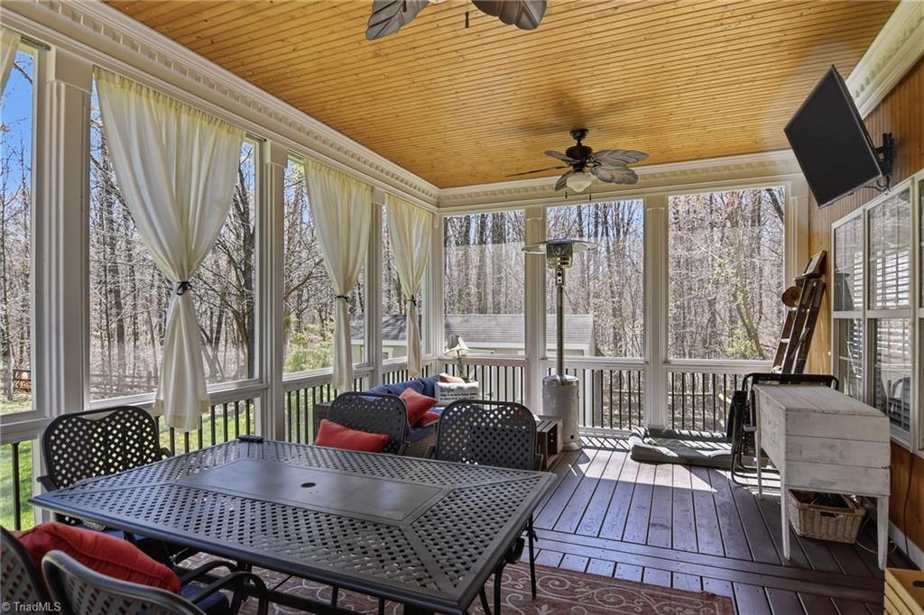 Tucked away at the end of a quiet cul-de-sac on a spacious 1.23-acre lot, this beautifully maintained 3-bed, 2.5-bath home offers the privacy and flexibility today's buyers are looking for. Inside, you'll find warm hardwood floors, multiple living areas, and a cozy den with fireplace that creates an inviting place to unwind. The kitchen provides ample workspace and storage, ideal for both everyday living and entertaining. Upstairs, the spacious primary suite features a private sitting area, perfect for a quiet retreat. A standout feature is the versatile bonus room, currently set up as a theatre room w/projector & screen that convey. Enjoy year-round outdoor living on the oversized screened porch (13'6 x 18'10 ) overlooking the private, fenced yard. One year home warranty included. Conveniently located near Belews Lake, I-73, PTI Airport & Greensboro, this home offers the perfect balance of peaceful living & accessibility, along w/the advantage of a lower tax rate.
