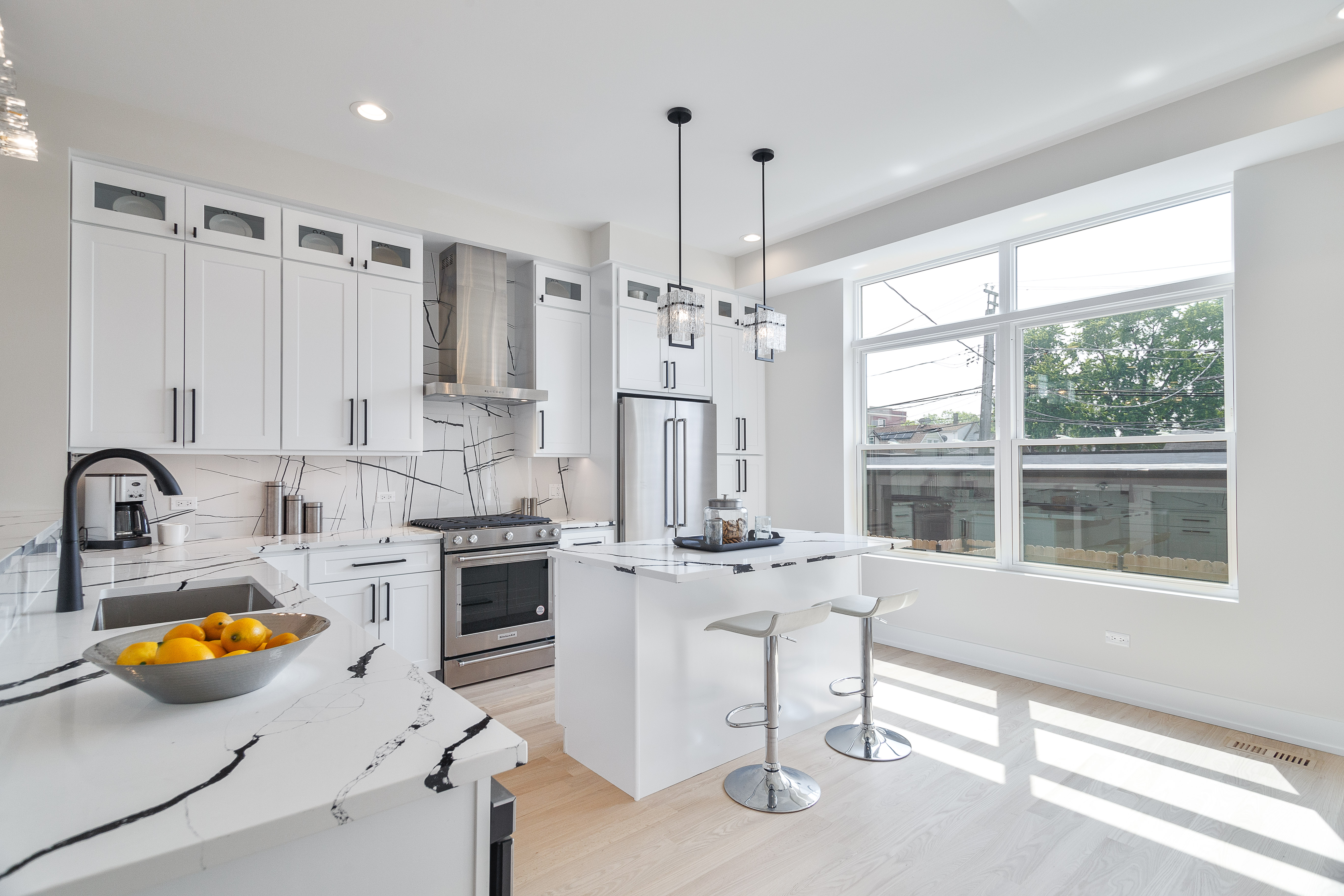 8 On Central - Modern new construction row-home project in Portage Park by top Chicago developer. Sun filled open concept main level features spacious living/dining area with oversized front windows and natural hardwood flooring throughout. Adjoining eat-in kitchen with stainless steel KitchenAid appliance package, soft close shaker cabinetry with glass transoms and under counter lighting, quartz countertops, island, breakfast bar, pantry with custom organizers, and exit to backyard. Bright and spacious primary suite with WIC and private bath featuring a frameless glass shower and dual vanity. Two additional bedrooms, full guest bath with tub and dual vanity, and laundry with washer/dryer complete the upper level. Sunny lower level with family room featuring wet bar and beverage center, 4th bedroom, full bath with frameless glass shower, and utilities. On trend design features, statement lighting, nice ceiling heights, custom closets, and tons of natural light! Private yard and detached two-car garage. Conveniently located near restaurants, shopping, entertainment, parks, public transportation, and more! Estimated completion May. Photos are from the model home (phase 1).