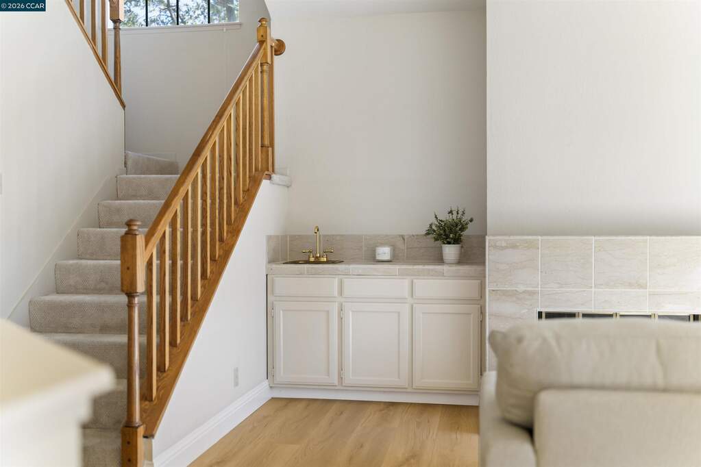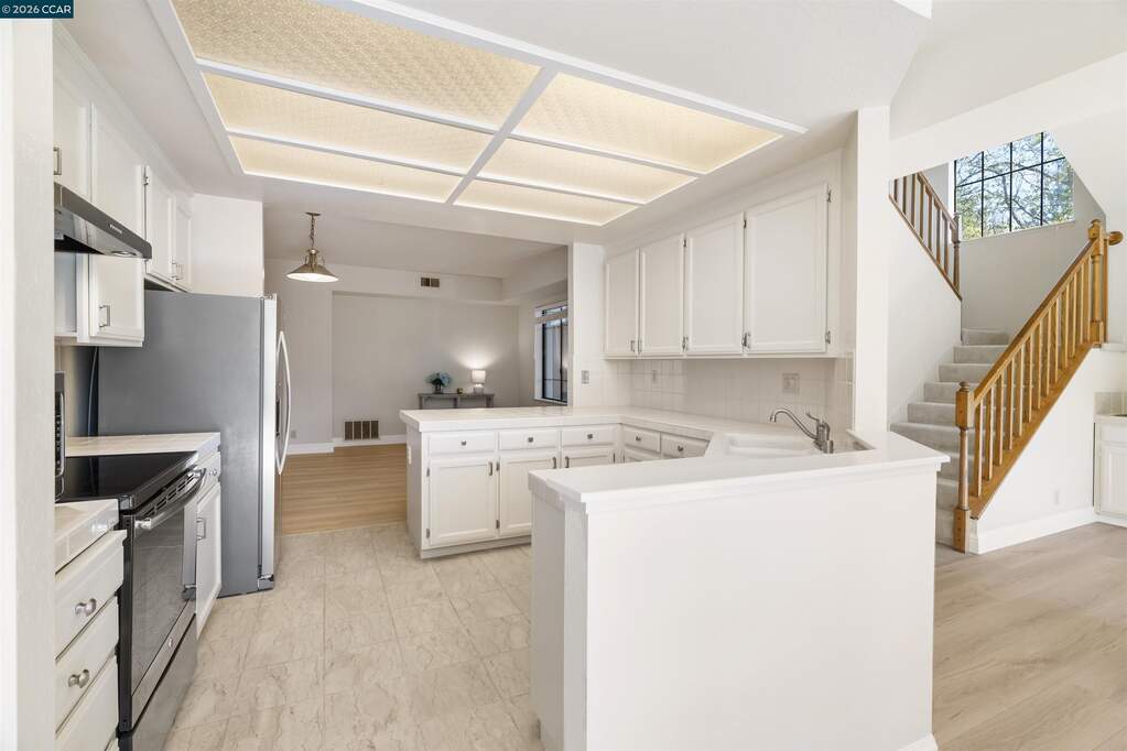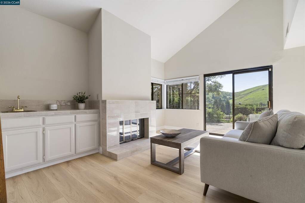 Fabulous End Unit with gorgeous views! Beautiful Eagle Nest Townhome with 1,976 sq.ft. apx. on .11 ac. lot apx. inside the gates of Blackhawk. Charming Entrance! Marble tile foyer. 1st floor powder bathroom. Inviting kitchen with GE Range and recent stylish painted cabinetry, hardware and new Whirlpool stainless refrigerator. The adjoining family room conveniently located next to the kitchen is an ideal entertainment area or workspace area. New stylish laminate flooring in the family room, living room and dining area. The beautiful living room and dining area have picturesque views of the surrounding hills and access to the charming rear yard and outdoor patio. Well-designed floorplan with three bedrooms, two full baths and a convenient laundry room on the upper level. Primary Bedroom Suite with volume ceilings, ceiling fan/light, and picturesque views. The adjoining primary bathroom has two vanities, separate tub and shower and a walk-in closet. The upstairs secondary bedrooms share a lovely jack and jill bathroom. Gorgeous new laminate flooring in the Family Room and Living Room and Dining Room. New Carpet in 2025. Neutral Paint throughout. Fabulous place to call home for great indoor-outdoor living and views!
