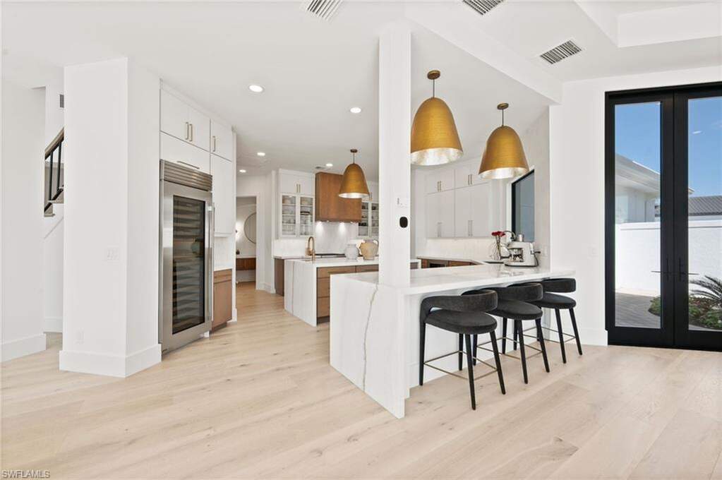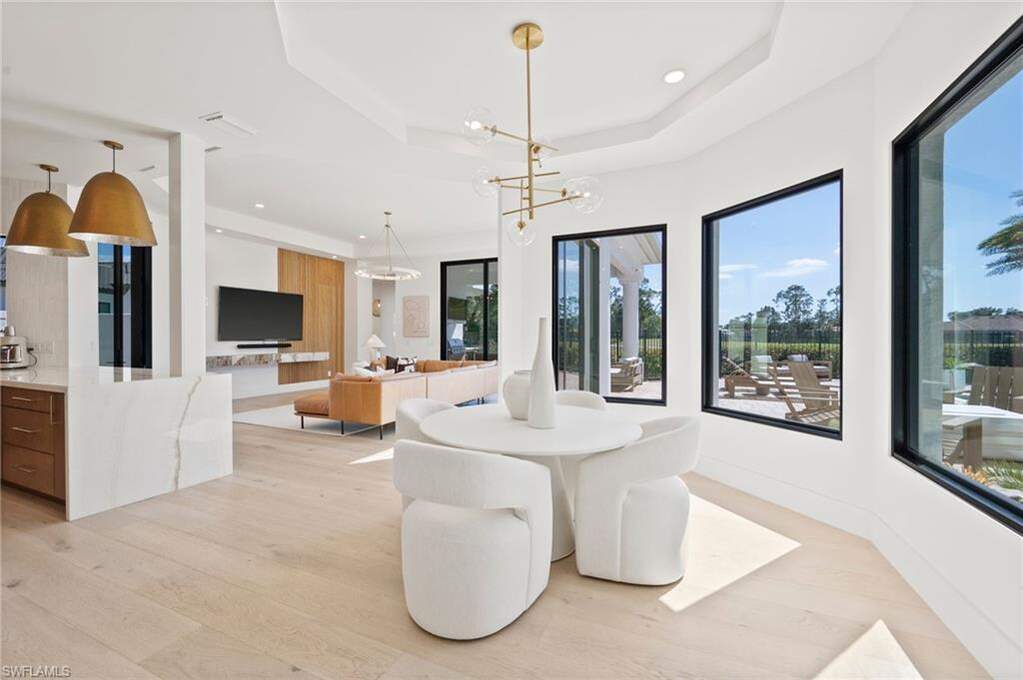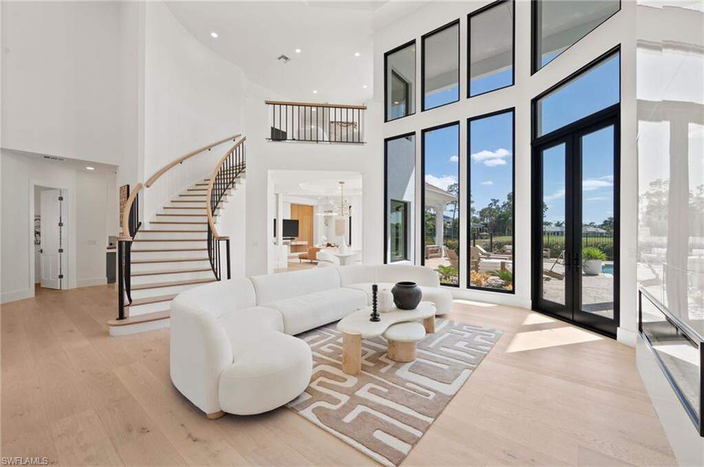 Welcome home to your fully reimagined Quail West Estate that blends modern design with timeless livability. Set on a near acre lot with southern exposure, enjoy expansive water & golf course views on #15 Preserve. On par with new construction quality, the list of features will please the most discerning of luxury buyers. All-new Marvin hurricane-rated windows and heightened doors, new paint, new driveway, garage doors & gutters, new LED lighting (inside too), lush landscaping, refinished railings, and a sealed lanai to top the list of exterior enhancements. The resurfaced pool and spa, new tile and pool equipment create a resort-style outdoor retreat, complemented by a new outdoor kitchen and bar ideal for entertaining. Inside, the home showcases a sophisticated renovation anchored by white oak flooring throughout, redesigned railings, squared-off openings, and a striking new fireplace wall. The fully renovated kitchen features custom cabinetry, Wolf and Sub-Zero appliances, marble countertops, and designer lighting. Every bathroom has been completely remodeled with new vanities, tile, plumbing fixtures, and lighting, while all interior doors, hardware, and baseboards are brand new adding to the cohesive modern aesthetic. Additional enhancements include motorized and manual blinds, programmable Wi-Fi thermostats, two new hot water heaters, and a whole-house generator with a 500-gallon propane tank for peace of mind. The primary suite A/C and air handler have also been replaced. If that's not enough, all interior and exterior furnishings have been professionally selected and are included in the list price! With 4 bedrooms + den, formal living and dining rooms, and a 3-car garage with additional storage, this home offers both scale and comfort. Quail West membership options are available, completing an exceptional opportunity in one of Naples' premier luxury golf communities.
