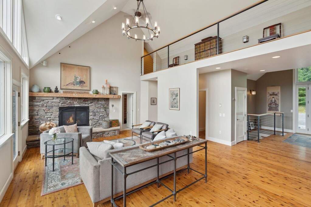 Westerly views and well-executed outdoor living spaces define this thoughtfully designed home. Oversized windows, cathedral ceilings, and an open layout bring in natural light and create a sense of volume throughout the main floor. A stone fireplace anchors the living room and connects the living, dining, and kitchen areas, each oriented toward the surrounding landscape. The main level includes a private primary suite with views toward Nebraska Valley. One level below are four additional bedrooms and two full bathrooms, providing comfortable accommodations for family and guests. The walk-out lower level, accessible by stairs or elevator, features a spacious recreation room and wine cellar. The outdoor spaces are equally well considered, with terraced gardens, stonework, and a generous patio with a wood-burning fireplace and outdoor kitchen. Above the garage, a one-bedroom apartment offers flexibility for guests, extended family, or rental use. Located just south of Stowe village, the property provides convenient access to I-89, Stowe Mountain Resort, Trapp Family Lodge, and local schools, while remaining close to the area's year-round recreation, dining, and community amenities.