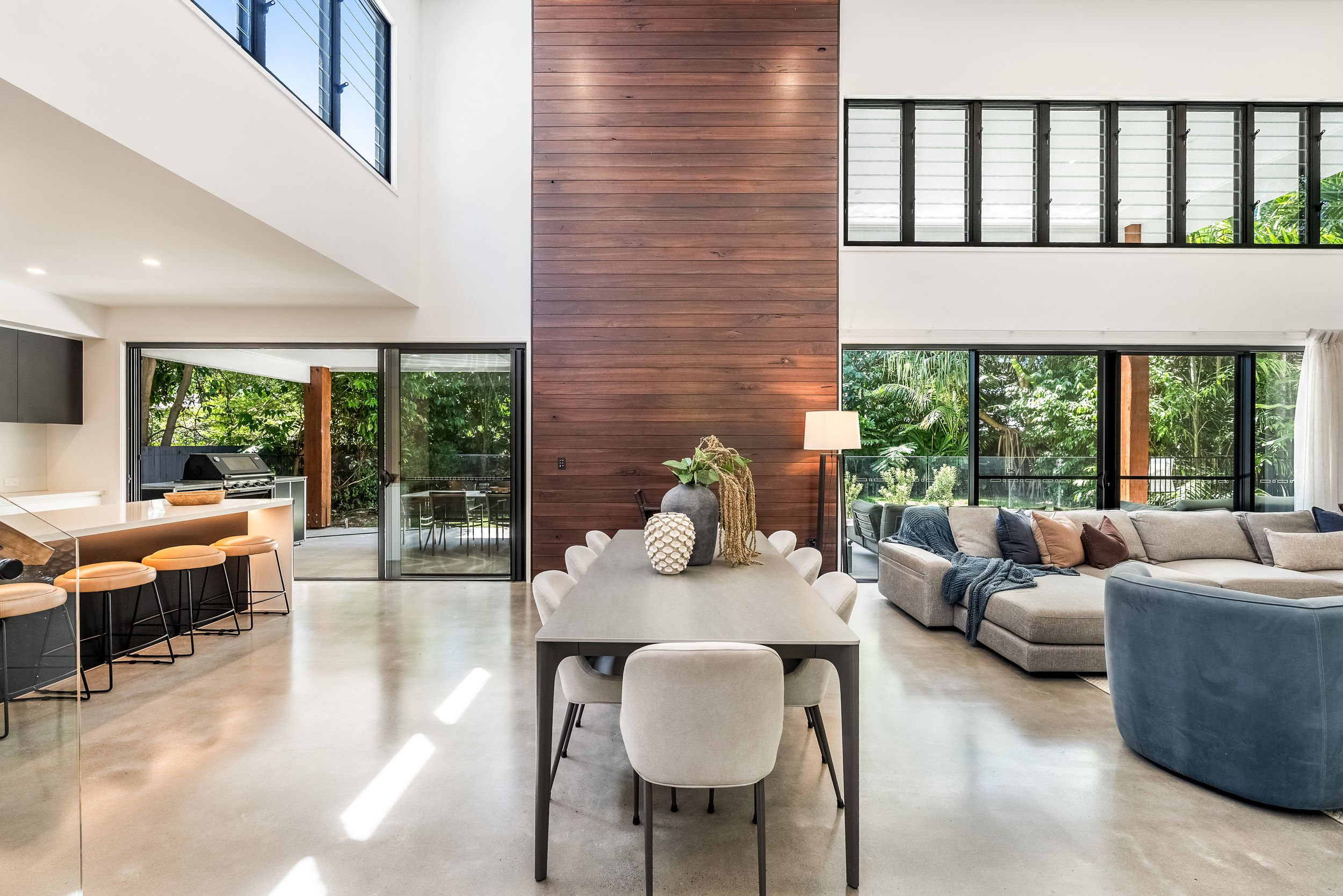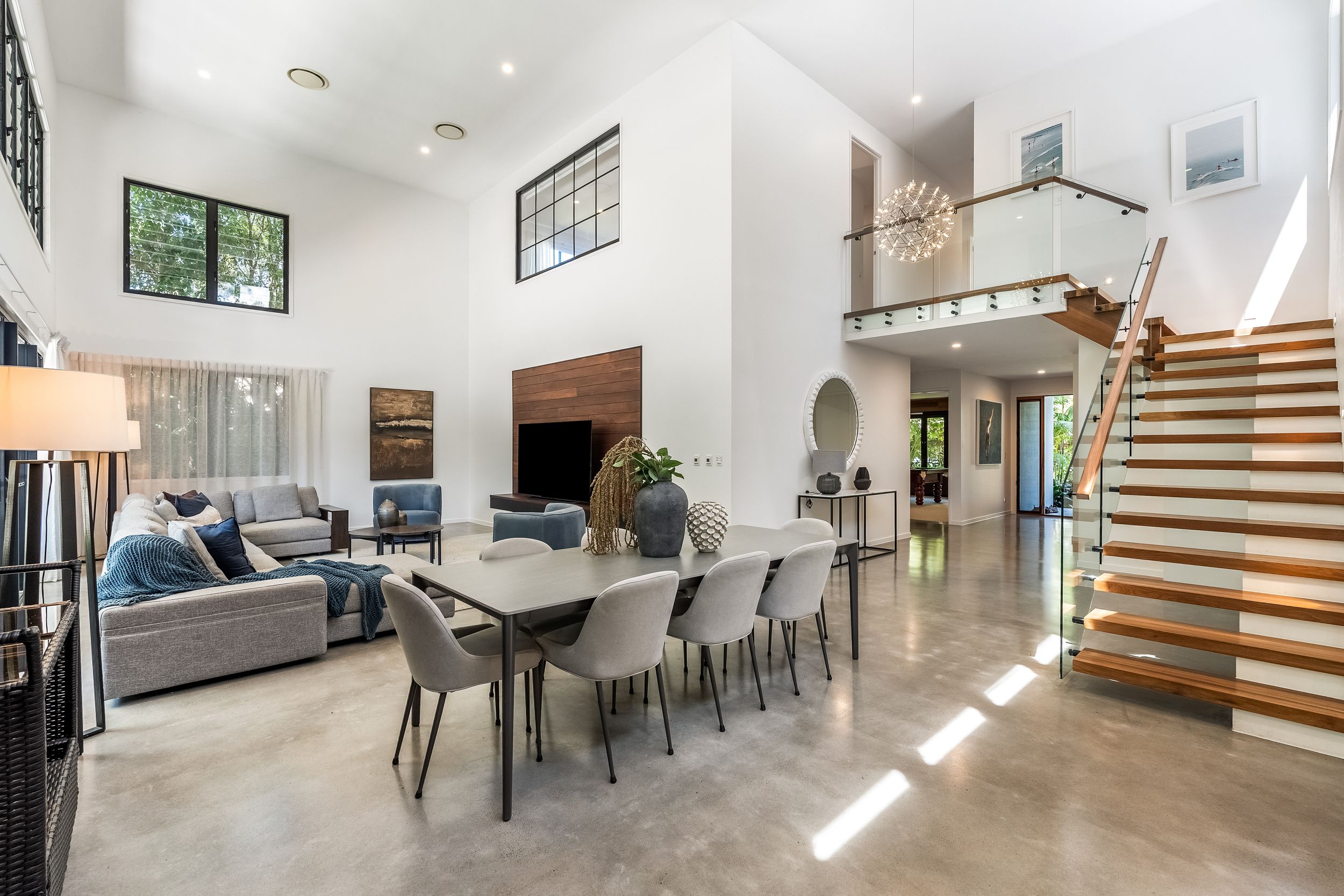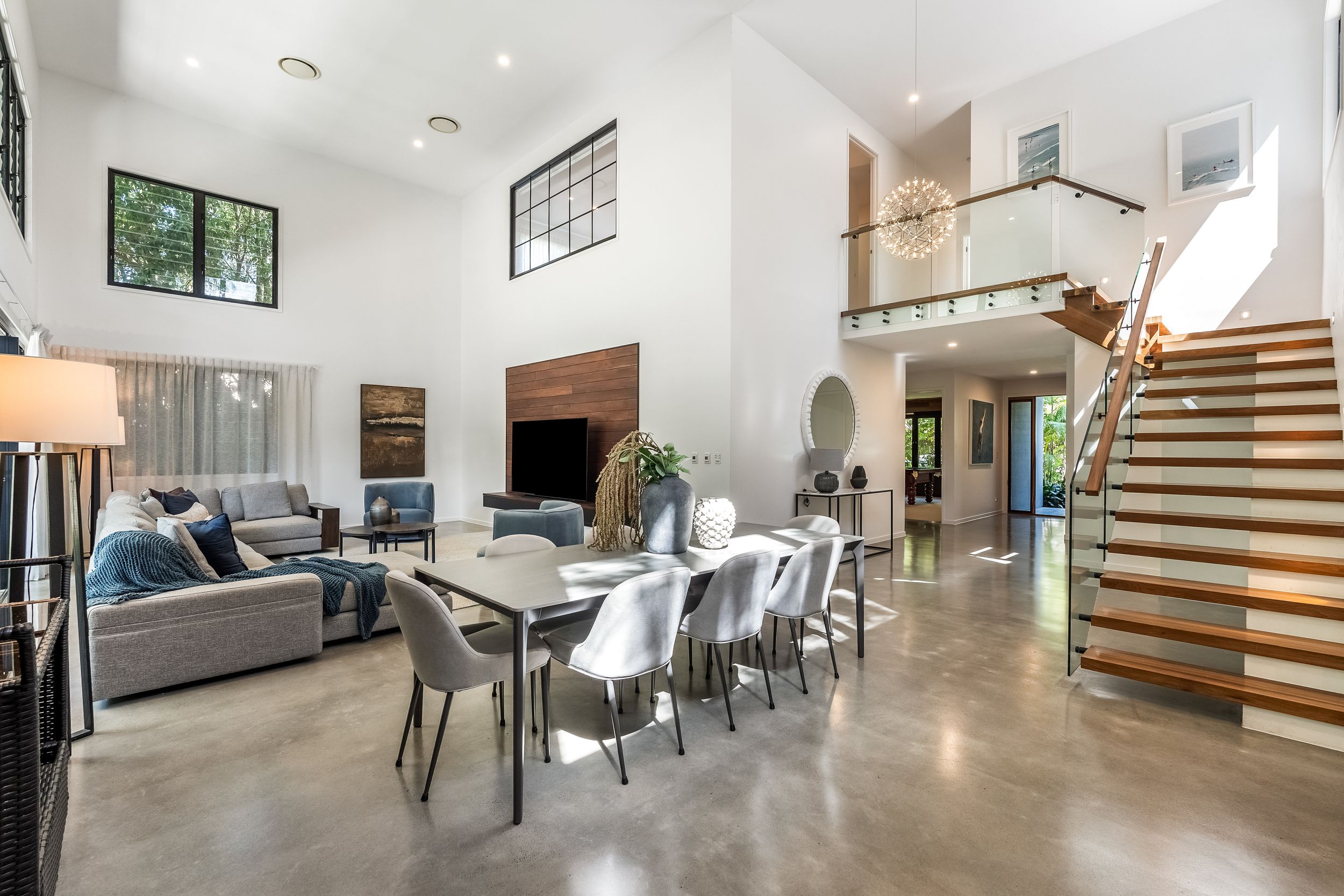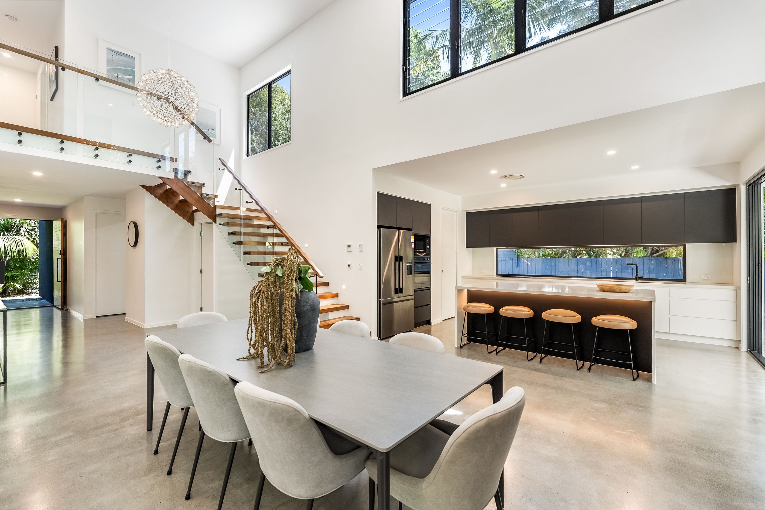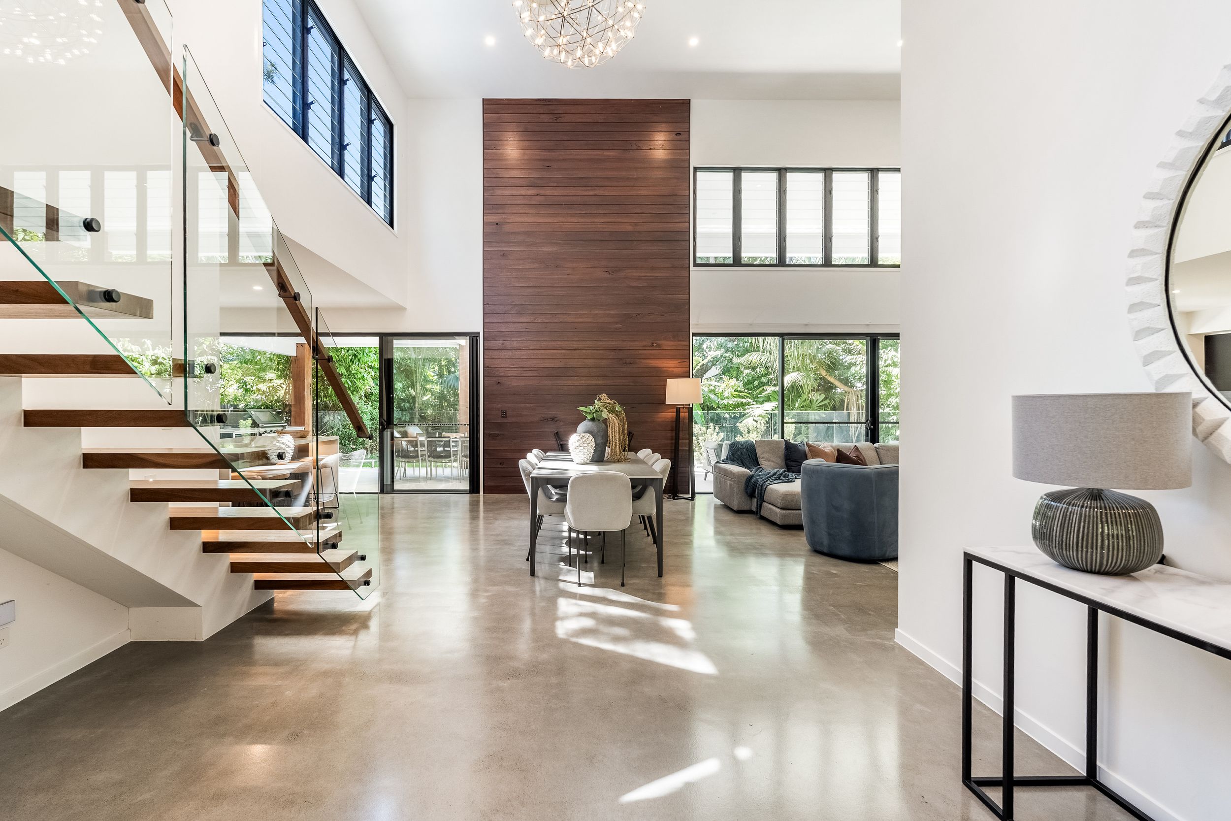- Impressive five bedroom, two storey residence in prized Suffolk Park, steps to the beach - Soaring double-height void with statement chandelier creates a dramatic sense of space and light – Beautiful polished concrete floors throughout the ground level, plush carpet to bedrooms - Sleek contemporary kitchen with quality integrated appliances and breakfast bar - Seamless indoor-outdoor flow from the kitchen and living area to the covered patio and pool - Sparkling swimming pool set within lush tropical gardens and manicured lawns - Grand main bedroom suite upstairs with walk-in robes, private ensuite and generous proportions - Designer bathrooms featuring geometric floor tiles, timber vanities and matte black fixtures - Floating timber staircase with glass balustrade, ceiling fans, and abundant natural light throughout - Oversized garage plus additional driveway parking, laundry and storage - A short stroll to Tallow Beach, moments to Suffolk Park village, 15 mins to Byron Bay town centre, 30 mins to Ballina Airport