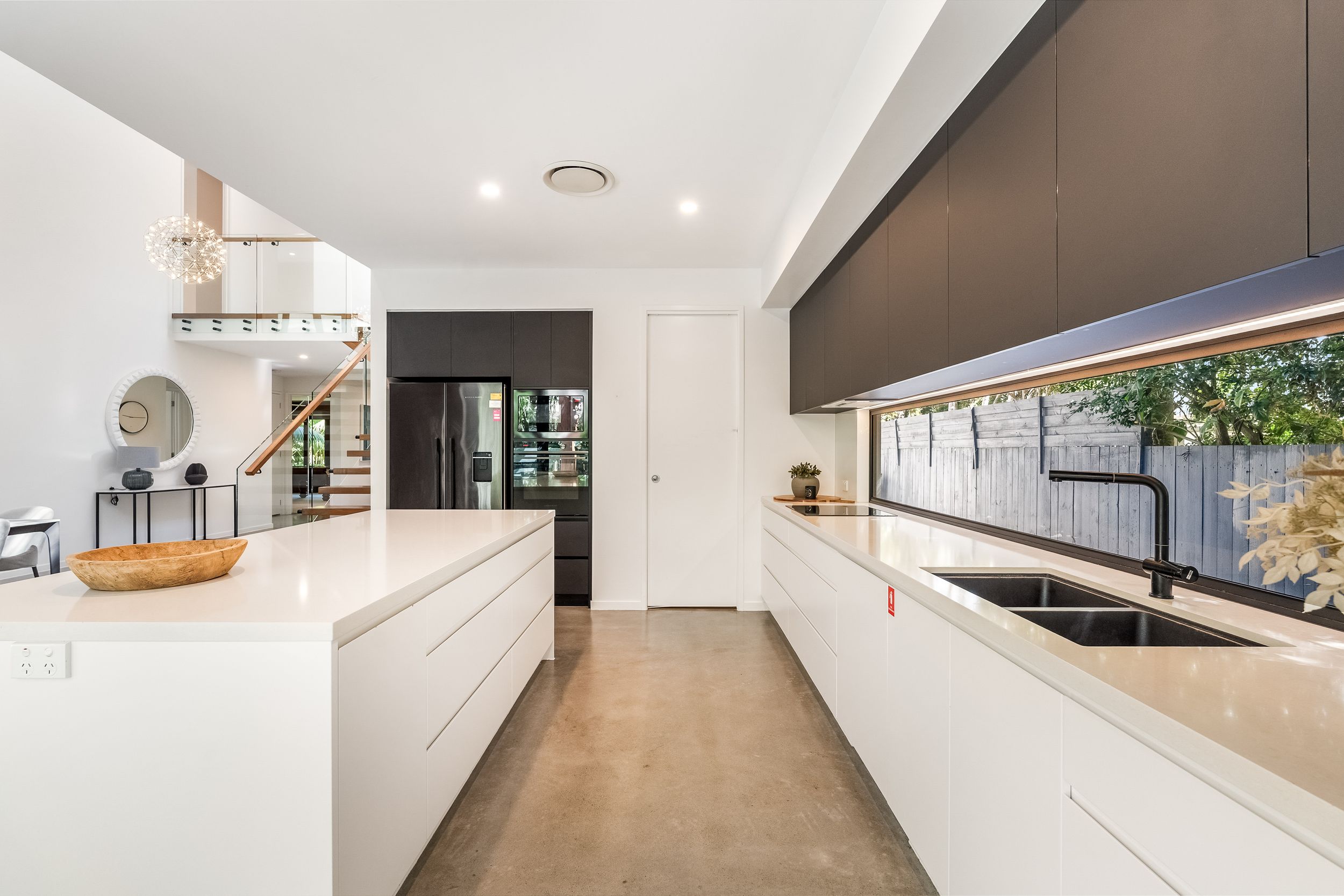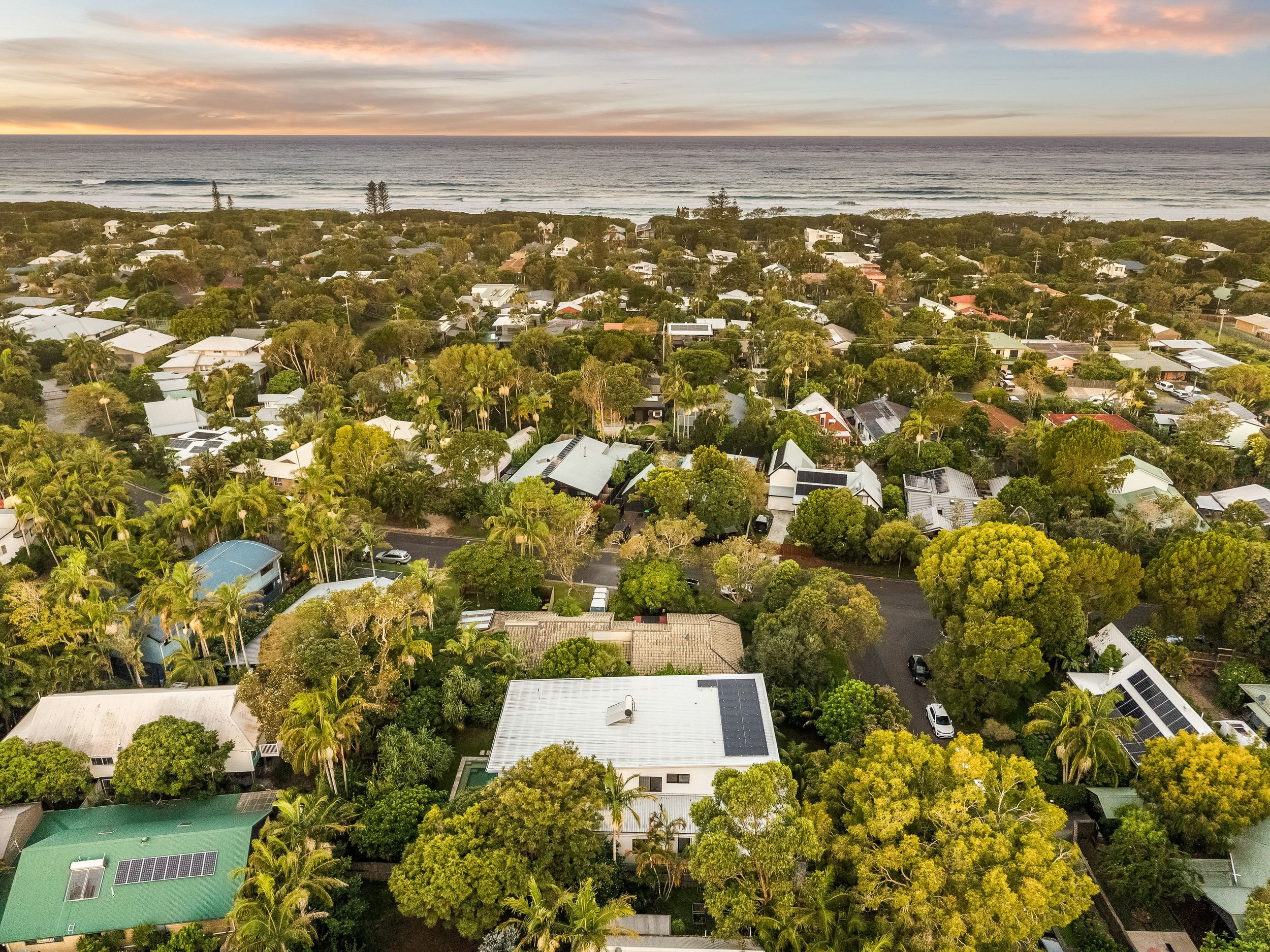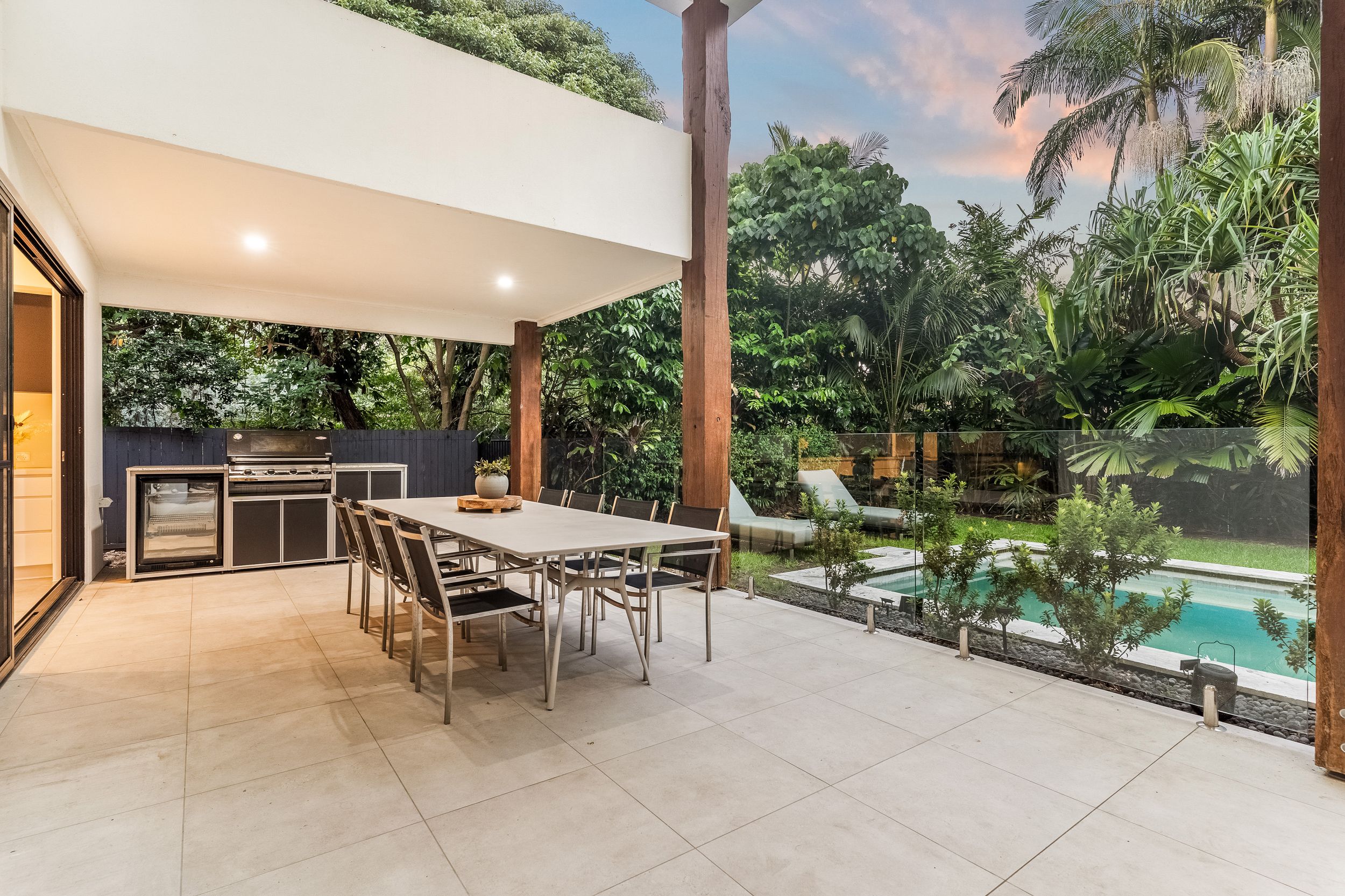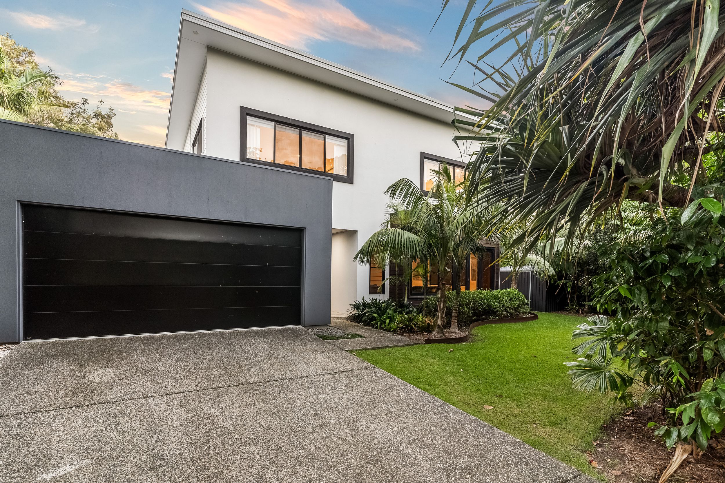 - Impressive five bedroom, two storey residence in prized Suffolk Park, steps to the beach - Soaring double-height void with statement chandelier creates a dramatic sense of space and light – Beautiful polished concrete floors throughout the ground level, plush carpet to bedrooms - Sleek contemporary kitchen with quality integrated appliances and breakfast bar - Seamless indoor-outdoor flow from the kitchen and living area to the covered patio and pool - Sparkling swimming pool set within lush tropical gardens and manicured lawns - Grand main bedroom suite upstairs with walk-in robes, private ensuite and generous proportions - Designer bathrooms featuring geometric floor tiles, timber vanities and matte black fixtures - Floating timber staircase with glass balustrade, ceiling fans, and abundant natural light throughout - Oversized garage plus additional driveway parking, laundry and storage - A short stroll to Tallow Beach, moments to Suffolk Park village, 15 mins to Byron Bay town centre, 30 mins to Ballina Airport