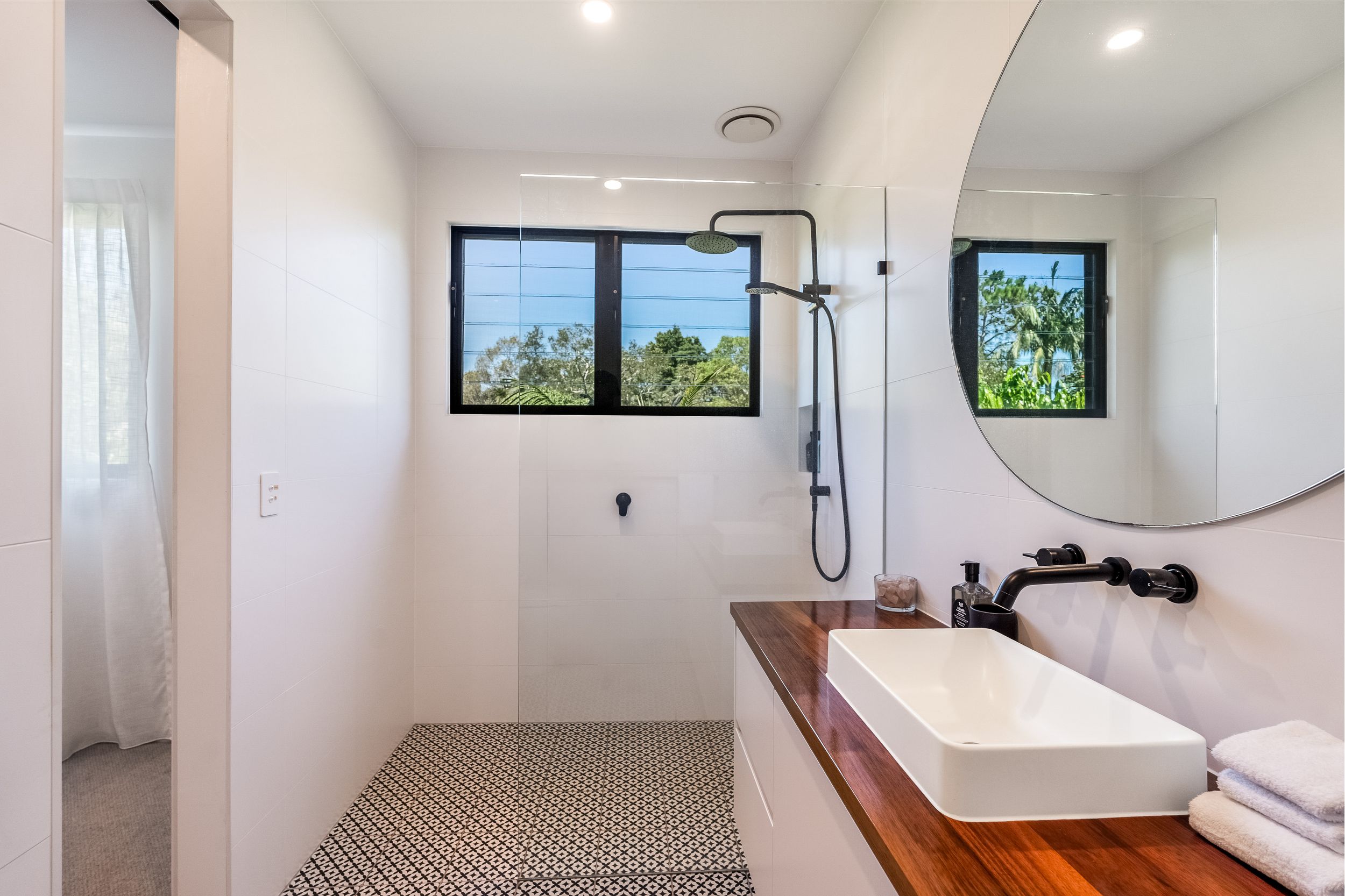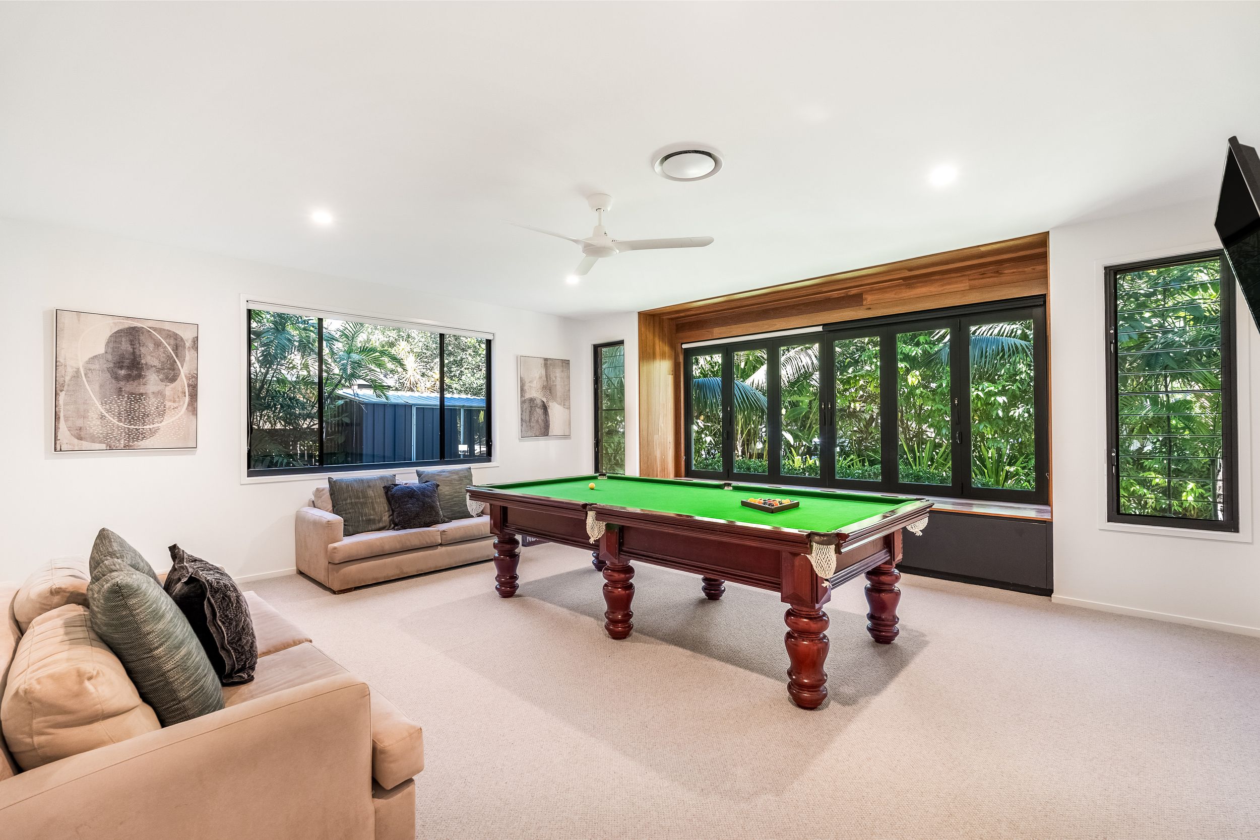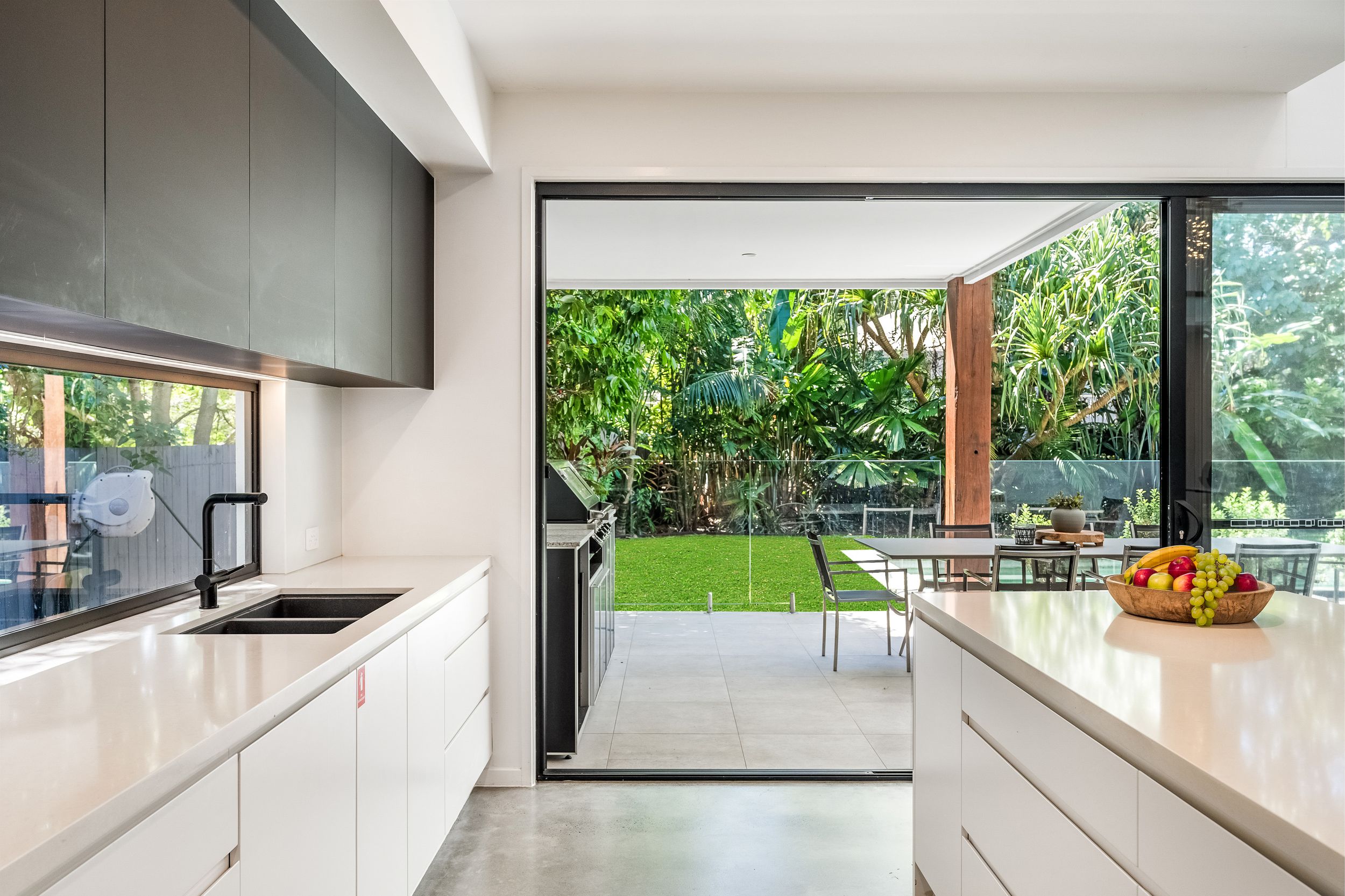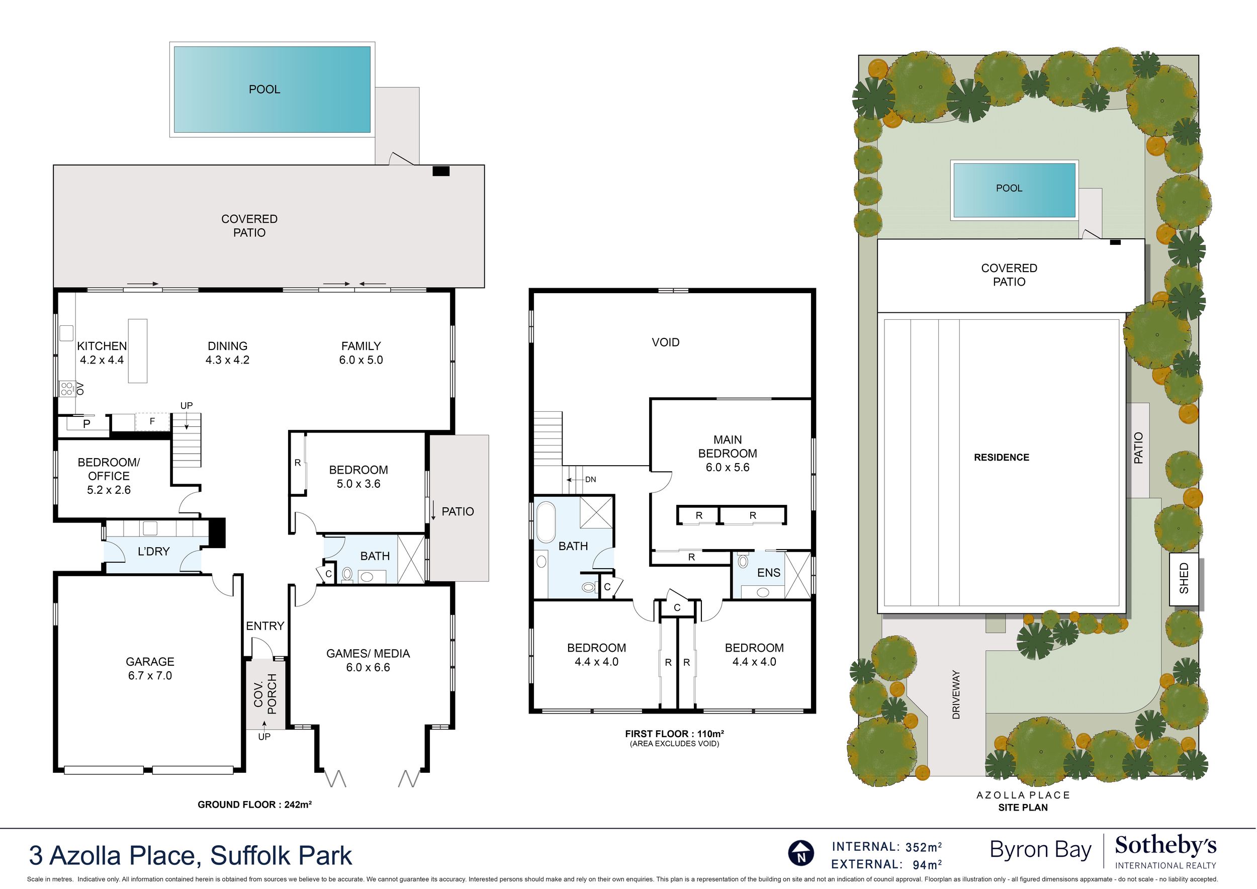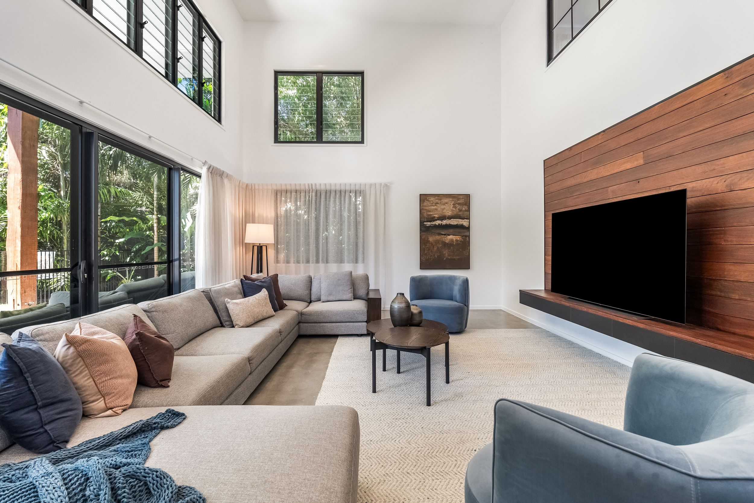 - Impressive five bedroom, two storey residence in prized Suffolk Park, steps to the beach - Soaring double-height void with statement chandelier creates a dramatic sense of space and light – Beautiful polished concrete floors throughout the ground level, plush carpet to bedrooms - Sleek contemporary kitchen with quality integrated appliances and breakfast bar - Seamless indoor-outdoor flow from the kitchen and living area to the covered patio and pool - Sparkling swimming pool set within lush tropical gardens and manicured lawns - Grand main bedroom suite upstairs with walk-in robes, private ensuite and generous proportions - Designer bathrooms featuring geometric floor tiles, timber vanities and matte black fixtures - Floating timber staircase with glass balustrade, ceiling fans, and abundant natural light throughout - Oversized garage plus additional driveway parking, laundry and storage - A short stroll to Tallow Beach, moments to Suffolk Park village, 15 mins to Byron Bay town centre, 30 mins to Ballina Airport