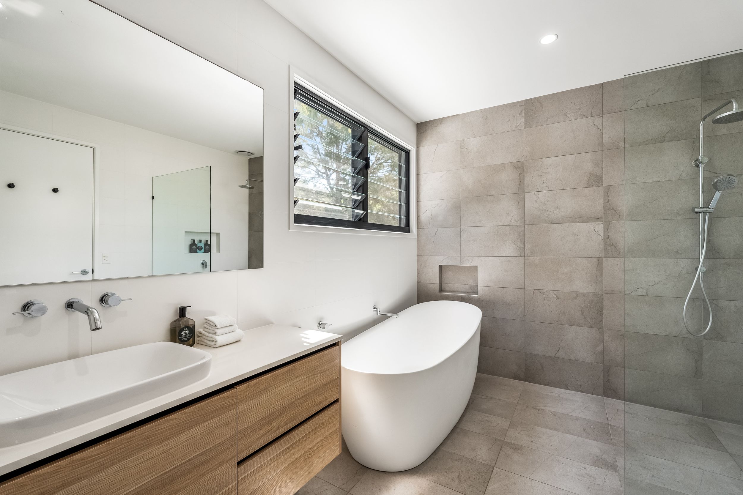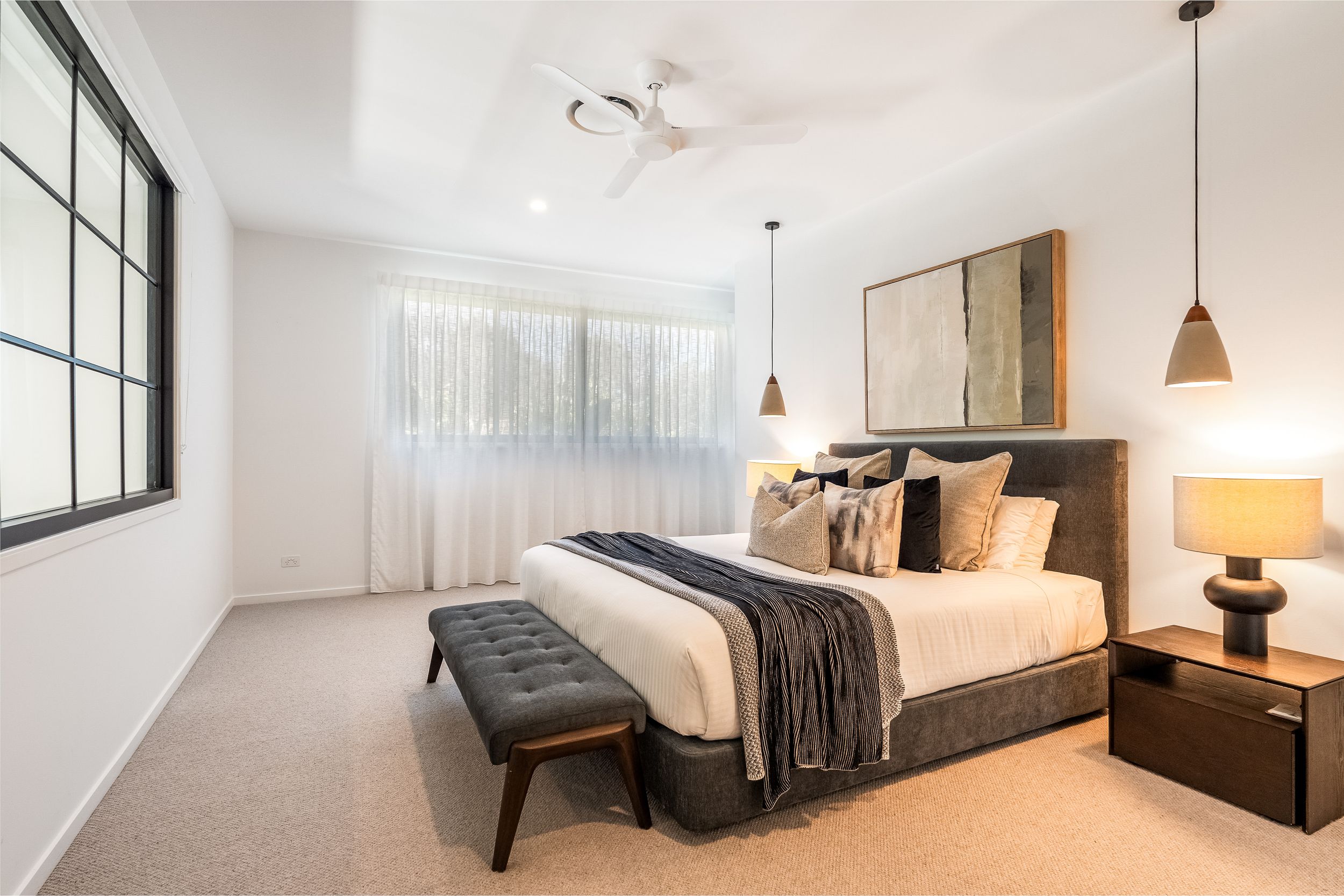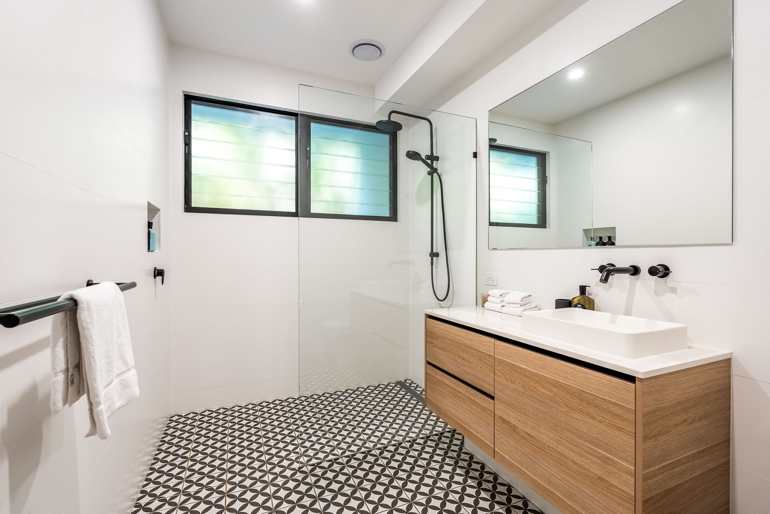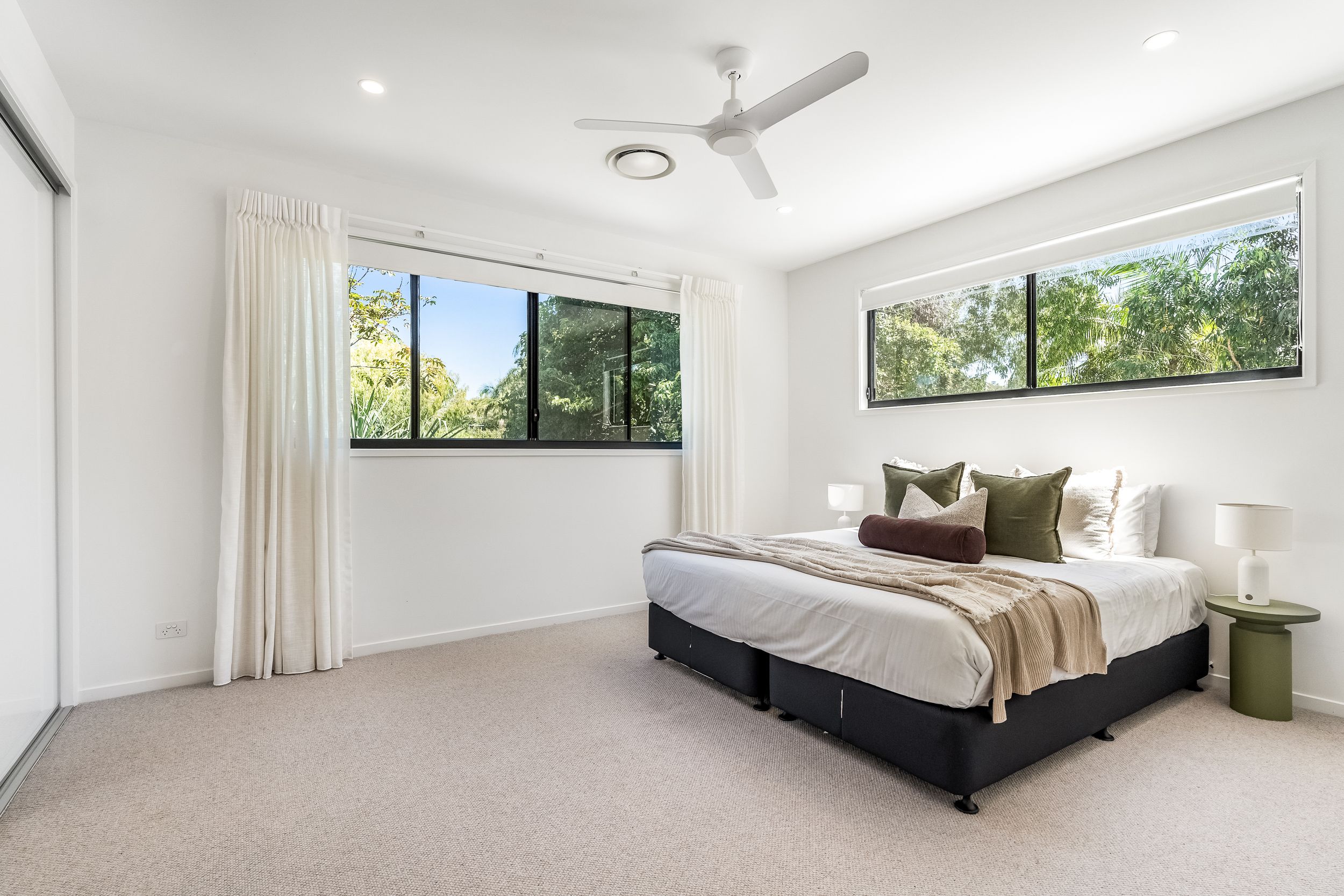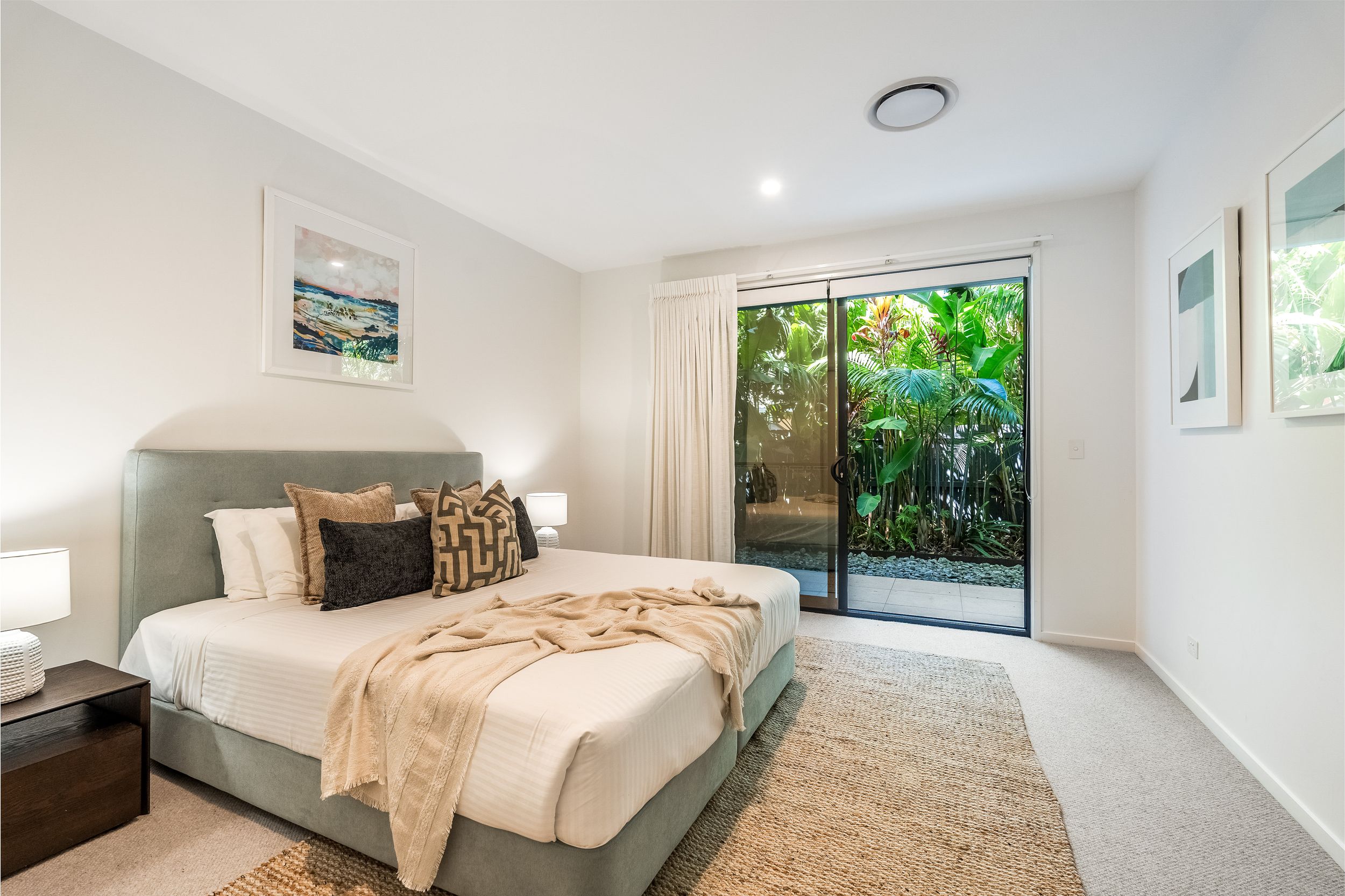 - Impressive five bedroom, two storey residence in prized Suffolk Park, steps to the beach - Soaring double-height void with statement chandelier creates a dramatic sense of space and light – Beautiful polished concrete floors throughout the ground level, plush carpet to bedrooms - Sleek contemporary kitchen with quality integrated appliances and breakfast bar - Seamless indoor-outdoor flow from the kitchen and living area to the covered patio and pool - Sparkling swimming pool set within lush tropical gardens and manicured lawns - Grand main bedroom suite upstairs with walk-in robes, private ensuite and generous proportions - Designer bathrooms featuring geometric floor tiles, timber vanities and matte black fixtures - Floating timber staircase with glass balustrade, ceiling fans, and abundant natural light throughout - Oversized garage plus additional driveway parking, laundry and storage - A short stroll to Tallow Beach, moments to Suffolk Park village, 15 mins to Byron Bay town centre, 30 mins to Ballina Airport