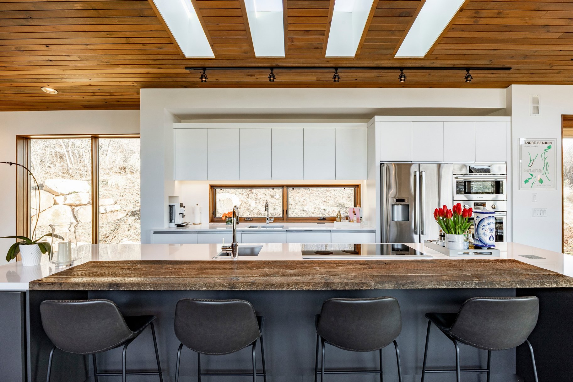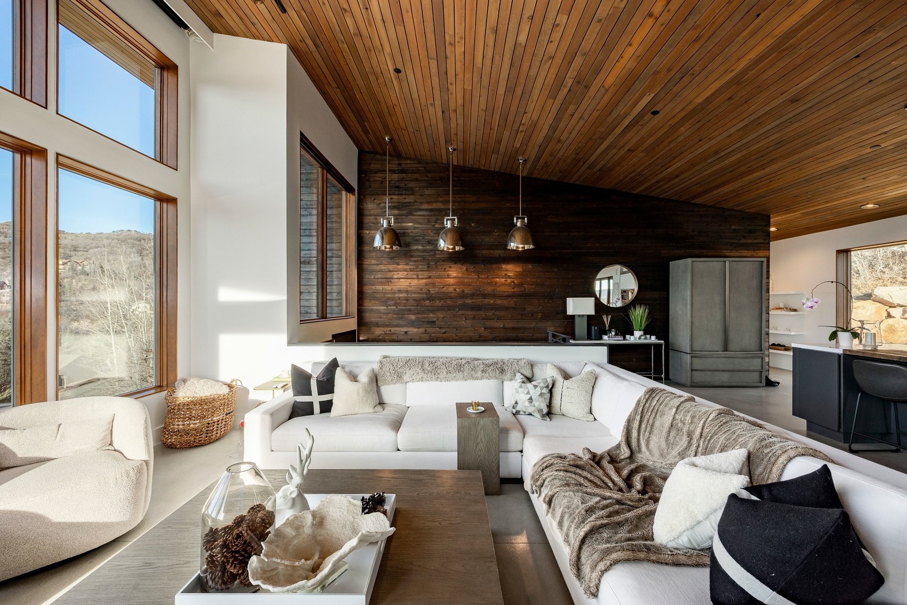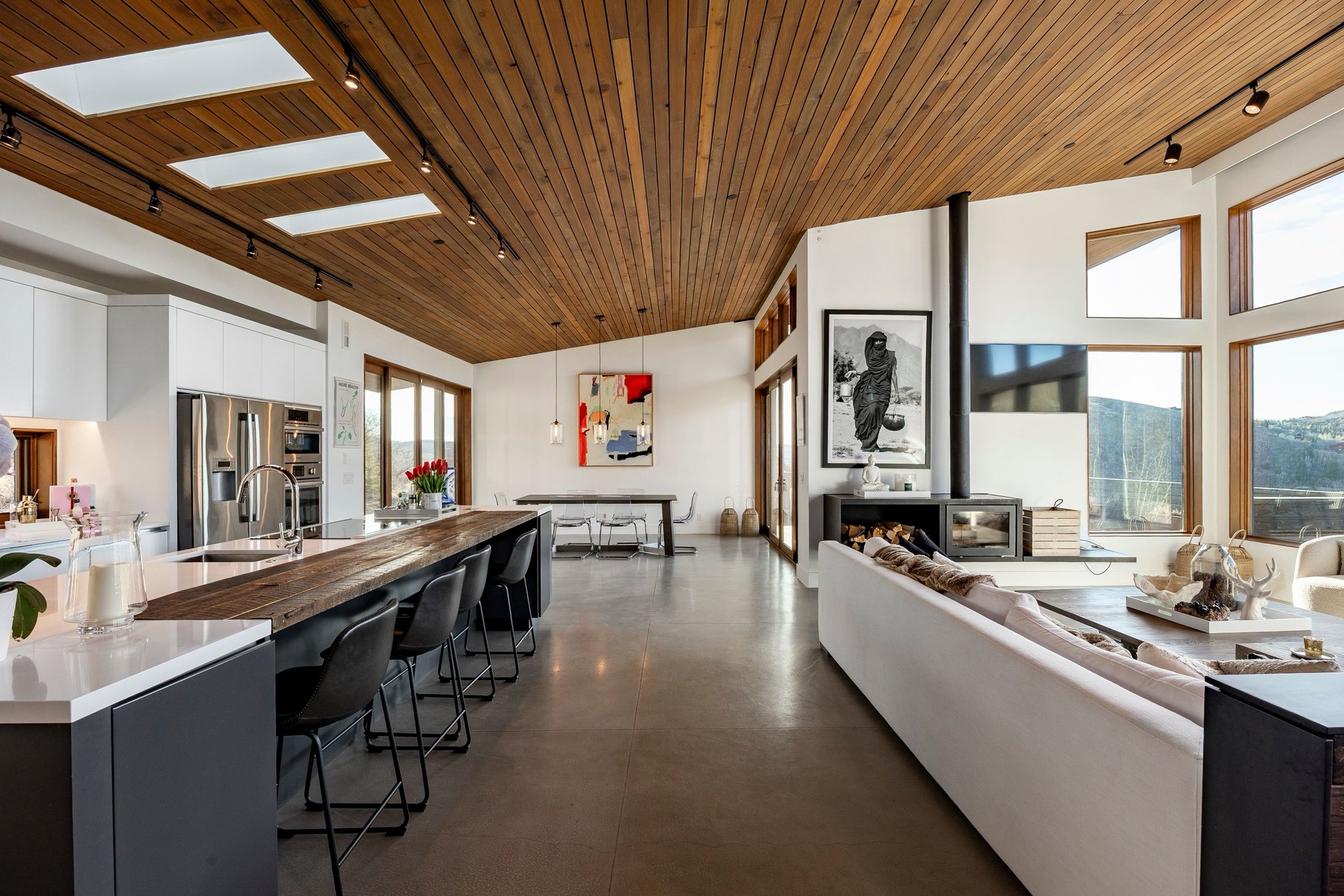 Perched along a scenic mountain ridgeline in Park City, this striking modern home captures breathtaking 180° south-facing views and backs directly to open space with private access to the Pinebrook trail network. Built with both beauty and efficiency in mind, the home showcases sleek modern architecture wrapped in preserved Shou Sugi Ban wood and weathered steel, along with radiant floor heat, passive solar design, earth cooling, high-efficiency insulation, and on-demand hot water. The open-concept design features vaulted ceilings and expansive floor-to-ceiling windows that fill the home with natural light and showcase the surrounding mountains. A spacious, 30X30 deck off the dining area creates seamless indoor-outdoor living, perfect for year-round entertaining. The main-level primary suite offers a peaceful retreat with private deck space, while the lower level includes three additional bedrooms, including multiple gathering spaces for family and guests. An oversized two-car garage provides ample storage for outdoor gear. Located minutes from world-class skiing and just 25 minutes to SLC Intl Airport, w/neighborhood parks, pickleball, tennis, and basketball courts.