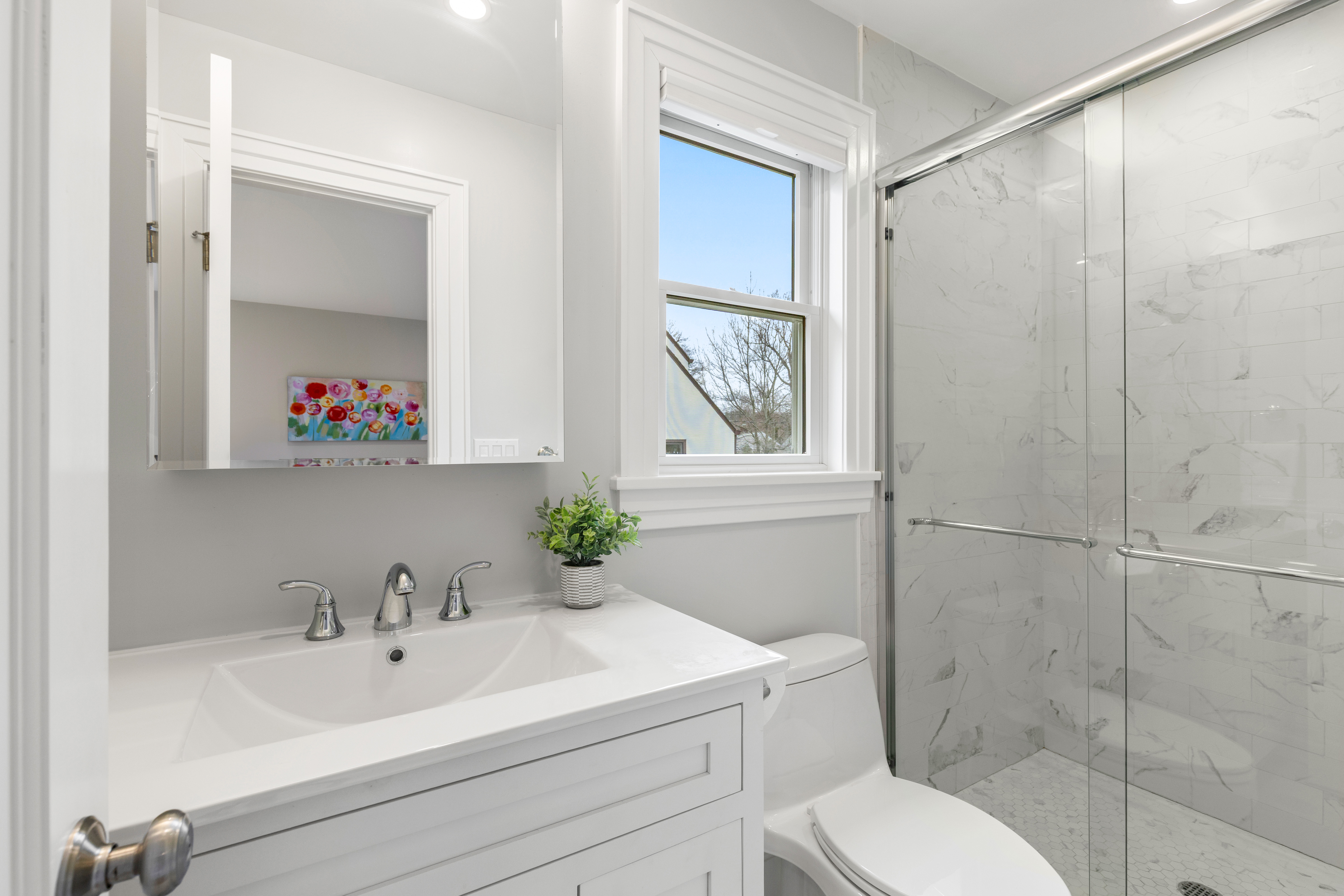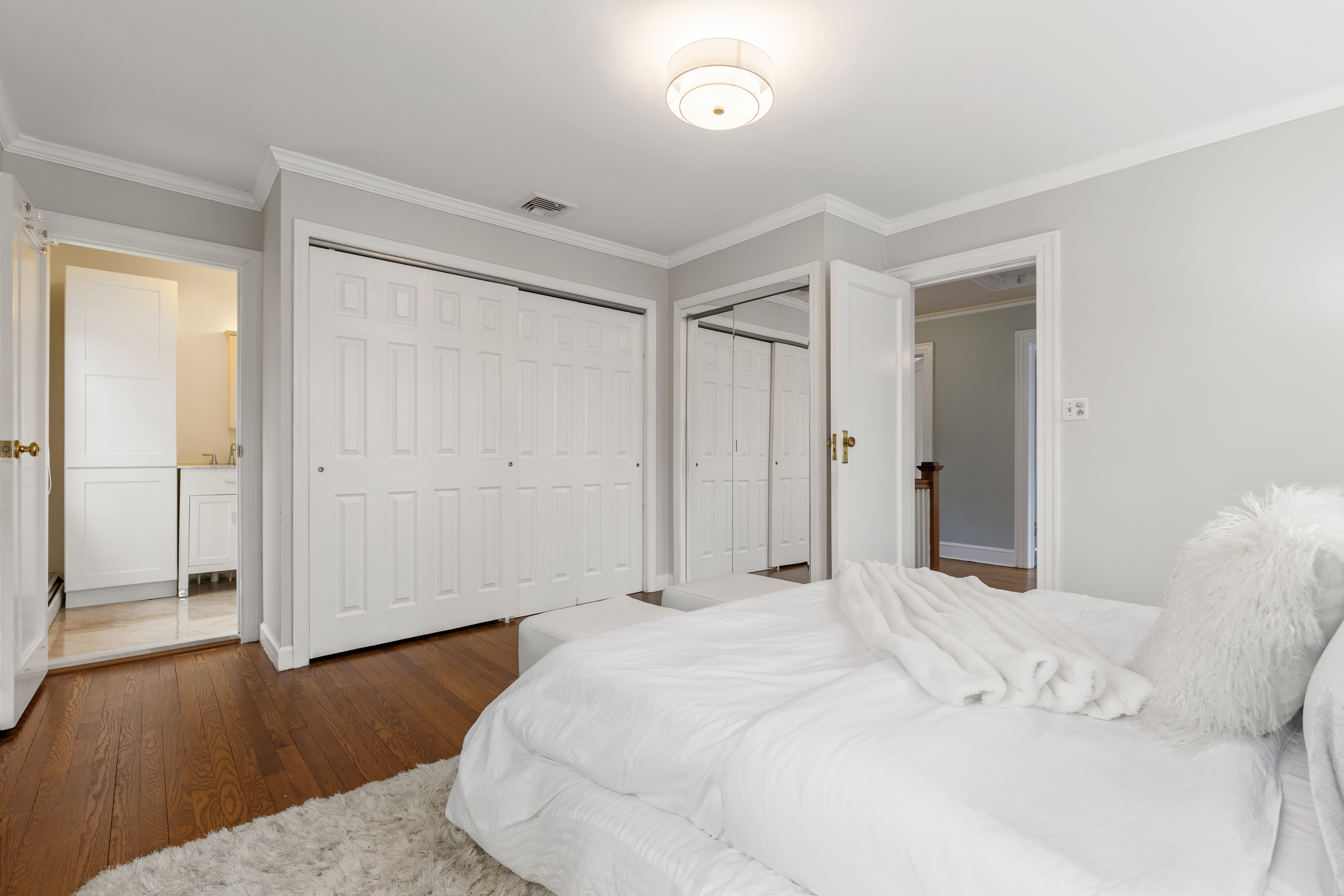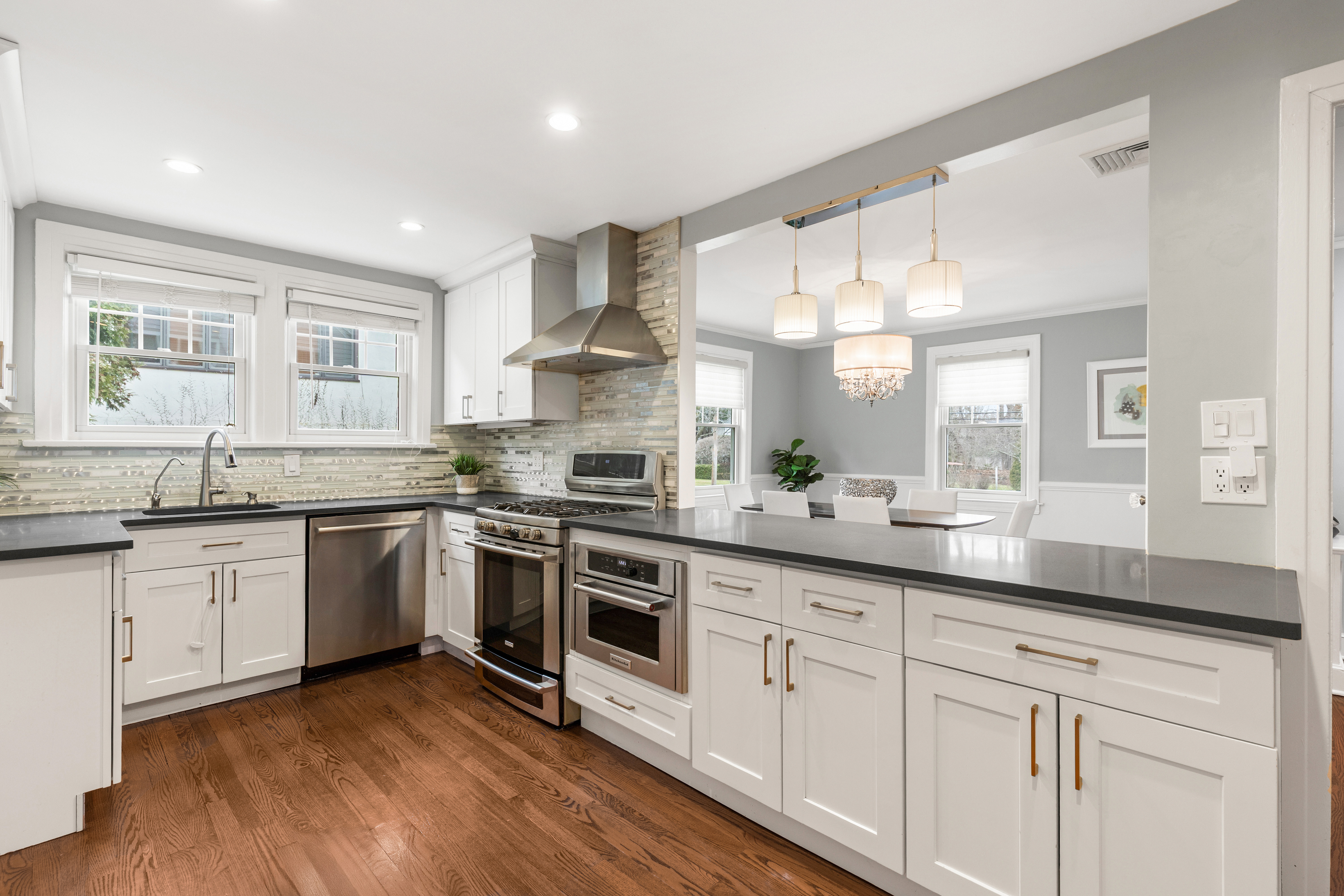 The main level offers an inviting flow for everyday living and entertaining, including a bright, open kitchen with quartz countertops and stainless steel appliances, dining room, and an oversized great room with a wood-burning fireplace and direct access to the patio and level backyard. A recently expanded first-floor bedroom with an updated en-suite bath provides ideal flexibility for guests, a home office, or extended family.