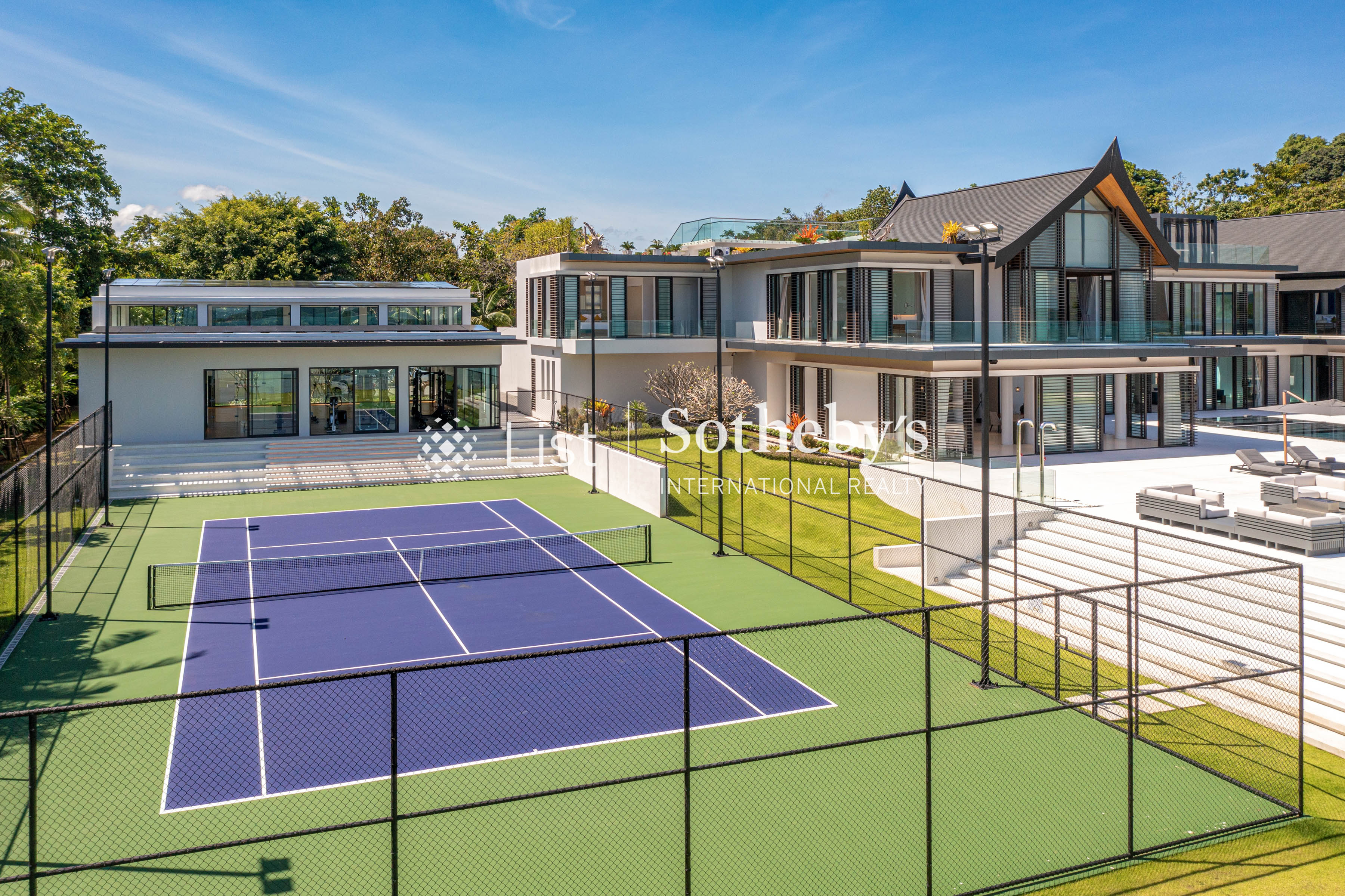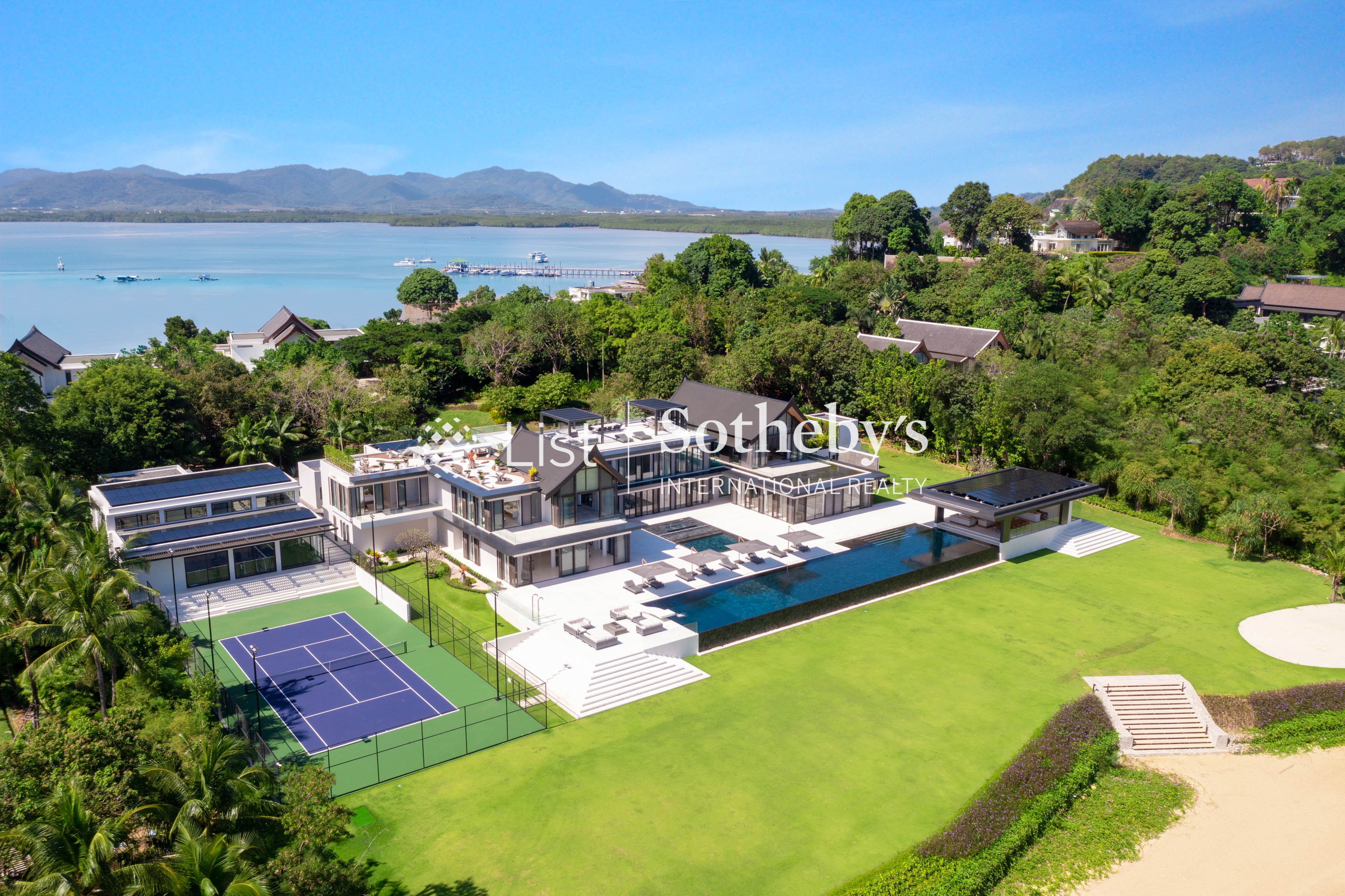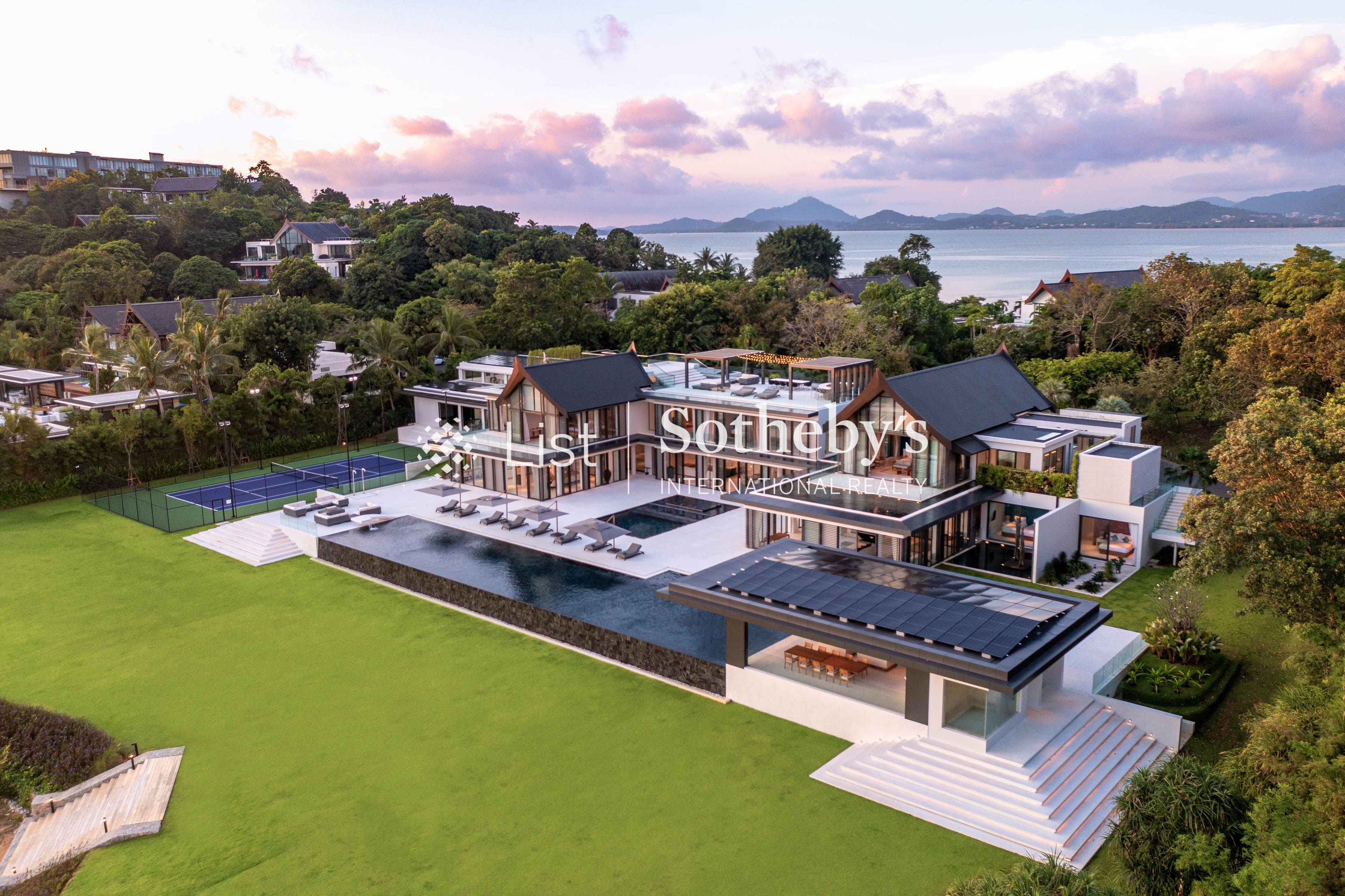 s two opulent master suites—featuring one king and one super king bed—are sanctuaries of indulgence, while the five elegant guest bedrooms provide flexibility with a mix of king and single beds, each accompanied by a lavish ensuite. From the grand open-plan living areas to the professional-grade kitchen and indoor-outdoor dining spaceswith sweeping sea views, every detail evokes a sense of effortless sophistication. A show-stopping 40-meter infinity pool extends toward the horizon, flanked by a jacuzzi for eight, children ’ s pool, and a rooftop bar perfect for sunset soirées. Leisure and wellness are redefined with a fitness room complete with a golf simulator, steam and sauna facilities, private cinema, game room, tennis court, and multi-purpose sports court. Outdoors, a lush garden play area and water sports options—including kayaks and paddleboards—invite endless recreation. Designed with seamless luxury in mind, Villa Amarasara offers a fully integrated SONOS sound system, high-speed WiFi throughout, and international plug sockets for effortless connectivity. Each bedroom features a safety deposit box, while thoughtful additions such as a baby cot, high chair, and garage for four cars ensure every need is met. A backup generator adds an extra layer of security and comfort. Located within a prestigious gated estate with 24-hour security, guests also enjoy access to on-site restaurants serving both Thai and European cuisine. Whether you