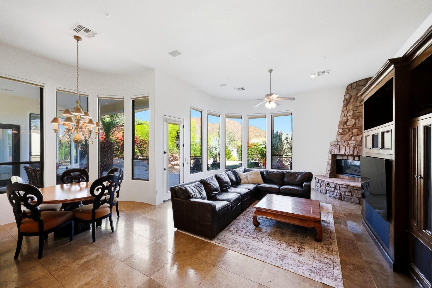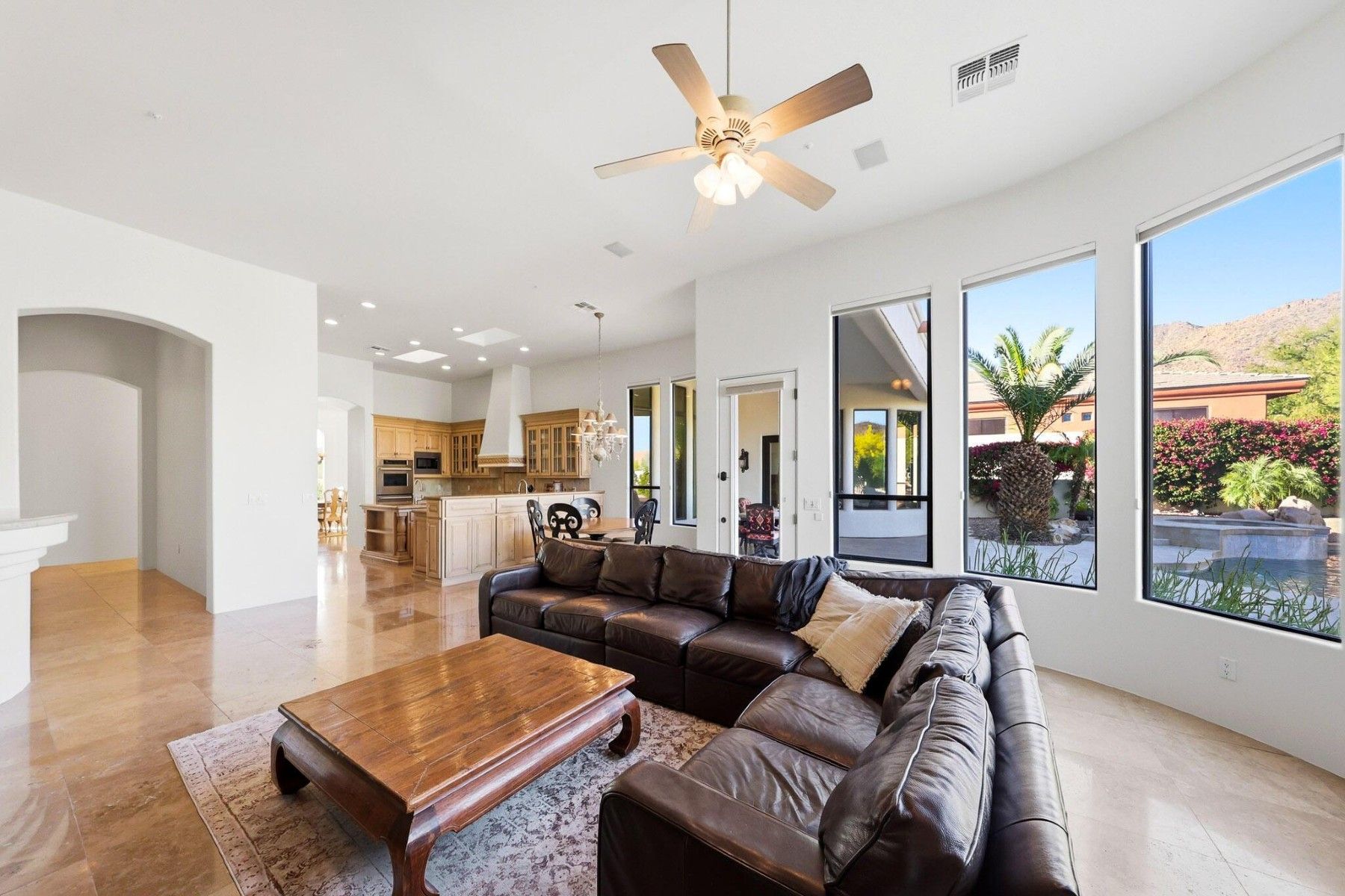 The spacious primary suite is thoughtfully separated for privacy, while recent improvements include interior and exterior paint, new windows through much of the home, updated AC units, water heaters and water softener. Outdoors, the backyard has been refreshed with travertine hardscape, artificial turf, a fire pit, and an updated pool and spa with water feature. Framed by mountain views and sparkling city lights, the outdoor spaces offer a beautiful setting to relax or entertain.