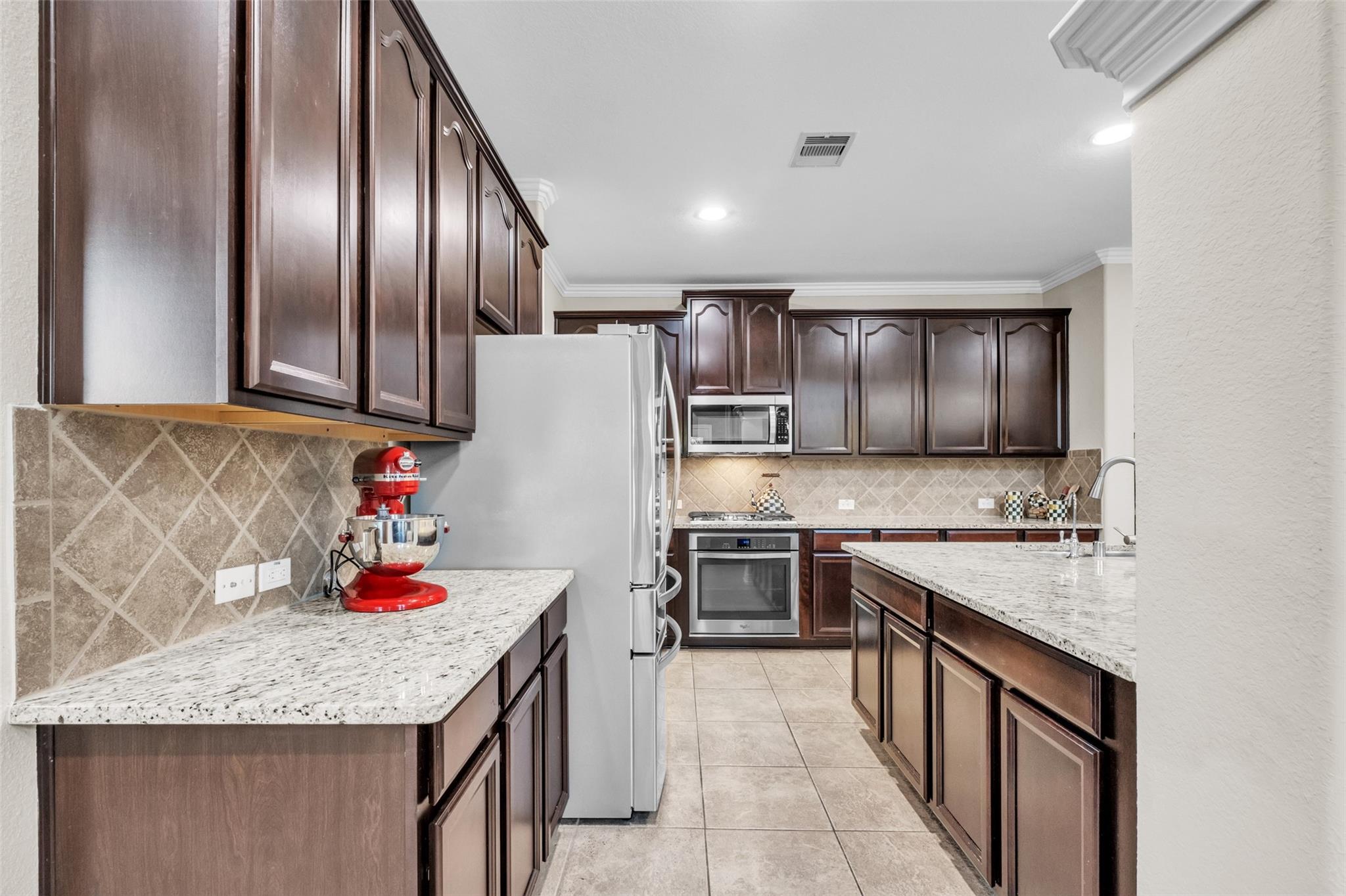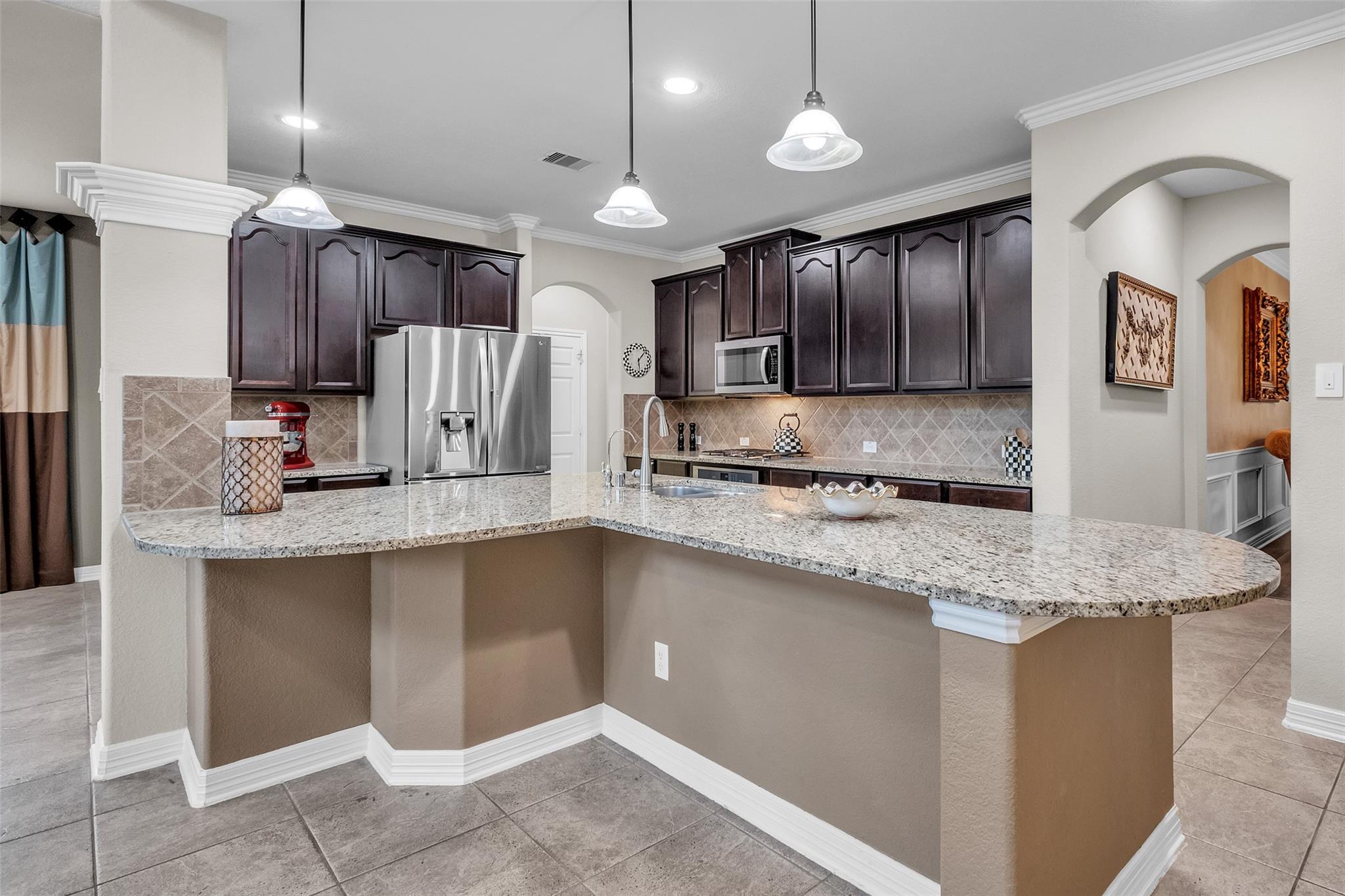 Elegant, upgraded Ashton Woods home with a fabulous resort like backyard, in the sought after Woodcreek Reserve, zoned to Katy ISD Schools. 4 bedrooms, 3.1 bathrooms with a private backyard retreat including an extended covered patio, covered custom outdoor kitchen, pool and spa, and lush landscaping - no rear neighbors. A grand double-height entry opens to the formal dining room and study, leading into a spacious living area with soaring ceilings, backyard views. No Carpet throughout the home and beautiful crown molding details. The kitchen offers stainless steel appliances, and an oversized island with plenty of seating, complete with a whole-home water softener and filtration system. The primary suite includes an extended walk-in closet and spa-like bathroom. Upstairs there are three bedrooms, two bathrooms, a games room and a large media room with installed surround sound. Additional highlights include a 3 car garage with AC/Heater in the 3rd bay plus a 3 car wide driveway.