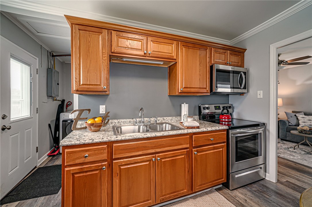 Move-in ready ranch offering 2 bedrooms and 1 fully updated bathroom, located on a quiet cul-de-sac with views of the Ohio River from the front porch. The eat-in kitchen features stainless steel appliances, vinyl flooring, and ample cabinet space. Interior highlights include updated kitchen, and bathroom, modern paint, and generous storage throughout. Exterior features include a covered front porch, concrete patio, level yard, and storage shed. Convenient one-level living with easy access to Route 79, Pittsburgh, the airport, shopping, and dining. One year home warranty included.