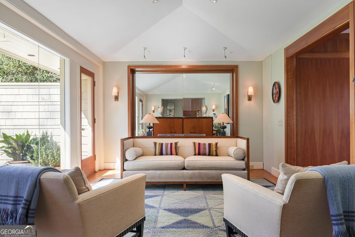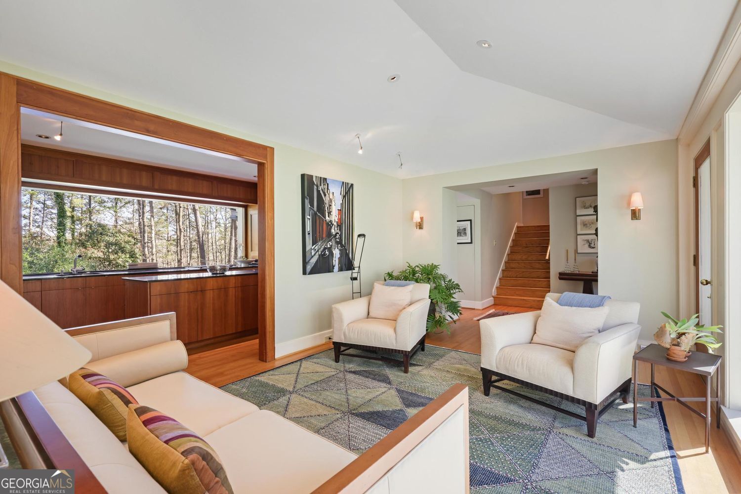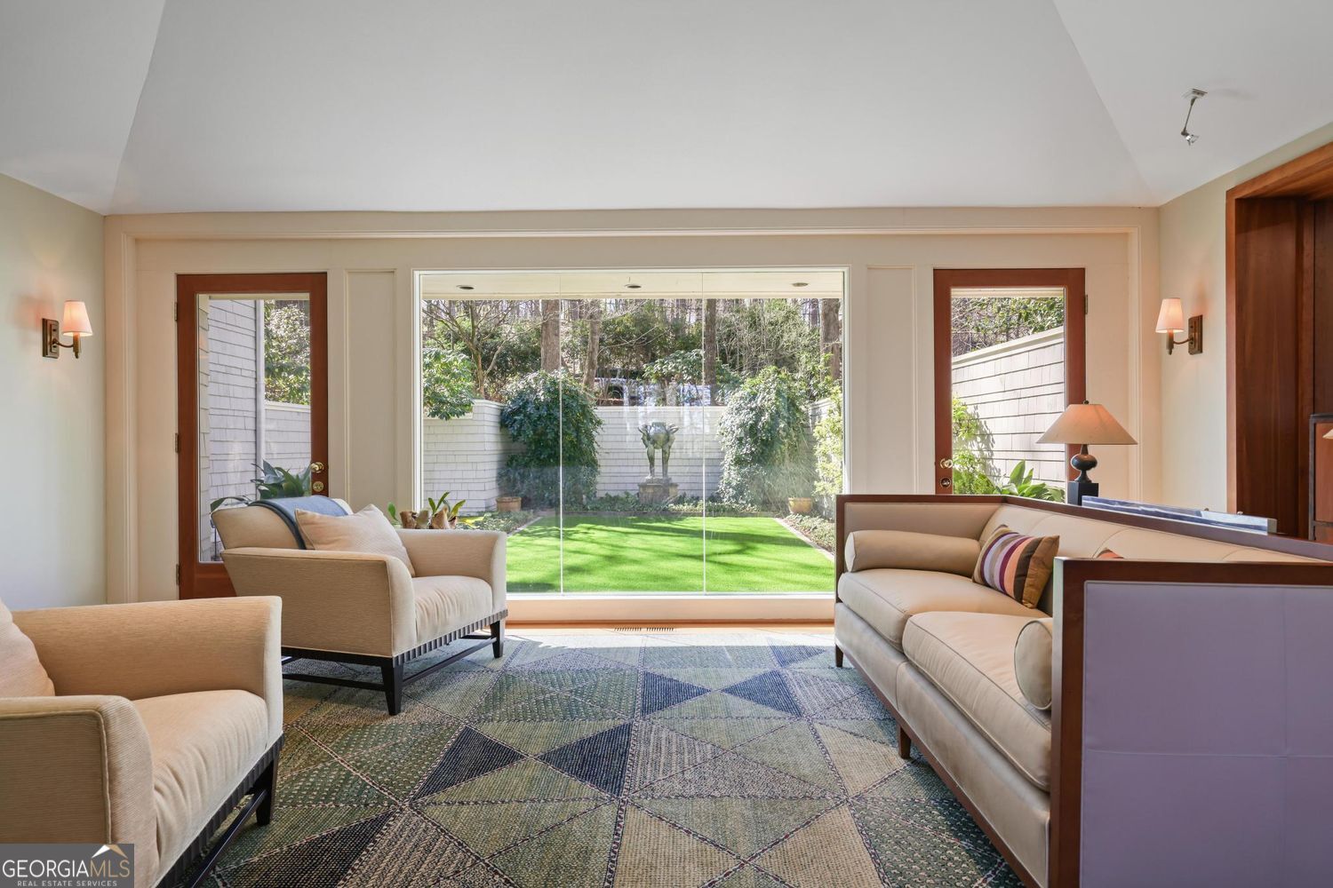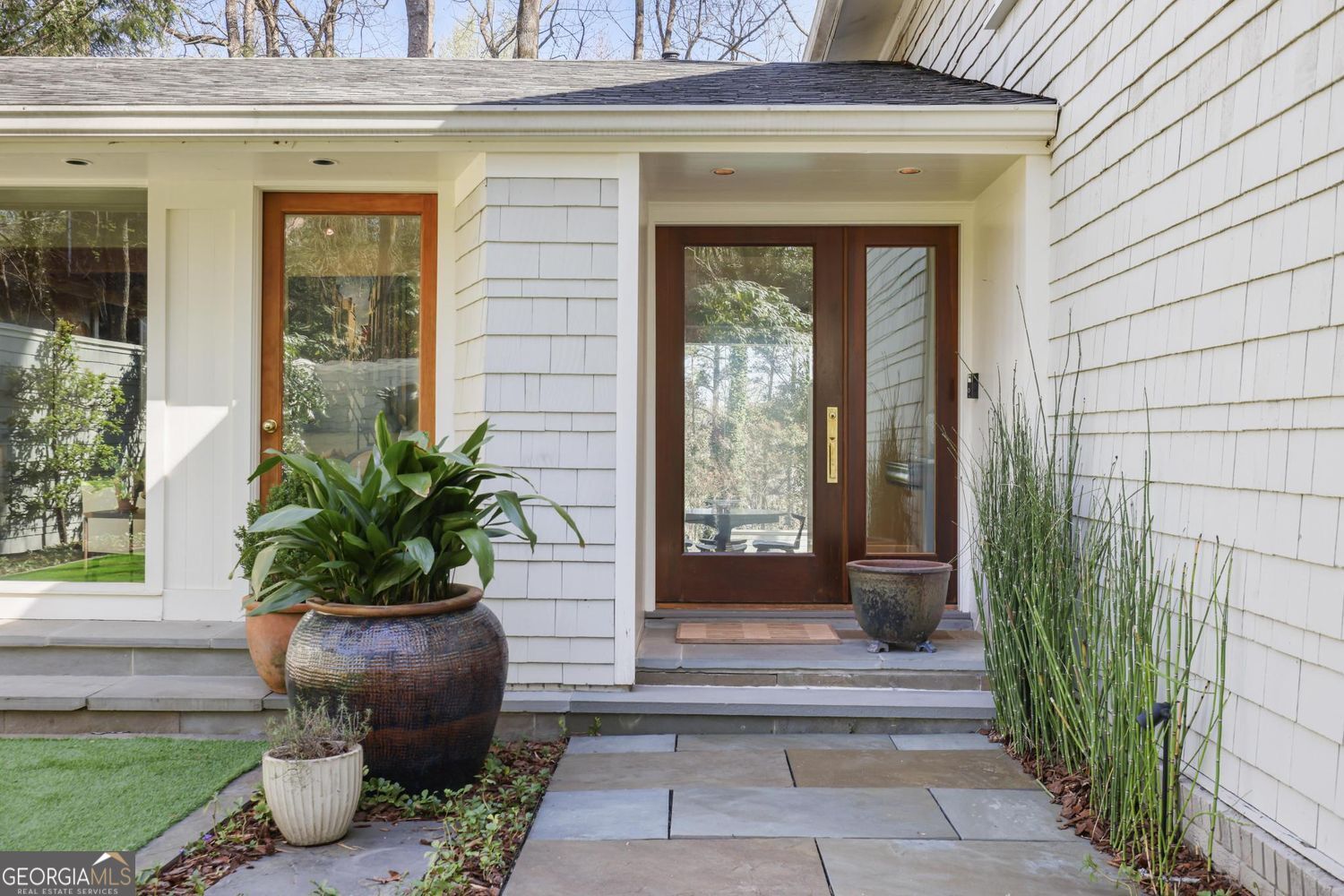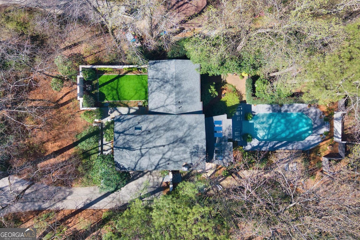 Mid-century modern design, natural light, and thoughtfully cultivated landscaping define this Brookhaven home tucked along a quiet street. The current owner, an architect, has carefully maintained and enhanced the home with a design focus on clean lines, warm natural materials, vaulted wood ceilings, and a strong connection between indoor living spaces and surrounding nature. Large windows throughout frame views of the wooded setting. At the front of the home, the living room overlooks a private turf courtyard ideal for play, relaxing, or entertaining. The sunken fireside family room opens to the screened porch and overlooks the fabulous pool. The kitchen sits at the center of the home, allowing views into both living spaces and the outdoor areas, creating natural flow for everyday living and entertaining. Designed to feel seamless, the kitchen conceals appliances and incorporates smart storage throughout, thoughtfully using every inch of space. Upstairs, the home offers four bedrooms, including a spacious primary suite with statement windows and a bath wrapped in natural stone and illuminated by skylights. The primary bath features a double vanity, walk-in shower, and bidet, creating a calm, spa-like retreat that connects seamlessly to the bedroom beneath the vaulted wood ceiling. The screened porch overlooks a private backyard centered around a large, heated pool and generous deck for lounging. Surrounded by mature landscaping cultivated over many years, the setting feels quiet and secluded like a private retreat in the middle of the city. The two-car garage includes an electric vehicle charger, the unfinished partial basement offers potential for storage or future expansion and the roof is 2 years old. Not a drive-by, you must step inside to appreciate the architectural character, privacy, beauty and connection to the outdoors.