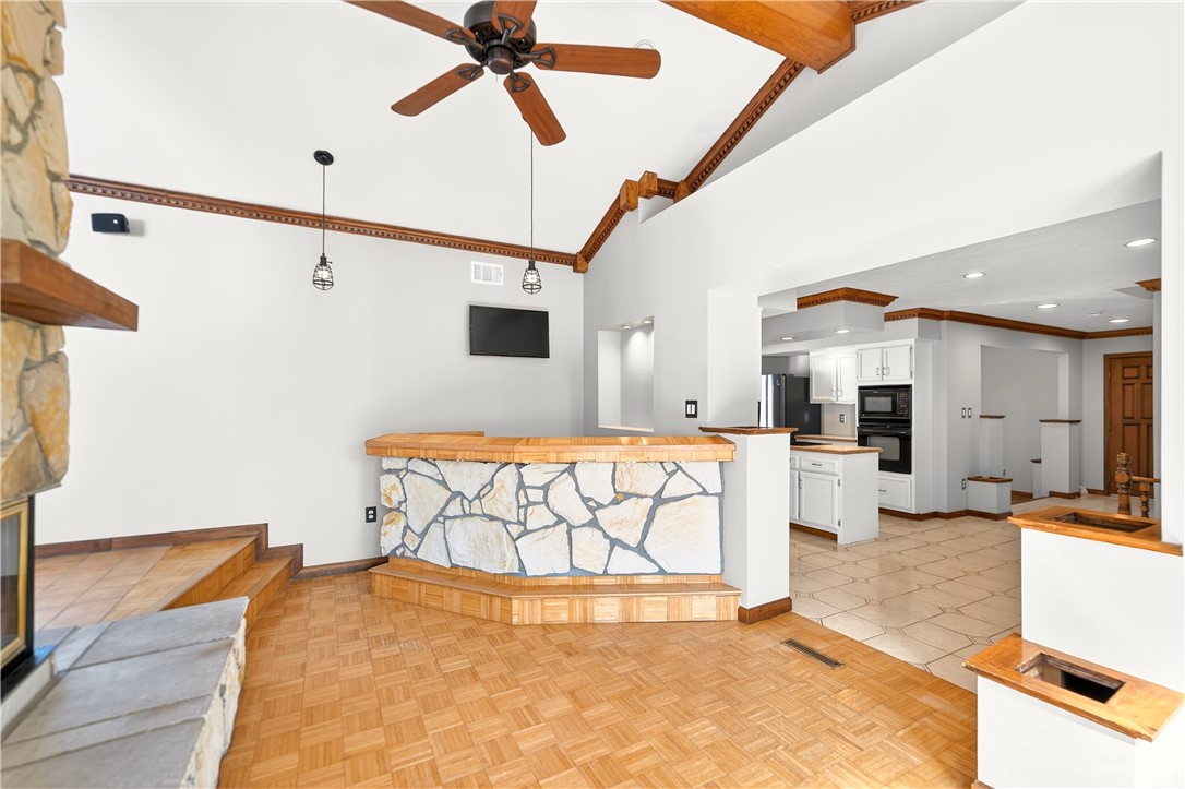 Walk out your door and gain direct access to the Montour Trail for endless miles of outdoor fun that's what life looks like at 16 Ridgewood Drive in Cecil Twp. Walk the dog, teach the kids to ride their bikes, hop on yours and go for miles, go for a run, or just take a romantic sunset stroll it's all just steps away!! Not only is the location ideal for trail access, but you're also just seconds off Rt 50 getting you into Bridgeville in minutes or onto the new Southern Beltway for an easy trip to the airport. This is truly a one-of-a-kind home, so let's talk about what makes it special. First, you'll love the look of the stamped concrete driveway as you pull in. Head up to the front door and you're welcomed by a relaxing porch and beautiful stained glass windows. Step inside and you'll immediately notice the openness and character. The sunken living room features soaring ceilings and the first of three fireplaces! Continue straight into the kitchen and dining area, then beyond that into a massive addition complete with a four-sided fireplace, wet bar, and a family room with vaulted ceilings and large windows on both sides. This space flows nicely to a full bath and a private home office... perfect for today's lifestyle. Down a half flight of stairs, you'll find a finished game room (with the third fireplace) and laundry area with access to the garage. Up a half flight takes you to the bedroom level. The primary suite includes a private en-suite bath with a large jetted tub and walk-in closet. Bedrooms 2 & 3 are both big... bedroom two features a giant walk-in closet, while bedroom three offers a cool built-in bookshelf. Outside, enjoy a nice flat yard and a large shed for extra storage. New roof in 2023. Tons of square footage. Packed with character. All that's missing is you!!