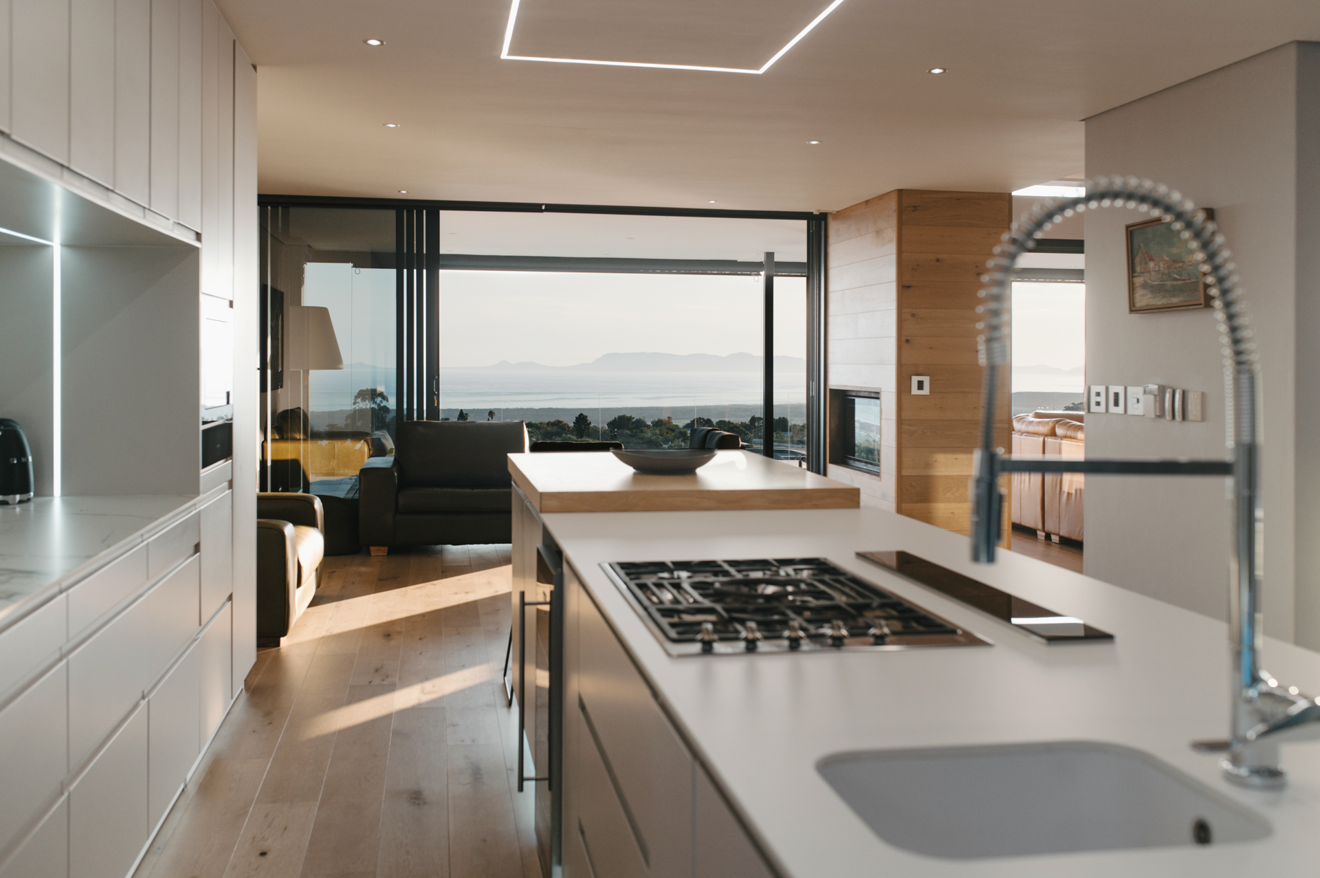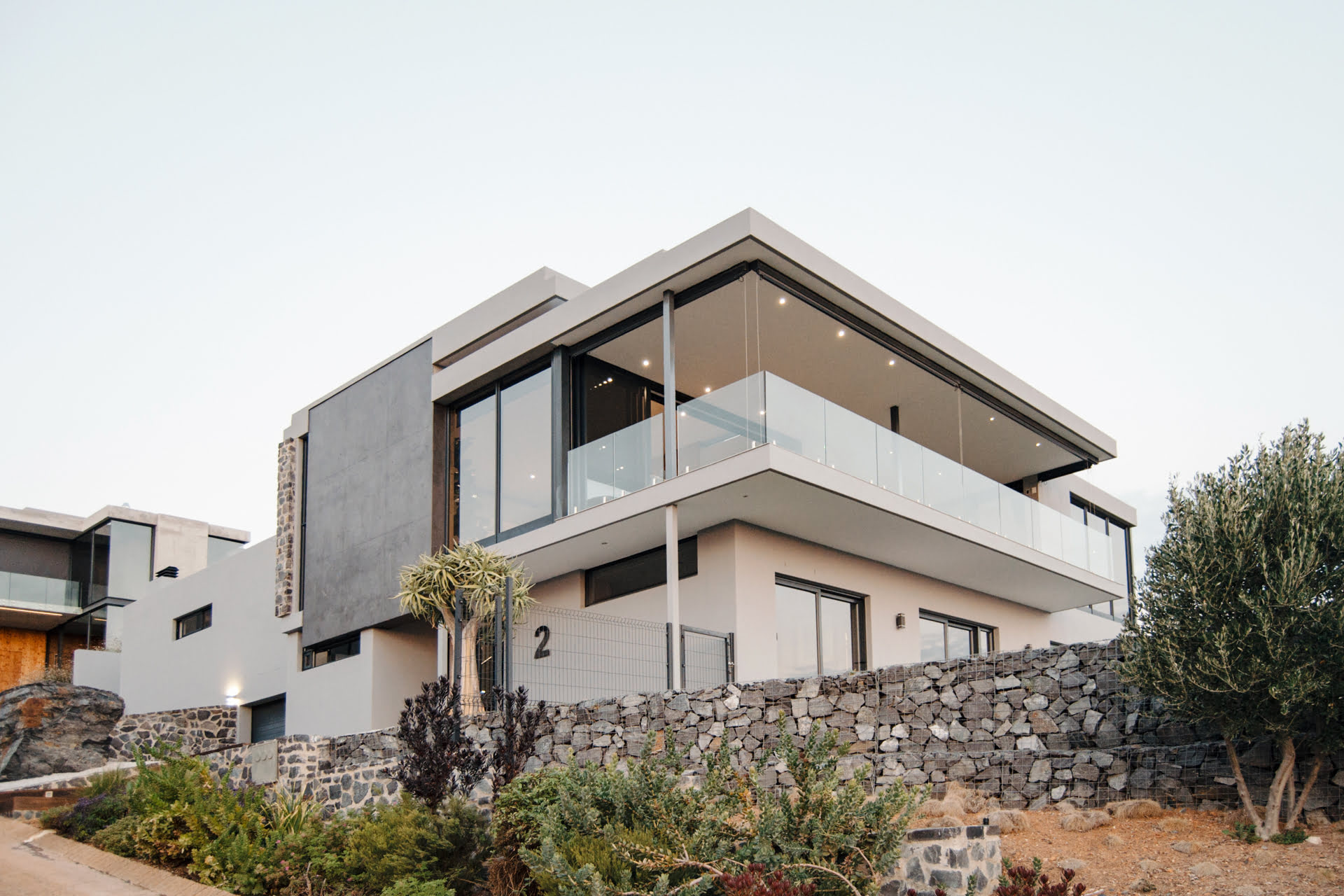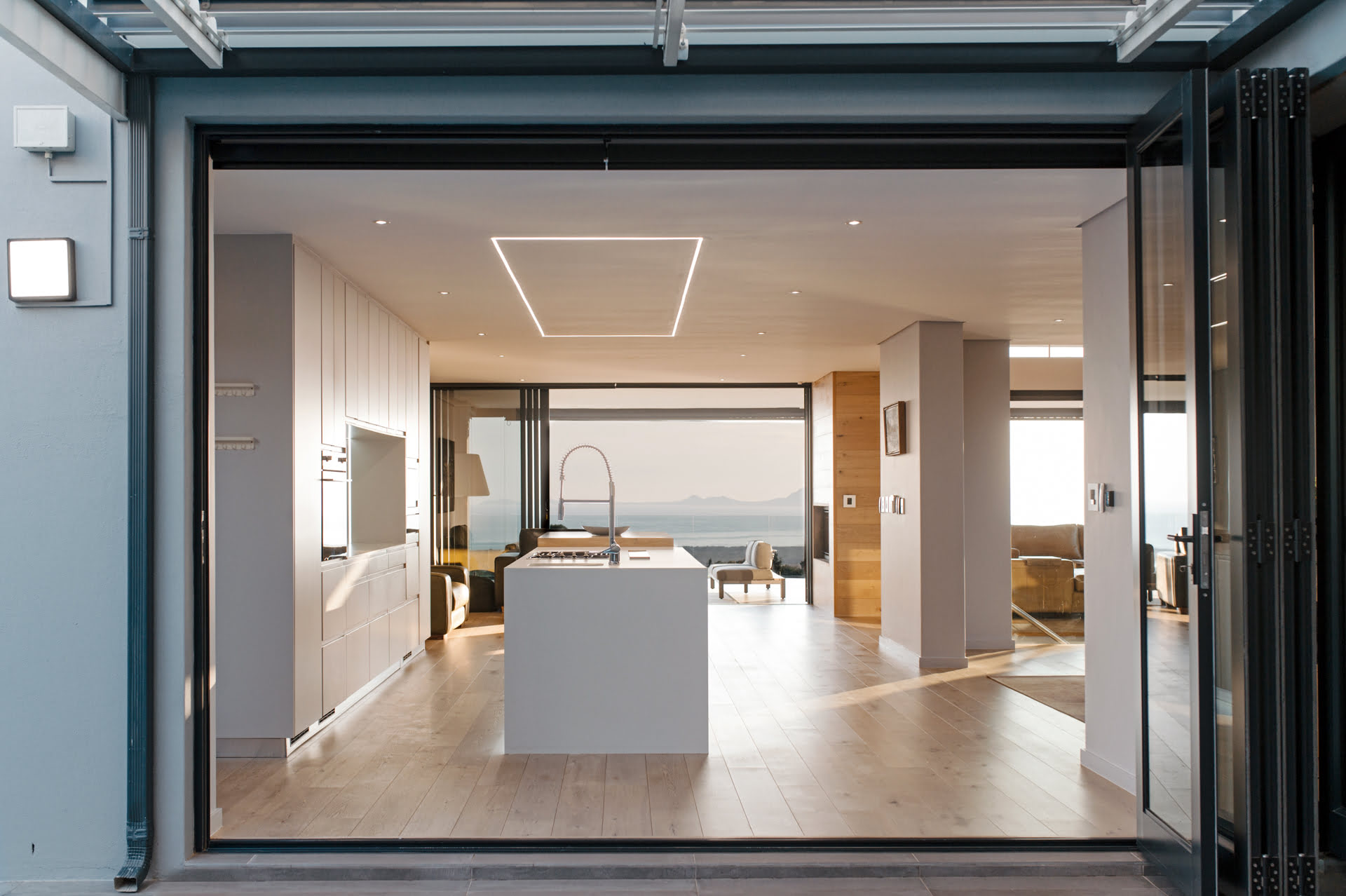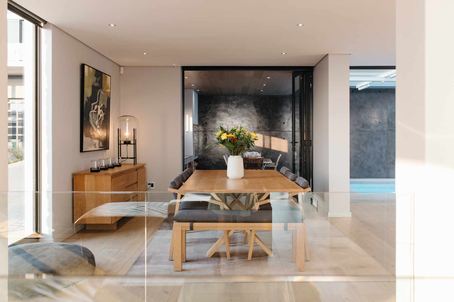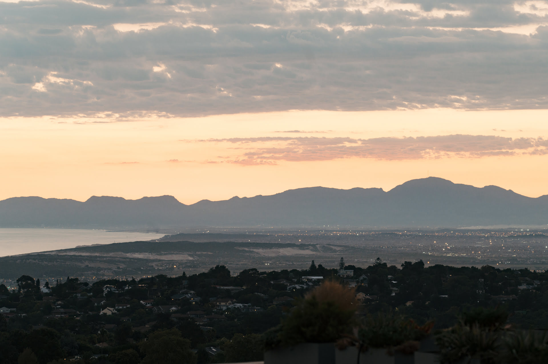 Set within a prestigious, upmarket estate, this exceptional modern residence showcases uninterrupted, panoramic views sweeping across False Bay to the iconic Table Mountain.