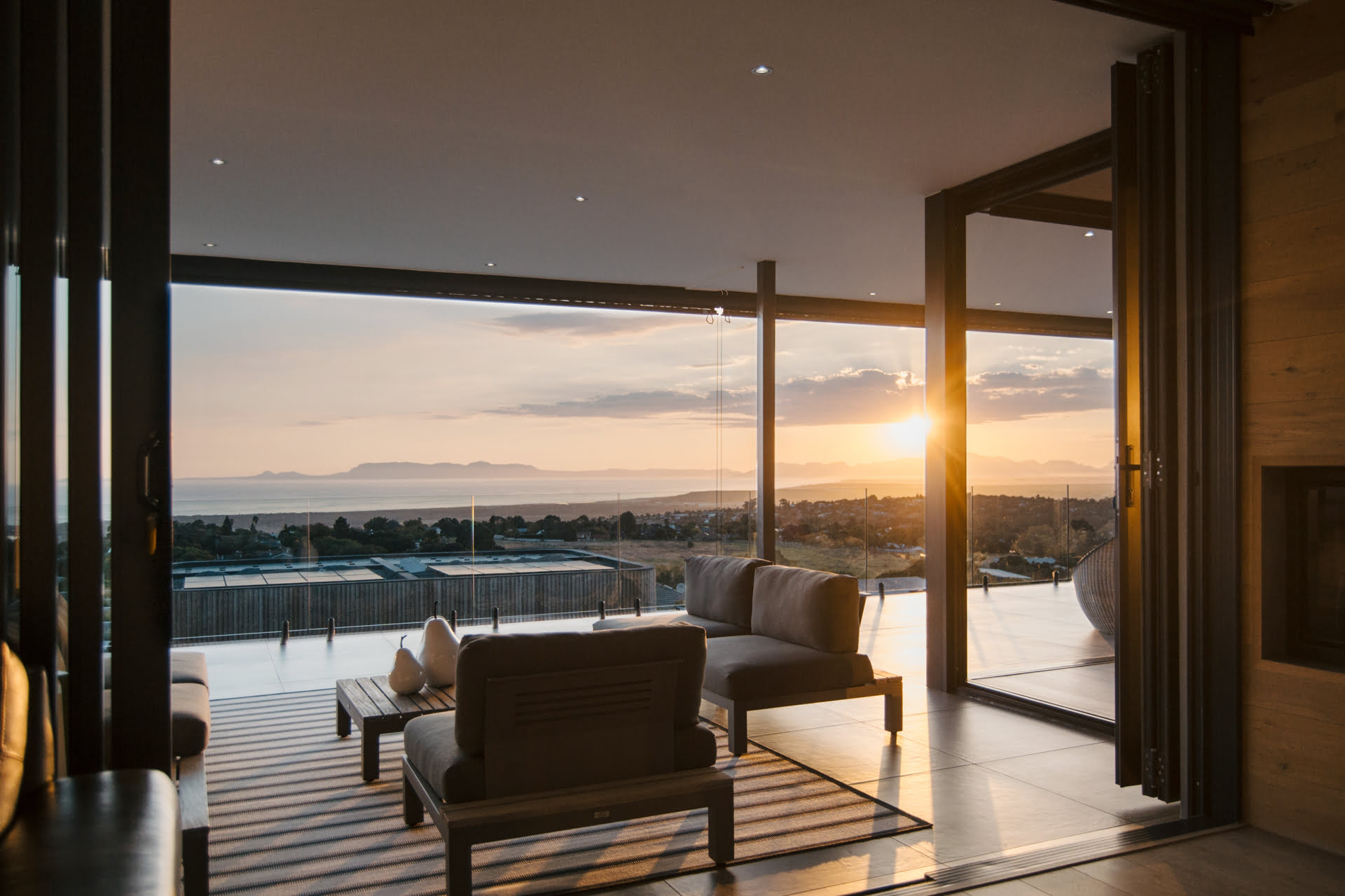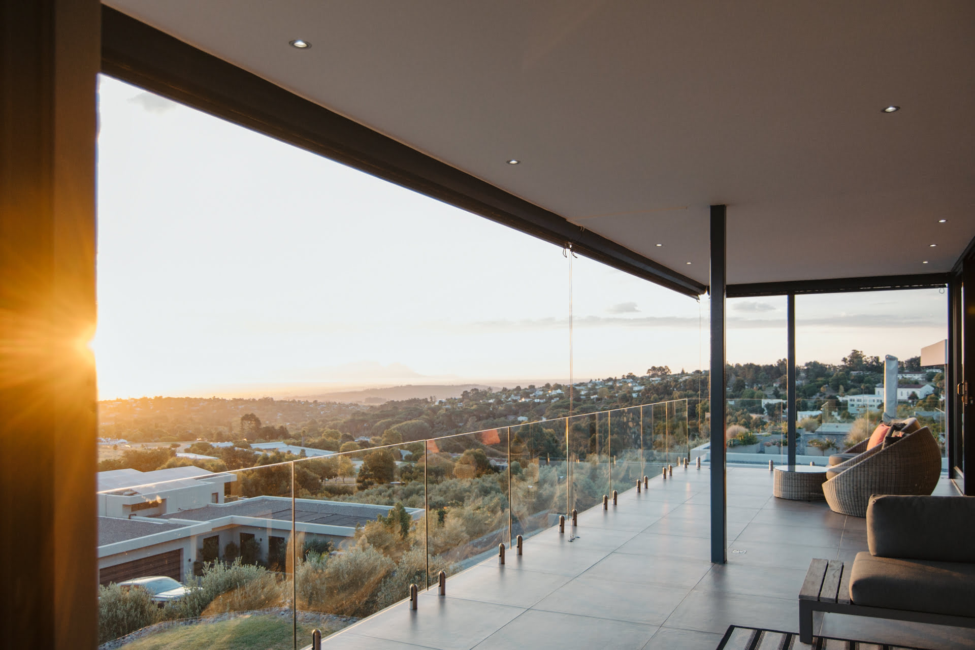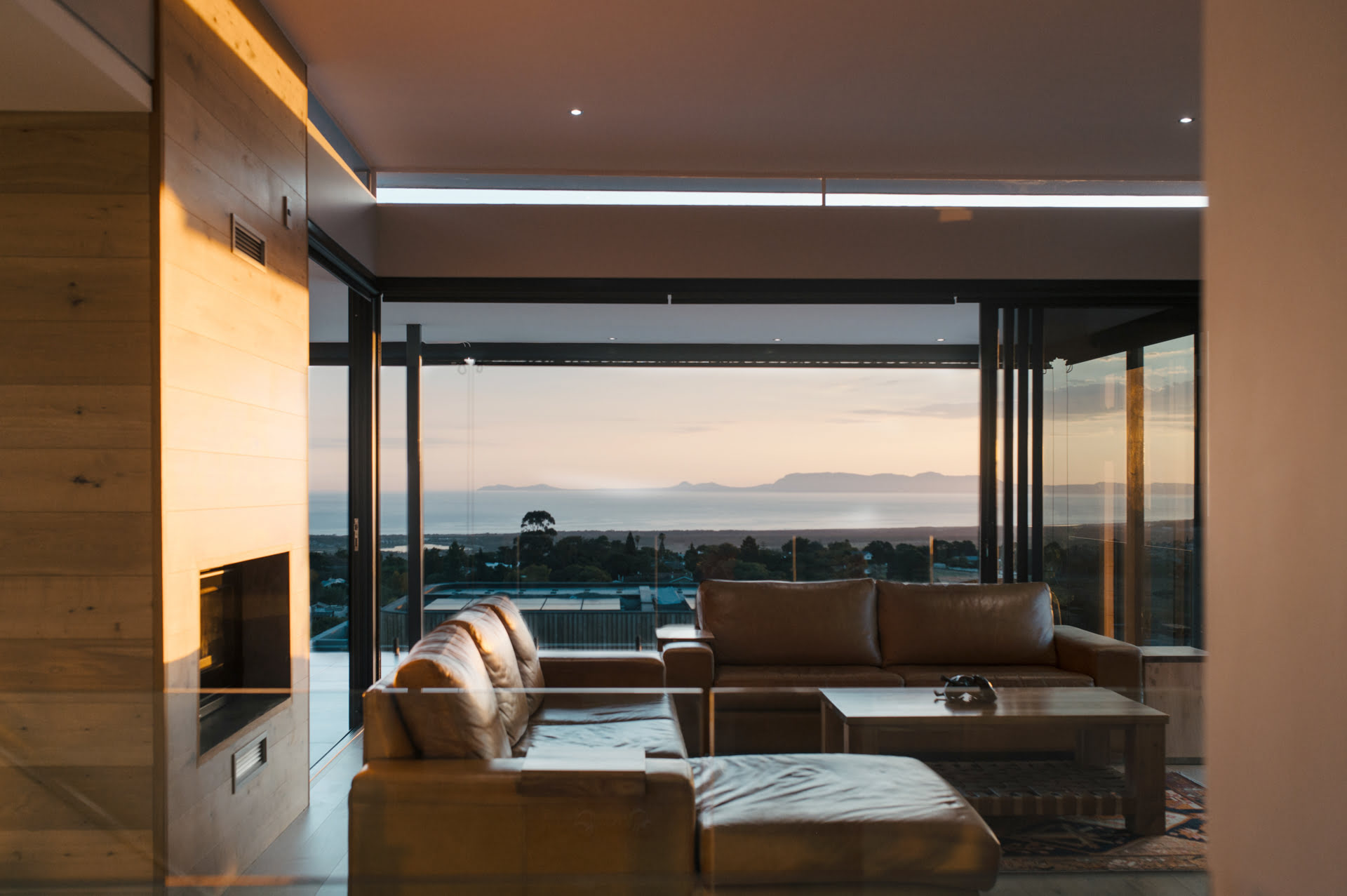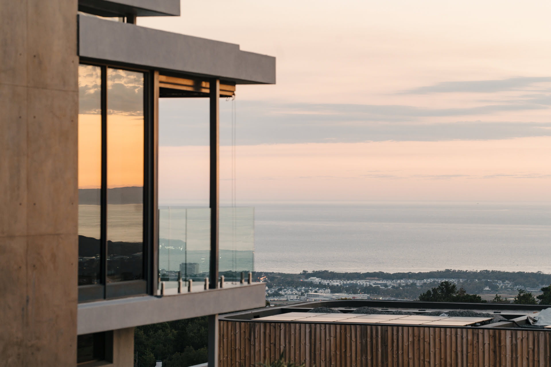 Set within a prestigious, upmarket estate, this exceptional modern residence showcases uninterrupted, panoramic views sweeping across False Bay to the iconic Table Mountain.