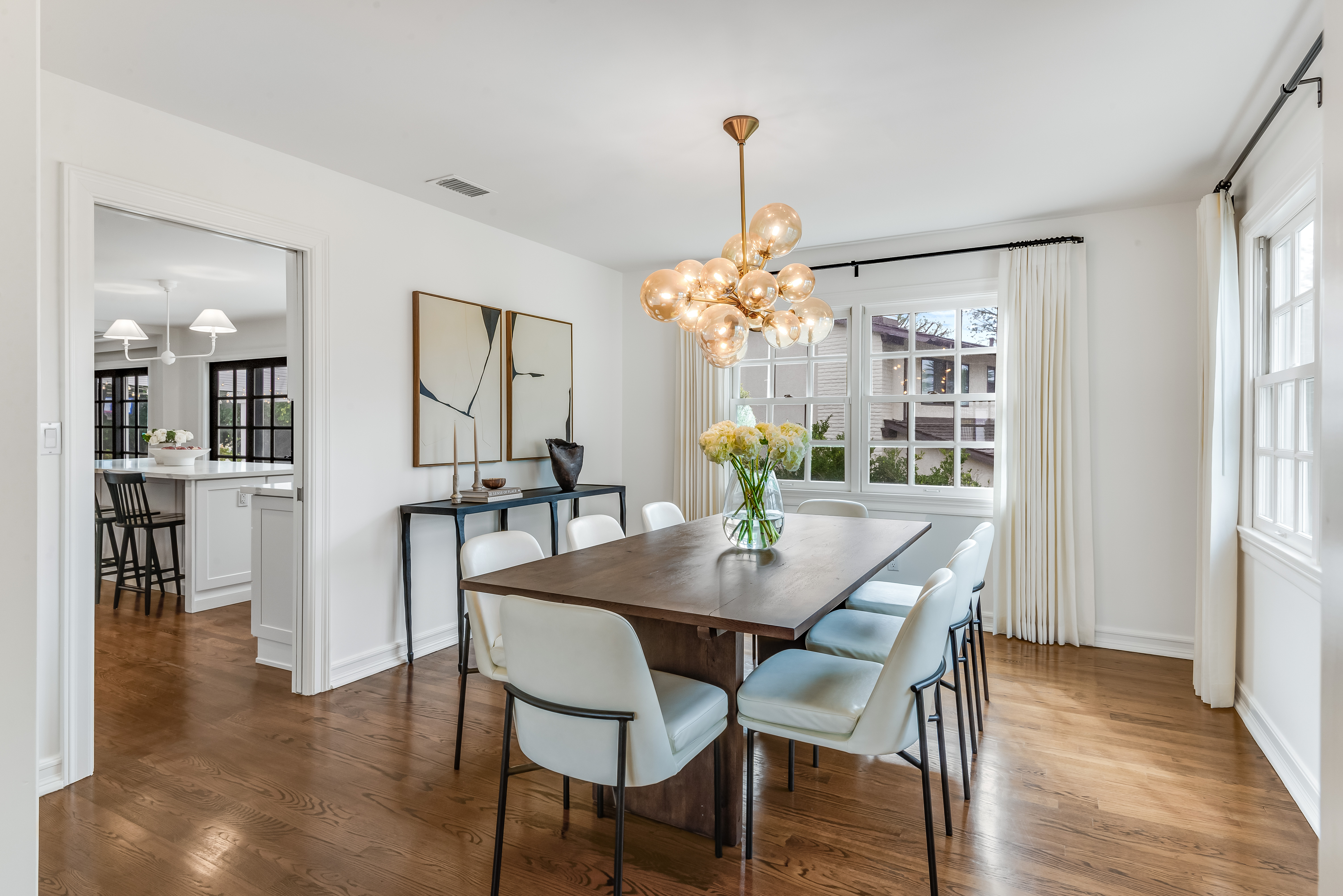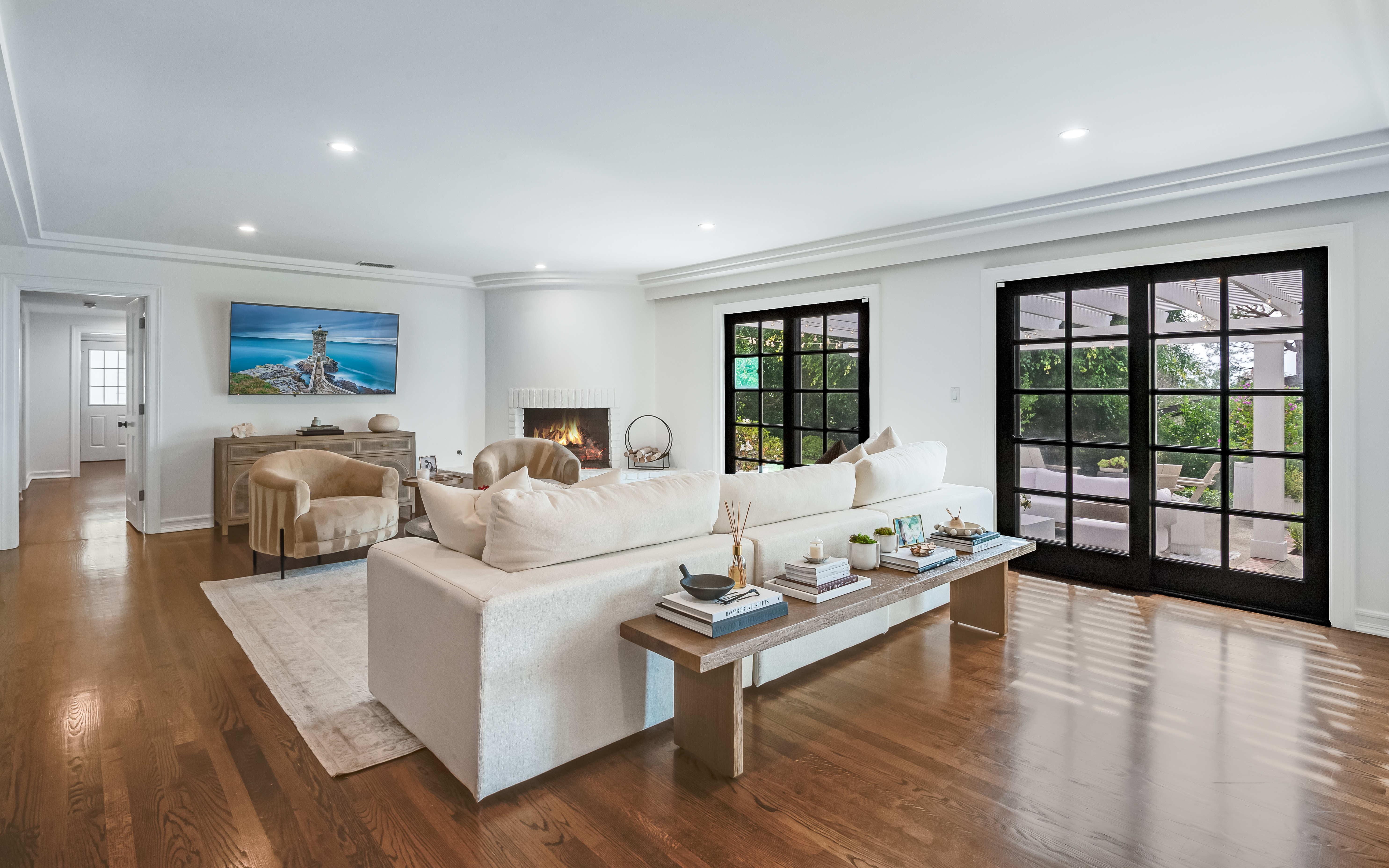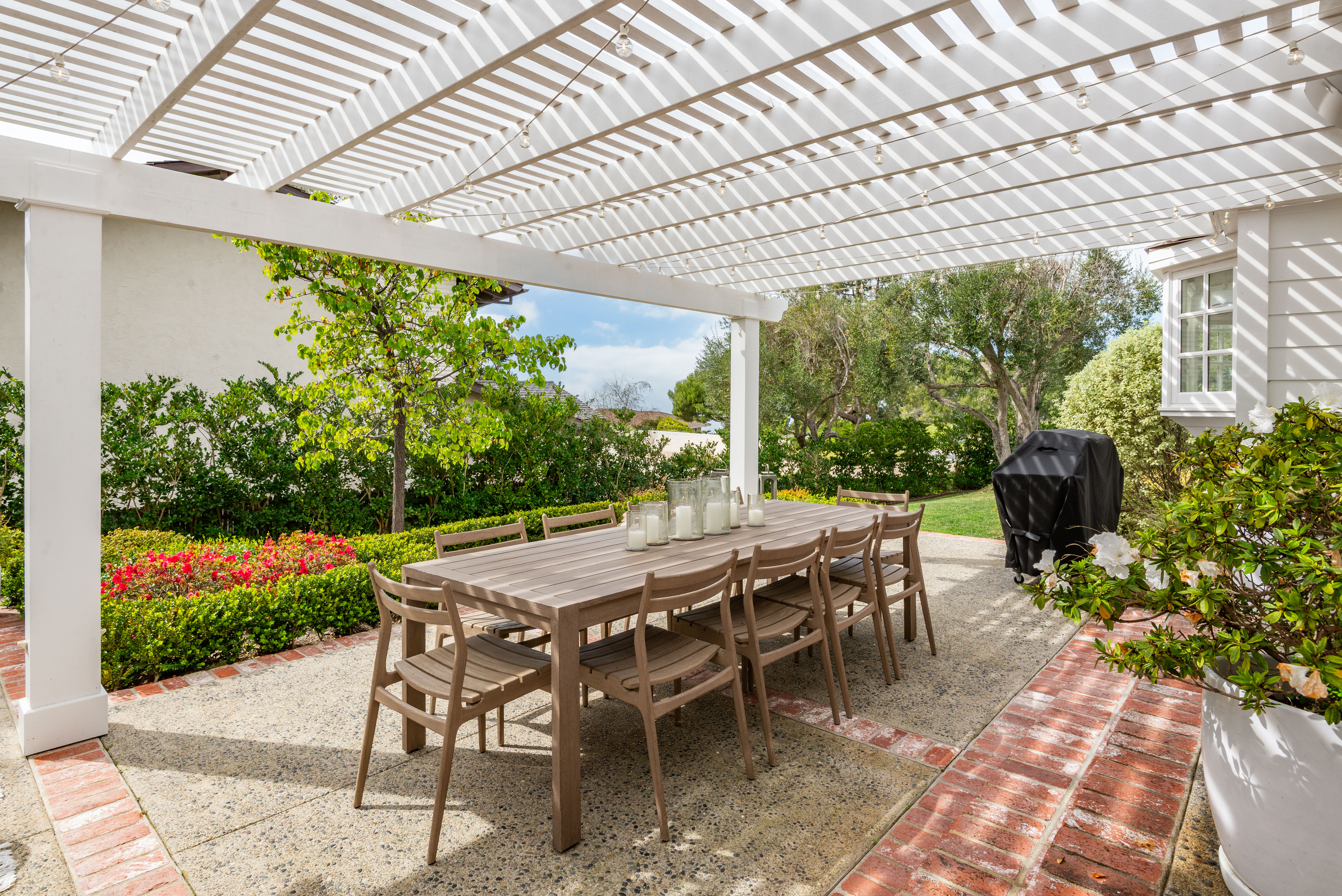 Sleek, stylish, and effortlessly inviting, this updated single-level home evokes the charm of a classic East Coast residence reimagined for California living. Brick accents, divided-light windows and a warm, cohesive palette create a sense of understated elegance throughout. The impressive living room is anchored by a classic fireplace and filled with natural light. The formal dining room is the perfect spot for entertaining. The remodeled kitchen is both beautiful and functional, featuring crisp white cabinetry and countertops. It opens seamlessly to the adjacent family room with fireplace, where French doors lead to the spacious backyard. Outdoors, the home enjoys a covered patio with pergola and soft string lighting creating a warm ambiance with distinct seating areas. Surrounded by lush landscaping and thoughtfully curated details, the space feels private and intimate. The home offers five spacious bedrooms, including a large primary suite with a gorgeous primary bathroom and walk-in closet. Set on an expansive, flat lot with manicured grounds and mature trees, this desirable single-level, Luanda Bay home has timeless appeal and sophistication.