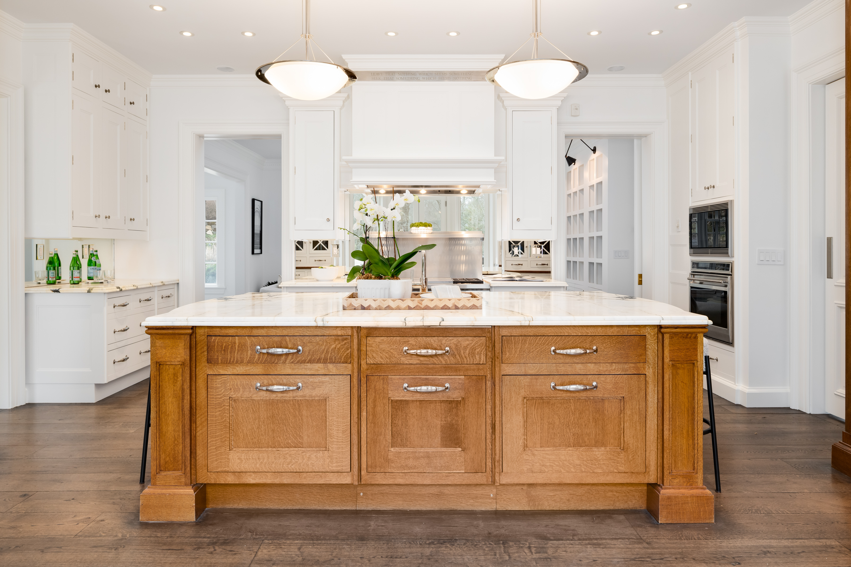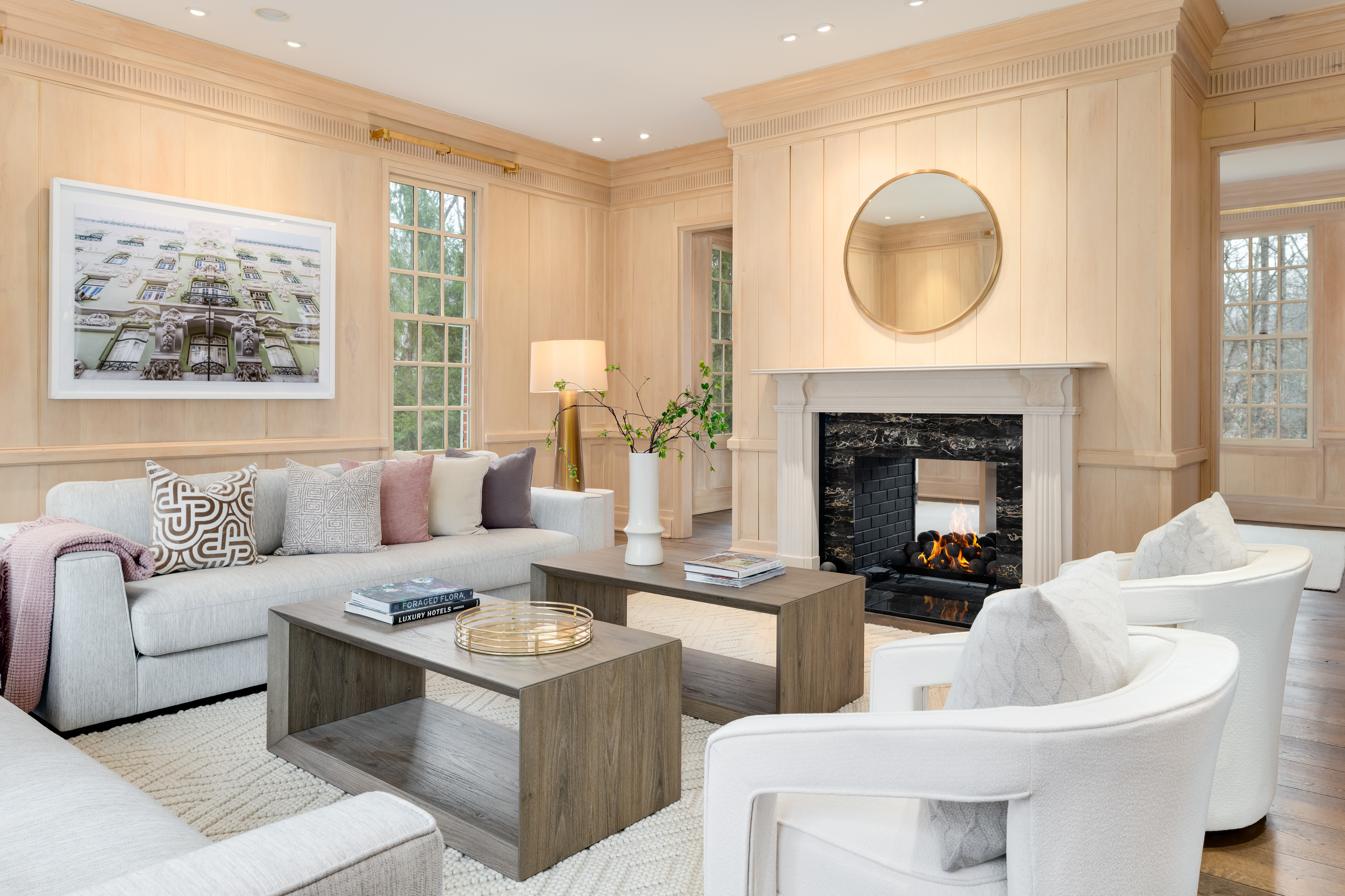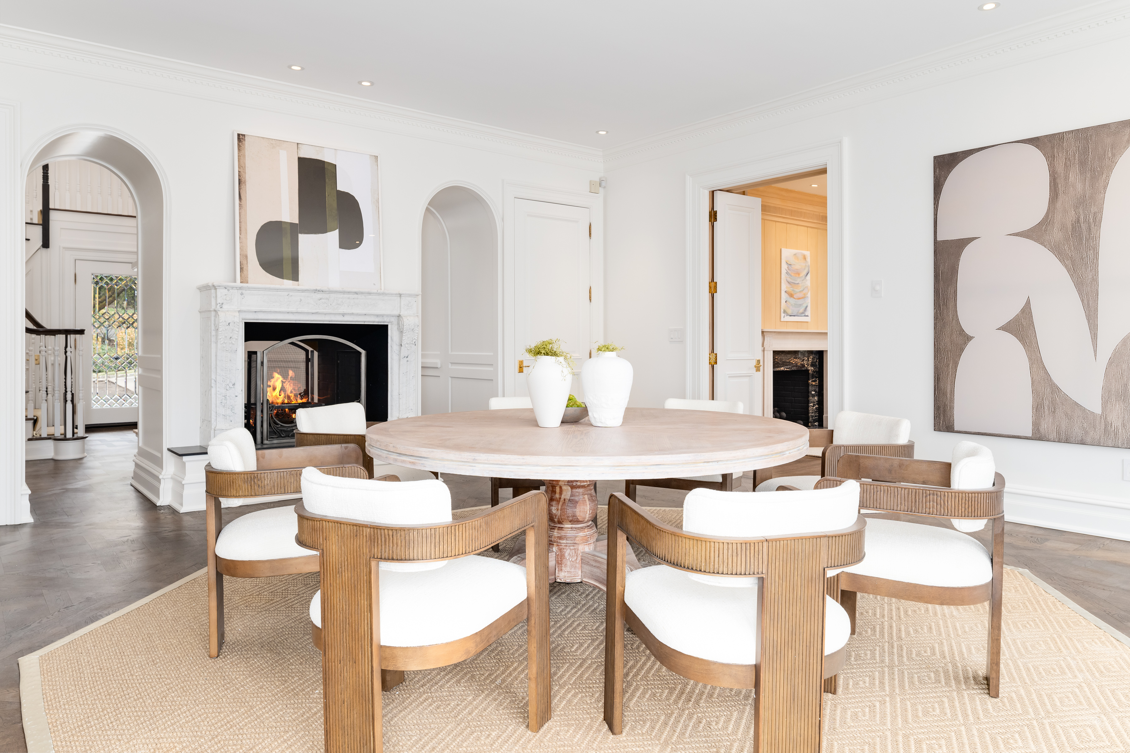First Floor: A magnificent double-height foyer makes a dramatic entrance with a fireplace, dentil molding, Versailles-patterned parquet oak floors and a powder room. Serving as both a focal point and a subtle divider, the double-sided foyer fireplace creates a graceful transition to the formal dining room. Elegant dual arched doorways open to the dining room with parquetry floors, dentil molding, a marble fireplace and French doors to the deck. Perfect for outdoor entertaining, the deck features a retractable awning, speakers and a barbecue. Paneled in white oak, the formal living room with wide-plank floors also features a double-sided fireplace that artfully screens the adjoining paneled office with built-ins and lake views.