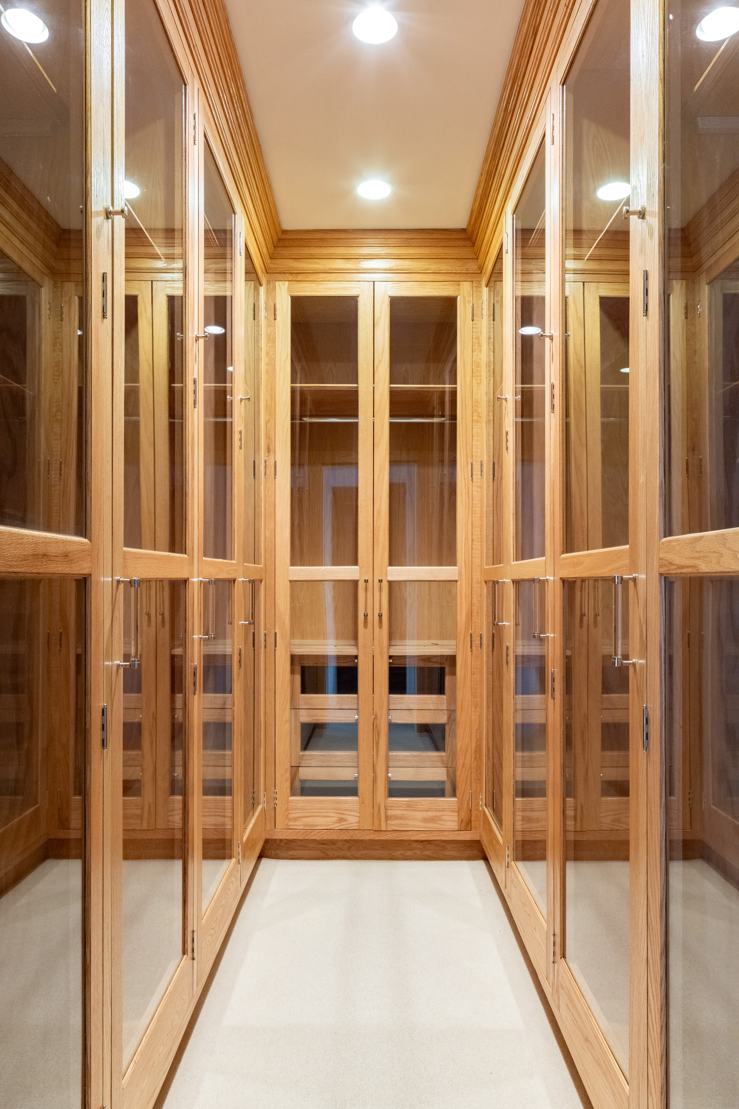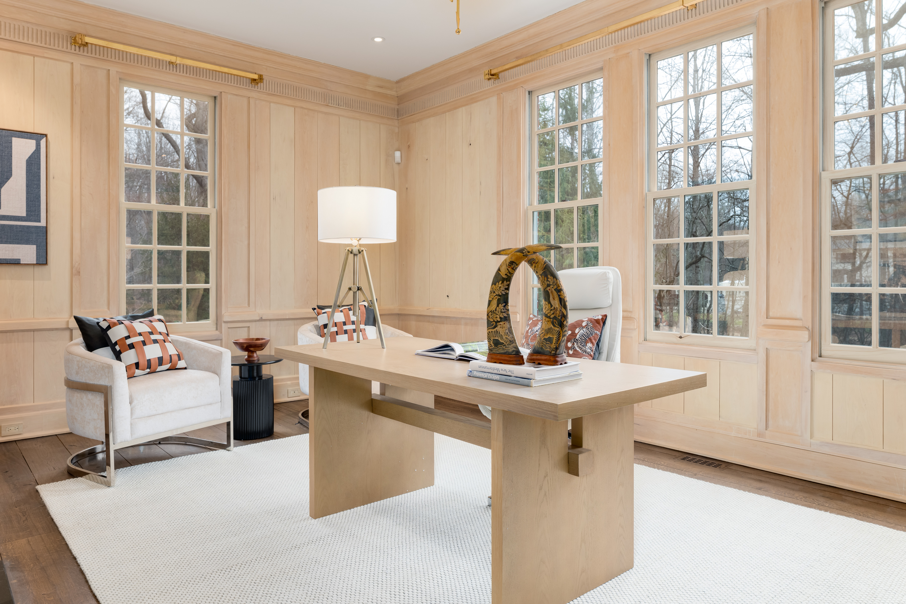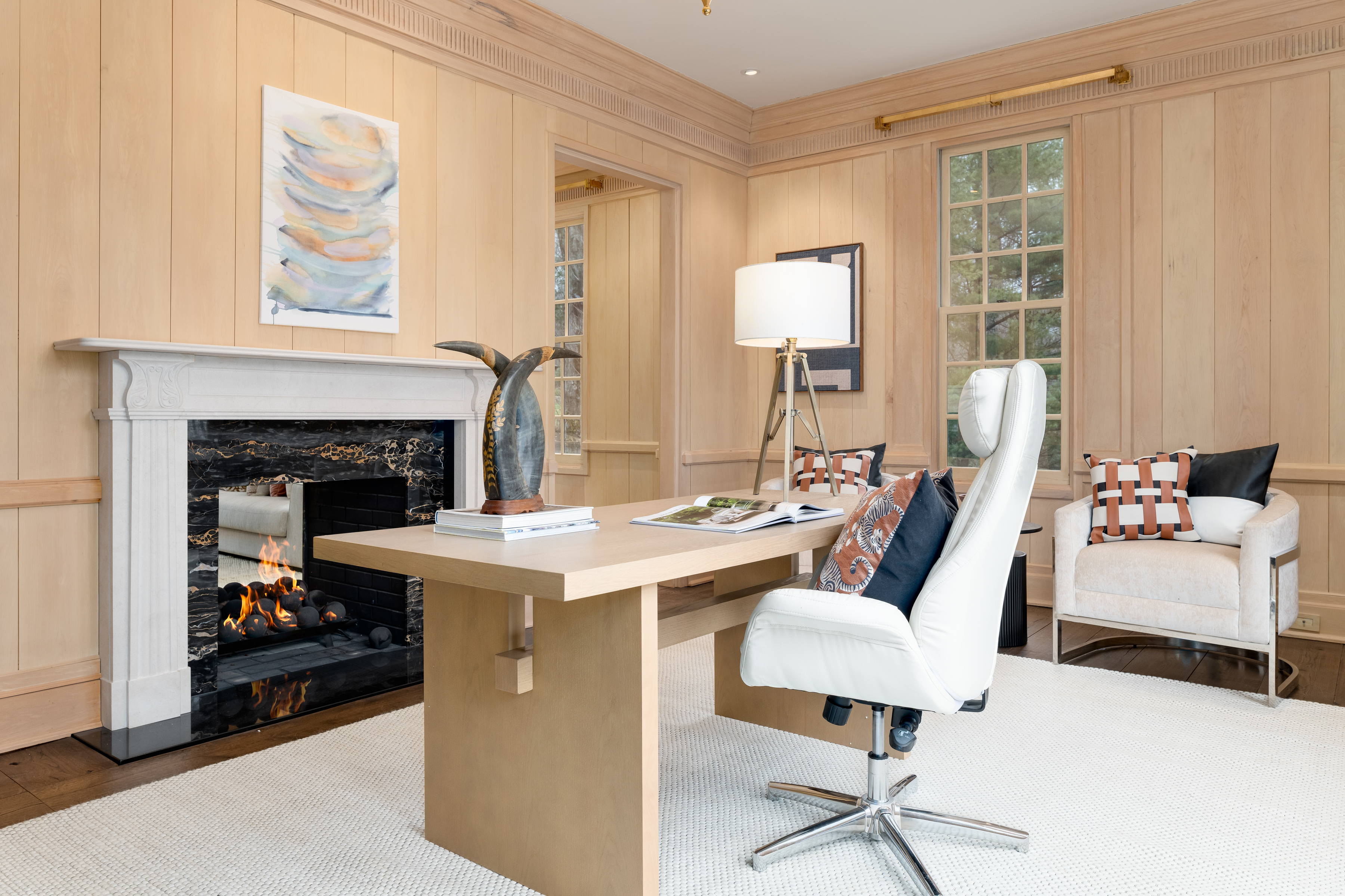 First Floor: A magnificent double-height foyer makes a dramatic entrance with a fireplace, dentil molding, Versailles-patterned parquet oak floors and a powder room. Serving as both a focal point and a subtle divider, the double-sided foyer fireplace creates a graceful transition to the formal dining room. Elegant dual arched doorways open to the dining room with parquetry floors, dentil molding, a marble fireplace and French doors to the deck. Perfect for outdoor entertaining, the deck features a retractable awning, speakers and a barbecue. Paneled in white oak, the formal living room with wide-plank floors also features a double-sided fireplace that artfully screens the adjoining paneled office with built-ins and lake views.