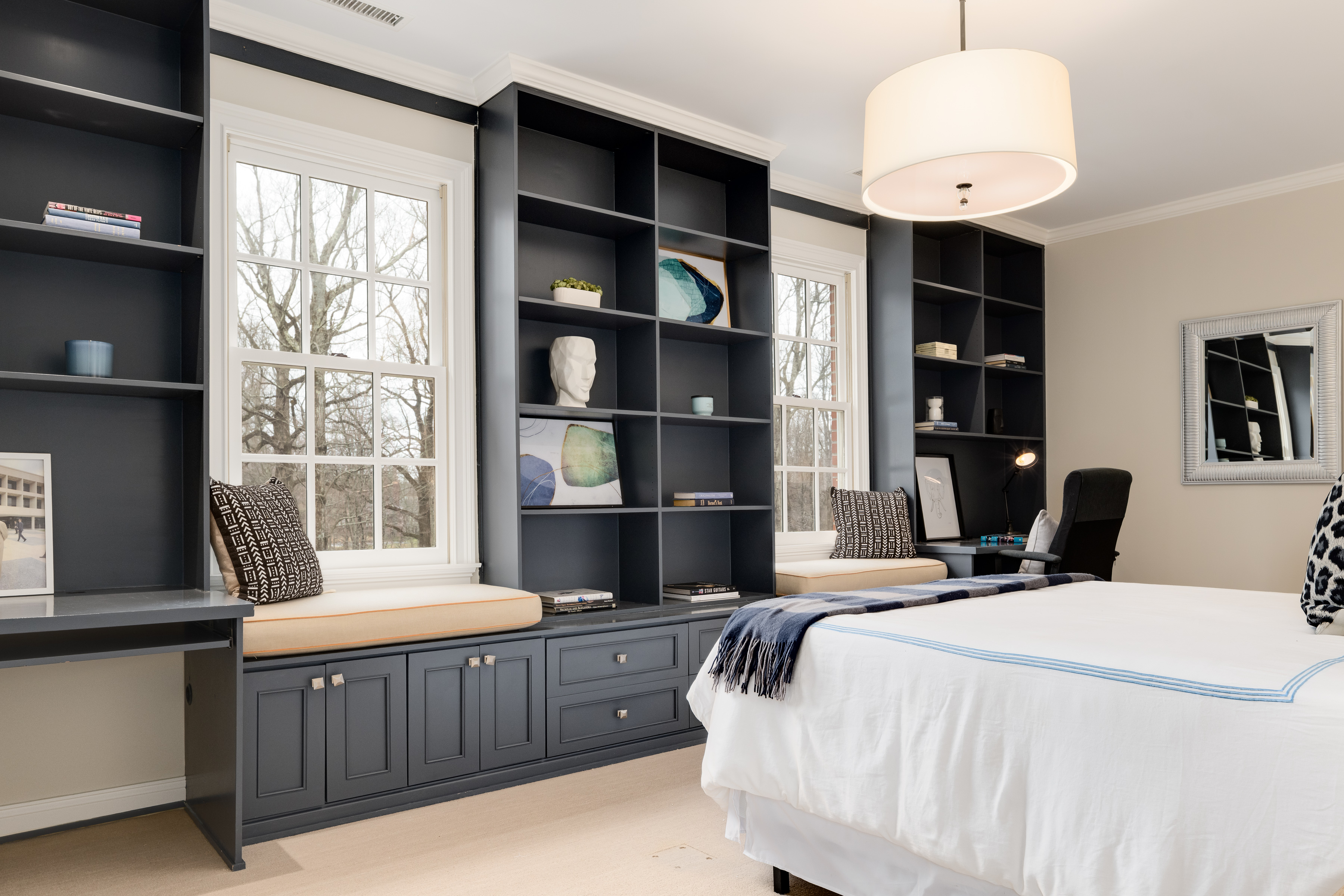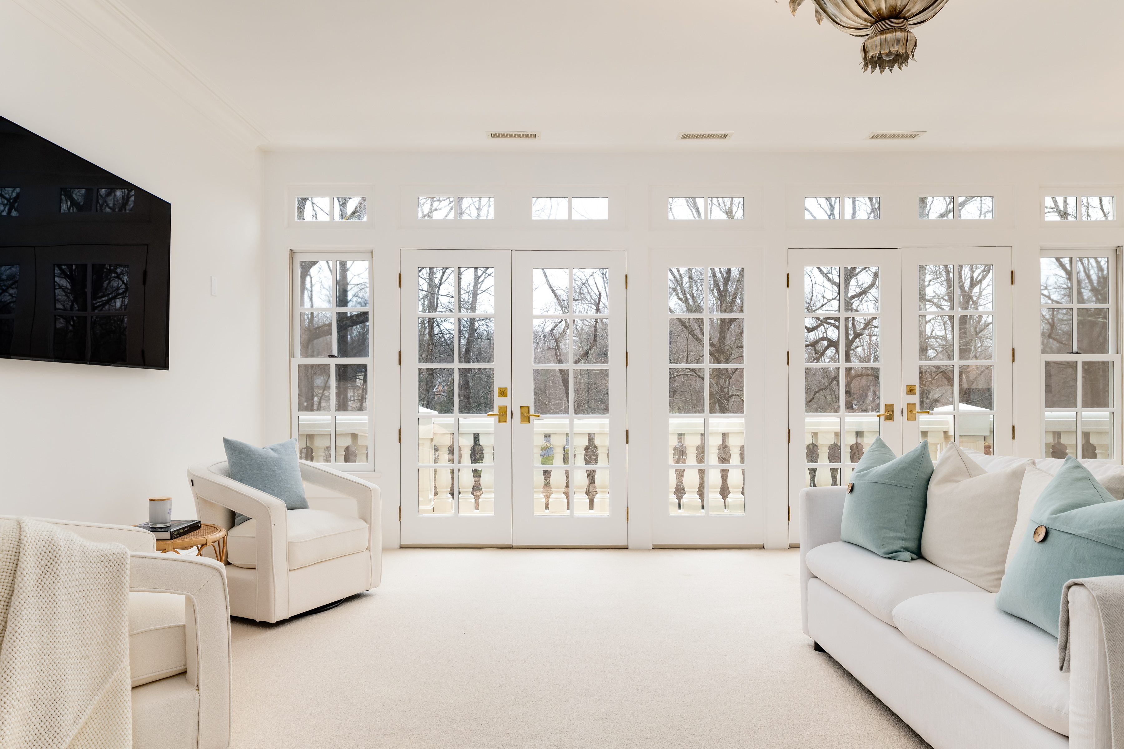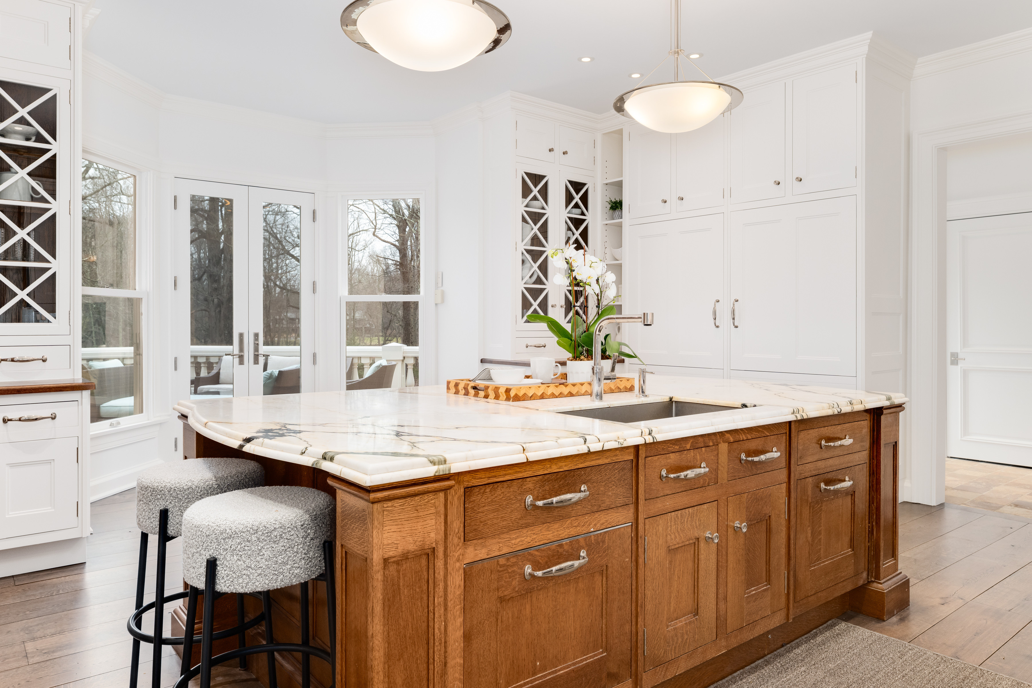 Centered on a marble island, the distinguished Christopher Peacock kitchen is appointed with a four-burner Wolf gas range with wok burner and double ovens, a Wolf wall oven and microwave and two SubZero refrigerators with freezer drawers. French doors open to the deck on one side and the family room with breakfast room on the other. Airy and bright, the family room features built-ins and dentil molding. Adjoining the breakfast room and kitchen is a mudroom with built-ins, an attached three-car garage and the back staircase to the second floor.