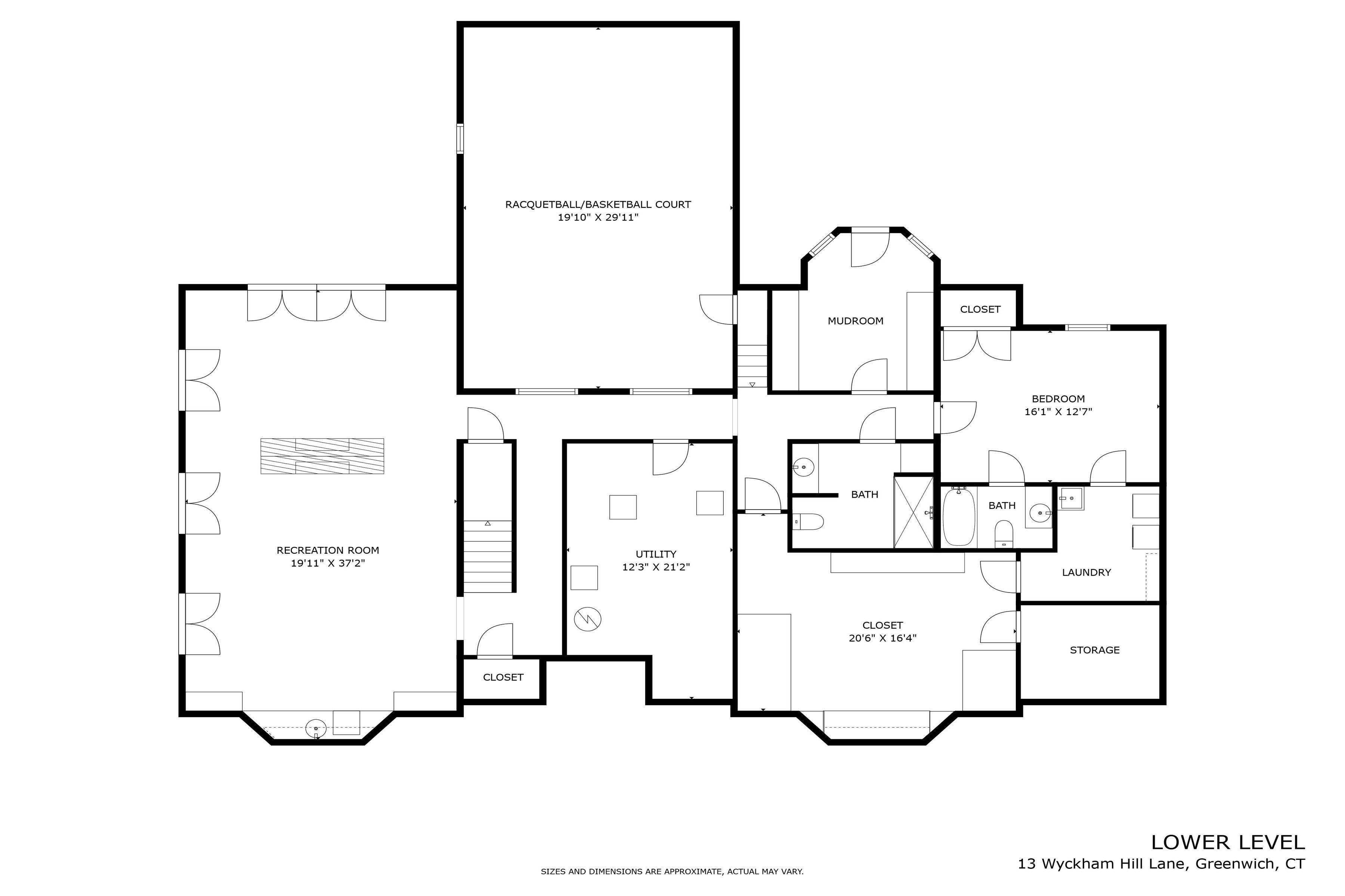 Lower Level: The highlight of the finished, walk-out lower level is the impressive indoor squash court with basketball hoop that could also serve as a golf simulator space. A “pool cabana” room and full pool bathroom leads to the outdoor pool with spa. A double-sided fireplace defines the space between the lower-level family room with wet bar and a game room. French doors open to the backyard and a patio with outdoor ping pong table. Eminently practical, this level also has an en-suite bedroom, a second laundry room, a cedar closet, and a custom-fitted storage room.