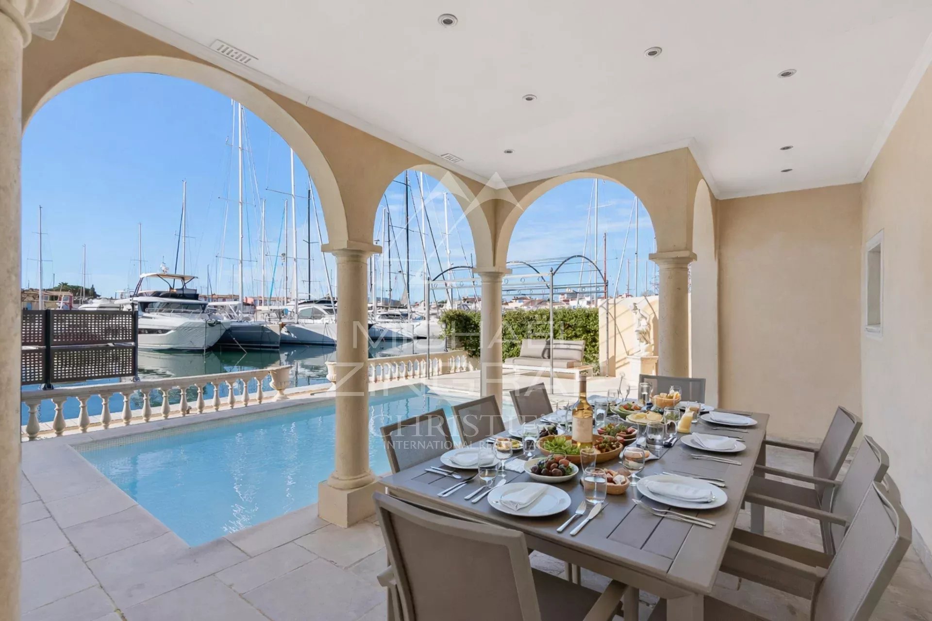 Outside, three terraces totaling approximately 30 m² (one of which is covered) and a pool overlooking the canal invite you to relax and enjoy time with friends and family, with an unobstructed and privileged view of the water. Its private 20.60 m x 6.40 m mooring with a dock provides direct access to the sea, ideal for boating enthusiasts.