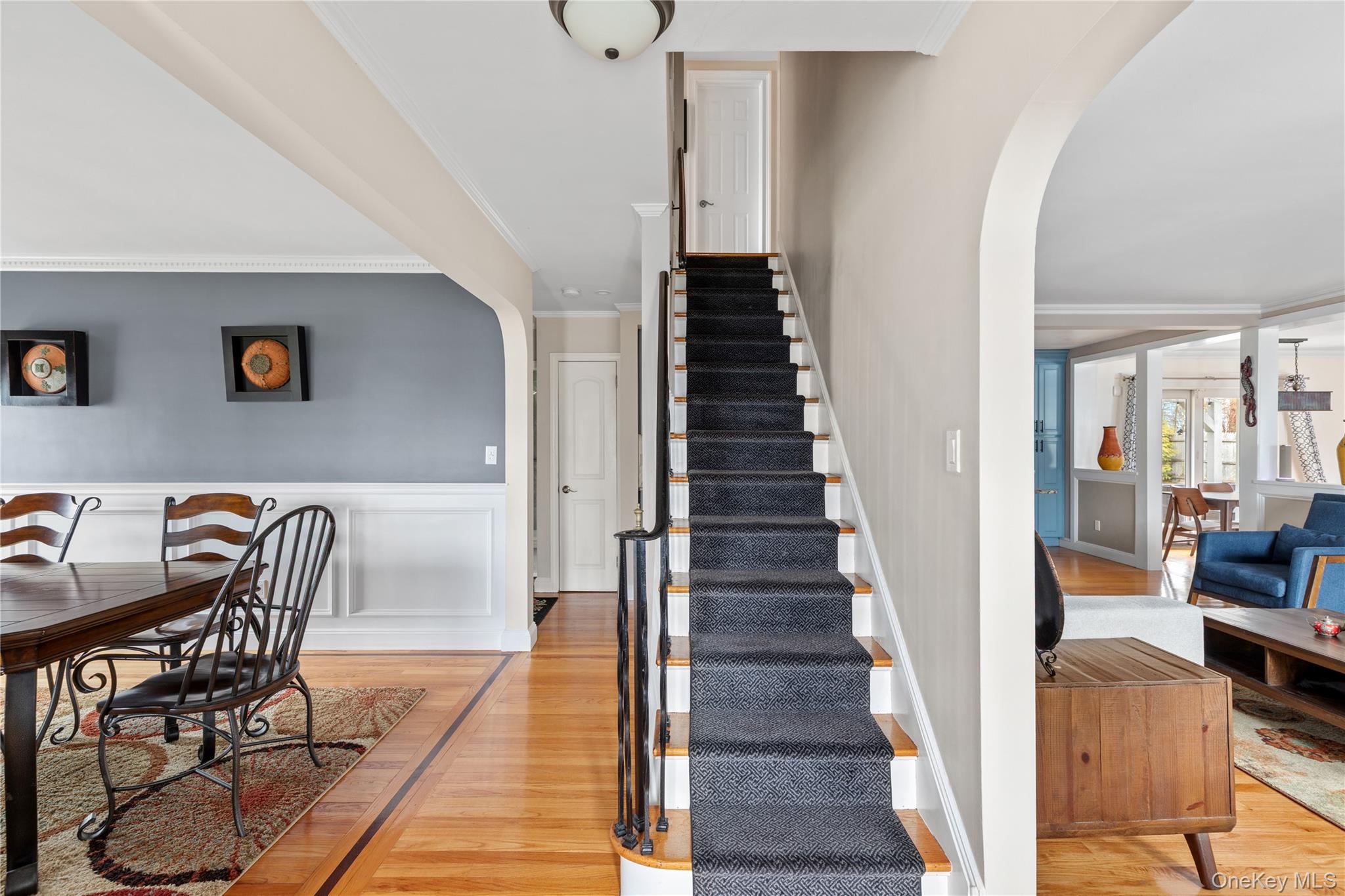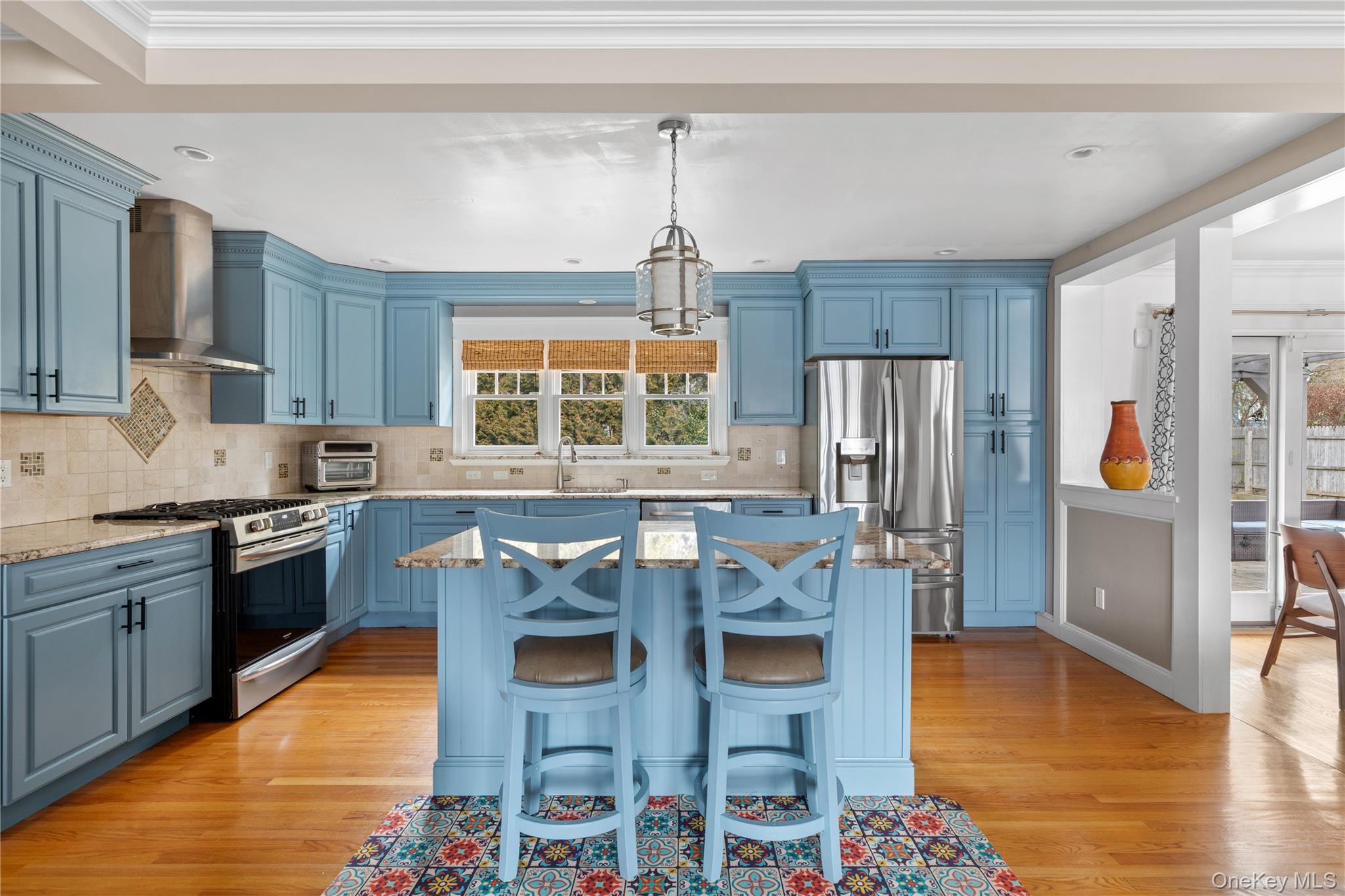Nestled on a picturesque street with serene neighborhood views overlooking the Engineers Golf Course, this immaculate four-bedroom expanded Cape Cod residence offers timeless charm and modern comfort. Its striking curb appeal features classic brick and blue siding, complemented by a storybook front porch that warmly welcomes you home.Bathed in natural light, the interior showcases a formal dining room with gleaming hardwood floors and an inviting living room centered around a wood-burning stove fireplace. The space flows seamlessly into a beautifully appointed eat-in kitchen, complete with a center island, rich painted wood cabinetry, and stainless steel appliances - ideal for both everyday living and entertaining.A spacious den and dining area combination offers versatility and comfort, with sliding doors that open to an exceptional outdoor entertaining space. A thoughtfully designed mudroom features custom built-ins, cubbies, and radiant heated floors, with convenient access to the attached garage.The main level also includes a full bath and a generously sized bedroom, perfect for guests or flexible living arrangements. Upstairs, you’ll find three additional bedrooms, two full baths, and a charming office alcove/ bonus landing space. The primary suite offers multiple closets and a private en-suite bath with a large glass enclosed shower. All bathrooms throughout the home have been tastefully renovated and feature radiant heated floors for added luxury. The fully finished basement provides additional living space with a recreation room, laundry room and utilities (new water-heater).Step outside to a beautifully landscaped backyard oasis, complete with an above-ground saltwater pool, expansive sun deck, power awning, koi pond, and a paver patio with covered overhang and mounted TV - perfect for effortless outdoor entertaining. Mature plantings offer exceptional privacy, while an oversized double-wide driveway adds convenience.Located within the highly regarded North Shore Central School District, this home presents a rare opportunity to enjoy refined living in a truly idyllic setting.