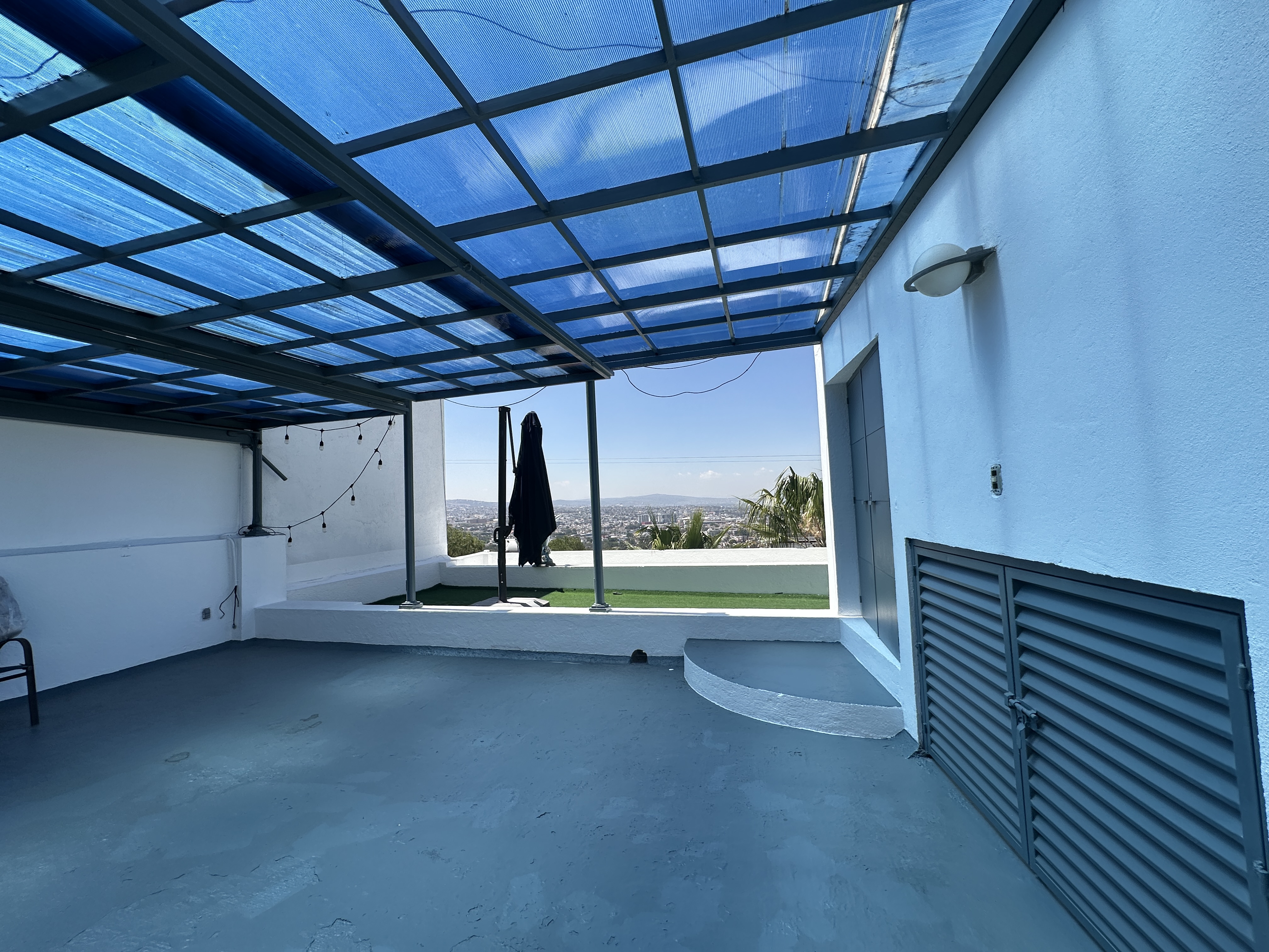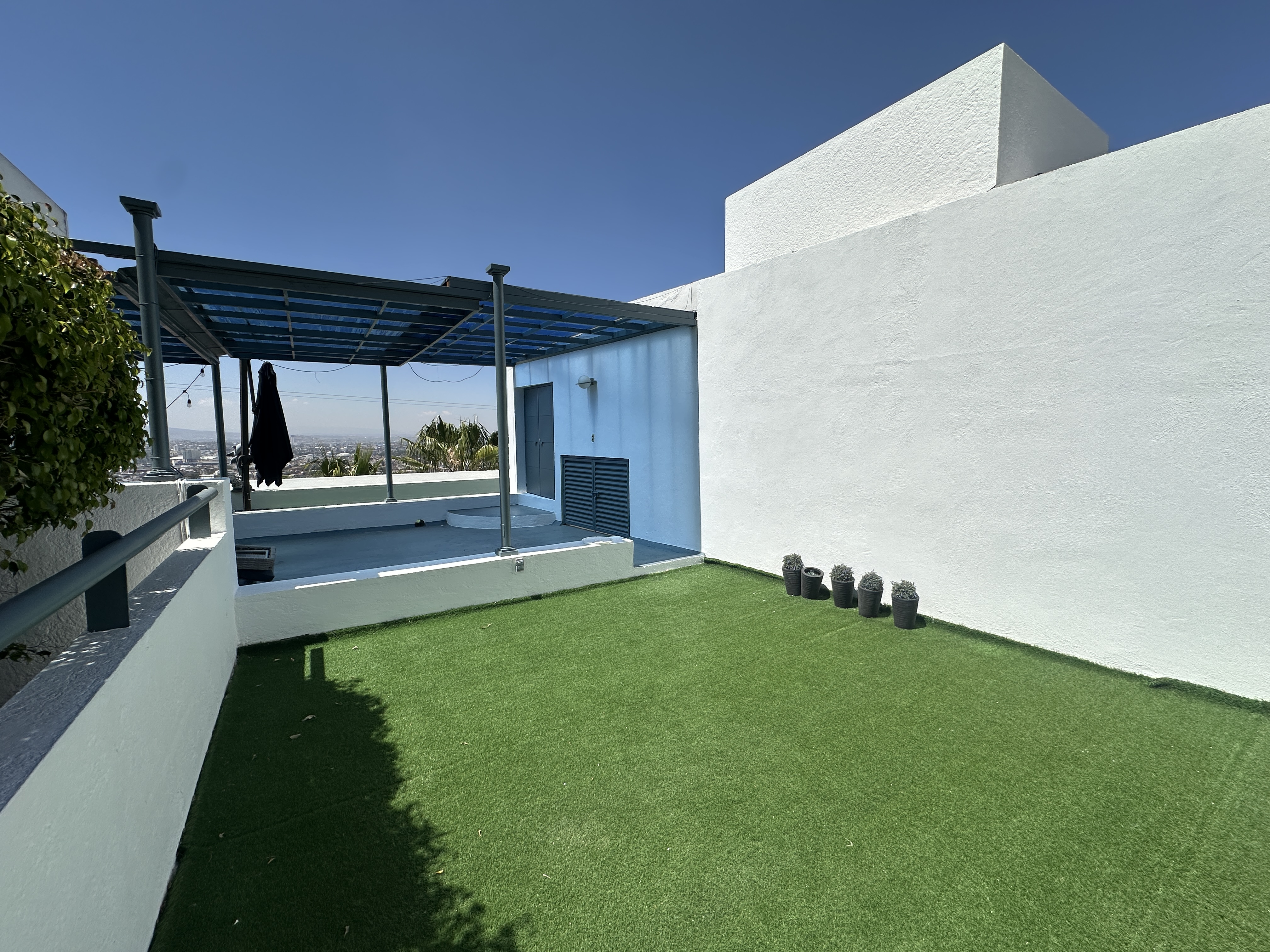 El jardín, integrado al terreno descendente, se convierte en un refugio natural que fluye con la arquitectura de la casa, mientras que la terraza para eventos sociales, con vista abierta a la ciudad, ofrece el escenario perfecto para reuniones memorables al atardecer.