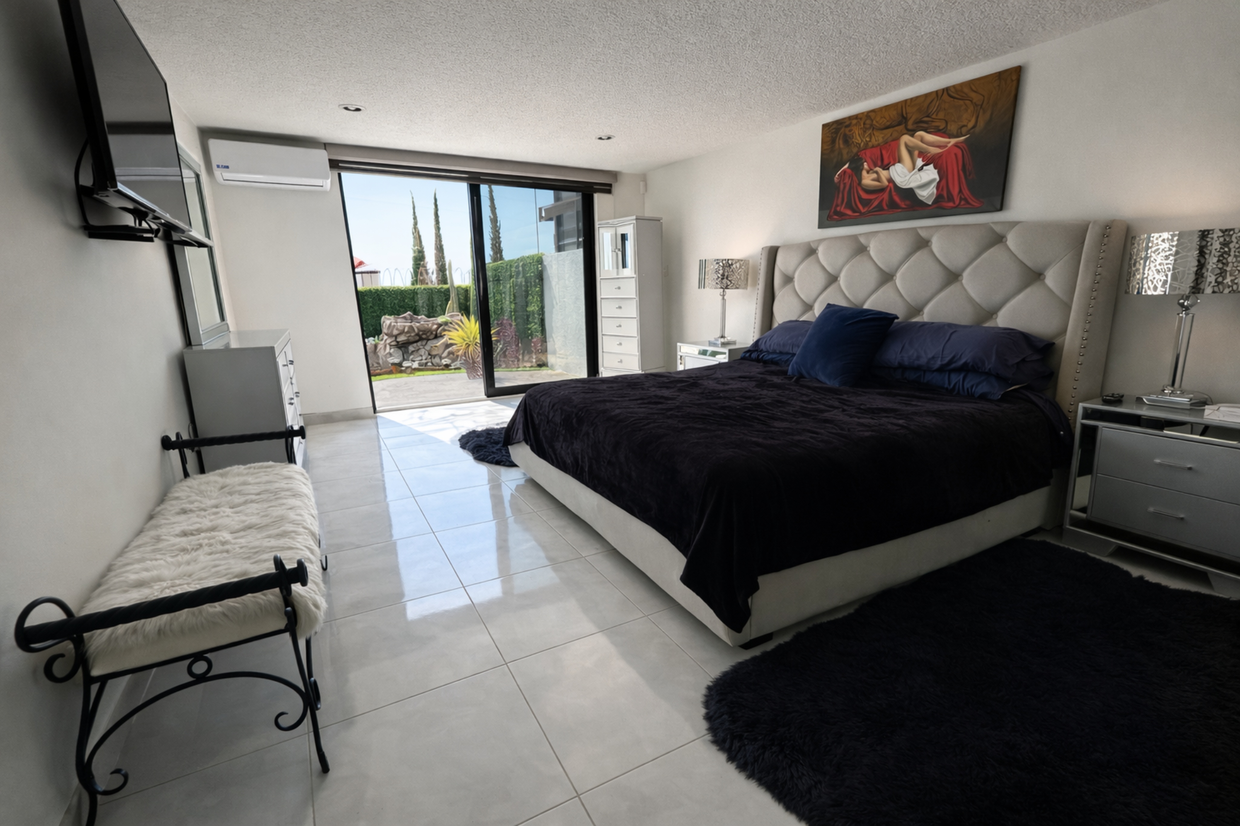 On the lower level, the private quarters offer three bedrooms, each with its own full bathroom, designed to provide comfort and privacy. The primary suite stands out with direct access to the garden, where a fountain creates a serene atmosphere, and features a walk-in closet and a bathroom with a jacuzzi, offering a private retreat.