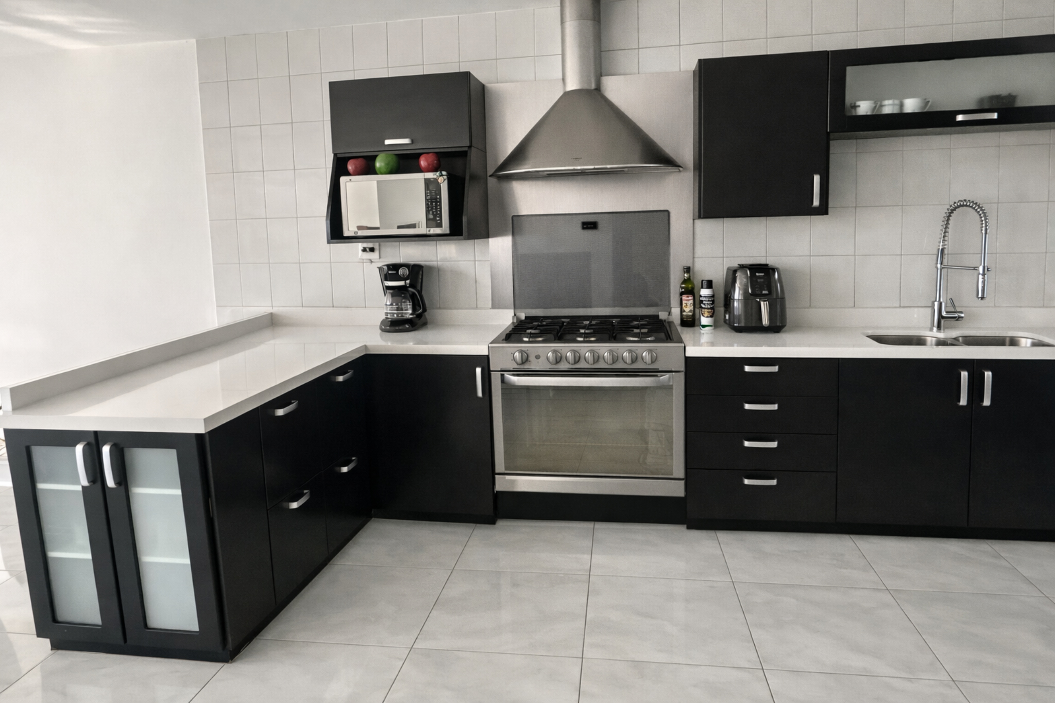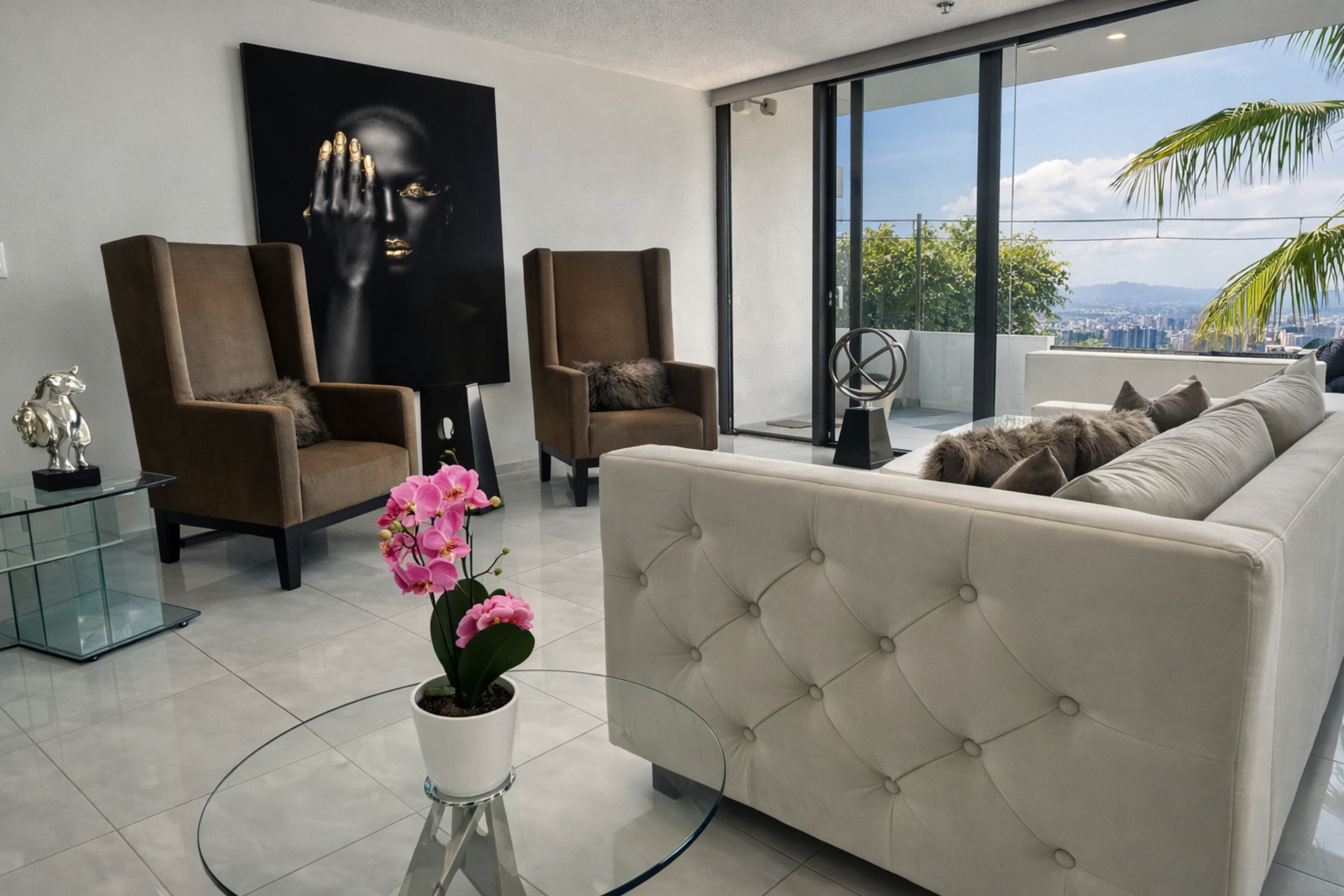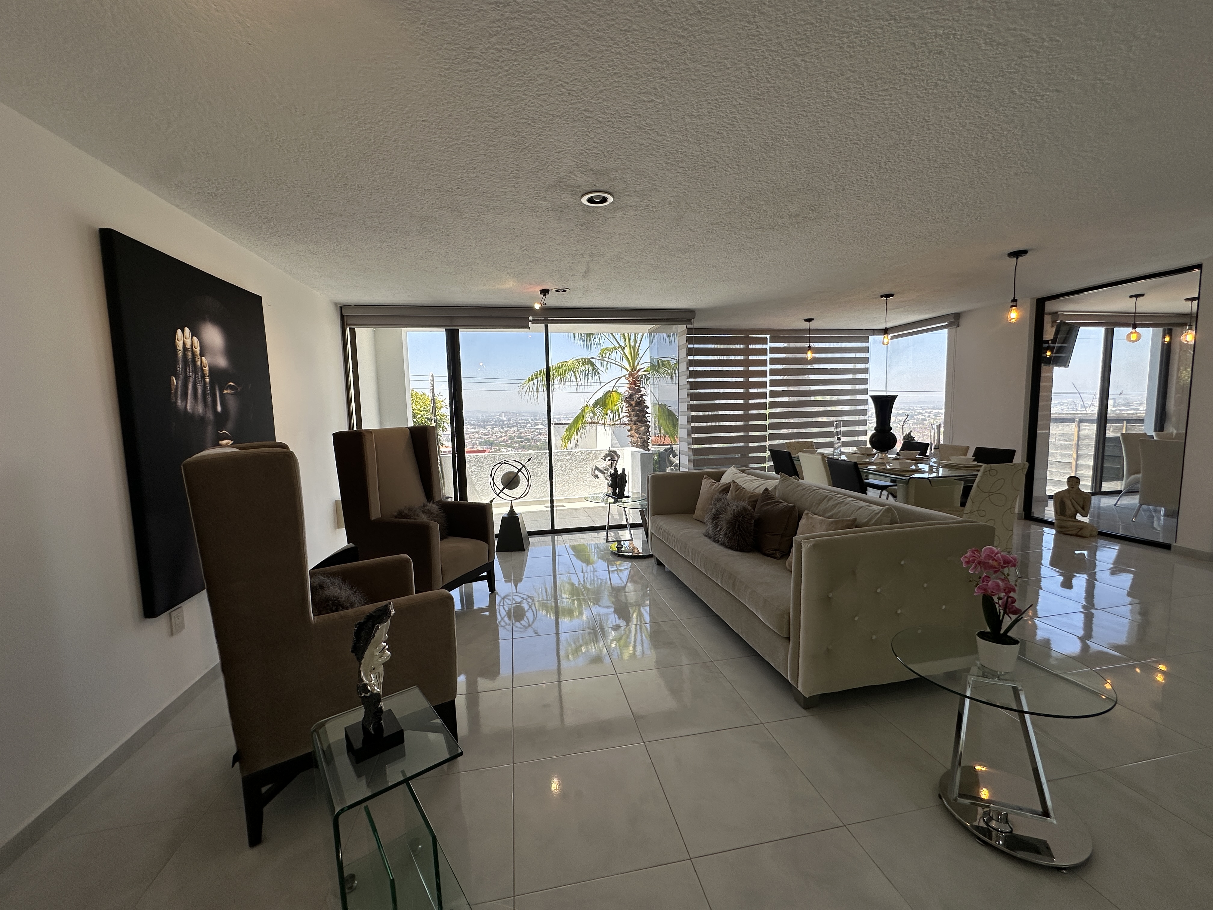 At the entrance level, the social areas unfold with openness and natural flow. The living and dining spaces are filled with light and framed by breathtaking views. A distinctive stained-glass feature in the living room adds character and leads to a balcony, inviting you to take in the urban landscape and turning everyday moments into a visual experience.
