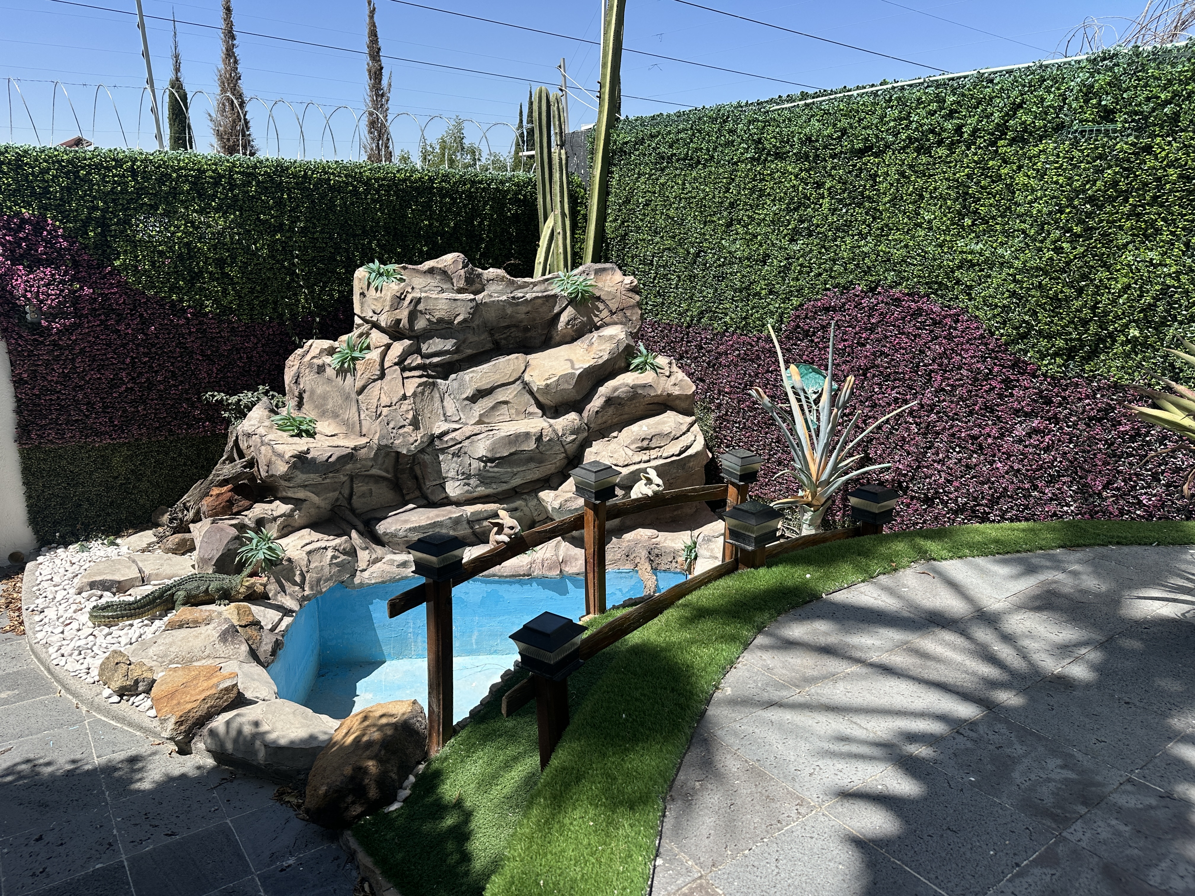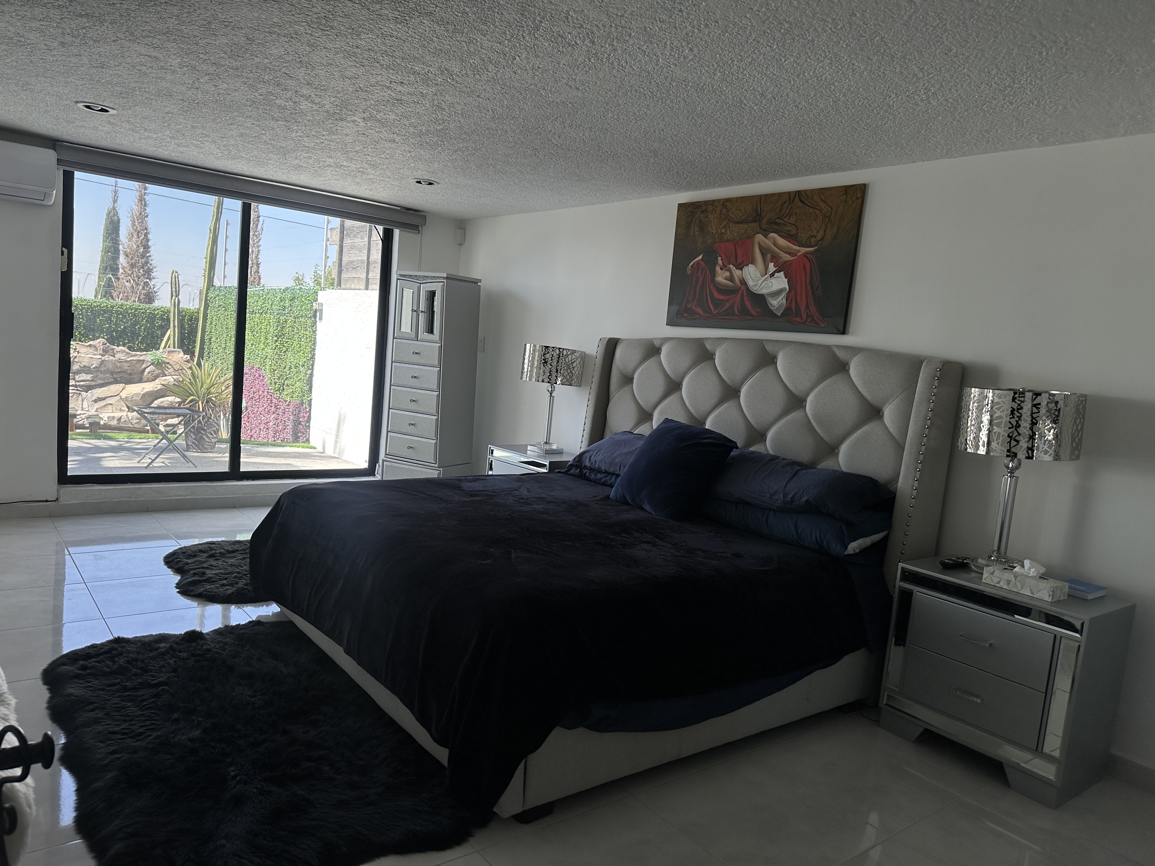 Descendiendo, el nivel privado alberga tres recámaras, todas con baño completo, diseñadas para ofrecer privacidad y confort. La recámara principal se distingue por su conexión directa al jardín, donde una fuente aporta un ambiente de serenidad, además de contar con vestidor y un baño con jacuzzi que crea un espacio íntimo de descanso.