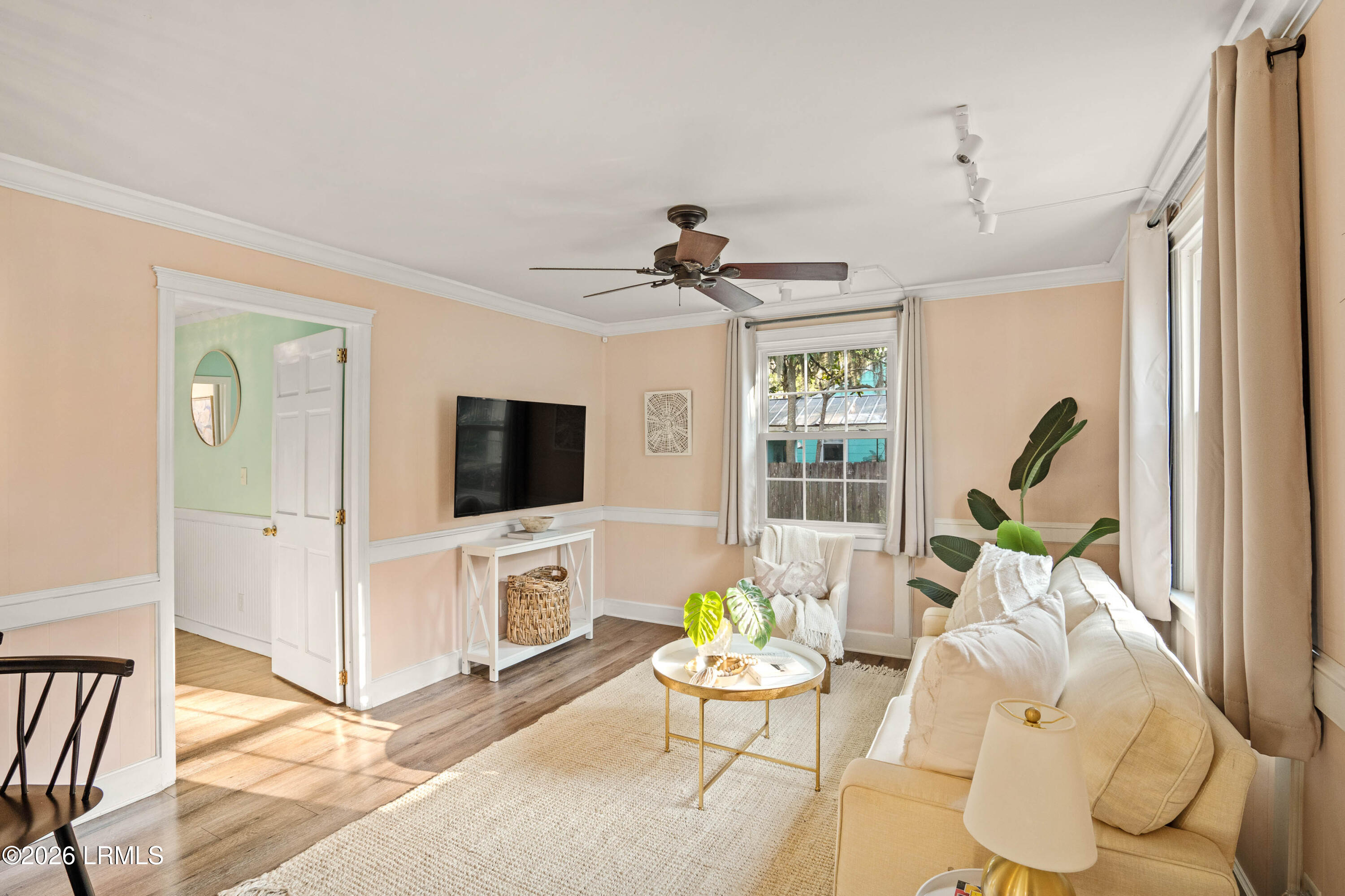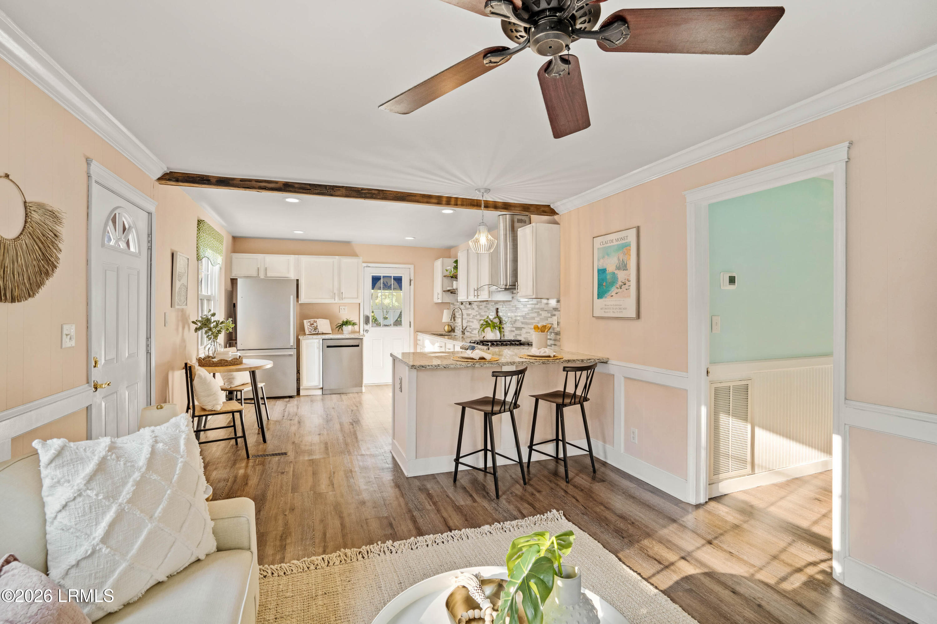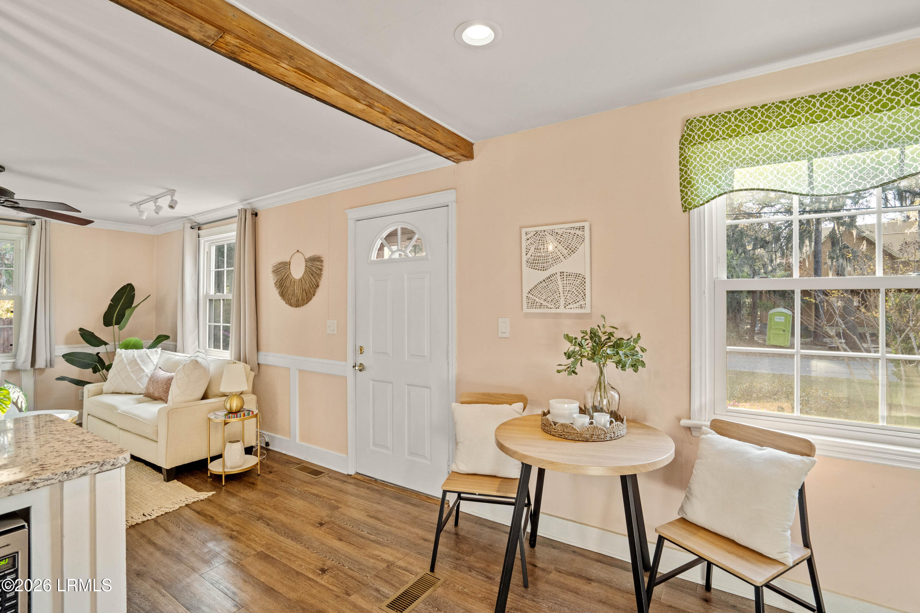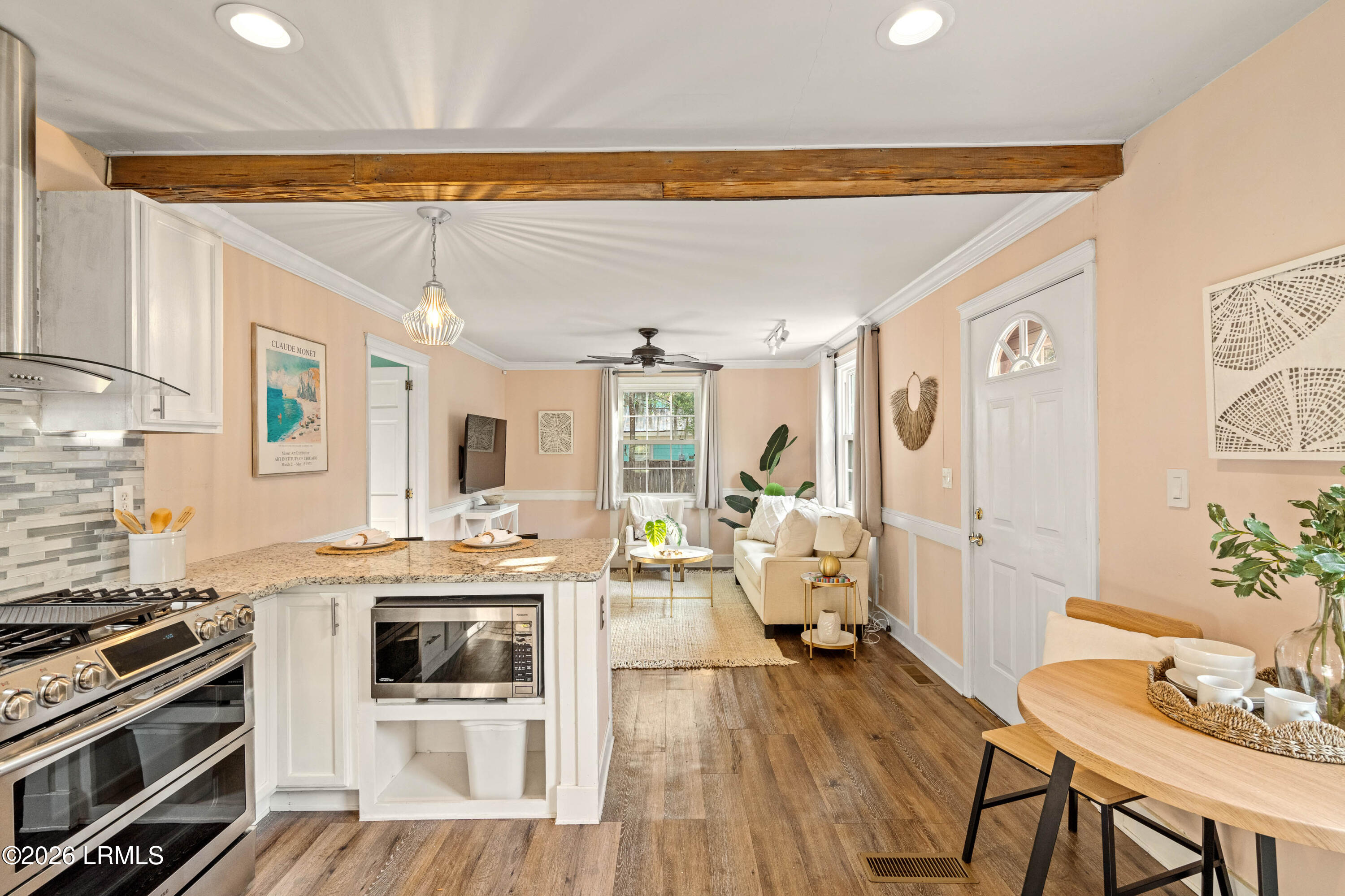 Welcome to 1614 Edinburgh Ave. A reimagined 1949 village cottage where classic Lowcountry character meets modern coastal living. Thoughtfully renovated and meticulously maintained, this 3 bedroom, 2 bath residence offers 1,047 sqft of curated interior space paired with exceptional outdoor living, creating a property that lives far beyond its footprint. Inside, the home was completely transformed in 2018 to deliver an open, light-filled layout designed for both everyday living and effortless entertaining. The kitchen serves as the centerpiece, featuring granite countertops, a generous peninsula, stainless steel appliances, custom cabinetry, and designer finishes including shiplap accents, exposed beams, and a mixed marble and stone backsplash. Commercial-grade LVP flooring flows seamlessly throughout, complemented by updated plumbing systems, modern fixtures, and thoughtfully enhanced bedroom storage. Natural light pours through all-new Simonton vinyl windows, backed by a limited lifetime warranty, with added casement windows to enhance airflow and bring the outdoors in capturing the essence of coastal living. Step outside and the lifestyle truly unfolds. A sprawling wraparound deck, installed in 2020, offers over 330 square feet of elevated outdoor space perfect for hosting, relaxing, or enjoying quiet Lowcountry evenings. The expansive driveway and rear gate access create a rare and highly desirable feature for boat owners, offering both convenience and security with easy access for storing and maneuvering watercraft. The grounds have been thoughtfully designed to highlight native Lowcountry landscaping, featuring azaleas, jasmine, sweet viburnum, crape myrtles, gardenias, and a variety of camellias. Together, they create a lush, ever-changing natural setting that provides both privacy and a peaceful retreat from the pace of everyday life. The property's standout feature is the fully renovated outbuilding transformed between 2024 and 2025 into a private entertaining retreat. This approximately 250-square-foot space is finished with LVP flooring, plantation shutters, custom built-ins, a cooktop and sink, and screened walls with ceiling fans creating a breezy, resort-style environment ideal for gatherings or a flexible work/play space. Additional improvements continue throughout the property, including a 192-square-foot Graceland storage building with workbench and cabinetry, a covered rear storage area for kayaks and outdoor gear, and a custom-built spa hut designed for a one- to two-person lounger spa, your own private wellness escape. Capping it all off is a new architectural GAF Timberline HDZ roof installed in October 2025, offering long-term durability and peace of mind. Ideally located in the heart of Port Royal, residents enjoy close proximity to a vibrant coastal lifestyle with local restaurants, boutique shops, waterfront parks, boat landings, and nearby boat storage. Just moments away, the Spanish Moss Trail offers miles of scenic pathways perfect for walking, running, and biking--adding yet another layer to the active, outdoor lifestyle this location provides.