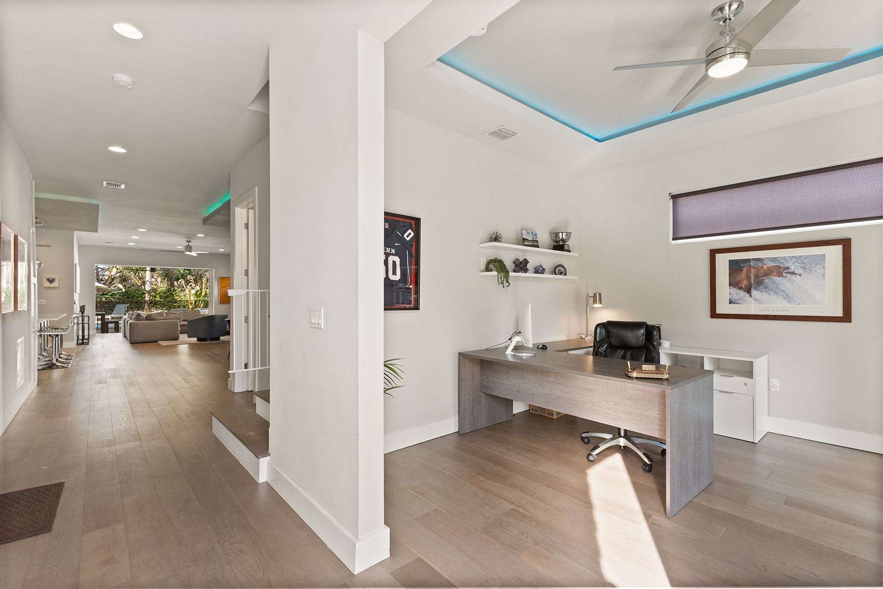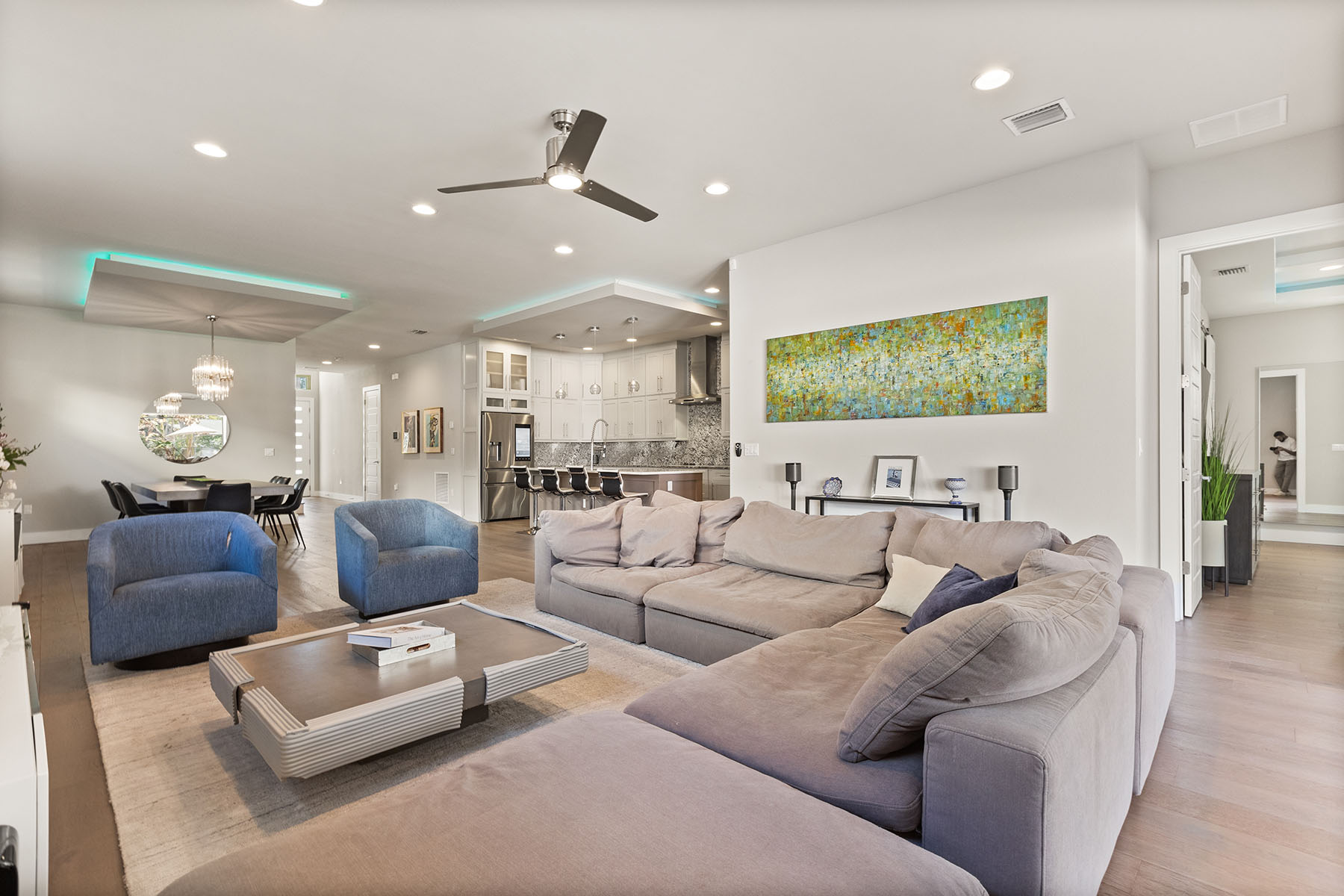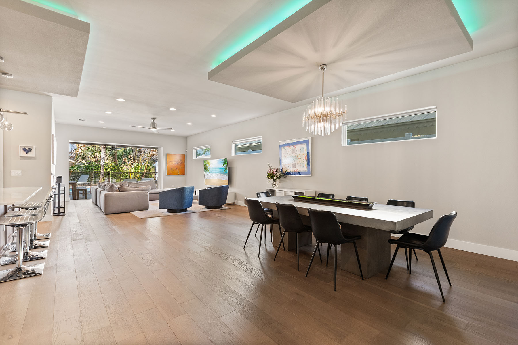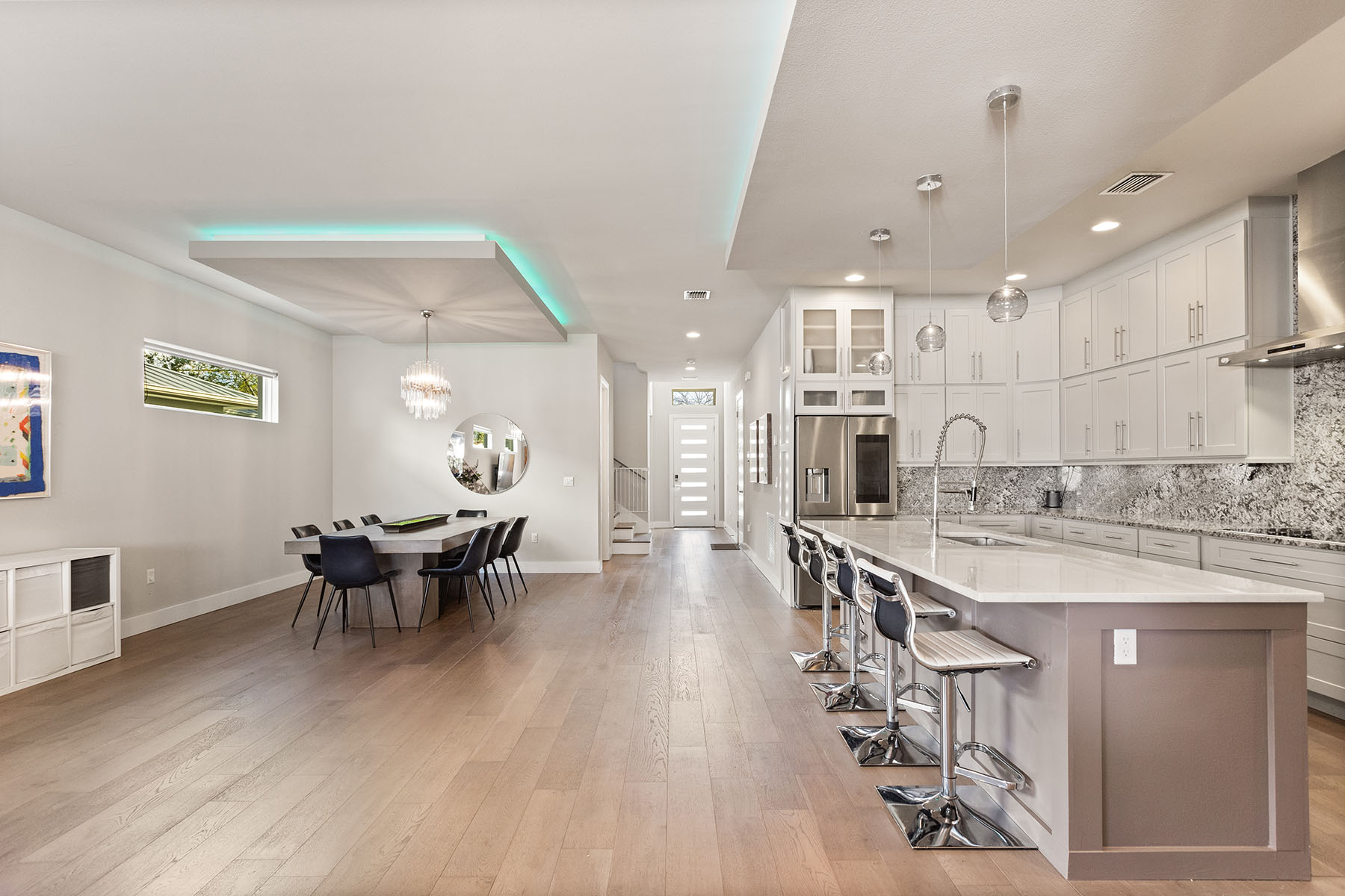 Discover Orwin Manor, one of Winter Park's established neighborhoods centrally located within an easy distance to the Orange Avenue WP corridor and minutes to downtown Orlando. Transitional architecture with modern leaning influences, this home is designed for ease of living. This four-bedroom 3.5-bath home stretches across nearly 3,200 square feet and features open kitchen to dining and living spaces that all blend into a covered porch to backyard retreat. The kitchen is the center of the home with custom double-stacked cabinetry to ceiling, upgraded appliances, large pantry with barn door, center island with bar seating, and full granite slab backsplash and counters add to the artistry of the kitchen. Ceilings are upgraded throughout with floating box details with ambient lighting that gently wash the ceilings and colors can be changed as you wish. Dining and living spaces are generous, and lined with transom windows for privacy and natural light that creates a beautiful backdrop to gather and entertain in. Invisible back doors fully open to the lanai and slide into the wall, staying hidden, an elegant upgrade. Covered porch with tongue and groove ceiling overlooks saltwater pool with hot tub and spillway. Professionally landscaped includes a turfed putting green for the golf enthusiast. Additional main floor flex space can be additional living or home office. Secondary bedrooms are upstairs with generous bonus space and laundry. First-floor primary suite is light and bright, with coffered ceilings and a large walk-in closet. Primary bath is neutrally appointed with dual floating vanities with vessel sinks, a soaking tub, and walk-in shower with seamless glass. A transom window provides privacy and a glow of sunshine and warmth. Lots of seller upgrades. This property is turnkey. Orwin Manor is a special neighborhood blending historic homes with new builds and great neighborhood park to go to. It is also a strategic location, minutes to Park Avenue in Winter Park, known for its upscale dining, elevated cafés and luxury local shopping, also a short distance to Orange Avenue corridor in WP featuring Foxtail Coffee & Buttermilk Bakery and more, and minutes to the Mills district, Advent Health on Rollins as well as major roadways. Great schools, zoned for Edgewater High, known for its magnet program and close to Lake Highland and many other private school options.