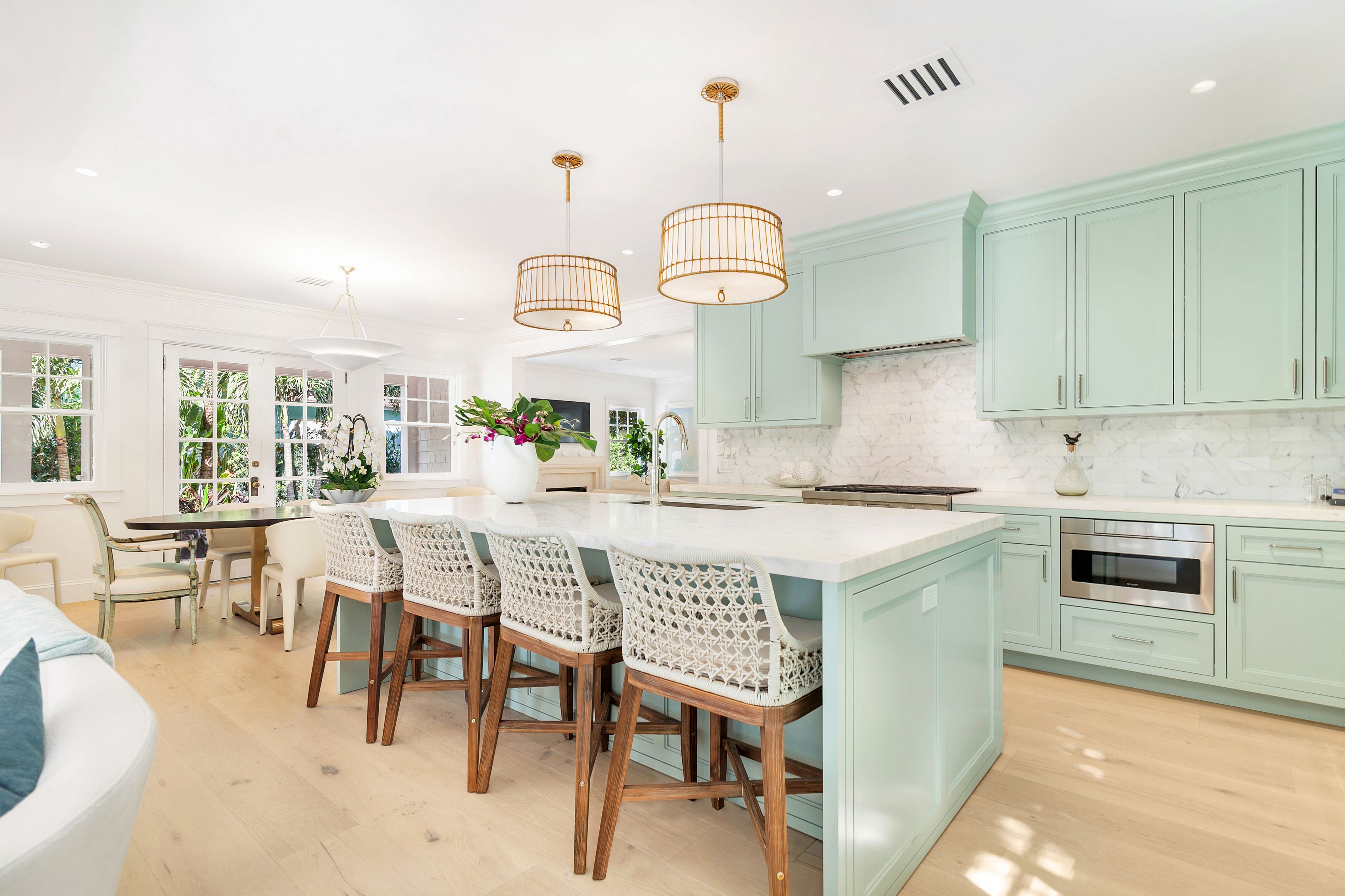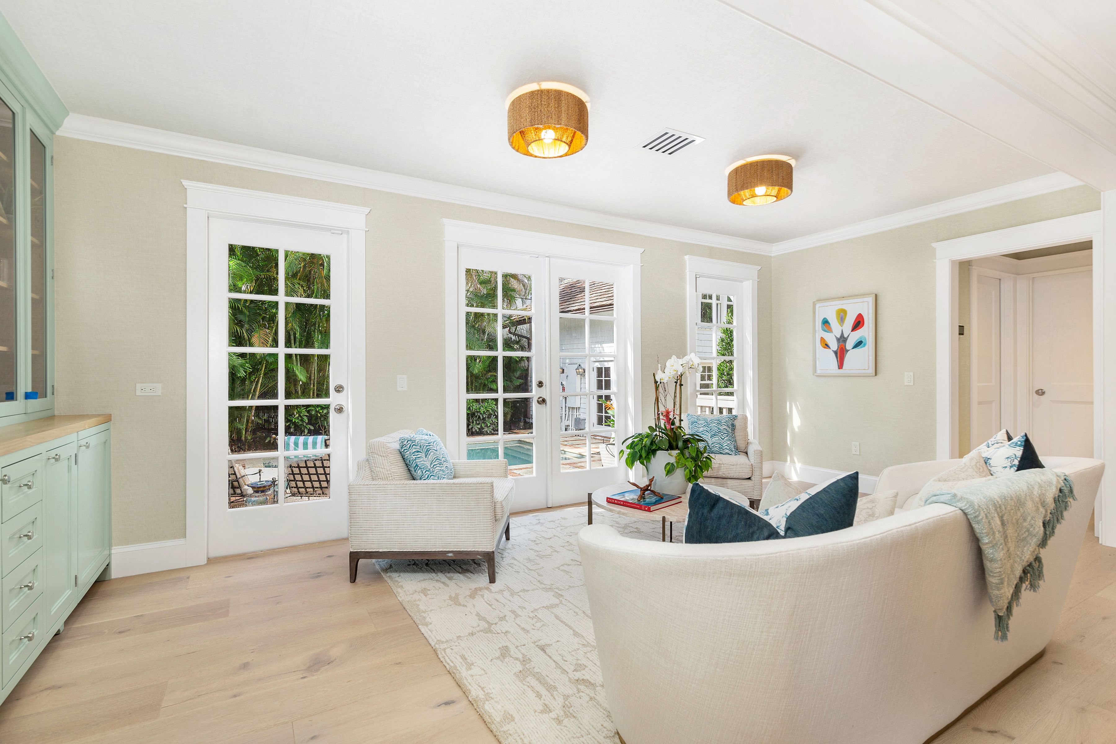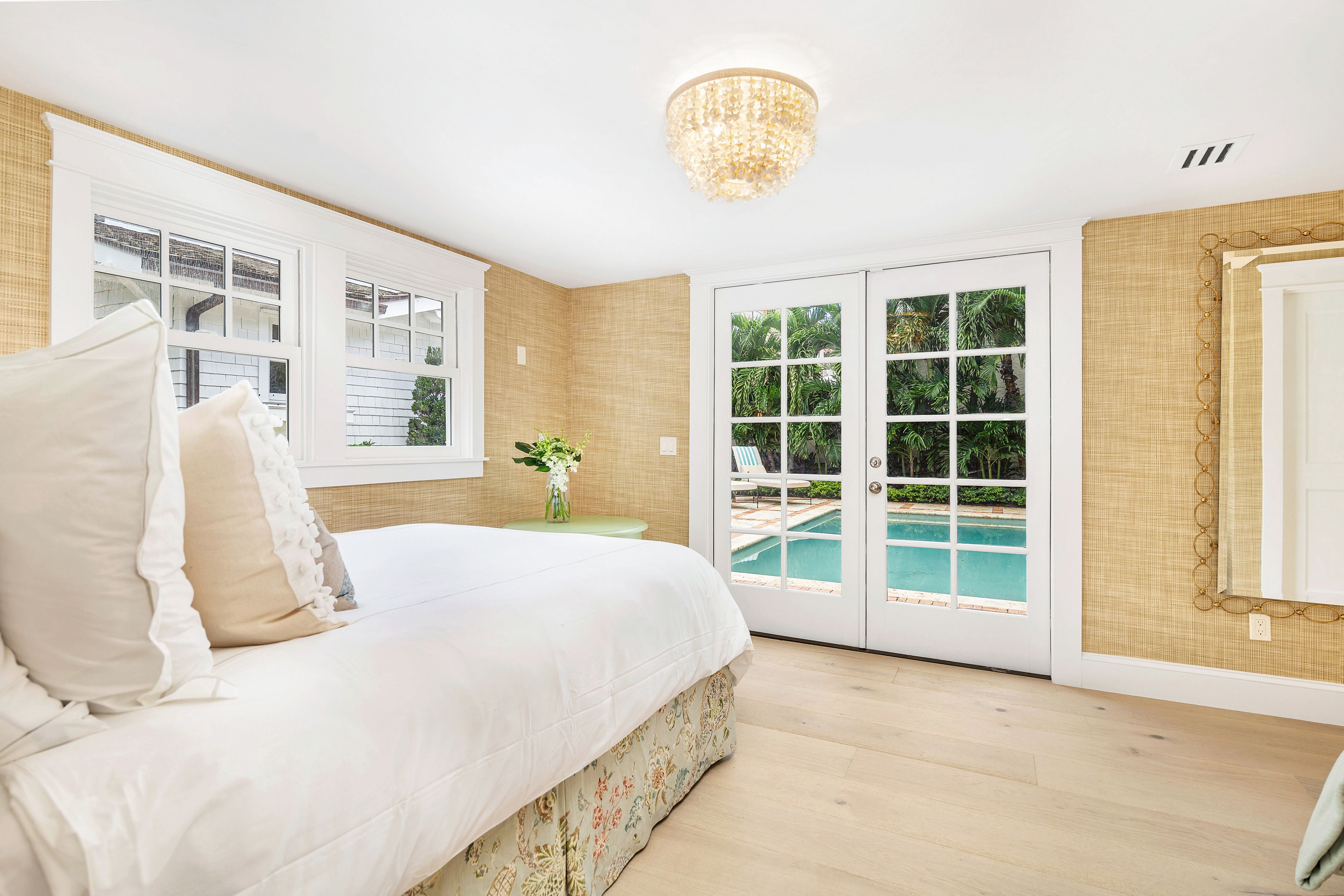 Reimagined by Smith Kellogg Architecture with interiors by Carolyn Roy of CR Studio, this renovated bungalow-style cottage is the ultimate Palm Beach Rental. Spanning 3,201 +/- square feet, this home has been meticulously renovated with high end finishes. The stunning kitchen is equipped with top-of-the-line appliances that include a Sub-Zero refrigerator, Wolf gas range and oven, and Miele dishwasher. The kitchen effortlessly flows into a dining area and family room, overlooking a sparkling heat pool that invites relaxation and entertainment. A gracious living room with fireplace, further enhances the allure of this home. The main house boasts three generously sized bedrooms.