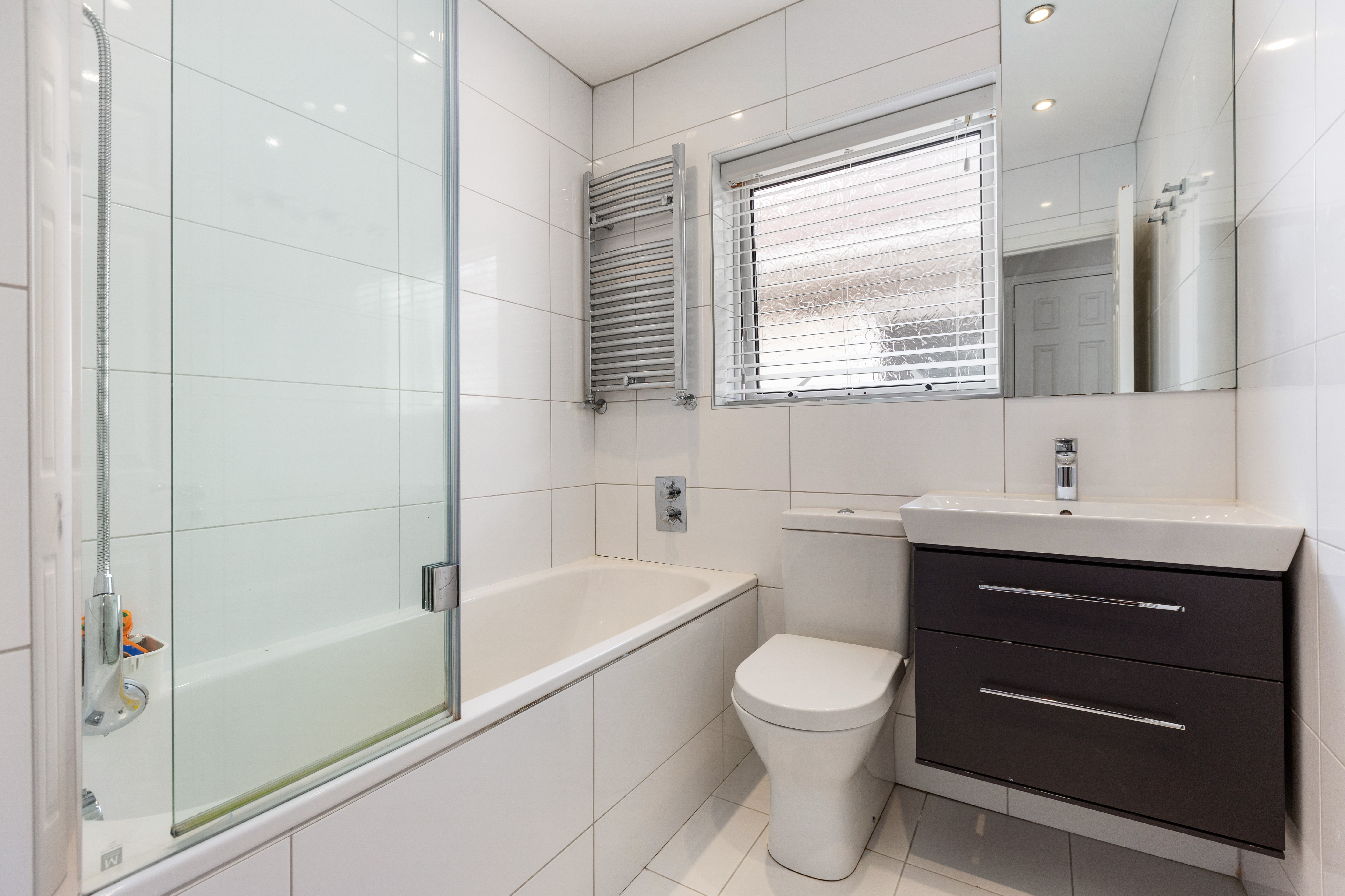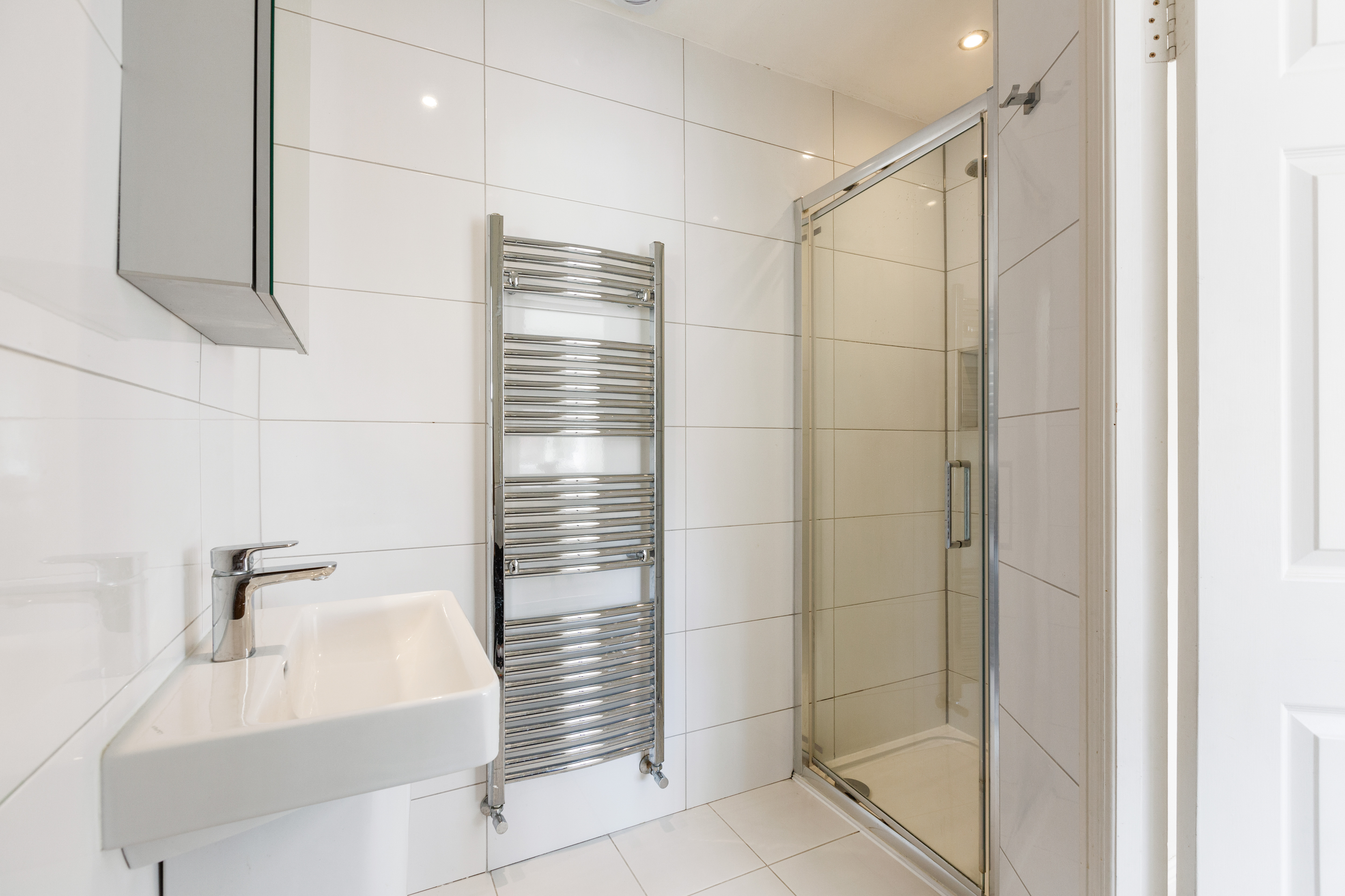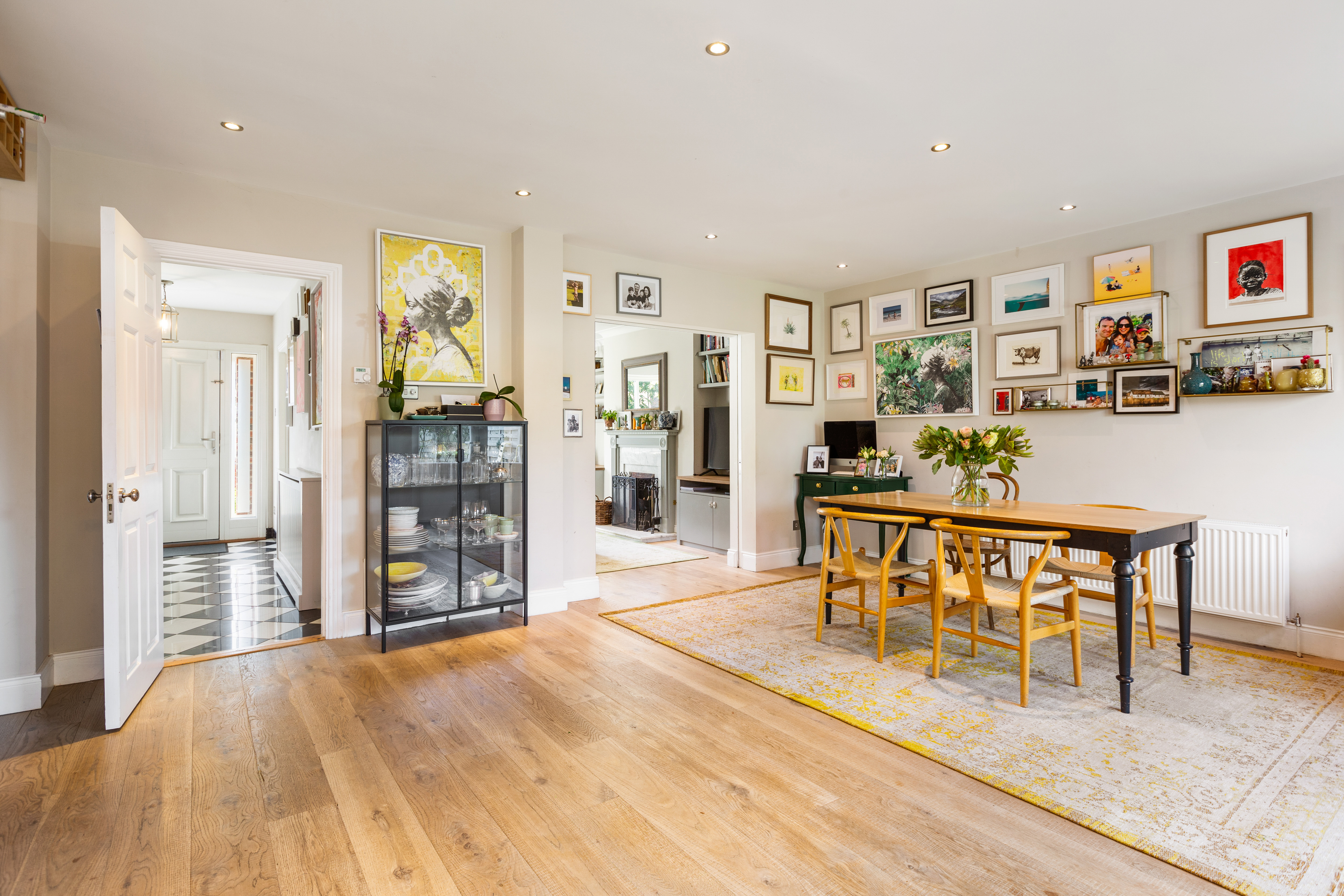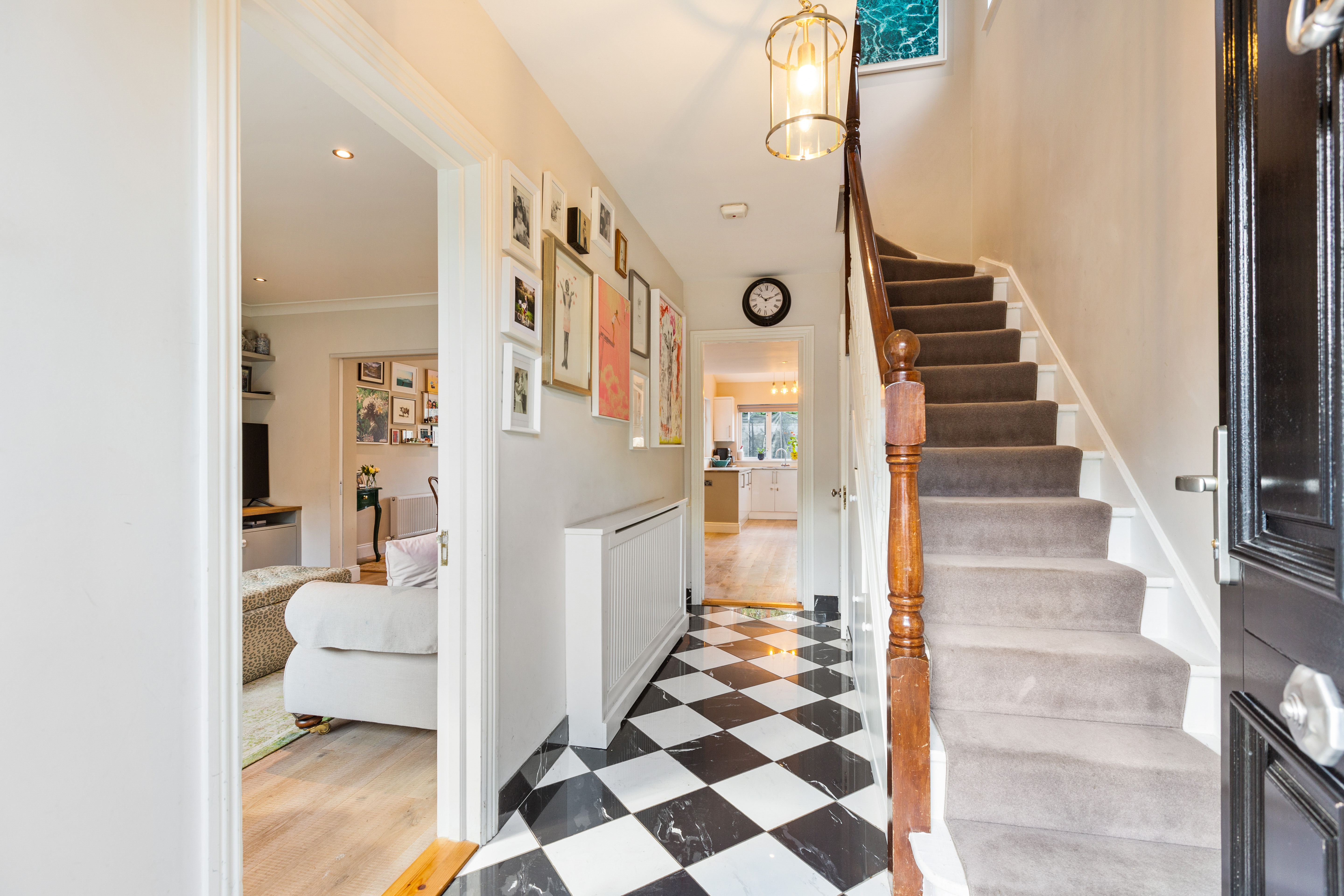 The accommodation is bright, stylish and thoughtfully laid out. Upon entering, a welcoming hallway with classic black and white tiled flooring leads to a spacious living room to the front, featuring bespoke fitted joinery, a fireplace with carved timber surround and marble inset, and pocket doors opening into a stunning open plan kitchen/living/dining room. This expansive space stretches across the width of the property and enjoys wonderful natural light, with French doors opening onto the sun filled rear garden. A guest w.c. completes the ground floor.