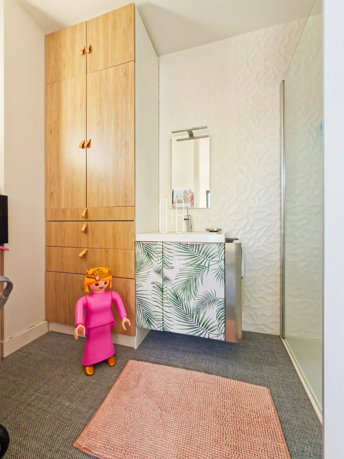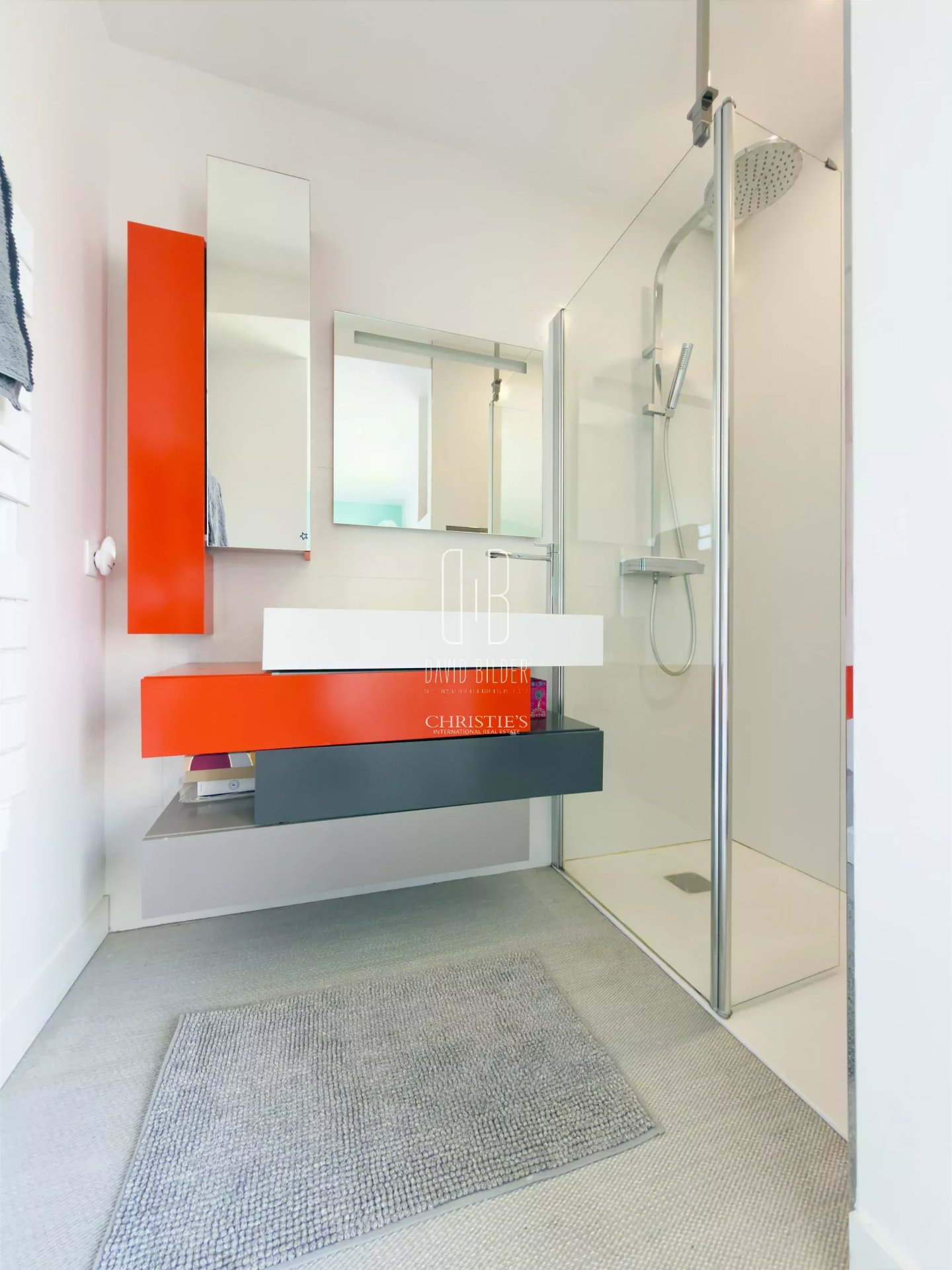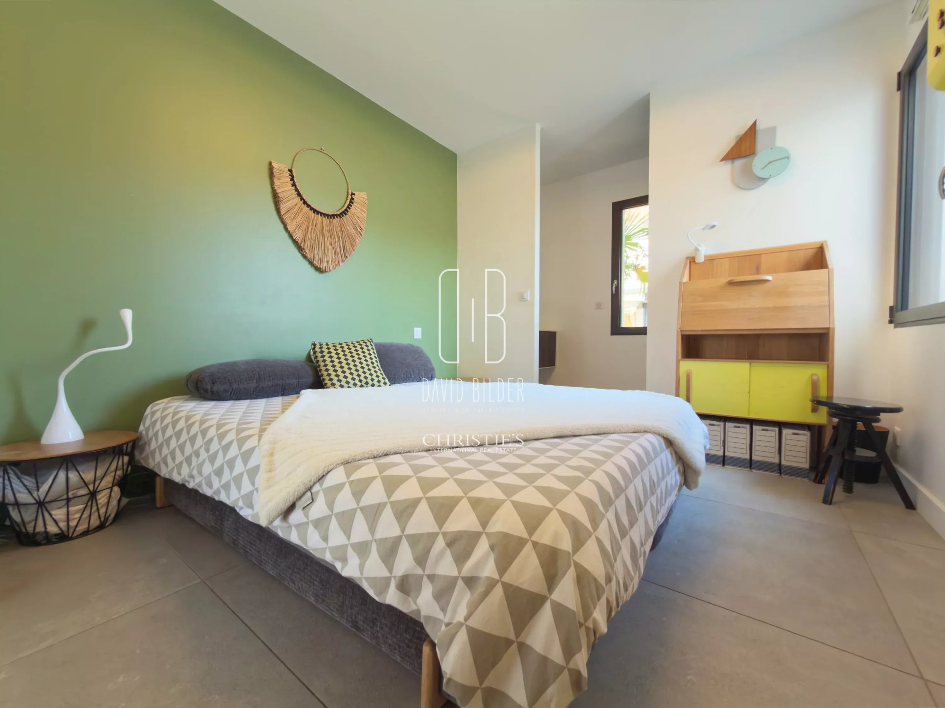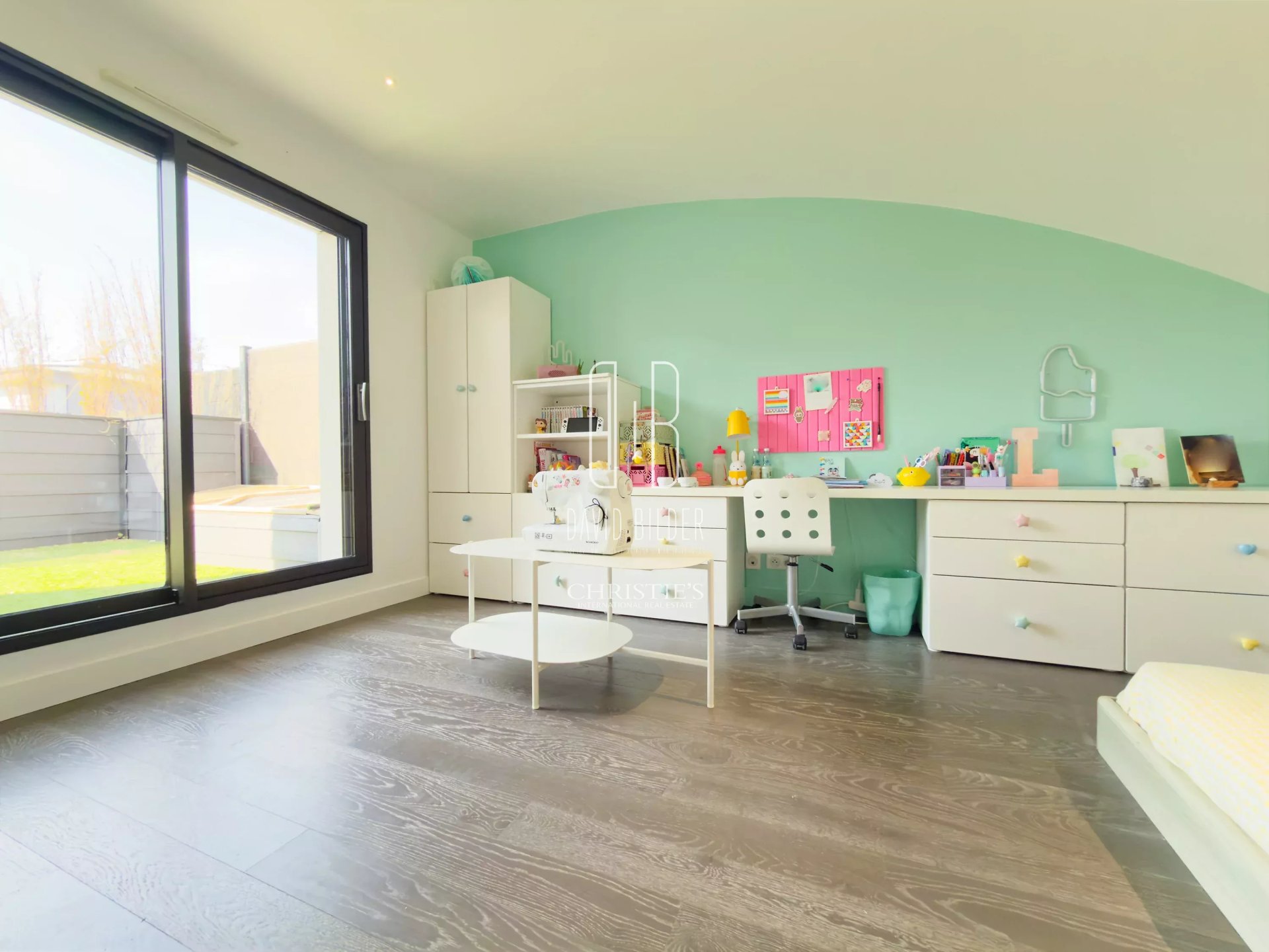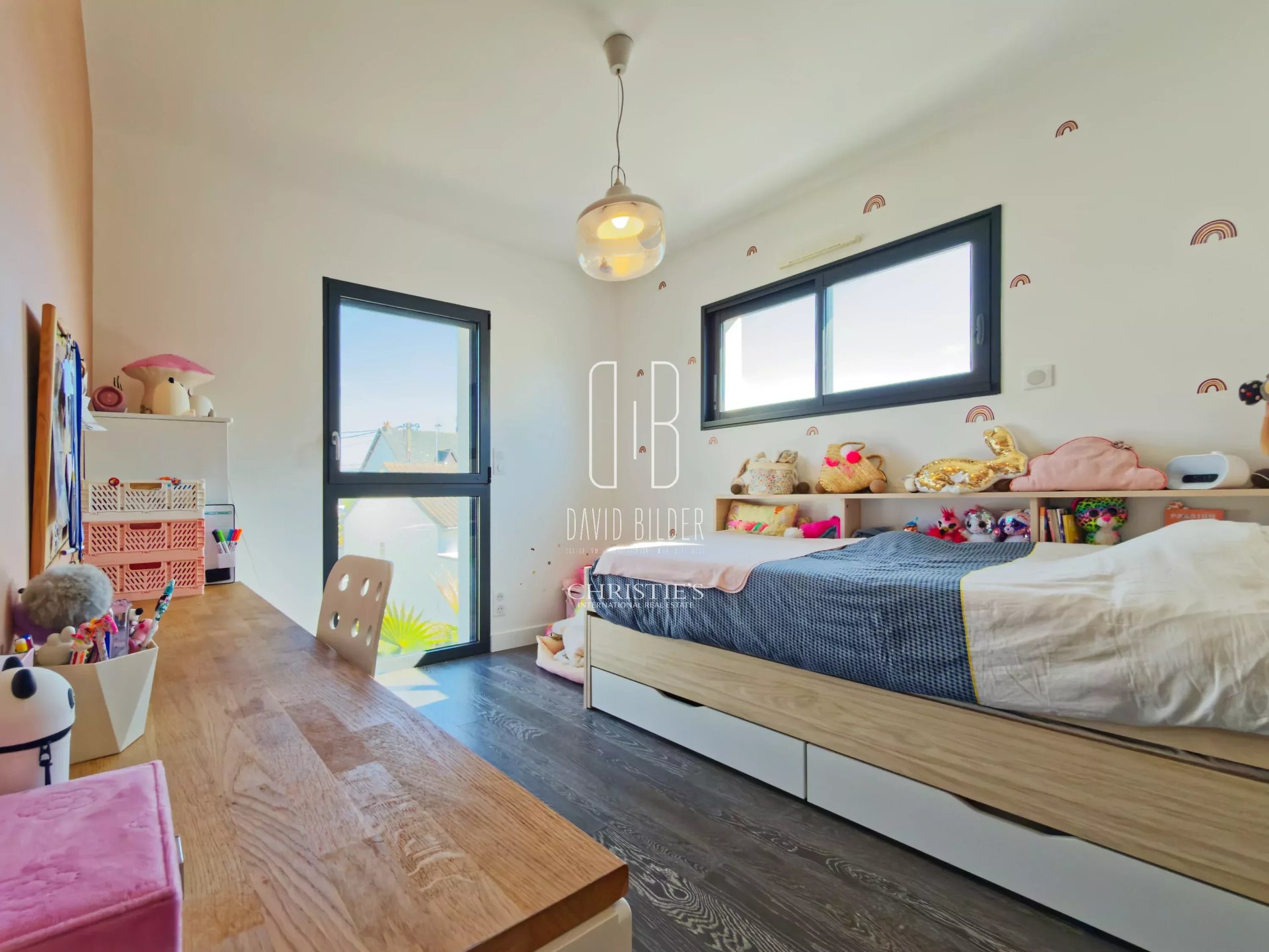 Au rez-de-chaussée, un grand espace de vie baigné de lumière s'ouvre sur la terrasse et la piscine, avec une cuisine équipée haut de gamme. Une chambre avec salle d'eau privative complète ce niveau, ainsi qu'une salle de sport vue sur jardin et une buanderie.