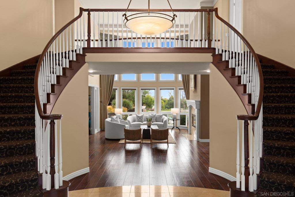 Stunning and serene, this two-acre estate is tucked at the end of a private cul-de-sac in Knightsbridge Country Estates, one of Olivenhain's premier gated communities. With sweeping southwest views, this 5,500+ sq ft residence embodies quiet luxury through timeless design, classic architecture, and thoughtfully designed living spaces. A dramatic dual staircase entry opens to a soaring, light-filled living room with expansive windows that capture the home's southern exposure and surrounding landscape. The main level offers exceptional versatility, featuring a guest suite with private entrance and bath, ideal for multigenerational living or a home office, along with formal living and dining rooms, a spacious family room, and a custom wine room. The gourmet kitchen is equipped with stainless steel appliances, a large center island, and a butler's pantry, seamlessly connecting to the family room and outdoor BBQ area for effortless entertaining. Upstairs, the primary suite offers a private view balcony, walk-in closet, and a luxurious dual-sided bath. Three additional bedrooms and a flexible bonus room provide space for a variety of lifestyles. The grounds offer a resort-style setting with a pool, expansive outdoor areas, and two detached structures. An oversized four-car garage, owned solar, and full city services complete this exceptional property at an exceptional price! Stunning and serene, this two-acre estate is tucked at the end of a private cul-de-sac in Knightsbridge Country Estates, one of Olivenhain's premier gated communities. With sweeping southwest views, this 5,500+ sq ft residence embodies quiet luxury through timeless design, classic architecture, and thoughtfully designed living spaces. A dramatic dual staircase entry sets the tone, opening to a soaring, light-filled living room with expansive windows that capture the home's southern exposure and surrounding landscape. The main level offers exceptional versatility, featuring a guest suite with private entrance and bath, ideal for multigenerational living or a home office, along with formal living and dining rooms, a spacious family room, and a custom wine room. The gourmet kitchen is designed for both function and connection, complete with stainless steel appliances, a large center island, and a butler's pantry, seamlessly opening to the family room and outdoor BBQ area for effortless entertaining. Upstairs, the primary suite is a private retreat with a view balcony, a walk-in closet, and a luxurious dual-sided bath. Three additional bedrooms and a flexible bonus room provide space for a variety of lifestyles. The grounds offer a resort-style setting with a sparkling pool, expansive outdoor areas, and two detached studio or gym structures. An oversized four-car garage, owned solar, and full city services, including sewer, water, and maintained streets, complete this exceptional property at an exceptional price. A rare opportunity to enjoy scale, privacy, and refined living in one of Olivenhain's most sought-after gated communities.