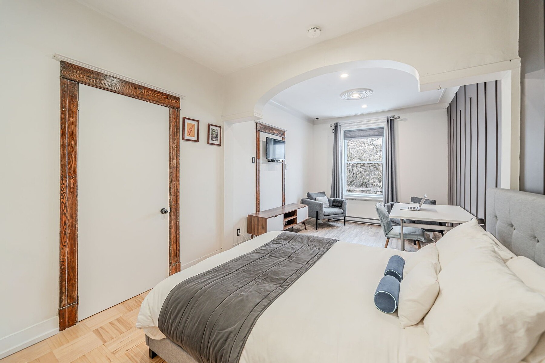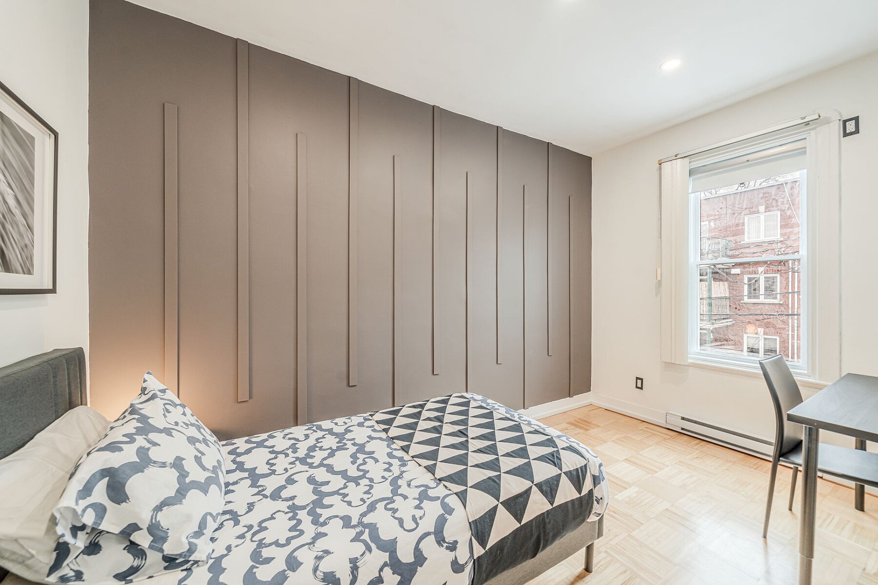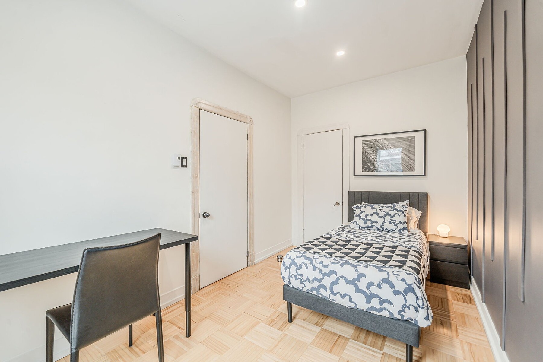 Furnished apartment for rent in Verdun featuring two bedrooms, a kitchen with a dining area, and one bathroom. The primary bedroom is very large. Located across from a park, the unit offers a pleasant setting while being only a two-minute walk from Verdun metro station and close to major roadways. The area is sought after for its access to the St. Lawrence River, bike paths, Verdun Beach, as well as Wellington Street, within walking distance, offering a variety of shops, cafés and restaurants.