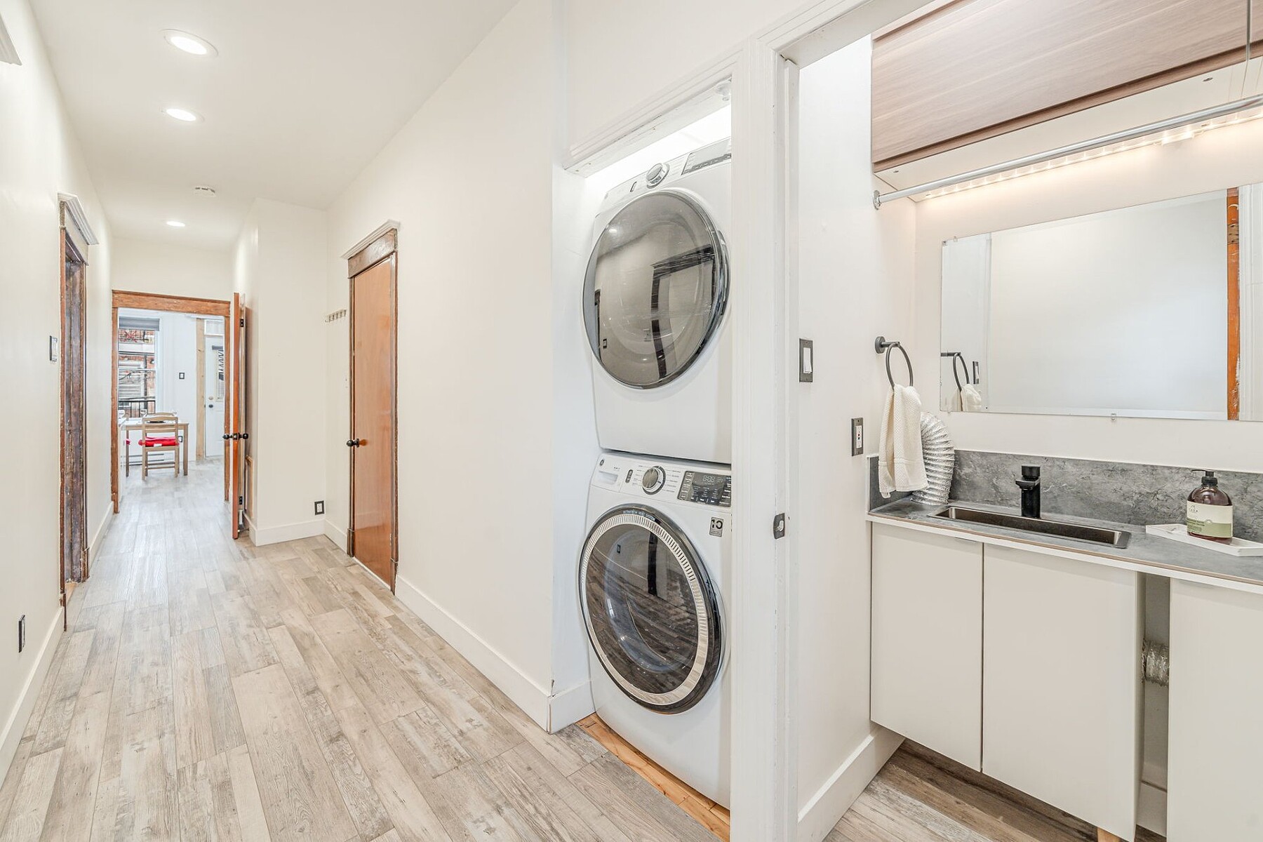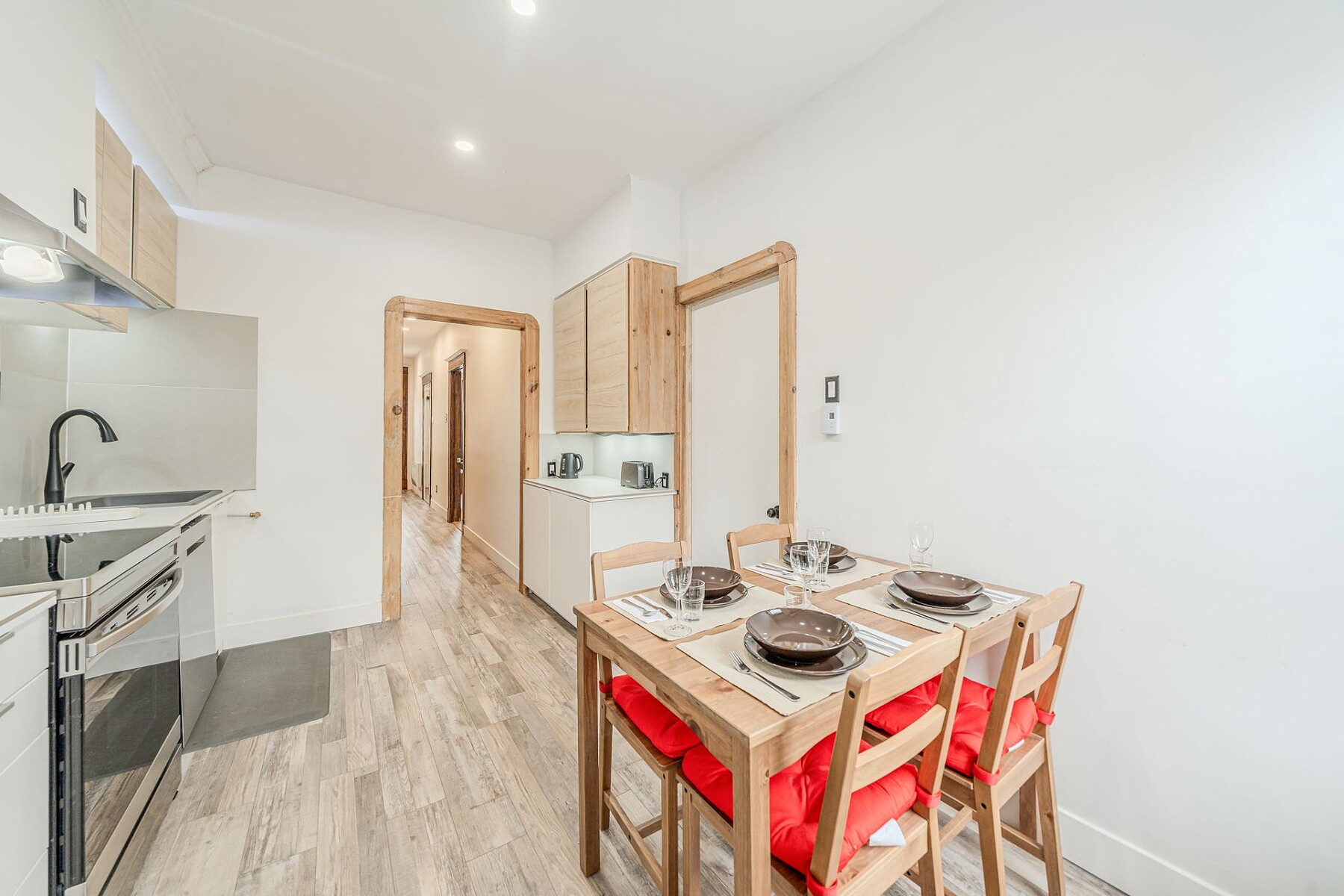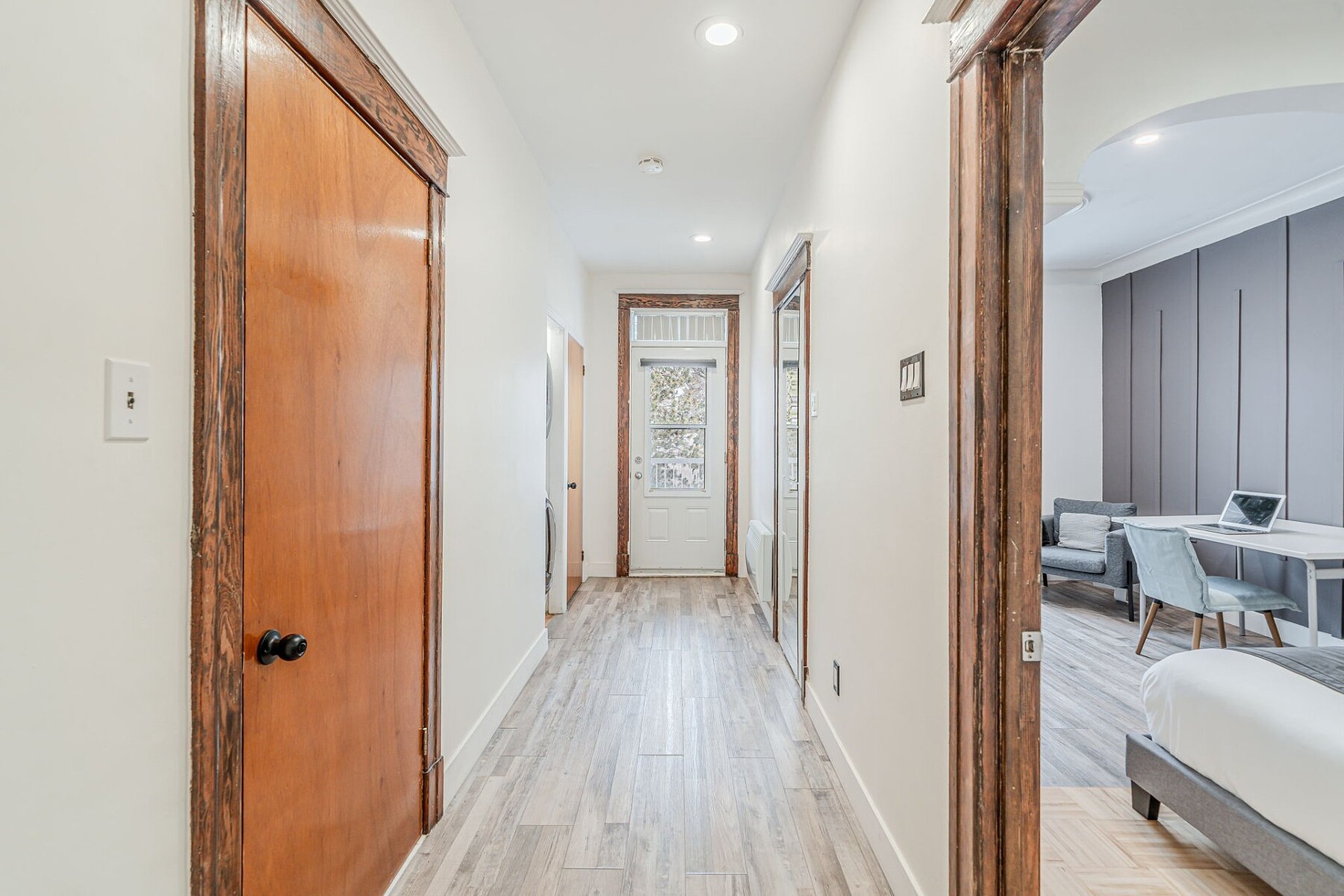 Furnished apartment for rent in Verdun featuring two bedrooms, a kitchen with a dining area, and one bathroom. The primary bedroom is very large. Located across from a park, the unit offers a pleasant setting while being only a two-minute walk from Verdun metro station and close to major roadways. The area is sought after for its access to the St. Lawrence River, bike paths, Verdun Beach, as well as Wellington Street, within walking distance, offering a variety of shops, cafés and restaurants.