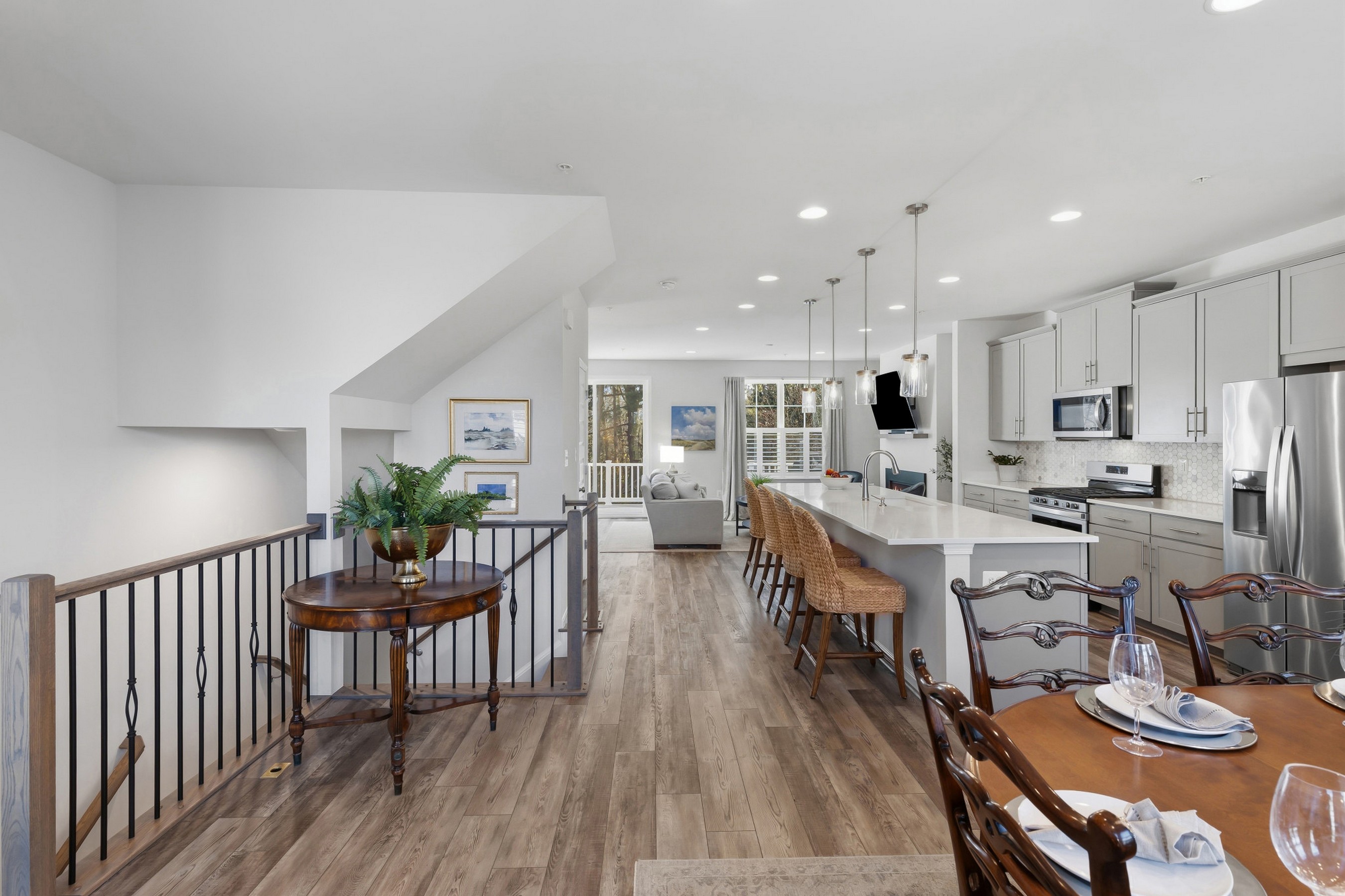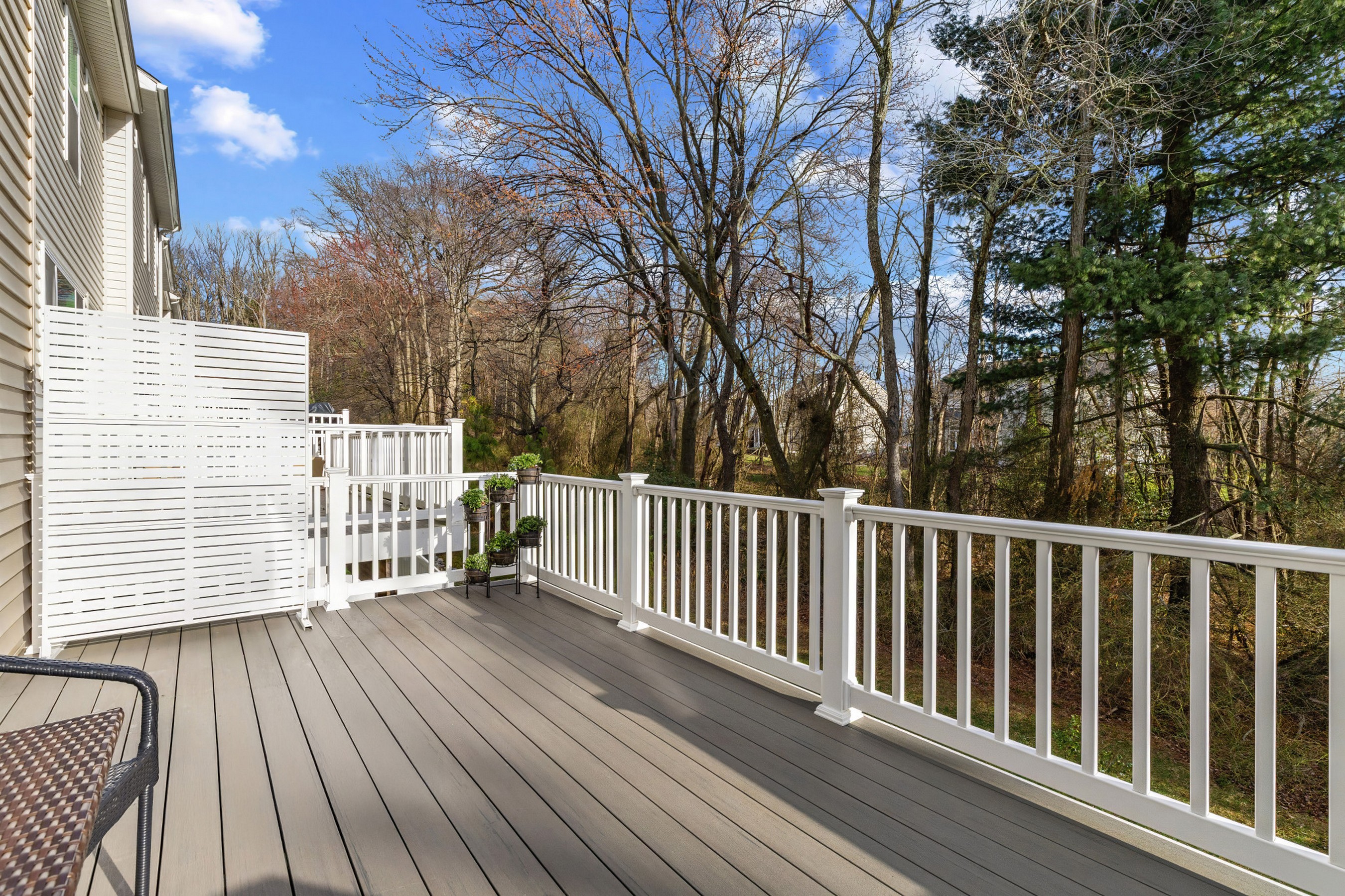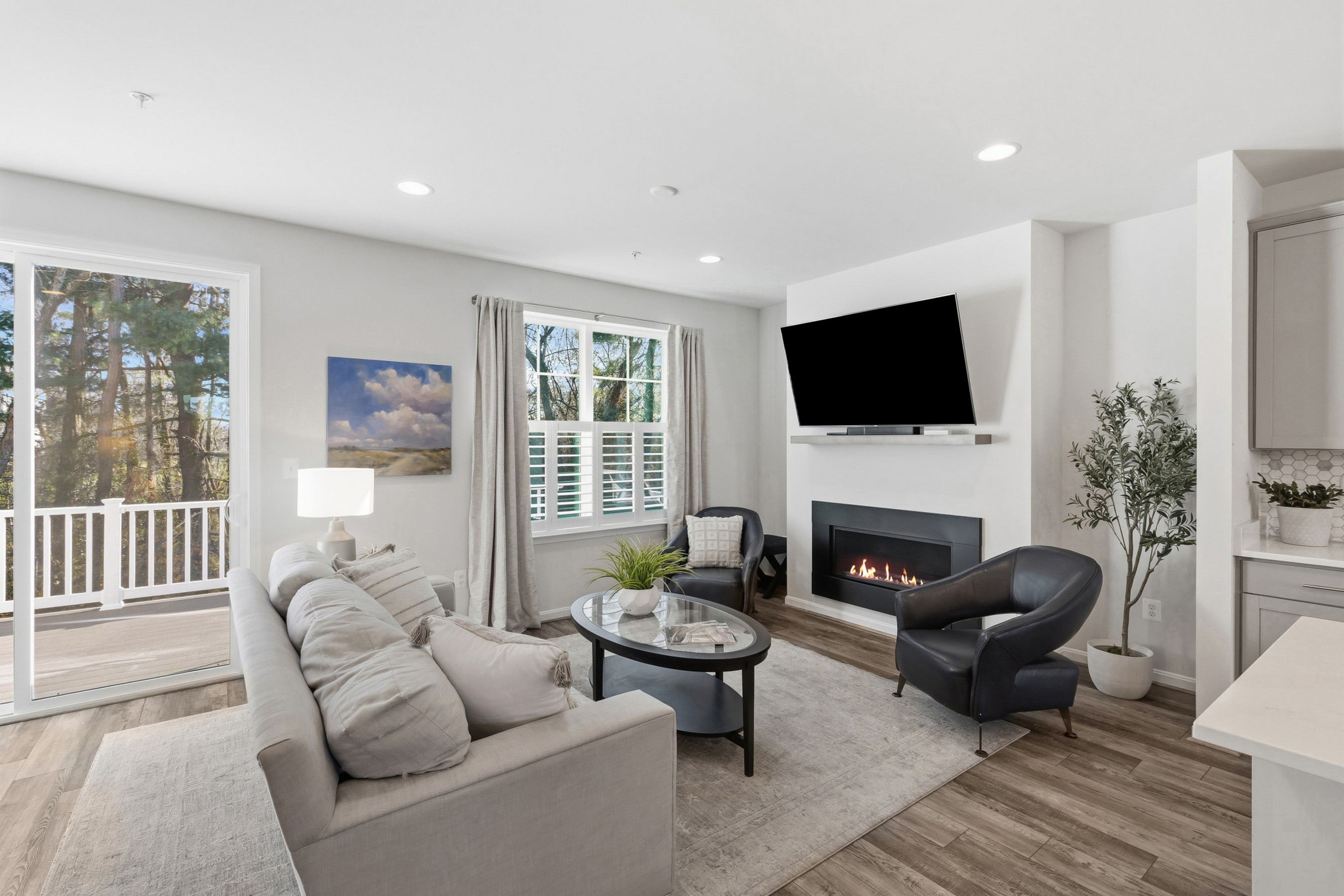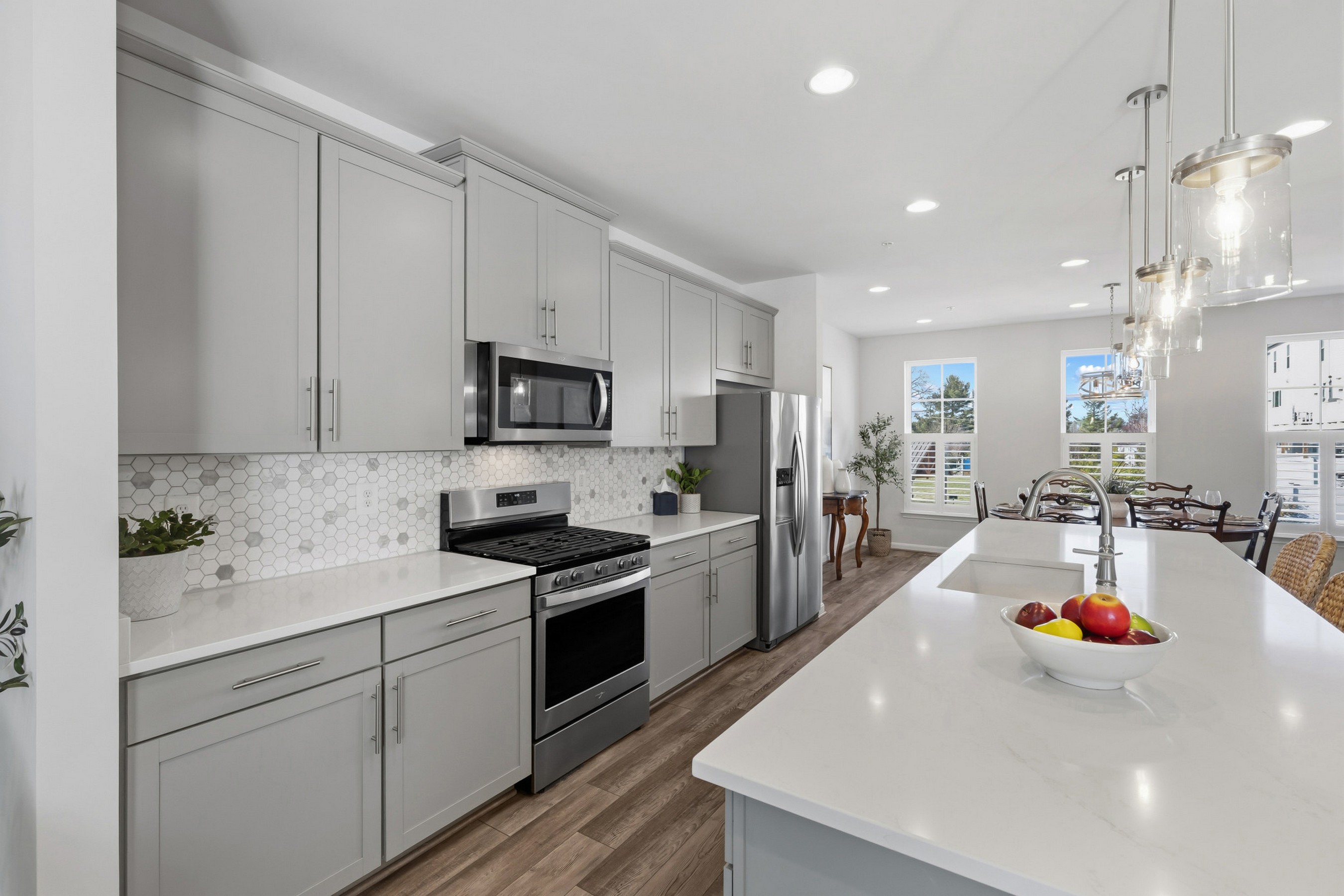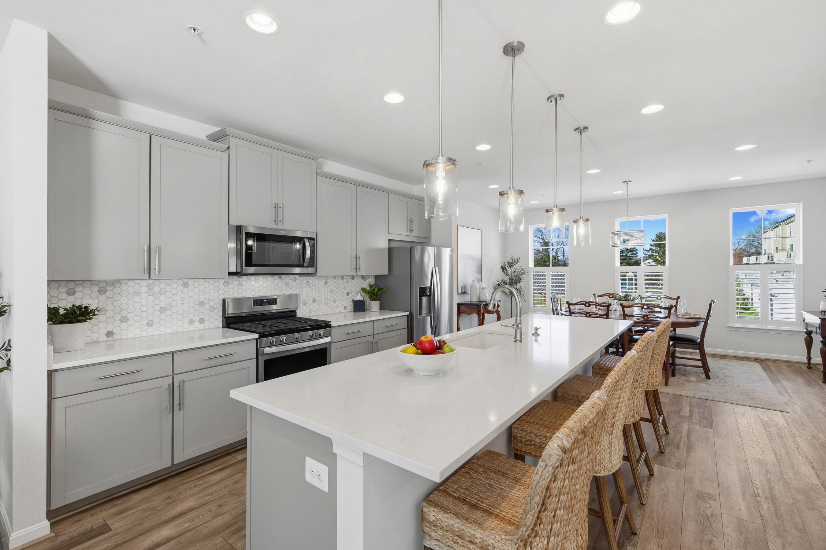 Welcome to 597 Cross Chase Drive in sought-after Watson's Glen, where style, space, and convenience come together beautifully. This exceptional townhome is situated in one of the best locations within the community and features a rare model home floor plan with an open and airy main level designed for both everyday living and effortless entertaining. The heart of the home is the bright, well-appointed kitchen, complete with quartz countertops, stainless steel appliances including a gas range and built-in microwave, a deep trough-style sink, and an oversized island with seating. The kitchen flows seamlessly into the dining area and spacious living room, where a cozy fireplace creates a warm focal point. Glass doors lead to the low-maintenance deck, offering an ideal setting for indoor-outdoor living. The space is further enhanced by recessed lighting, high ceilings, and interior wooden shutters throughout. A convenient half bath completes this level. Upstairs, you'll find three generously sized bedrooms and two full baths, along with a convenient upper-level laundry area. The primary suite offers a peaceful retreat with abundant natural light, a tray ceiling, a walk-in closet, and a beautifully finished en-suite bath featuring a double vanity and oversized tiled shower. The entry level includes a spacious finished rec room, ideal for a home office, gym, or additional living space, with direct access to a patio and the fully fenced backyard. Backing to trees, this home offers a rare sense of privacy. A two-car garage with additional storage and driveway parking adds to the home's appeal. Enjoy outdoor living on the low-maintenance deck overlooking the wooded backdrop. Watson's Glen offers wonderful community amenities including a playground, pavilion, picnic area, and walking paths, with easy access to Routes 97 and 100, BWI Airport, Fort Meade, and nearby shopping and dining.