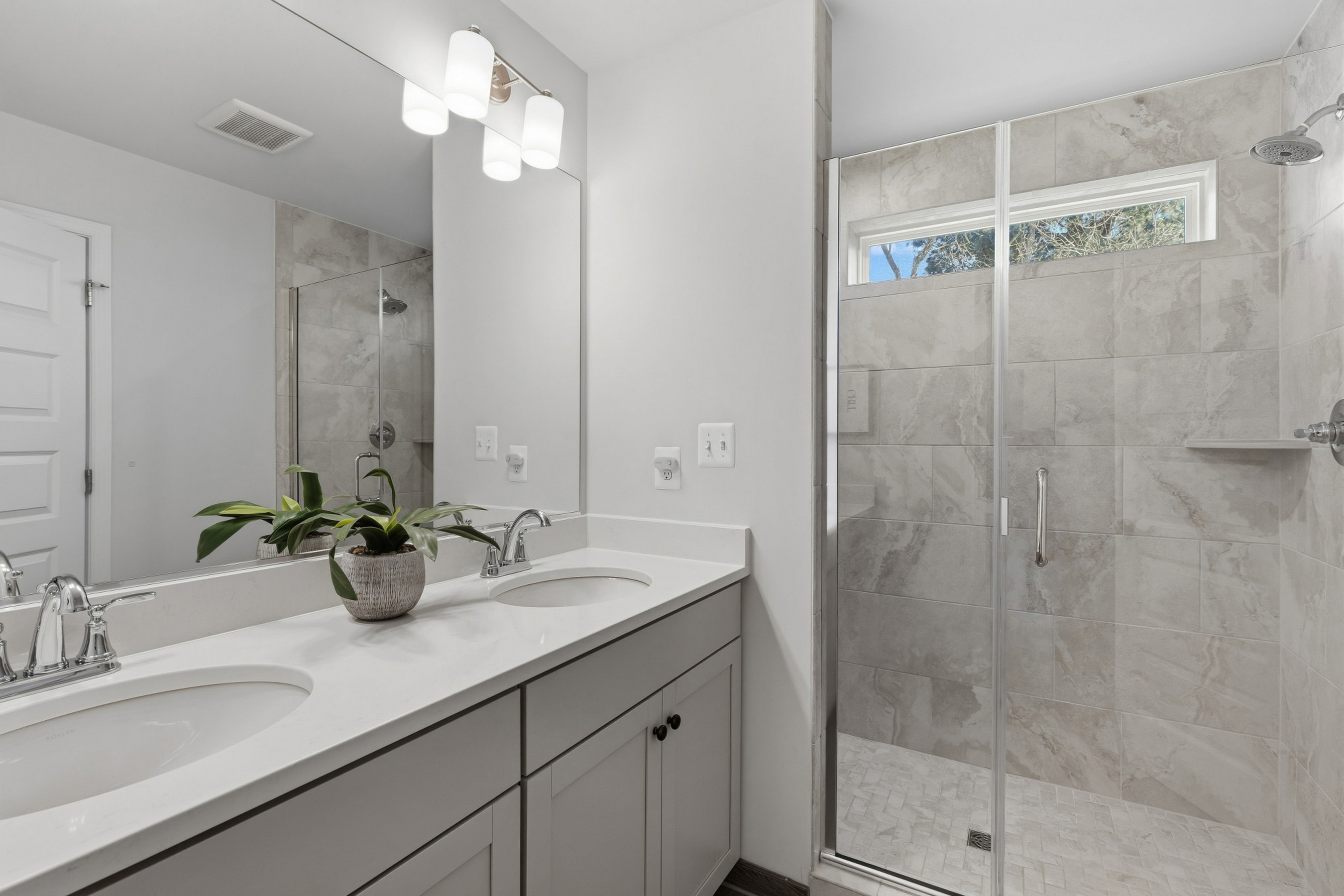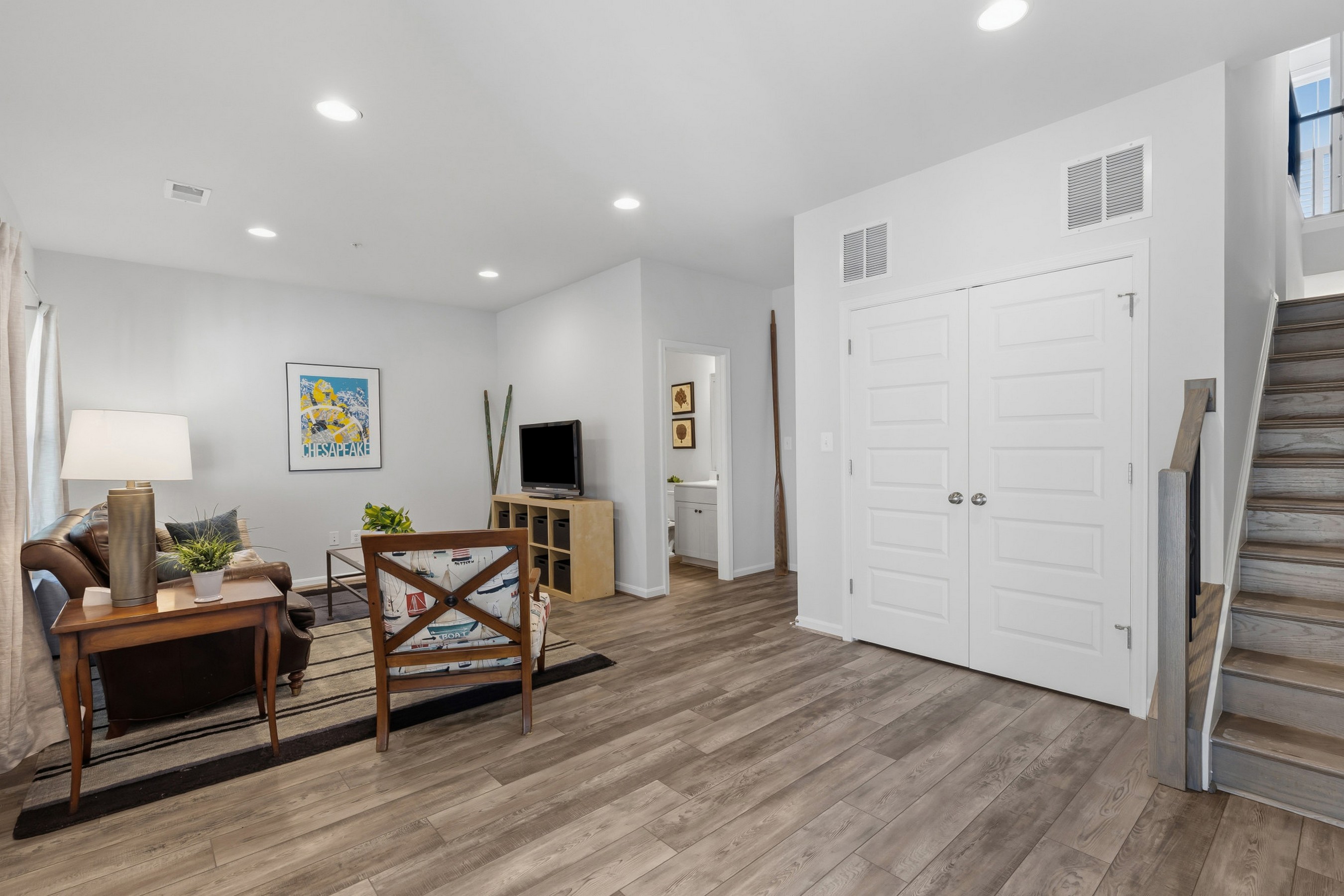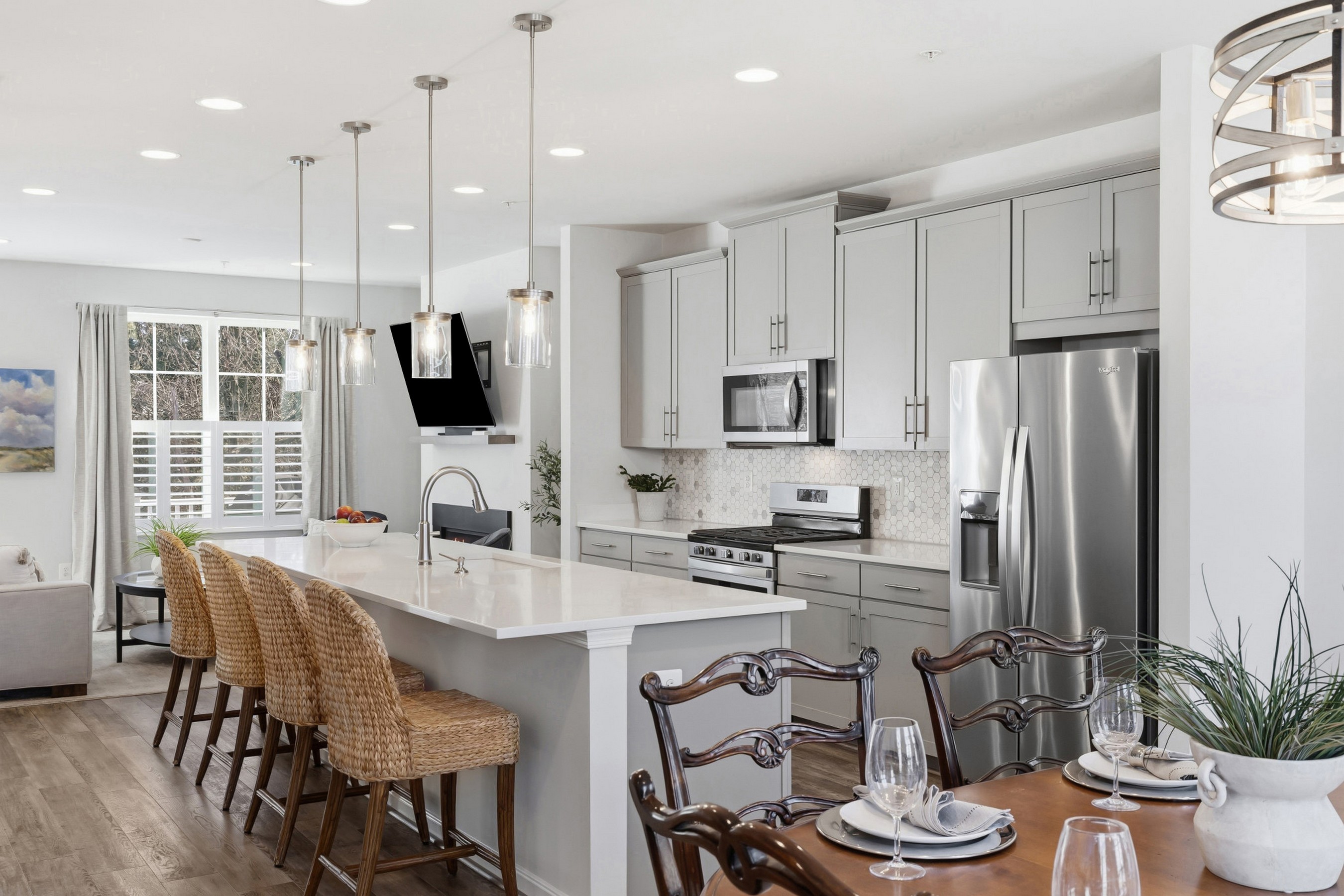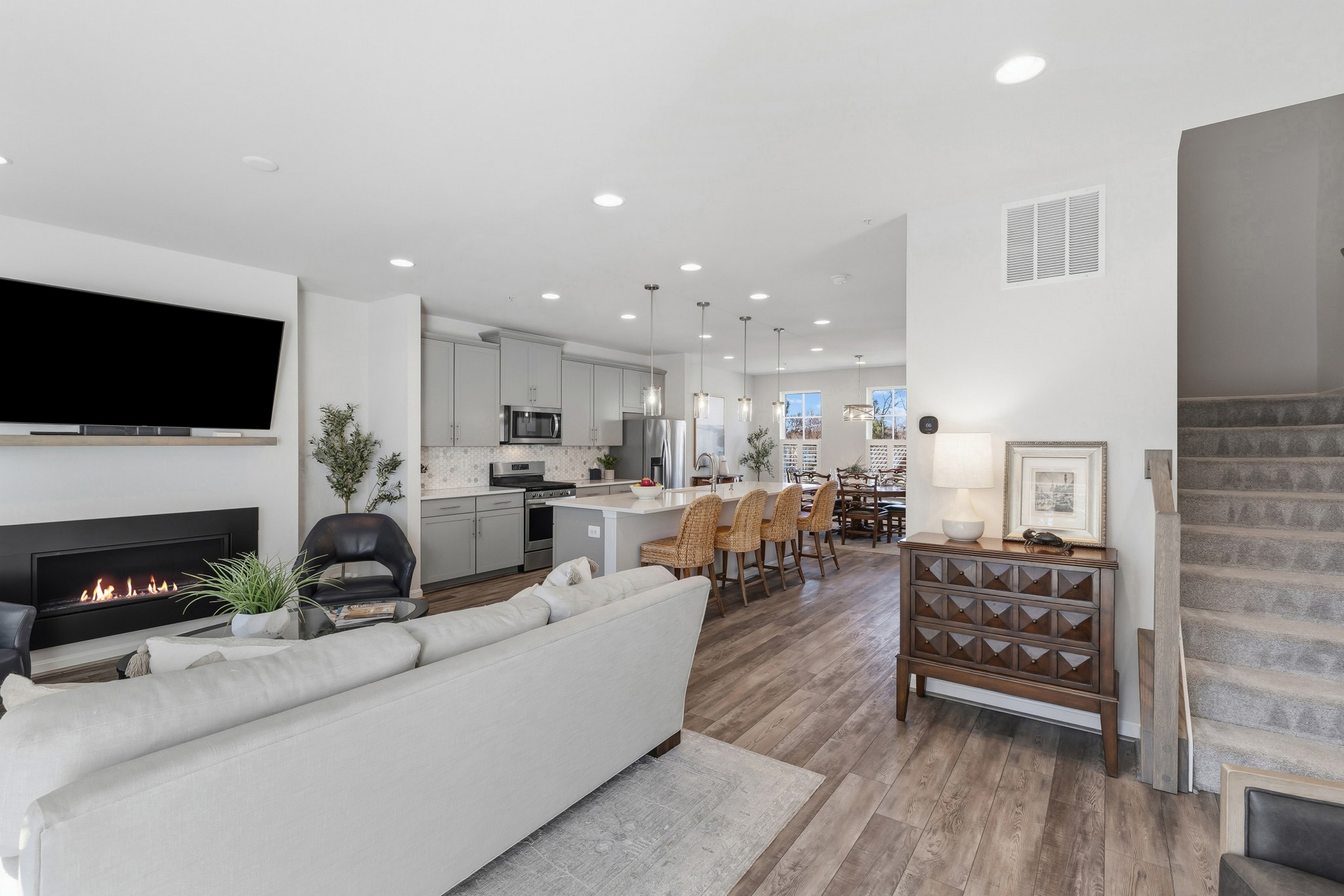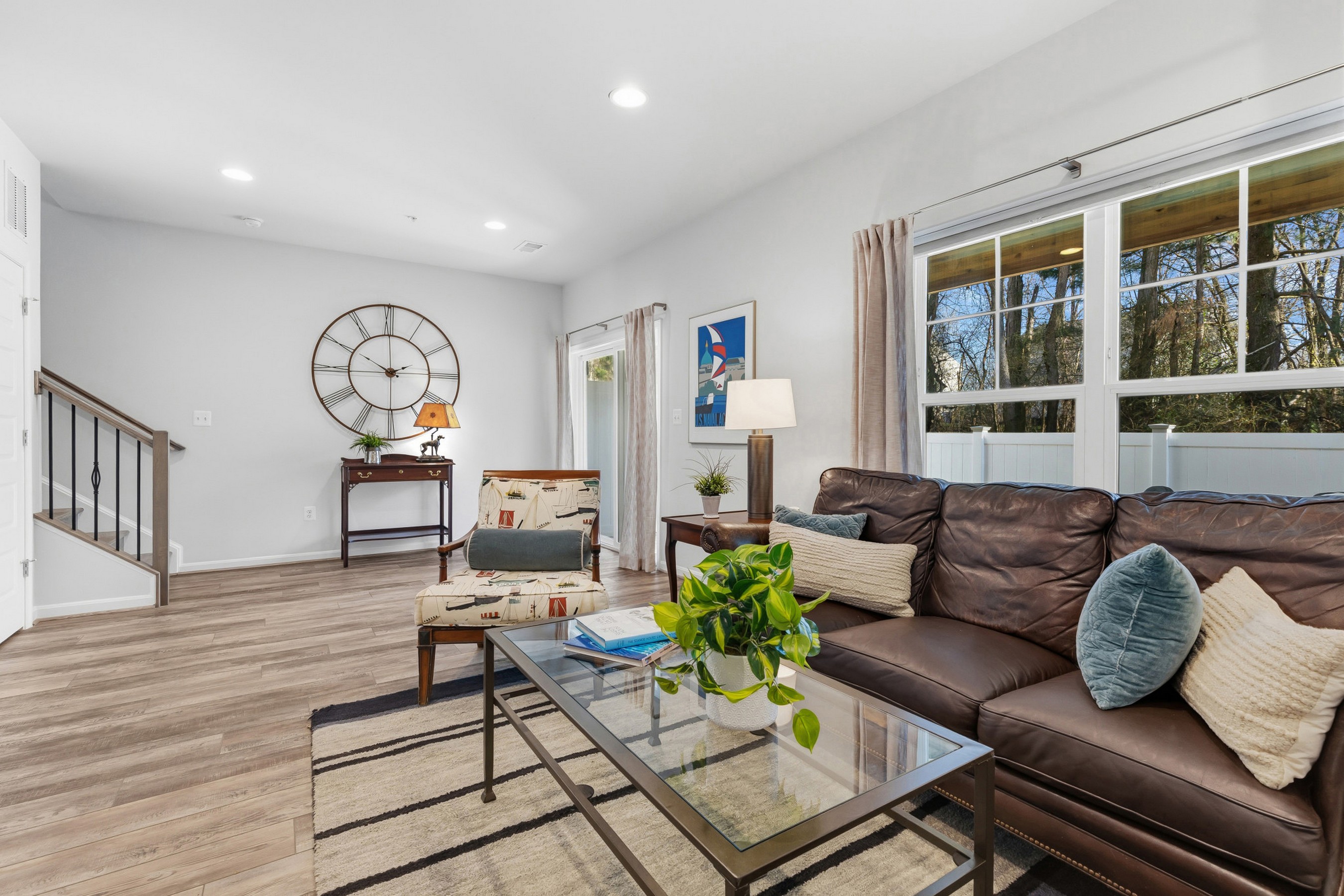 Welcome to 597 Cross Chase Drive in sought-after Watson's Glen, where style, space, and convenience come together beautifully. This exceptional townhome is situated in one of the best locations within the community and features a rare model home floor plan with an open and airy main level designed for both everyday living and effortless entertaining. The heart of the home is the bright, well-appointed kitchen, complete with quartz countertops, stainless steel appliances including a gas range and built-in microwave, a deep trough-style sink, and an oversized island with seating. The kitchen flows seamlessly into the dining area and spacious living room, where a cozy fireplace creates a warm focal point. Glass doors lead to the low-maintenance deck, offering an ideal setting for indoor-outdoor living. The space is further enhanced by recessed lighting, high ceilings, and interior wooden shutters throughout. A convenient half bath completes this level. Upstairs, you'll find three generously sized bedrooms and two full baths, along with a convenient upper-level laundry area. The primary suite offers a peaceful retreat with abundant natural light, a tray ceiling, a walk-in closet, and a beautifully finished en-suite bath featuring a double vanity and oversized tiled shower. The entry level includes a spacious finished rec room, ideal for a home office, gym, or additional living space, with direct access to a patio and the fully fenced backyard. Backing to trees, this home offers a rare sense of privacy. A two-car garage with additional storage and driveway parking adds to the home's appeal. Enjoy outdoor living on the low-maintenance deck overlooking the wooded backdrop. Watson's Glen offers wonderful community amenities including a playground, pavilion, picnic area, and walking paths, with easy access to Routes 97 and 100, BWI Airport, Fort Meade, and nearby shopping and dining.