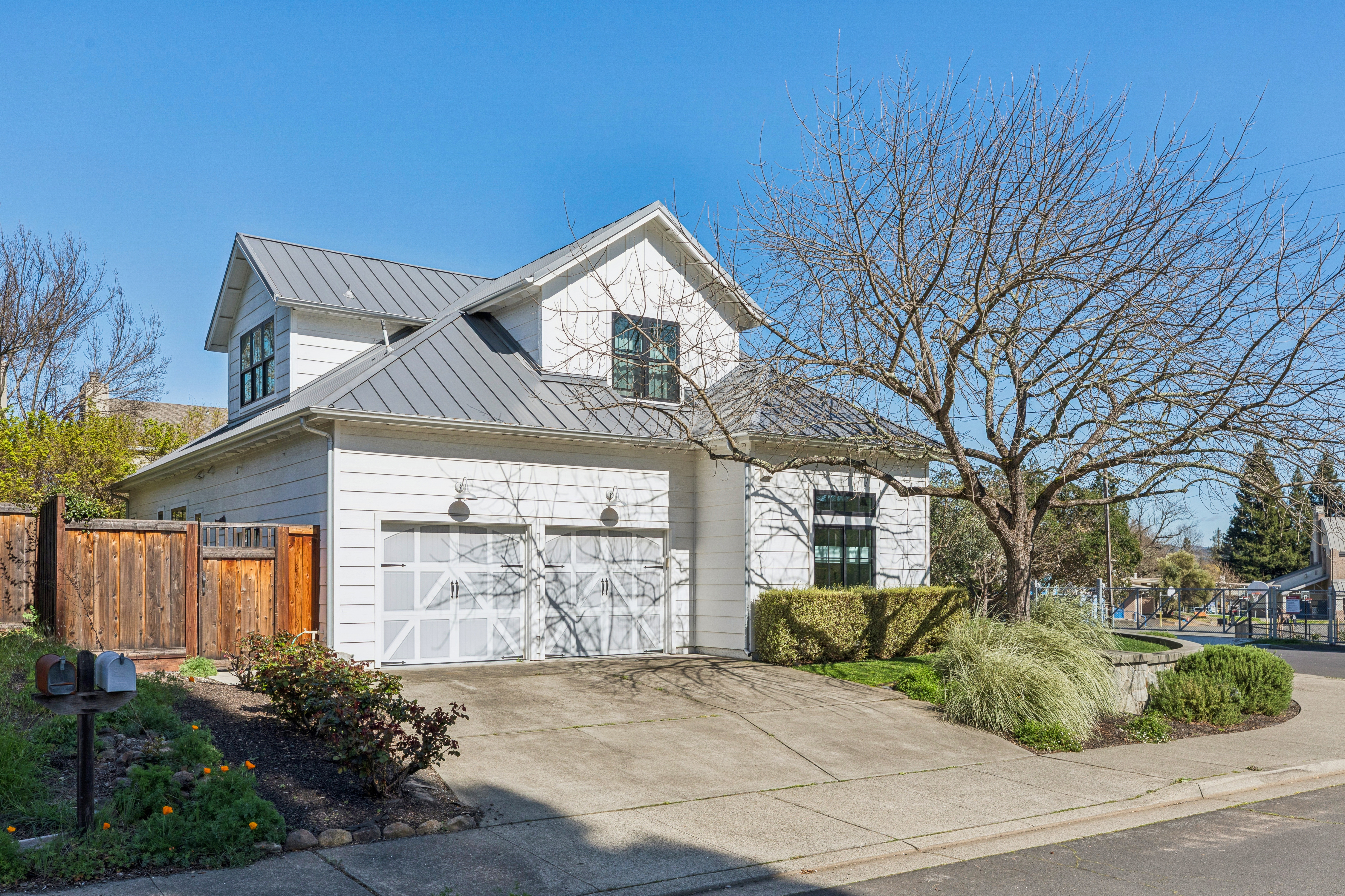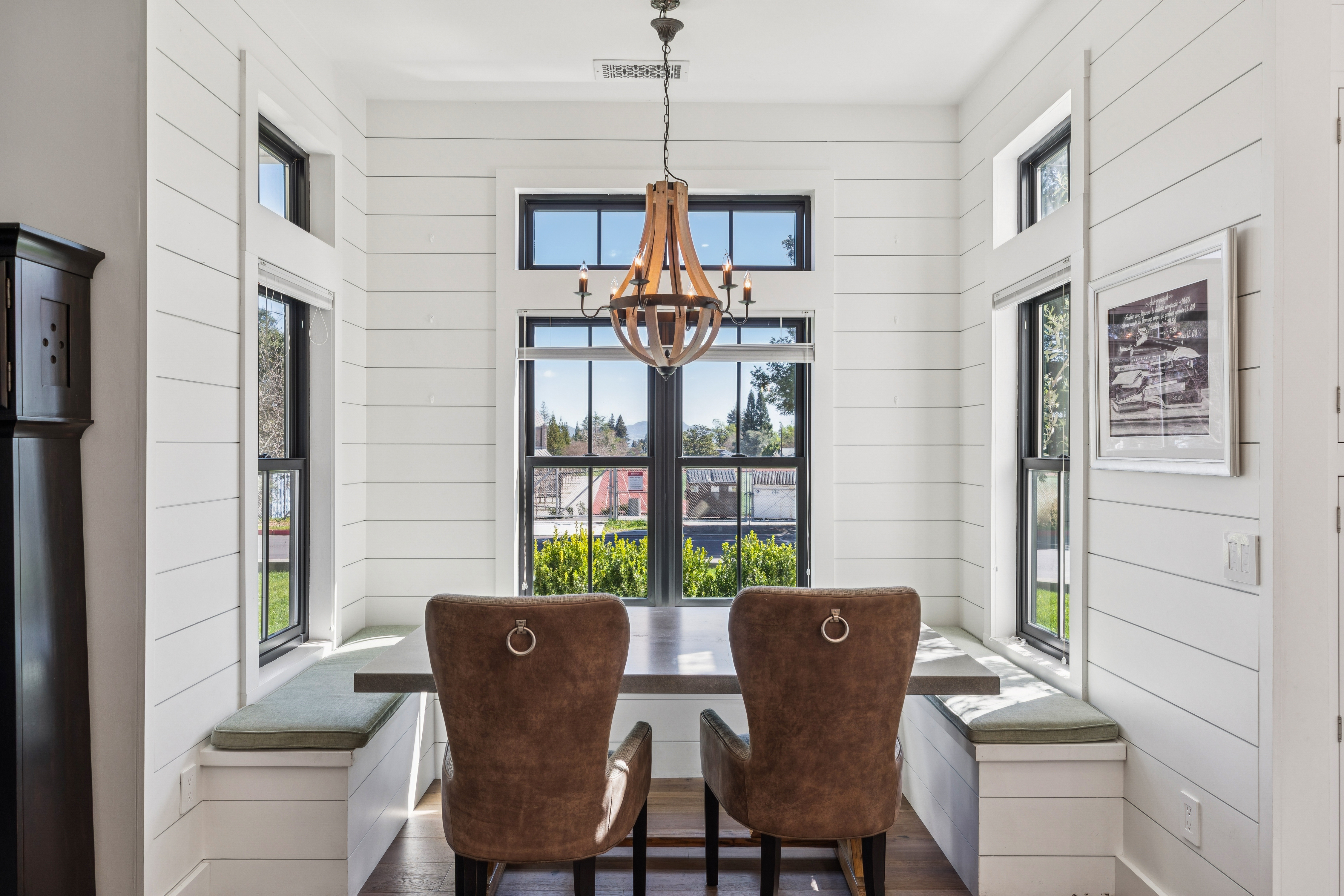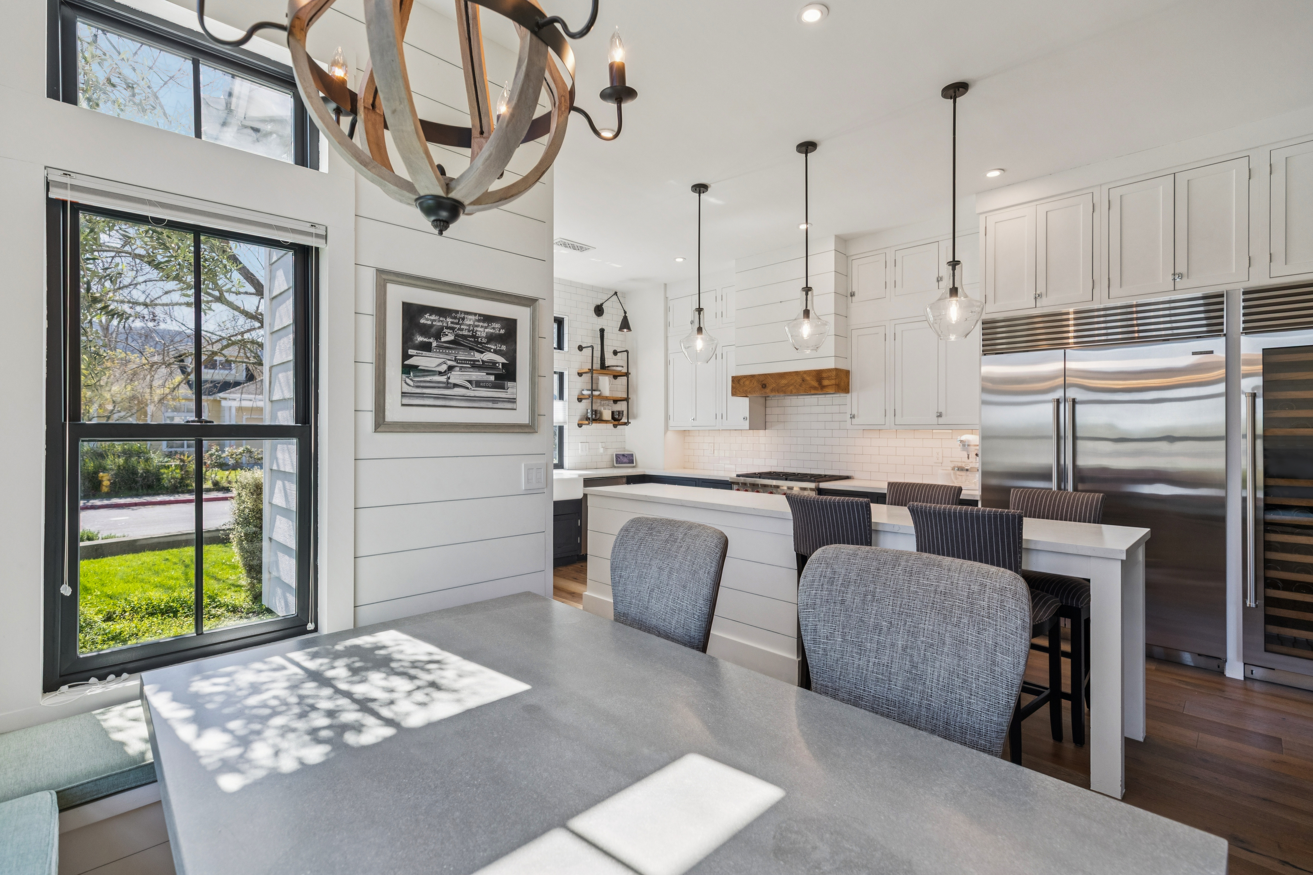 Light-filled and beautifully remodeled, this modern farmhouse is ideally located on St Helena's sought-after west side and features a desirable open-concept floorplan. Thoughtful architectural details are showcased throughout, including hardwood floors, elevated and vaulted ceilings, shiplap walls, transom windows, and board-and-batten detailing. Chef's kitchen is designed for both style and function, offering a center island with counter seating, Wolf six-burner range, Sub-Zero refrigerator and wine cooler, farmhouse sink, walk-in pantry, and charming dining alcove with banquette seating. Spacious family room centers around a gas log fireplace and opens seamlessly to the outdoor entertaining area with seating and dining areas, water feature, fruit trees and garden beds. First floor bedroom with ensuite bath features French doors that provide direct access to outdoor living spaces. Primary ensuite offers vaulted ceilings, dual walk-in closets, and a spa-inspired bathroom complete with dual-sink vanity, slipper tub, and walk-in shower. Ideally situated just moments from the shops, restaurants, and tasting rooms along Main Street St Helena, this home blends comfort, style, and convenience in the heart of Napa Valley.