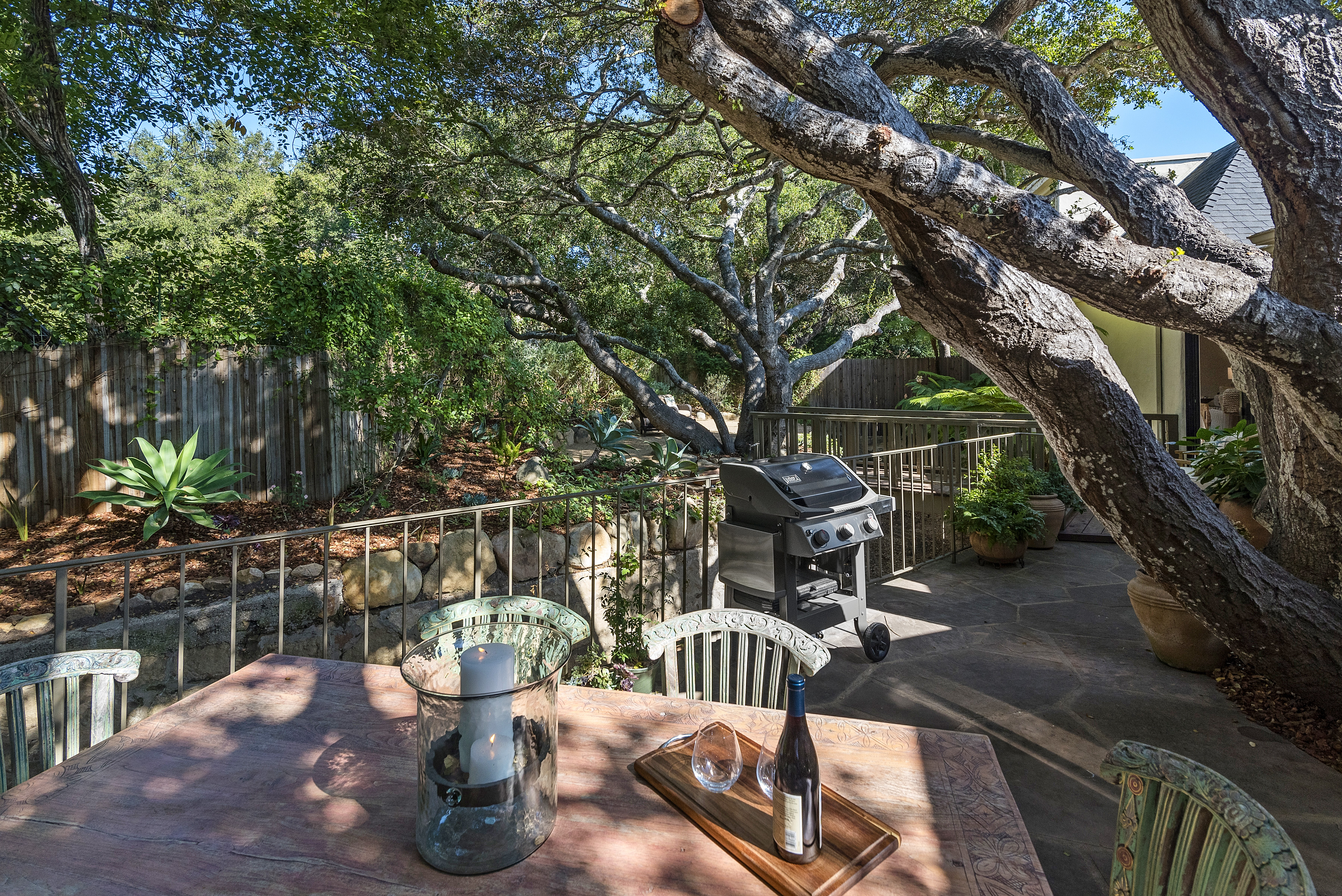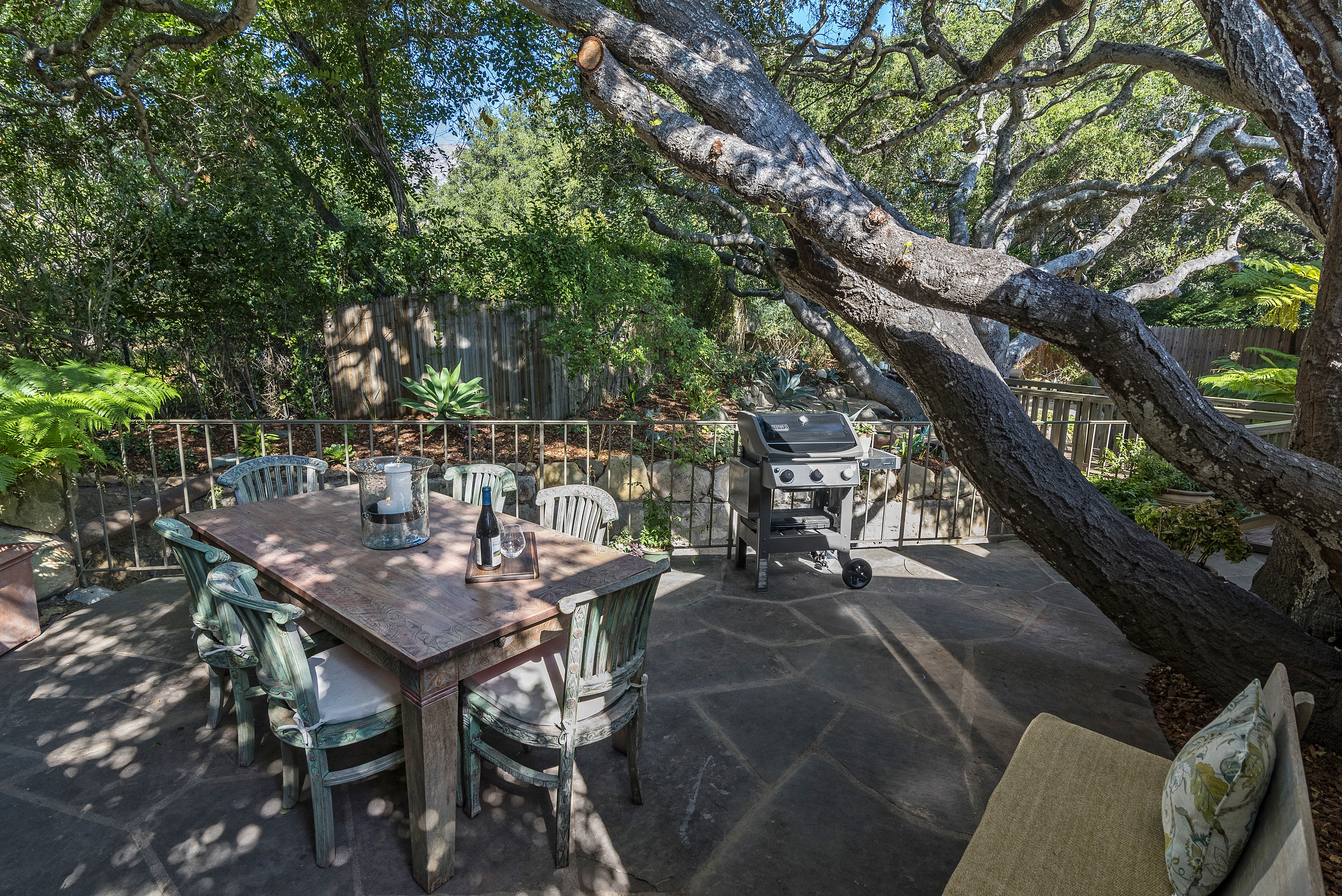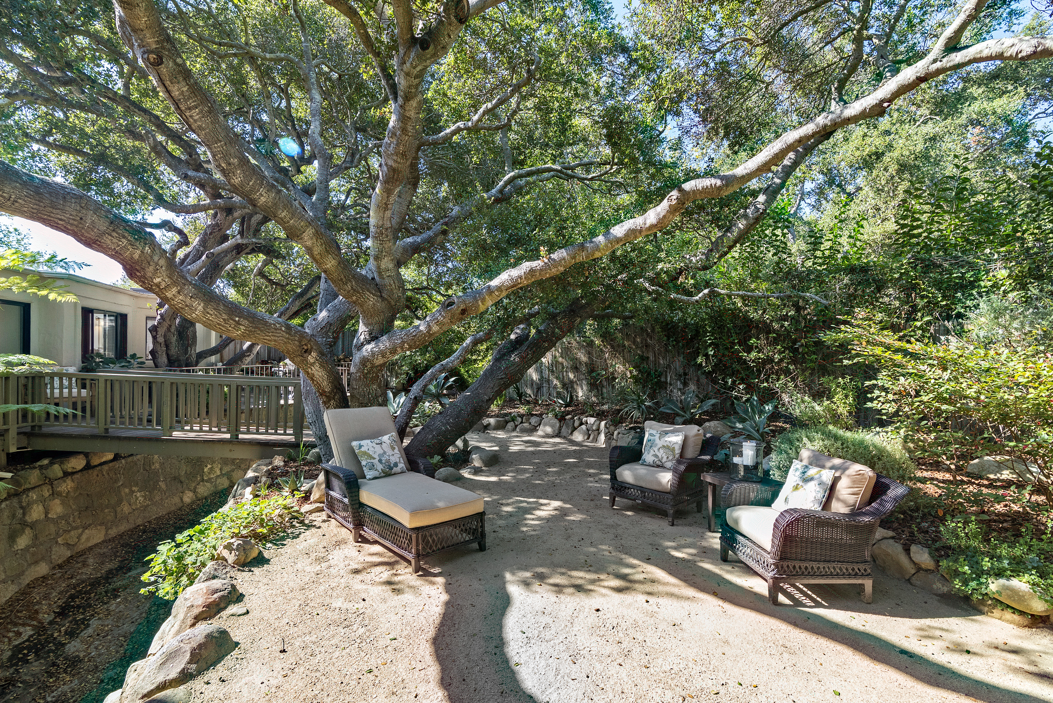 Furnished - 2 bd/2 bath townhome within a private oasis in the heart of the Upper Village. Kitchen has been updated in recent years with stainless steel appliances, open and spacious living space with walls of glass overlooking a serene Zen-like garden filled with graceful oaks and lush greenery. Ground floor primary suite with king bed and updated bathroom; lovely 2nd bedroom suite upstairs with sitting room and bath. Peaceful walled entry courtyard and abundant natural light. Equipped with air conditioning for added comfort during hot days. Close to all of the Upper Village amenities. Summer/ Rates may apply for short term monthly stays. Seeking 3+ month lease