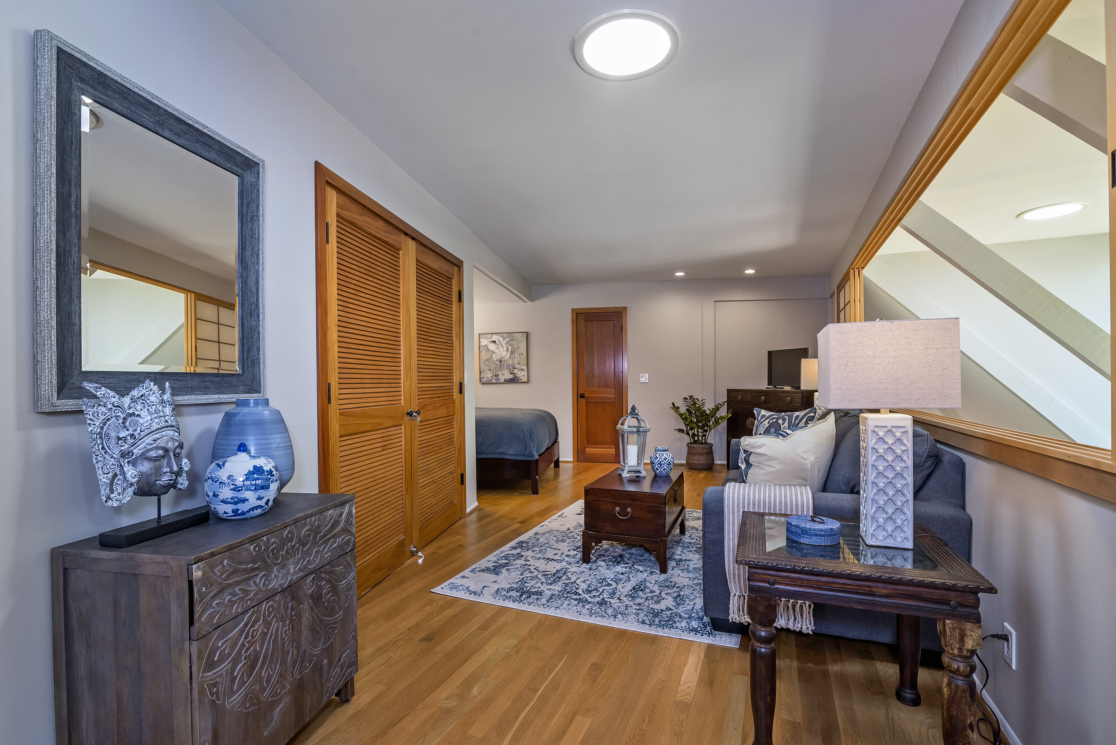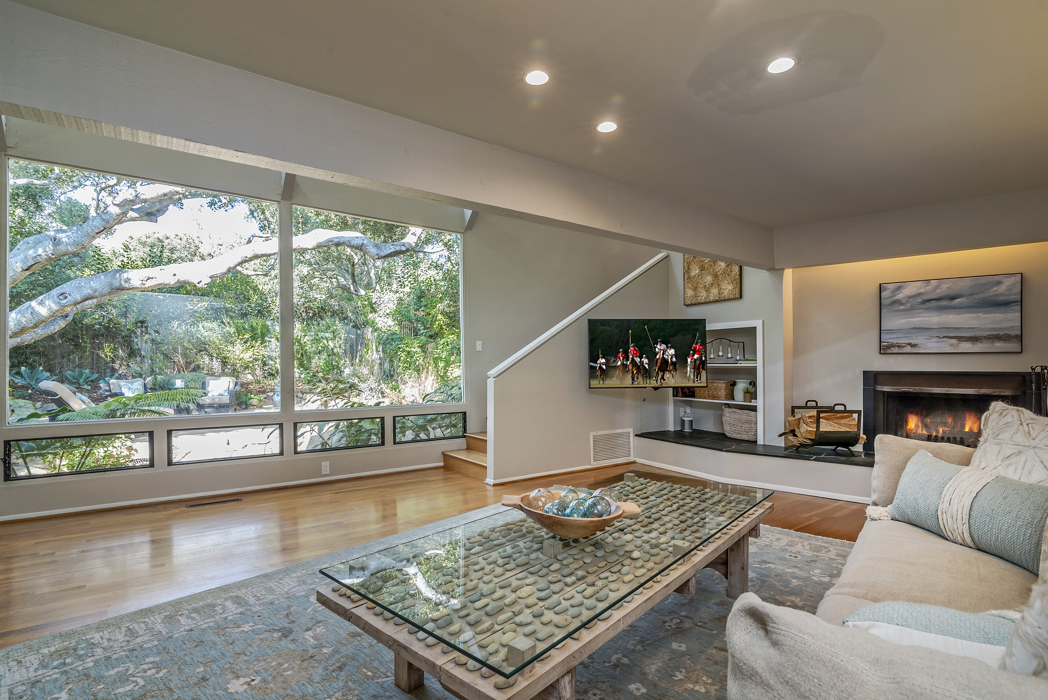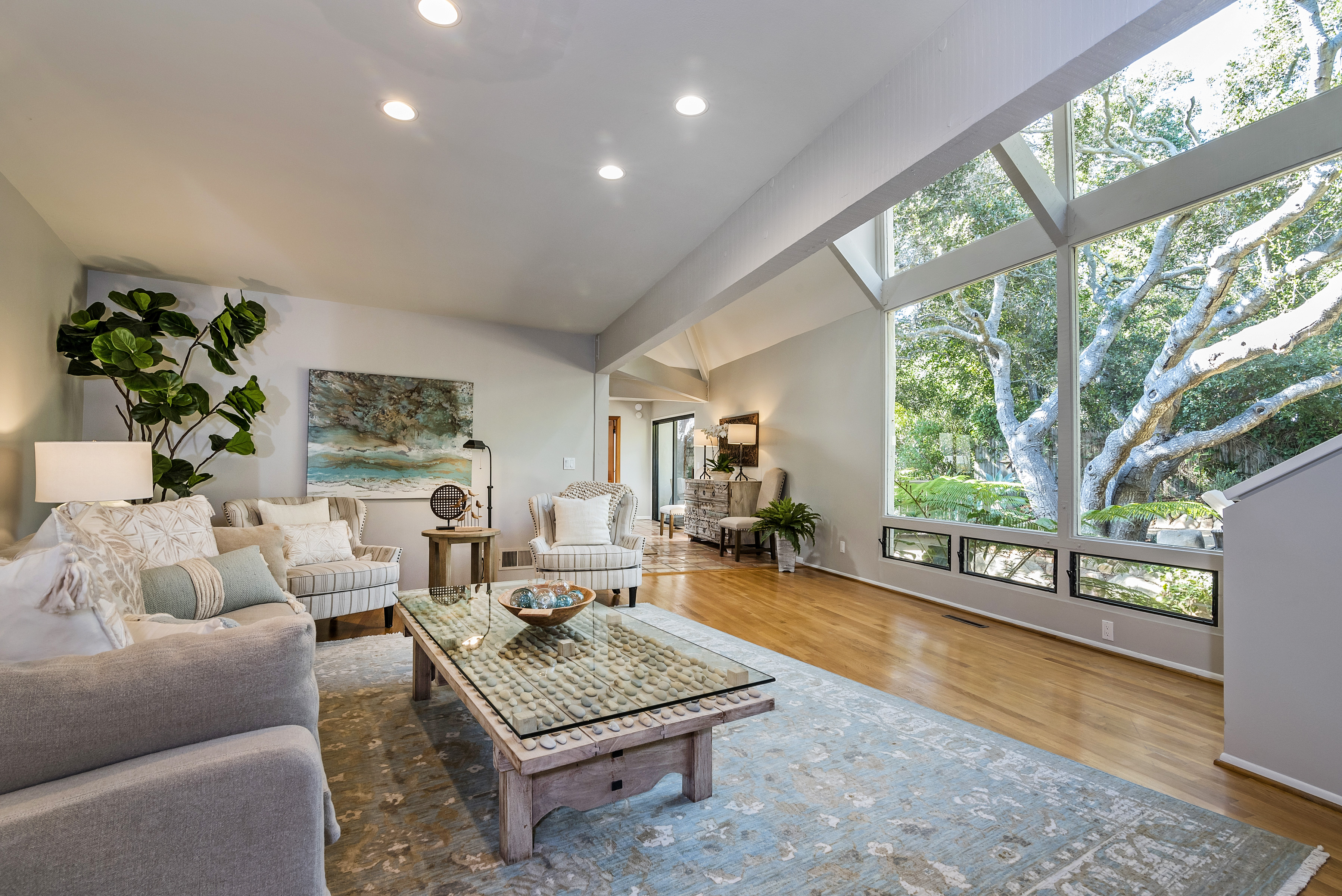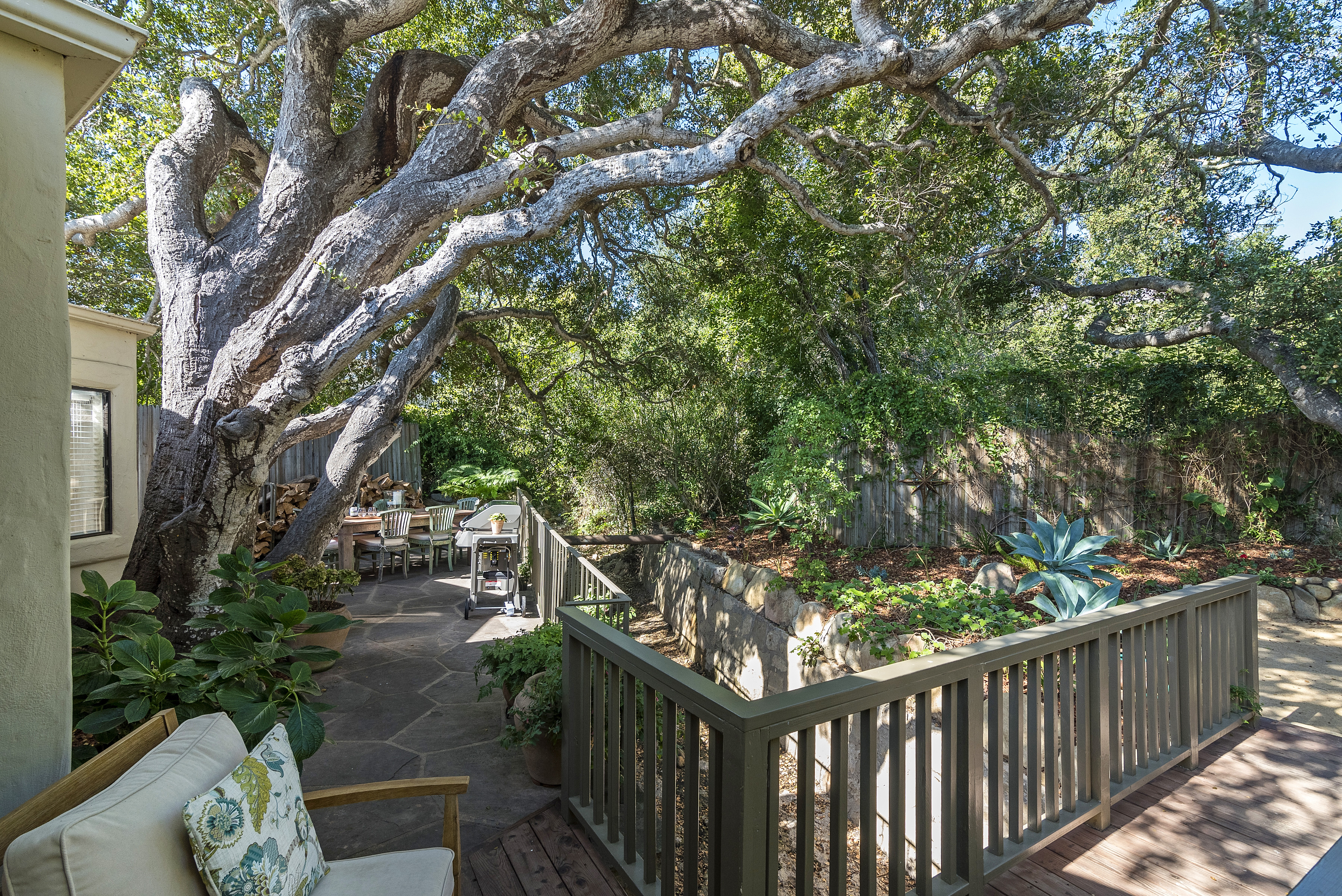 Furnished - 2 bd/2 bath townhome within a private oasis in the heart of the Upper Village. Kitchen has been updated in recent years with stainless steel appliances, open and spacious living space with walls of glass overlooking a serene Zen-like garden filled with graceful oaks and lush greenery. Ground floor primary suite with king bed and updated bathroom; lovely 2nd bedroom suite upstairs with sitting room and bath. Peaceful walled entry courtyard and abundant natural light. Equipped with air conditioning for added comfort during hot days. Close to all of the Upper Village amenities. Summer/ Rates may apply for short term monthly stays. Seeking 3+ month lease
