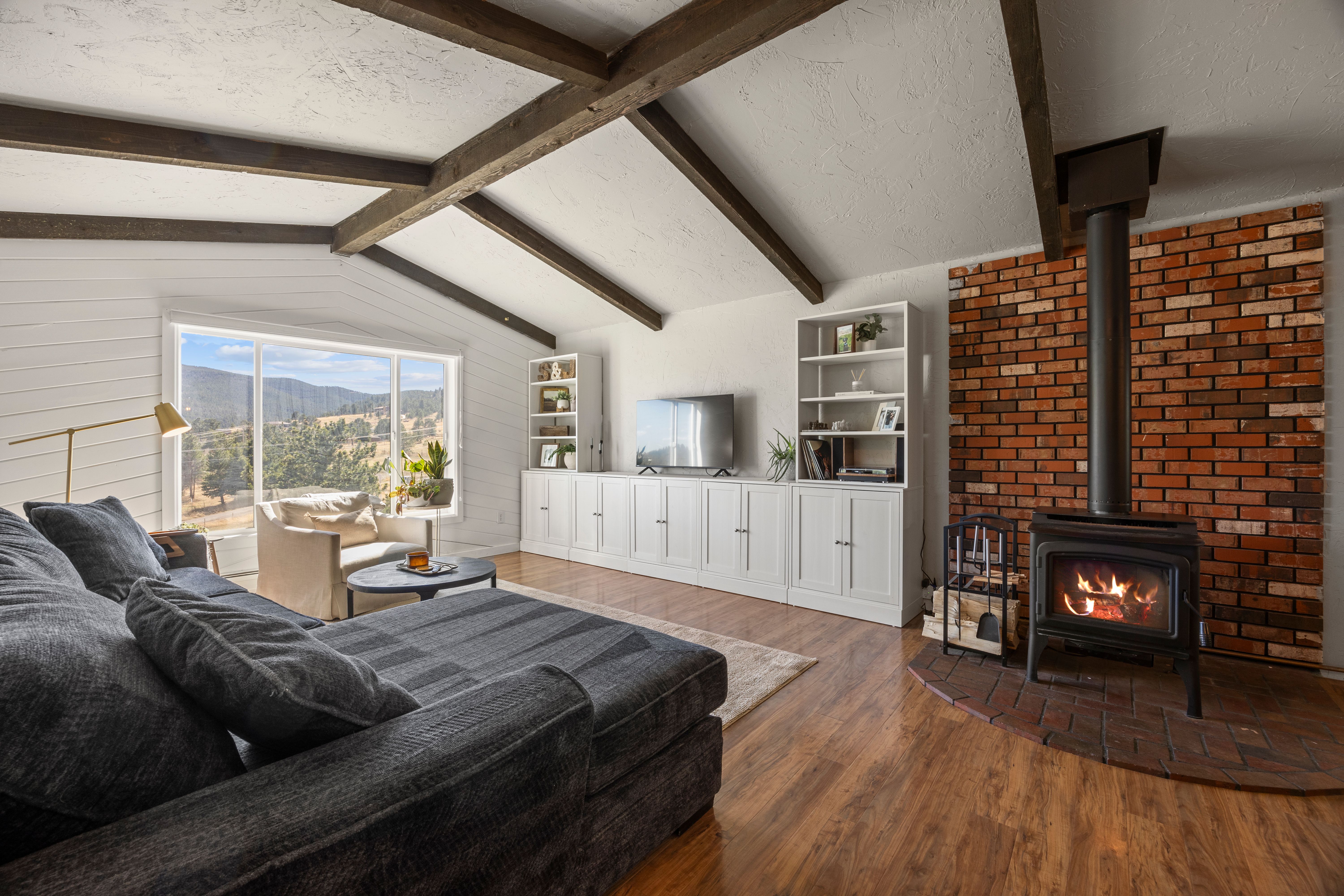 Inside, the main level welcomes you with an open, functional layout designed for everyday living and effortless entertaining. The kitchen offers generous cabinet and counter space and flows seamlessly into a spacious dining area. The vaulted living room is the heart of the home, where expansive windows frame the scenery and fill the space with natural light, while a wood-burning stove creates the perfect setting for cozy evenings and snowy Colorado days. Down the hall, you’ll find a full bath and two well-sized bedrooms.