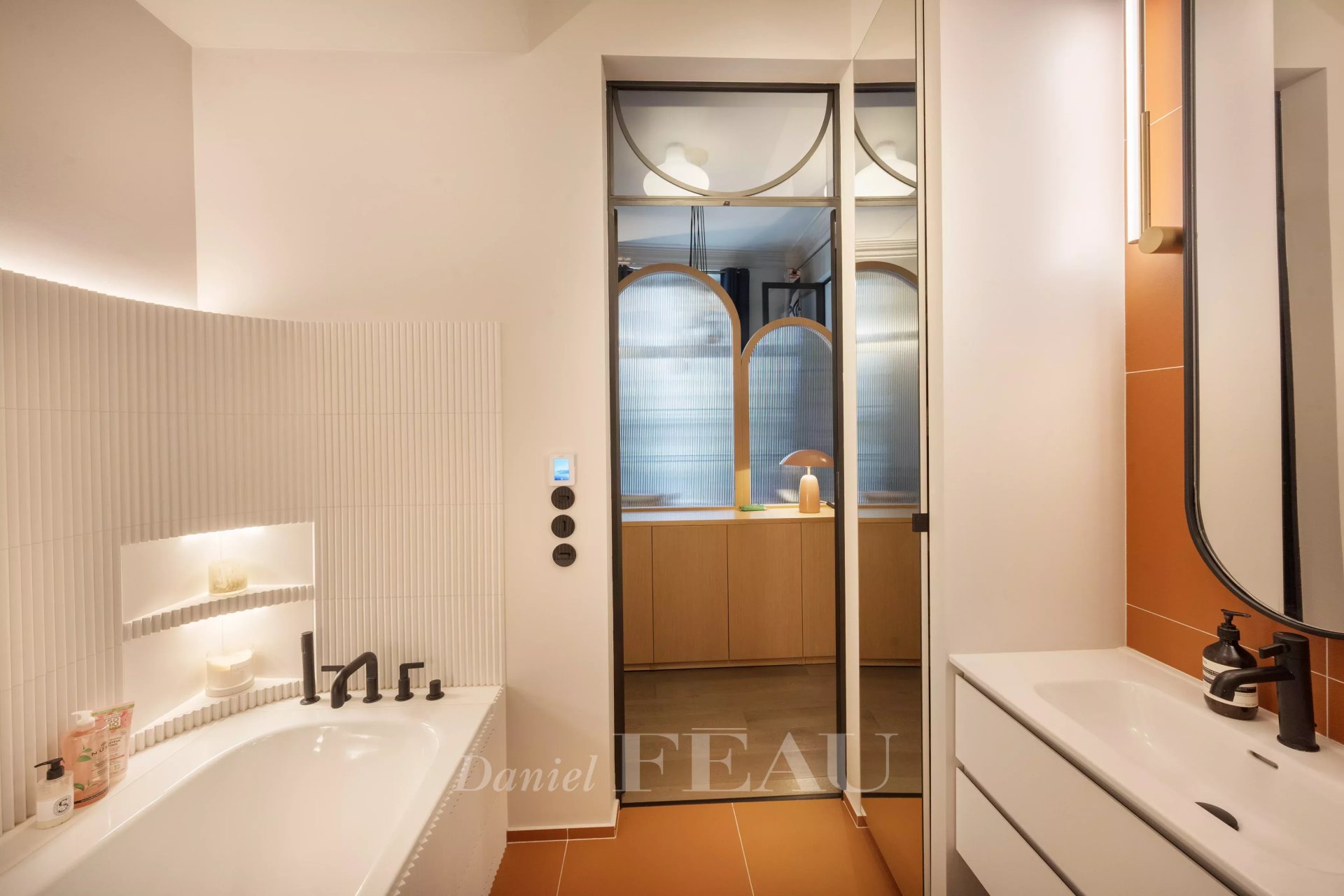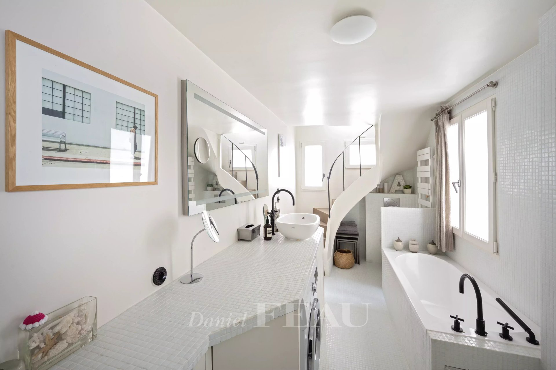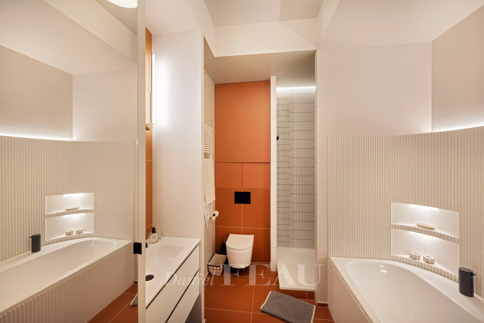La partie nuit réunit deux suites, chacune avec dressing et une salle de bains avec douche, baignoire et WC.
