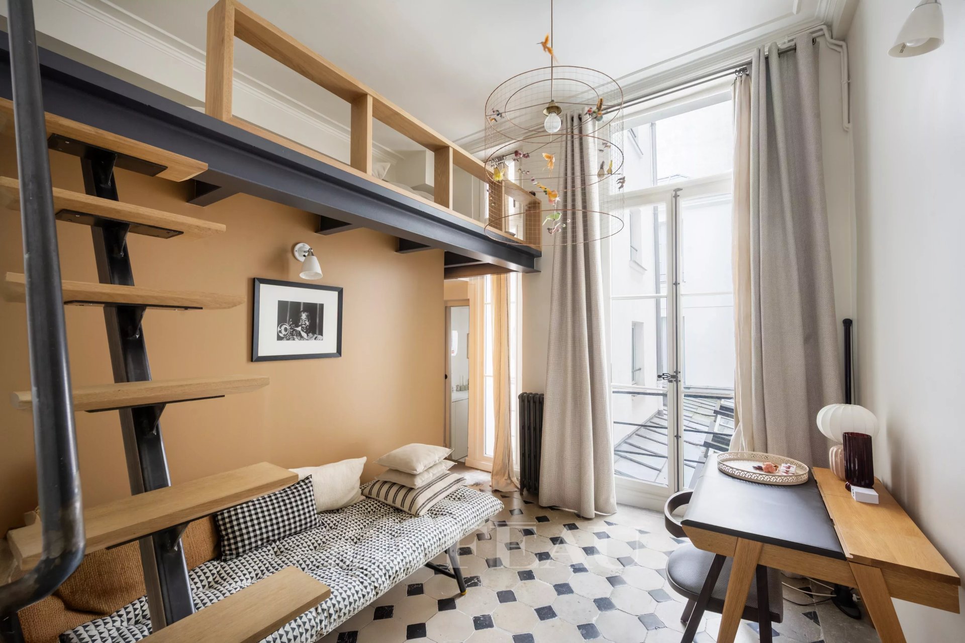 L'appartement offre de beaux volumes, du calme et de la lumière, à une adresse rare.